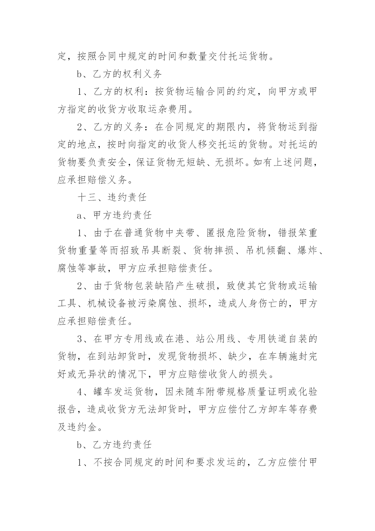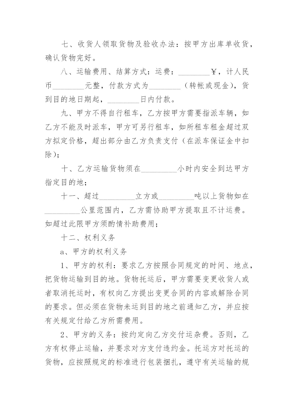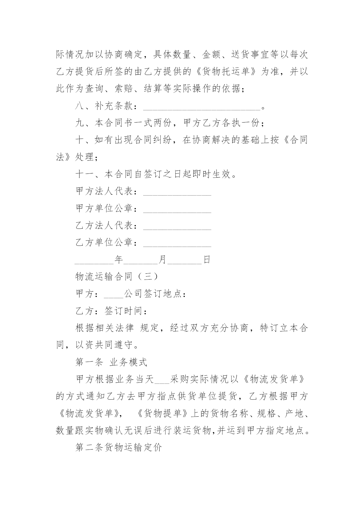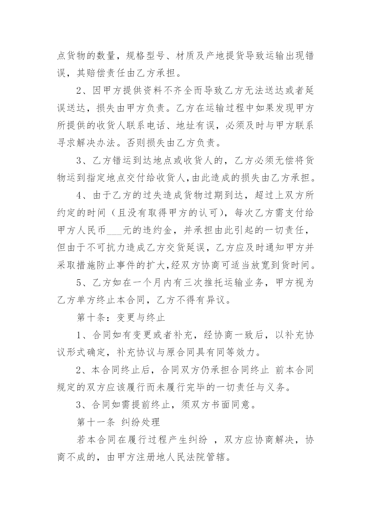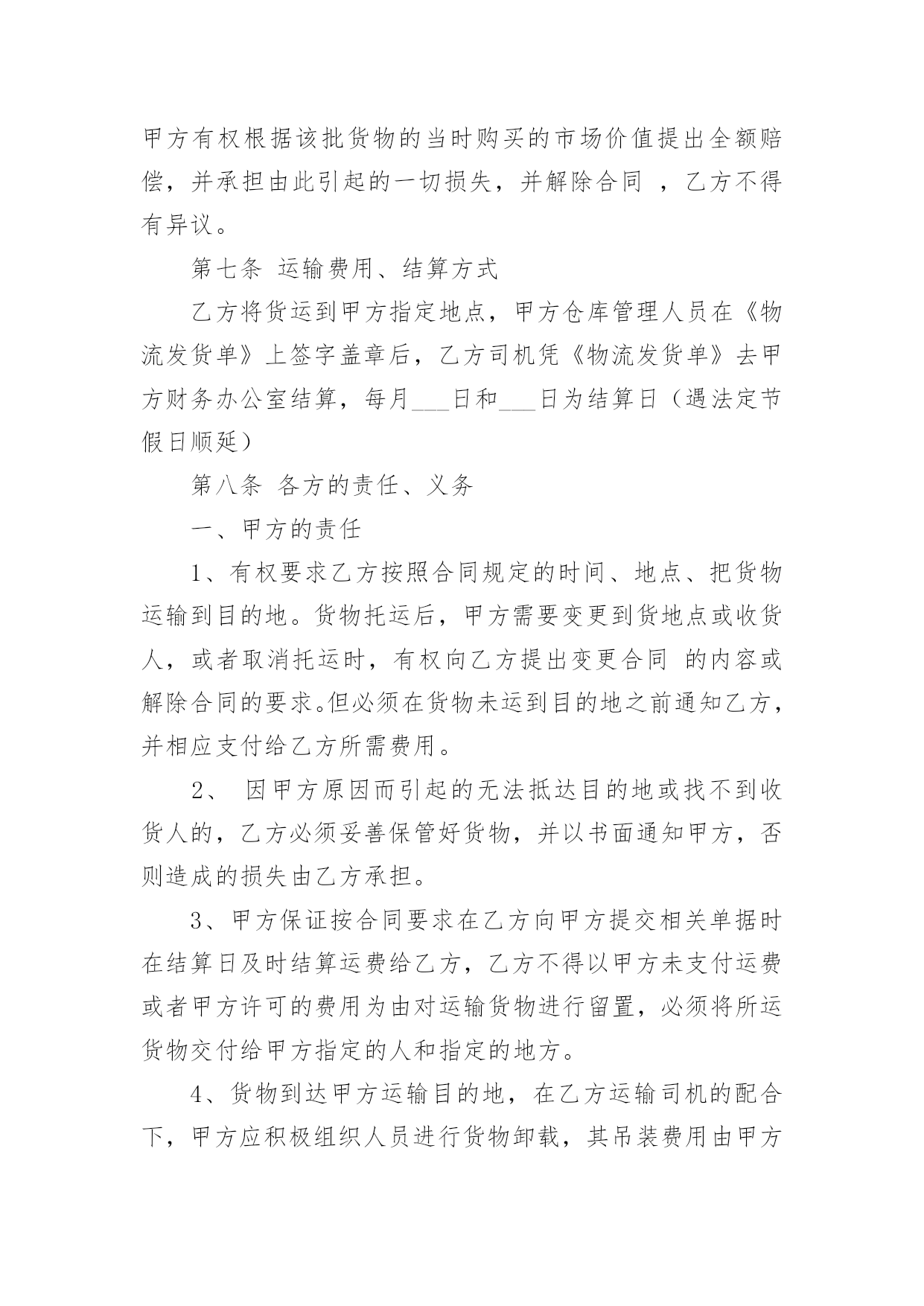 物流运输协议书在当今社会生活中,用到协议的地方越来越多,协议协调着人与人,人与事之间的关系。我敢肯定,大部分人都对拟定协议很是头疼的,下面是小编整理的物流运输协议书,希望能够帮助到大家。物流运输协议书1托运方(以下简称甲方):承运方(以下简称乙方):甲乙双方本着平等互利的原则,就甲方委托乙方承运货物有关事宜达成如下协议以供双方共同遵守执行。一、乙方必须向甲方提供有效的资质证件,主要有营业执照、道路运输证、法人机构代码证等复印件;二、在签署本合同时,乙方需向甲方交付派车保证金(人民币)_________,该押金不计利息。三、乙方车辆必须各种手续齐全,防护用品齐全,如因以上原因所造成的职能部门罚款、扣押及货物丢失、淋湿、损坏均由乙方承担责任并负责赔偿;四、货物起运地点________货物到达地点________货物承运日期________货物运到期限________五、运输质量及安全要求:装车和卸货的数量一致,货物完好,乙方签甲方出库单。六、货物装卸责任和方法:________方负责装卸。七、收货人领取货物及验收办法:按甲方出库单收货,确认货物完好。八、运输费用、结算方式:运费:________¥,计人民币________元整,付款方式为________(转帐或现金),货到目的地日期起,________日内付款。九、甲方不得自行租车,乙方按甲方需要指派车辆,如乙方不能及时派车,甲方可另行租车,如所租车租金超过双方拟定价格,超出部分由乙方负责支付(在派车保证金中扣除);十、乙方运输货物须在_________小时内安全到达甲方指定目的地;十一、超过_________立方或_________吨以上货物如在_________公里范围内,乙方需协助甲方提取且不计运费。如超过此限甲方须酌情补助费用;十二、权利义务a、甲方的权利义务1、甲方的权利:要求乙方按照合同规定的时间、地点,把货物运输到目的地。货物托运后,甲方需要变更收货人或者取消托运时,有权向乙方提出变更合同的内容或解除合同的要求。但必须在货物未运到目的地之前通知乙方,并应按有关规定付给乙方所需费用。2、甲方的义务:按约定向乙方交付运杂费。否则,乙方有权停止运输,并要求对方支付违约金。托运方对托运的货物,应按照规定的标准进行包装捆扎,遵守有关运输的规定,按照合同中规定的时间和数量交付托运货物。b、乙方的权利义务1、乙方的权利:按货物运输合同的约定,向甲方或甲方指定的收货方收取运杂费用。2、乙方的义务:在合同规定的期限内,将货物运到指定的地点,按时向指定的收货人移交托运的货物。对托运的货物要负责安全,保证货物无短缺、无损坏。如有上述问题,应承担赔偿义务。十三、违约责任a、甲方违约责任1、由于在普通货物中夹带、匿报危险货物,错报笨重货物重量等而招致吊具断裂、货物摔损、吊机倾翻、爆炸、腐蚀等事故,甲方应承担赔偿责任。2、由于货物包装缺陷产生破损,致使其它货物或运输工具、机械设备被污染腐蚀、损坏,造成人身伤亡的,甲方应承担赔偿责任。3、在甲方专用线或在港、站公用线、专用铁道自装的货物,在到站卸货时,发现货物损坏、缺少,在车辆施封完好或无异状的情况下,甲方应赔偿收货人的损失。4、罐车发运货物,因未随车附带规格质量证明或化验报告,造成收货方无法卸货时,甲方应偿付乙方卸车等存费及违约金。b、乙方违约责任1、不按合同规定的时间和要求发运的,乙方应偿付甲方违约金______元。2、乙方如将货物错运到货地点或接货人,应无偿运至协议规定的到货地点或接货人。如果货物逾期达到,乙方应偿付逾期交货的违约金。3、运输过程中货物灭失、短少、变质、污染、损坏,乙方应按货物的实际损失(包括包装费、运杂费)赔偿甲方。十四、本协议所订一切条款,甲、乙任何一方不得擅自变更或修改。如一方单独变更、修改本协议,对方有权拒绝运货或收货,并要求单独变更、修改协议一方赔偿一切损失。十五、甲、乙任何一方如确因不可抗力的原因,不能履行本协议时,应及时向对方通知不能履行或须延期履行,部分履行合同的理由。在取得有关机构证明后,本协议可以不履行或延期履行或部分履行,并全部或者部分免予承担违约责任。十六、本协议在执行中如发生争议或纠纷,甲、乙双方应协商解决;如协商仍未解决时,任何一方均可向乙方企业法人住所地有管辖权的人民法院提起诉讼。十七、本协议一式两份,双方各执一份,协议有效期_________年,自签定之日起生效。本协议附以下附件:_________甲方:______(盖章)乙方:____(盖章)____年__月__日物流运输协议书2物流合同甲方(即托运方):___________________乙方(即承运方):___________________________根据甲方与乙方的共同协商,在遵循《合同法》的基础上,就甲方将发往全国各地的