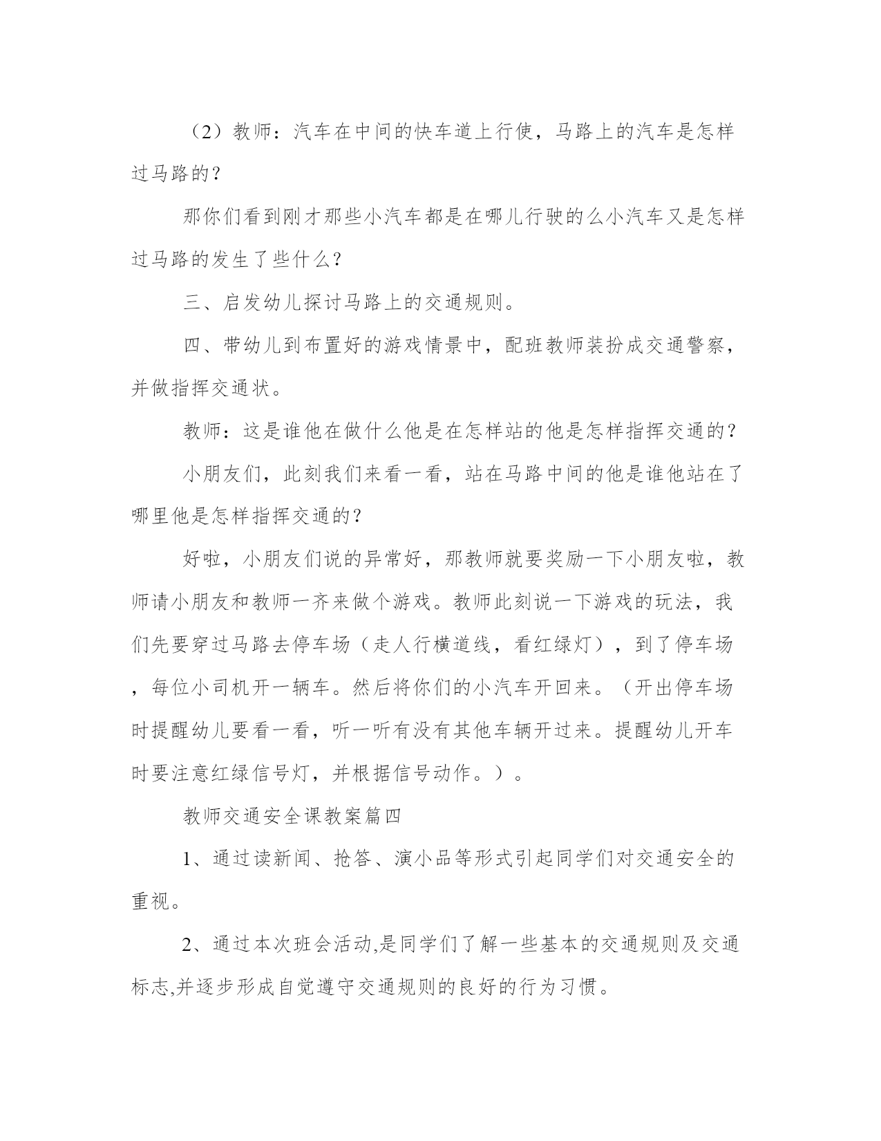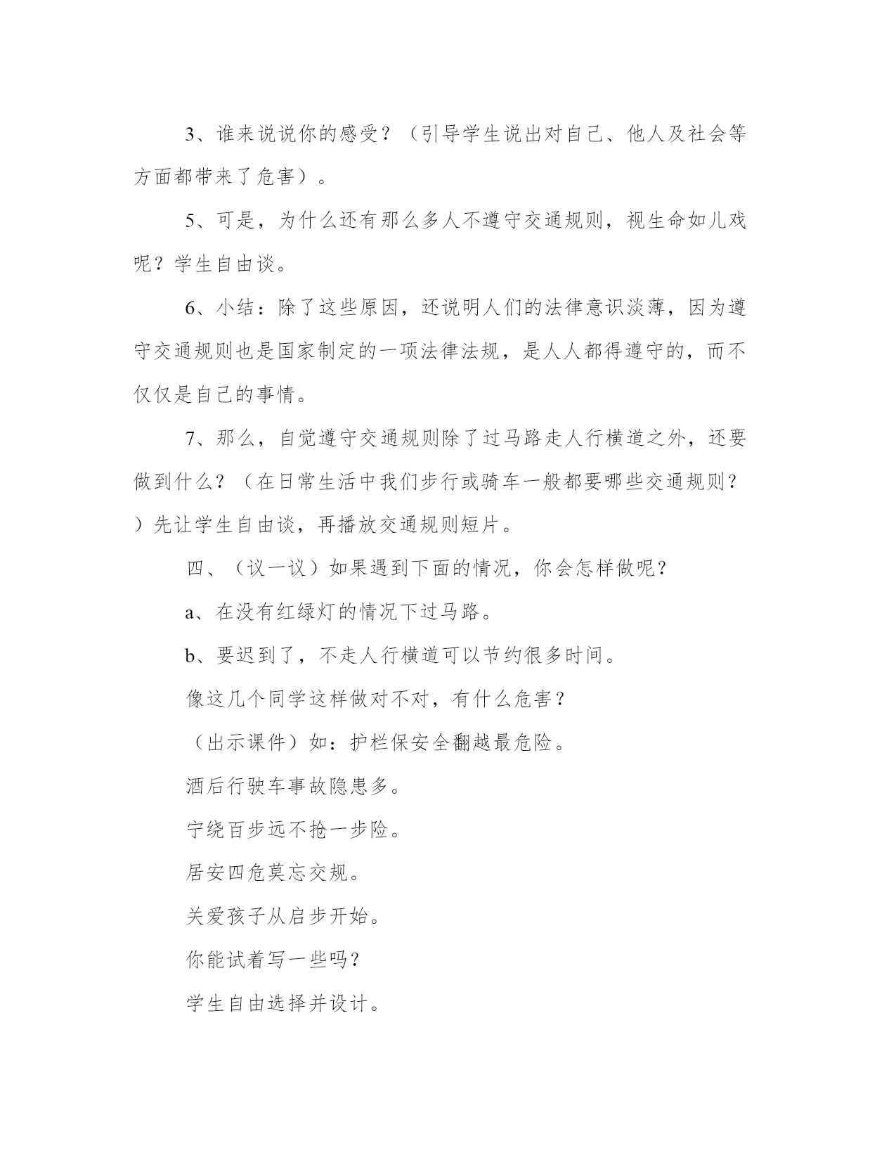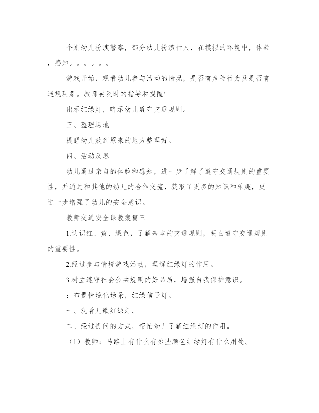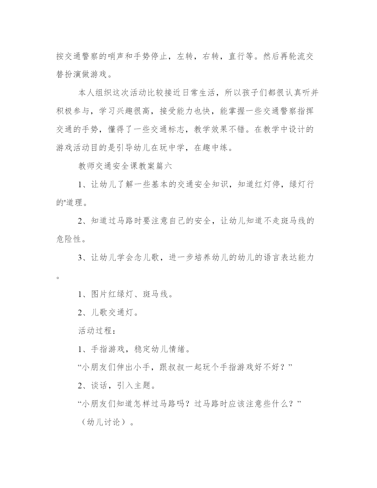 教师交通安全课教案(优秀16篇)教案不仅是教师备课的重要内容,也是教学评估和记录学生学习情况的依据。教案的编写需要考虑学生的学习风格和个性差异,采用多元化的教学手段。以下是一份精选的教案范例,供教师们参考和借鉴。教师交通安全课教案篇一知识:知道交通规则是政府制定的法规,学习有关的交通规则常识,认识一些常见的交通标志和设施。态度:了解交通事故的无情给个人、家庭和社会造成的巨大危害,形成强烈的交通安全意识,养成对生命负责的态度。能力:提高自我保护能力。1、认识常见的交通标志和设施,了解他们的作用,体会识别交通标志、遵守交通法规的重要意义。2、懂得交通规则是政府制定的法规,人人都要遵守。3、认识到违反交通规则可能会给自己、他人及社会带来巨大的危害和痛苦,提高自觉遵守交通规则的意识。多媒体课件。一、交流谈话,引入课题。学生自由谈。2、对,就是交通事故,尤其是对于我们中小学生来说,车祸已经成为夺取我们宝贵生命的最大威胁。3老师请大家看一些资料。4、放录像短片。5、看了刚才的短片,你有什么想法?学生自由谈。(随学生回答板书:交通安全)。二、认识各种交通标志和设施。过渡:过街天桥、隔离带等这些交通设施都是为了保障我们的生命安全而设的,如果不会识别交通标志,不能正确使用这些设施,就有可能发生像这样命丧车轮的惨剧。1、先小组讨论交流一下。2、学生说说见过的标志和设施。3、汇报交流。4、教师小结并将交通标志分类:警告标志、禁令标志、指示标志。三、遵守交通规则。1、学生自由谈,并在汇报后说说体会。2、(出示录像短片)老师这也有一些相关的案例,让我们一起来看一下。3、谁来说说你的感受?(引导学生说出对自己、他人及社会等方面都带来了危害)。5、可是,为什么还有那么多人不遵守交通规则,视生命如儿戏呢?学生自由谈。6、小结:除了这些原因,还说明人们的法律意识淡薄,因为遵守交通规则也是国家制定的一项法律法规,是人人都得遵守的,而不仅仅是自己的事情。7、那么,自觉遵守交通规则除了过马路走人行横道之外,还要做到什么?(在日常生活中我们步行或骑车一般都要哪些交通规则?)先让学生自由谈,再播放交通规则短片。四、(议一议)如果遇到下面的情况,你会怎样做呢?a、在没有红绿灯的情况下过马路。b、要迟到了,不走人行横道可以节约很多时间。像这几个同学这样做对不对,有什么危害?(出示课件)如:护栏保安全翻越最危险。酒后行驶车事故隐患多。宁绕百步远不抢一步险。居安四危莫忘交规。关爱孩子从启步开始。你能试着写一些吗?学生自由选择并设计。交流汇报。四、全课总结。希望通过这节课的学习,我们大家今后能够自觉遵守交通规则,并做一个小小宣传员,让周围遵守交通规则的人越来越多,人们都能够远离交通事故。教师交通安全课教案篇二1、在游戏活动中体验交通规则的重要性,养成自觉遵守交通规则的意识和防护能力。2、体验和大家一起合作游戏的快乐。活动准备红绿灯,车辆模型交通符号指示活动过程一、共同布置场地1、教师和幼儿一起做热身运动:2、认识几种常见交通标志及信号灯标识认识红灯停、绿灯行、黄灯亮了等一等今天你们要自己过马路,应该注意些什么啊?幼儿积极的回答二、走进游戏,获取体验师:现在我们每个小朋友都做好了准备,刚才我们已经布置好了路面情况,在过马路时我们一定要注意车辆和信号指示,以免发生撞车和事故。在路上行走时注意遵守交通规则,保证安全。个别幼儿扮演警察,部分幼儿扮演行人,在模拟的环境中,体验,感知。。。。。。游戏开始,观看幼儿参与活动的情况,是否有危险行为及是否有违规现象。教师要及时的指导和提醒!出示红绿灯,暗示幼儿遵守交通规则。三、整理场地提醒幼儿放到原来的地方整理好。四、活动反思幼儿通过亲自的体验和感知,进一步了解了遵守交通规则的重要性,并通过和其他的幼儿的合作交流,获取了更多的知识和乐趣,更进一步增强了幼儿的安全意识。教师交通安全课教案篇三1.认识红、黄、绿色,了解基本的交通规则,明白遵守交通规则的重要性。2.经过参与情境游戏活动,理解红绿灯的作用。3.树立遵守社会公共规则的好品质,增强自我保护意识。:布置情境化场景,红绿信号灯。一、观看儿歌红绿灯。二、经过提问的方式,帮忙幼儿了解红绿灯的作用。(1)教师:马路上有什么有哪些颜色红绿灯有什么用处。(2)教师:汽车在中间的快车道上行使,马路上的汽车是怎样过马路的?那你们看到刚才那些小汽车都是在哪儿行驶的么小汽车又是怎样过马路的发生了些什么?三、启发幼儿探讨马路上的交通规则。四、带幼儿到布置好的游戏情景中,配班教师装扮成交通警察,并做指挥交通状。教师:这是谁他在做什么他是在怎样站的他是怎样指挥交通的?