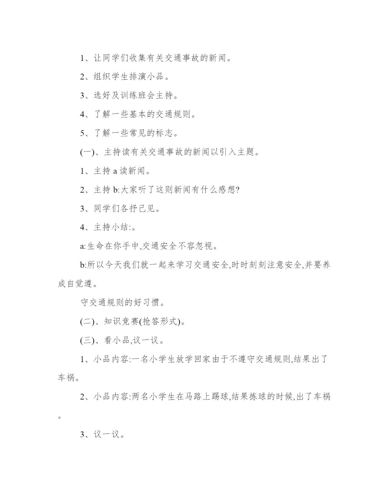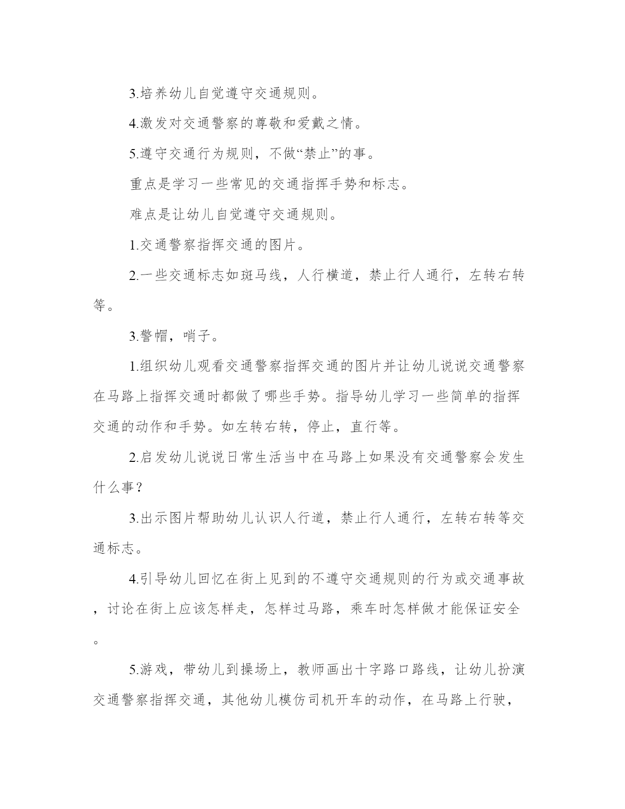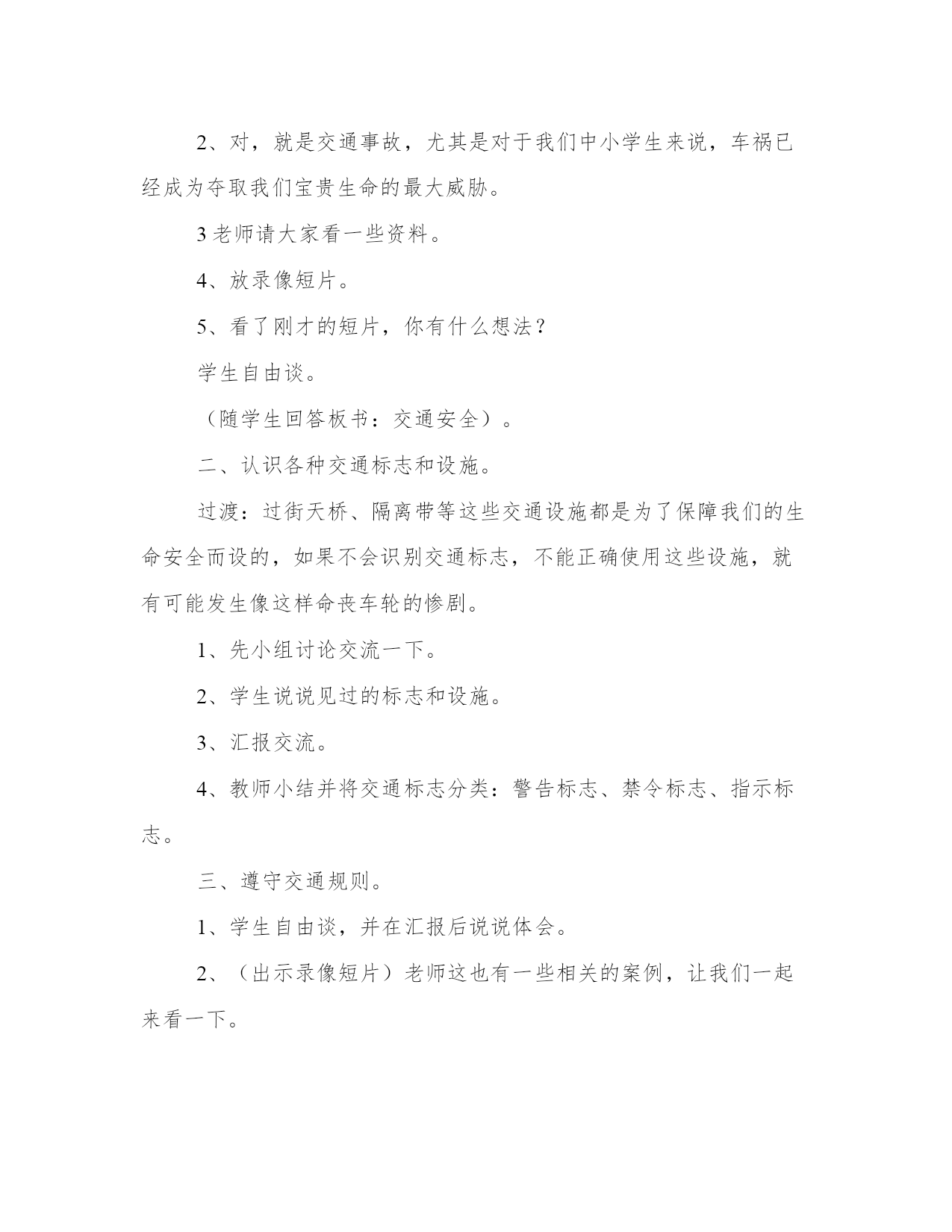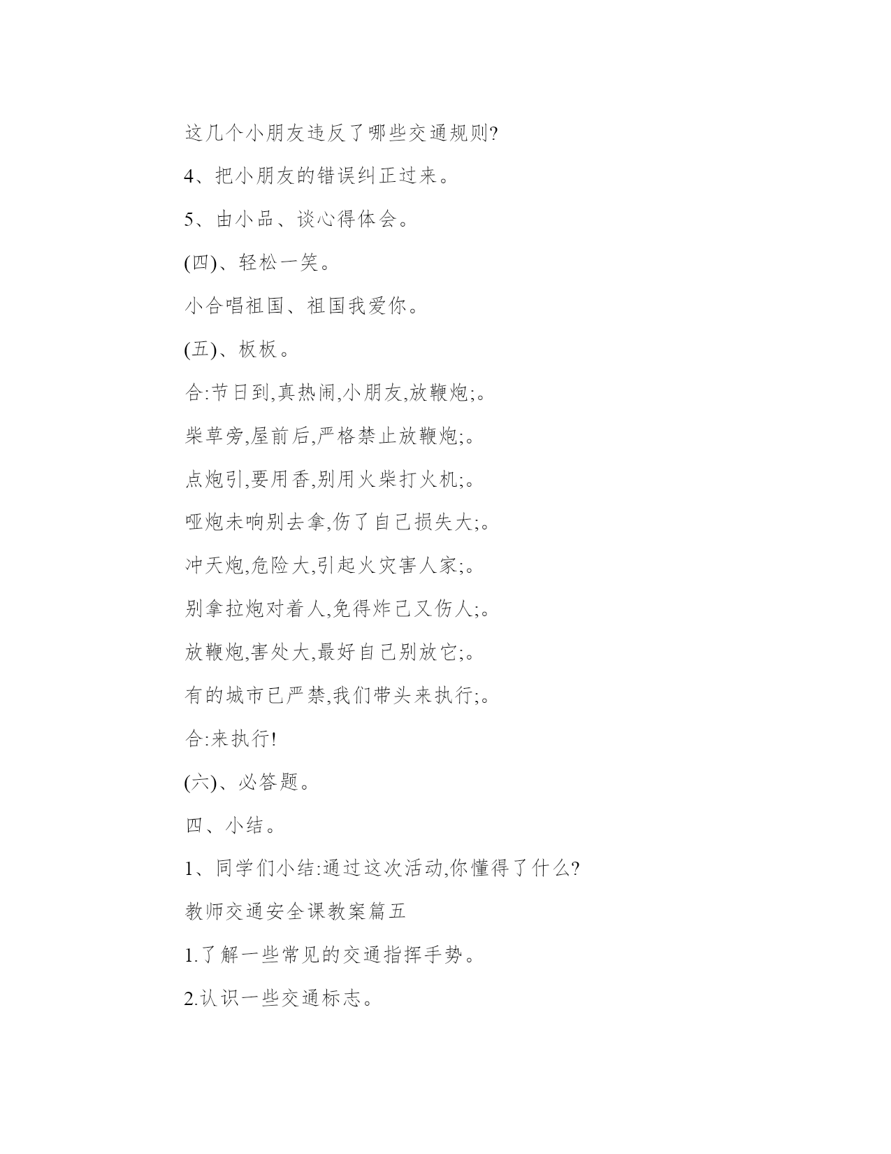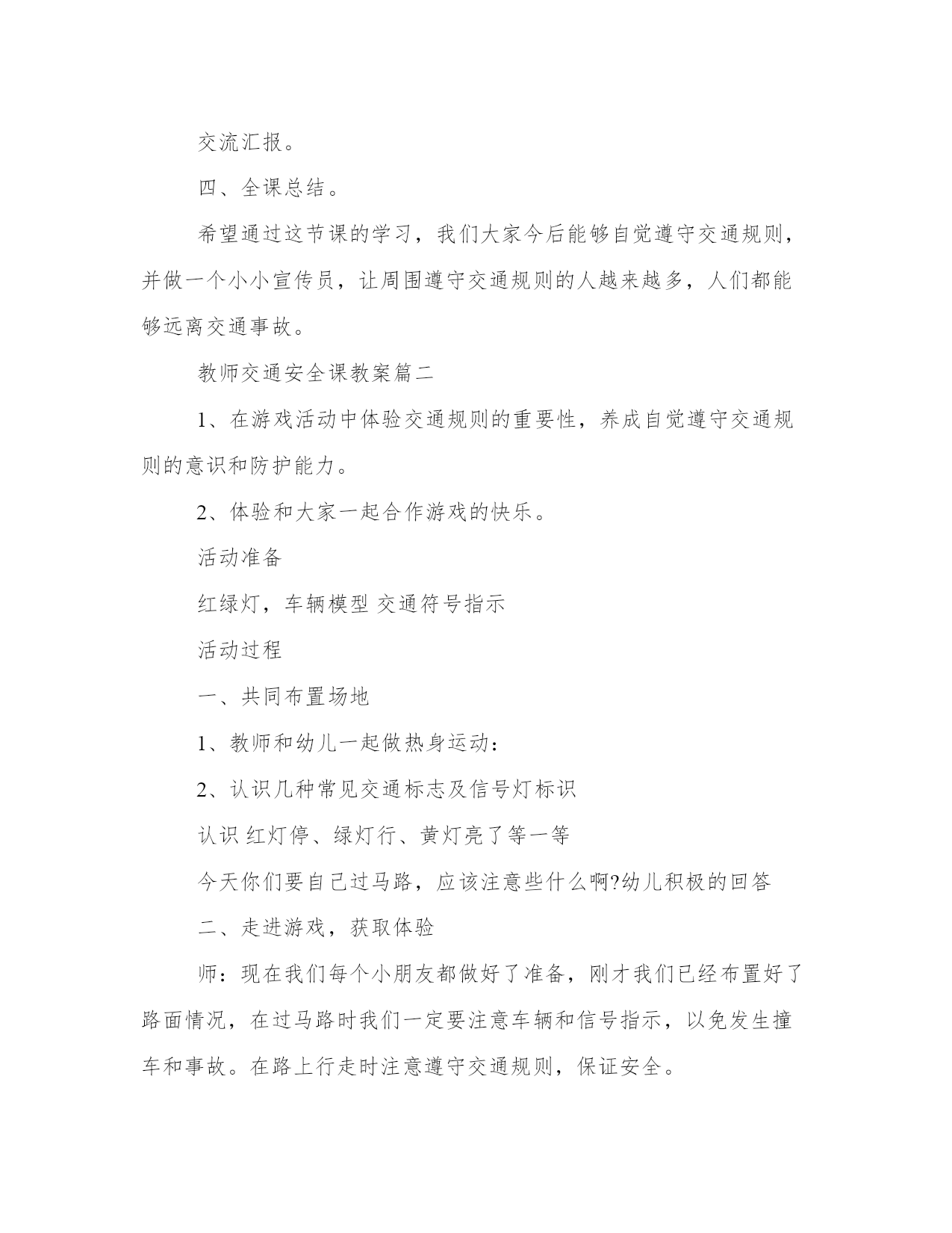 教师交通安全课教案(优秀16篇)教案不仅是教师备课的重要内容,也是教学评估和记录学生学习情况的依据。教案的编写需要考虑学生的学习风格和个性差异,采用多元化的教学手段。以下是一份精选的教案范例,供教师们参考和借鉴。教师交通安全课教案篇一知识:知道交通规则是政府制定的法规,学习有关的交通规则常识,认识一些常见的交通标志和设施。态度:了解交通事故的无情给个人、家庭和社会造成的巨大危害,形成强烈的交通安全意识,养成对生命负责的态度。能力:提高自我保护能力。1、认识常见的交通标志和设施,了解他们的作用,体会识别交通标志、遵守交通法规的重要意义。2、懂得交通规则是政府制定的法规,人人都要遵守。3、认识到违反交通规则可能会给自己、他人及社会带来巨大的危害和痛苦,提高自觉遵守交通规则的意识。多媒体课件。一、交流谈话,引入课题。学生自由谈。2、对,就是交通事故,尤其是对于我们中小学生来说,车祸已经成为夺取我们宝贵生命的最大威胁。3老师请大家看一些资料。4、放录像短片。5、看了刚才的短片,你有什么想法?学生自由谈。(随学生回答板书:交通安全)。二、认识各种交通标志和设施。过渡:过街天桥、隔离带等这些交通设施都是为了保障我们的生命安全而设的,如果不会识别交通标志,不能正确使用这些设施,就有可能发生像这样命丧车轮的惨剧。1、先小组讨论交流一下。2、学生说说见过的标志和设施。3、汇报交流。4、教师小结并将交通标志分类:警告标志、禁令标志、指示标志。三、遵守交通规则。1、学生自由谈,并在汇报后说说体会。2、(出示录像短片)老师这也有一些相关的案例,让我们一起来看一下。3、谁来说说你的感受?(引导学生说出对自己、他人及社会等方面都带来了危害)。5、可是,为什么还有那么多人不遵守交通规则,视生命如儿戏呢?学生自由谈。6、小结:除了这些原因,还说明人们的法律意识淡薄,因为遵守交通规则也是国家制定的一项法律法规,是人人都得遵守的,而不仅仅是自己的事情。7、那么,自觉遵守交通规则除了过马路走人行横道之外,还要做到什么?(在日常生活中我们步行或骑车一般都要哪些交通规则?)先让学生自由谈,再播放交通规则短片。四、(议一议)如果遇到下面的情况,你会怎样做呢?a、在没有红绿灯的情况下过马路。b、要迟到了,不走人行横道可以节约很多时间。像这几个同学这样做对不对,有什么危害?(出示课件)如:护栏保安全翻越最危险。酒后行驶车事故隐患多。宁绕百步远不抢一步险。居安四危莫忘交规。关爱孩子从启步开始。你能试着写一些吗?学生自由选择并设计。交流汇报。四、全课总结。希望通过这节课的学习,我们大家今后能够自觉遵守交通规则,并做一个小小宣传员,让周围遵守交通规则的人越来越多,人们都能够远离交通事故。教师交通安全课教案篇二1、在游戏活动中体验交通规则的重要性,养成自觉遵守交通规则的意识和防护能力。2、体验和大家一起合作游戏的快乐。活动准备红绿灯,车辆模型交通符号指示活动过程一、共同布置场地1、教师和幼儿一起做热身运动:2、认识几种常见交通标志及信号灯标识认识红灯停、绿灯行、黄灯亮了等一等今天你们要自己过马路,应该注意些什么啊?幼儿积极的回答二、走进游戏,获取体验师:现在我们每个小朋友都做好了准备,刚才我们已经布置好了路面情况,在过马路时我们一定要注意车辆和信号指示,以免发生撞车和事故。在路上行走时注意遵守交通规则,保证安全。个别幼儿扮演警察,部分幼儿扮演行人,在模拟的环境中,体验,感知。。。。。。游戏开始,观看幼儿参与活动的情况,是否有危险行为及是否有违规现象。教师要及时的指导和提醒!出示红绿灯,暗示幼儿遵守交通规则。三、整理场地提醒幼儿放到原来的地方整理好。四、活动反思幼儿通过亲自的体验和感知,进一步了解了遵守交通规则的重要性,并通过和其他的幼儿的合作交流,获取了更多的知识和乐趣,更进一步增强了幼儿的安全意识。教师交通安全课教案篇三1.认识红、黄、绿色,了解基本的交通规则,明白遵守交通规则的重要性。2.经过参与情境游戏活动,理解红绿灯的作用。3.树立遵守社会公共规则的好品质,增强自我保护意识。:布置情境化场景,红绿信号灯。一、观看儿歌红绿灯。二、经过提问的方式,帮忙幼儿了解红绿灯的作用。(1)教师:马路上有什么有哪些颜色红绿灯有什么用处。(2)教师:汽车在中间的快车道上行使,马路上的汽车是怎样过马路的?那你们看到刚才那些小汽车都是在哪儿行驶的么小汽车又是怎样过马路的发生了些什么?三、启发幼儿探讨马路上的交通规则。四、带幼儿到布置好的游戏情景中,配班教师装扮成交通警察,并做指挥交通状。教师:这是谁他在做什么他是在怎样站的他是怎样指挥交通的?