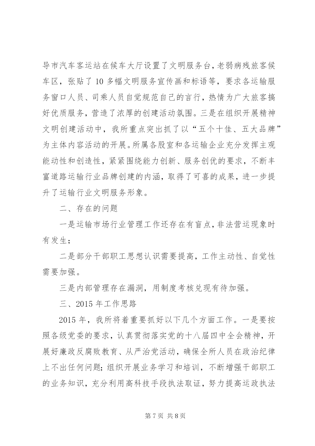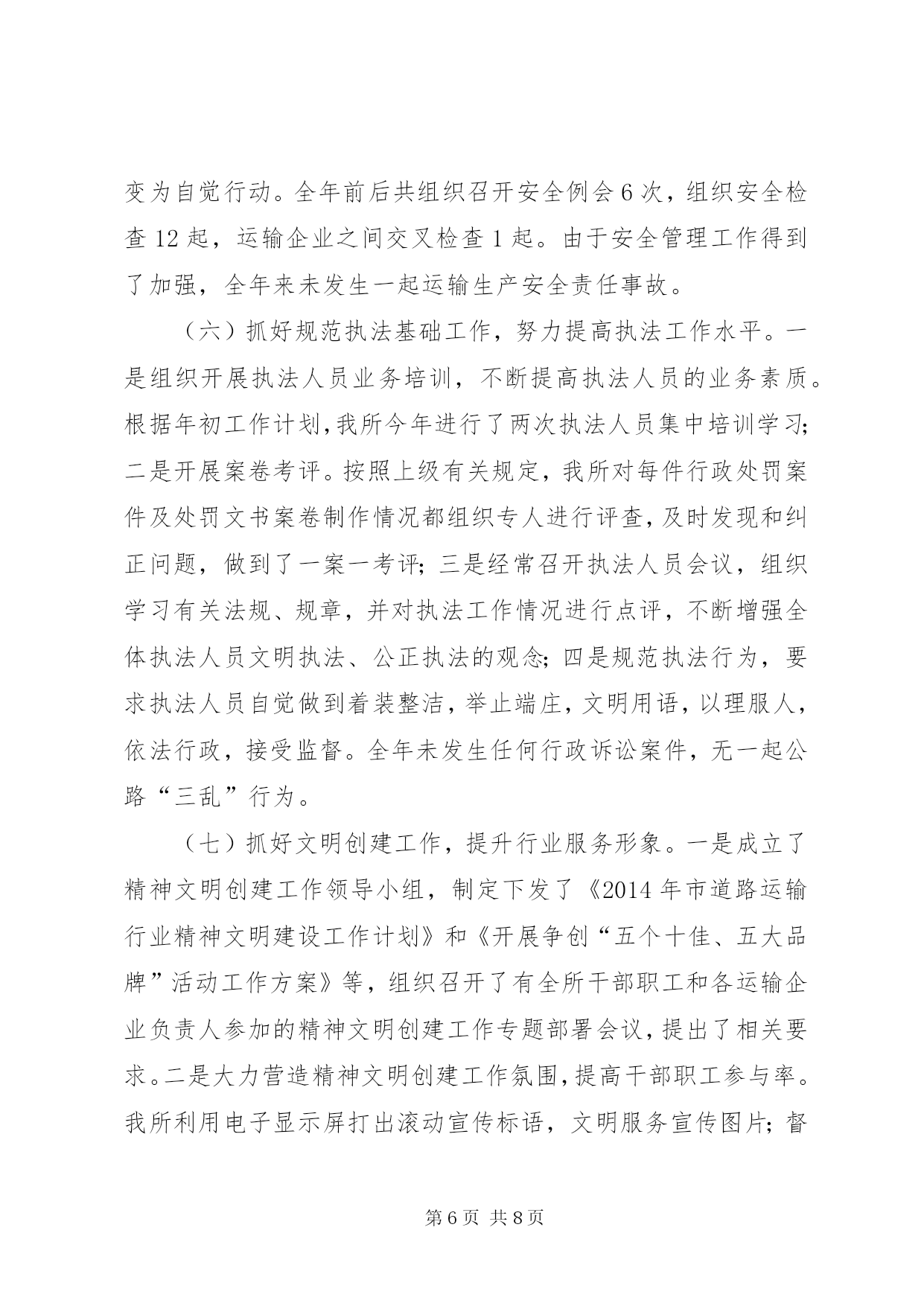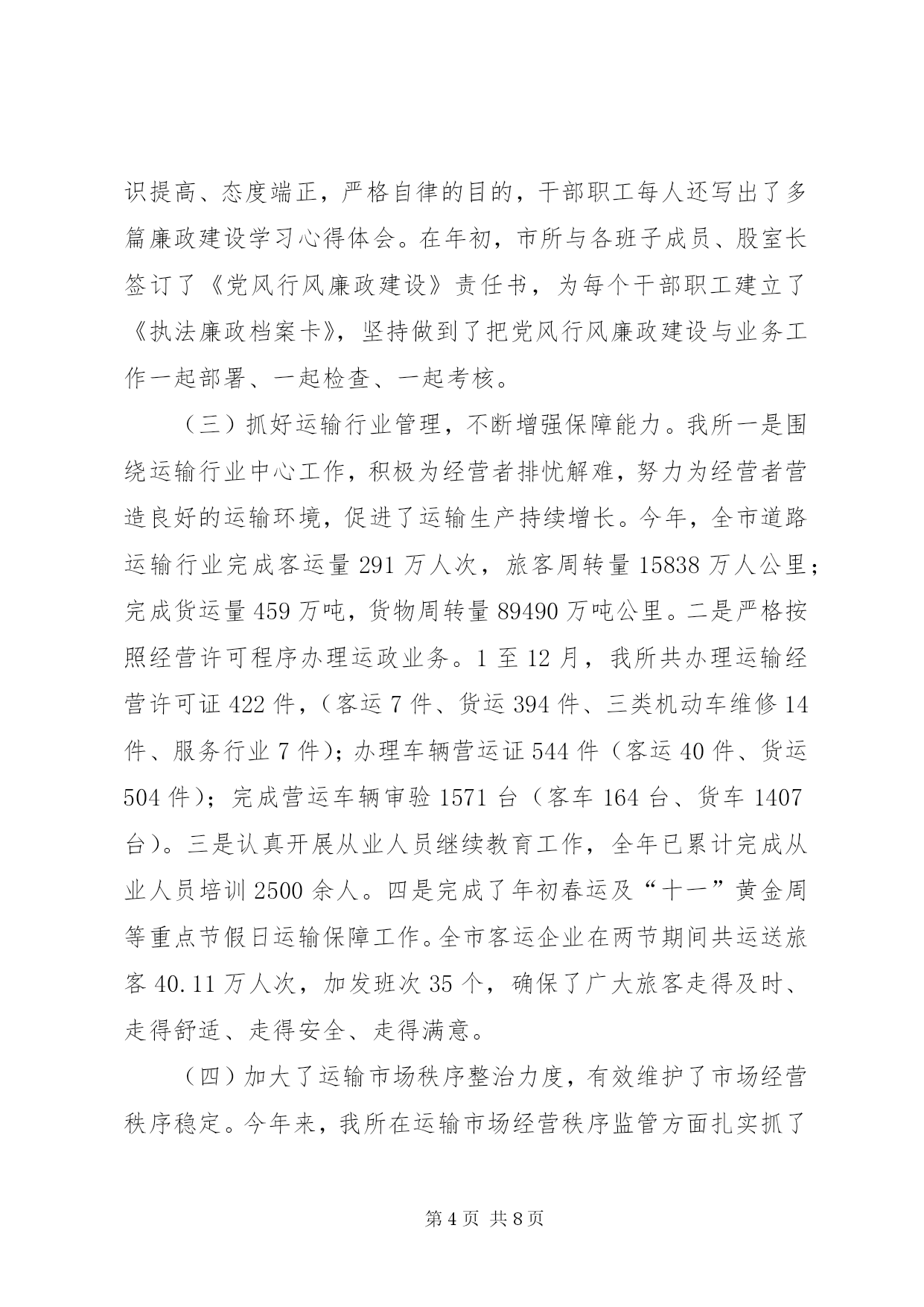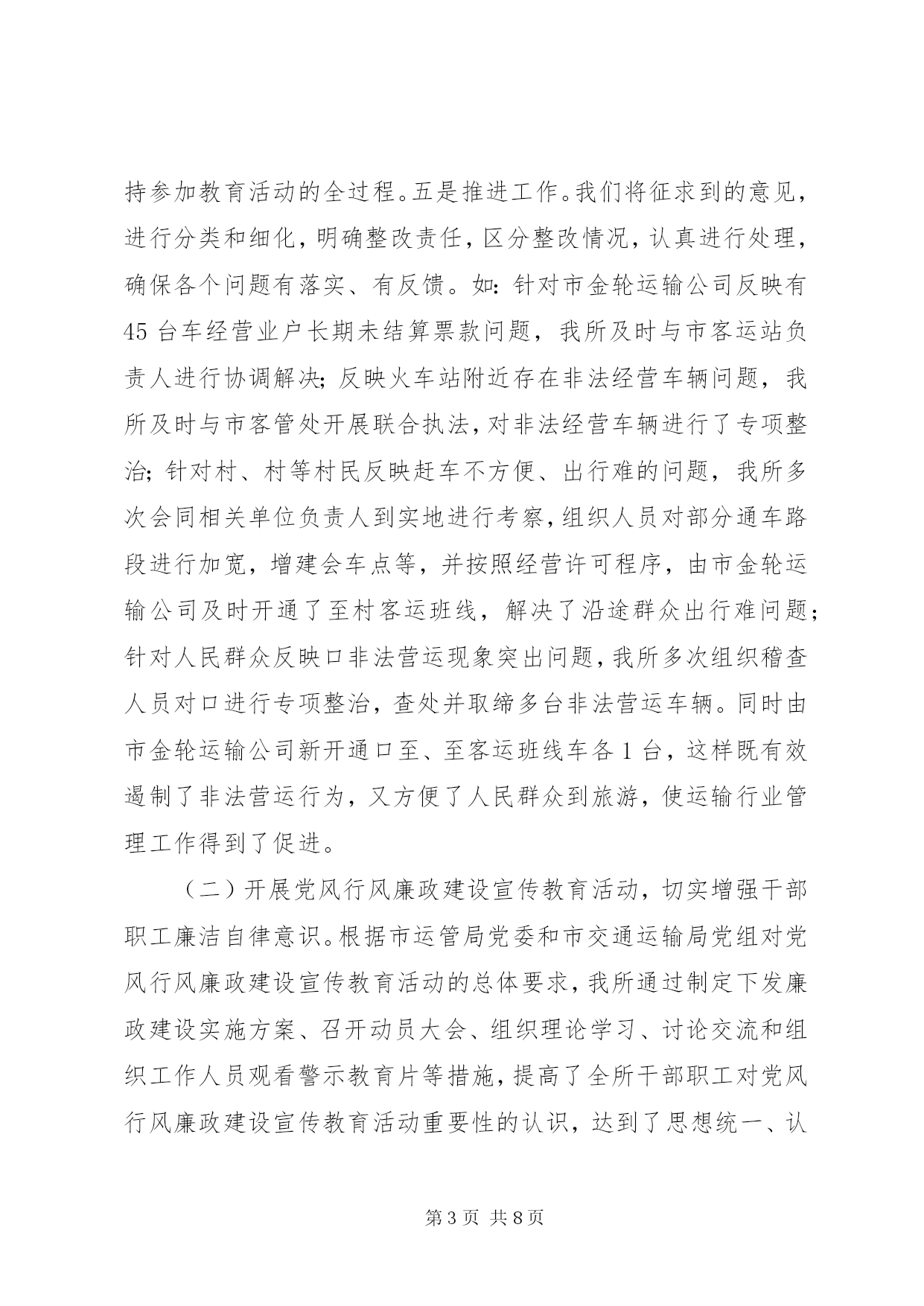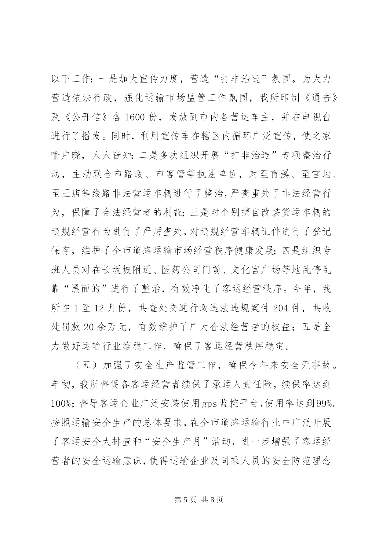 第PAGE\*Arabic\*MERGEFORMAT8页共NUMPAGES\*MERGEFORMAT8页交通局运管工作总结今年以来,我所在市运管局和市交通运输局的正确领导下,以邓小平理论、“三个代表”重要思想和科学发展观为指导,深入贯彻落实党的十八大精神,认真组织开展党的群众路线教育实践活动,紧紧围绕全年中心工作任务,真抓实干,开拓进取,有效促进了全市道路运输行业规范化管理,各项工作取得了良好成效,现将我所全年运管工作情况报告如下:一、2014年度工作完成情况(一)开展教育实践活动,促进工作整改提高。按照上级统一部署,我所认真组织开展了教育实践活动。为了抓好这次教育实践活动的开展,我们坚持用上级党委的指示精神统一认识,把思想发动贯穿教育活动的全过程,做到教育活动每推进一步,思想发动跟进一步,使大家深刻认识到,群众路线教育实践活动是推进基层党组织的建设新的重大举措,是解决领导班子和普通党员存在突出问题的迫切需要,是增强党组织的凝聚力、战斗力的根本大计。一是高度重视。教育活动期间,市局领导多次听取我所的教育活动情况汇报,审阅领导班子的对照检查材料,提出了修改要求,亲自参加专题组织生活会,对每个班子成员进行点评帮助。为加强教育实践活动的组织领导,我所成立了教育实践活动领导小组和办公室。所主要领导认真负责,履行了教育“第一责任人”的职责,保证了教育活动有序进行。所活动办按照上级要求,认真制定实施方案,下发学习资料,对各阶段计划进行了准备和安排,建立了教育考勤登记、典型宣传报道等各项制度。二是深入发动。我所始终坚持用深入的思想发动统一大家的思想,提高大家的认识。教育领导小组做到了每个环节活动展开前,都要召开会议进行部署;每个活动完成后,都要召开会议进行小结讲评,确保活动效果。所党支部紧密结合自身实际,坚持把思想发动贯穿到教育活动的各个环节、各个步骤,在每个阶段都要进行再教育、再动员、再部署,提出了具体要求。确保教育活动每向前推进一个环节,班子成员和普通党员的思想认识就提高一个层次。三是狠抓落实。群众路线教育实践活动的对象重点是领导班子和普通党员,活动的主要内容是解决“四风”方面存在的突出问题。我们的所有教育活动,围绕这两个重点来展开。一方面,以“四风”问题的26种表现为“镜子”,认真“正衣冠”;另一方面,围绕领导班子和普通党员搞教育、搞活动,按照职责分工,层层负责,一级带一级,搞好点评、帮助和整改。四是严格要求。从我所教育领导小组到各股室,都建立了学习教育、检查讲评等制度,确保了教育活动“四落实”。在整个教育活动期间,坚持开门搞教育,广泛征求群众的意见,本着能改的立即改,能阶段性改的要明确整改时限,确实改不了的要解释政策、搞好宣传。通过这些措施,使大家集中精力投入教育活动,不少同志一面按时学习,一面加班处理工作,有的自觉克服个人和家庭困难,坚持参加教育活动的全过程。五是推进工作。我们将征求到的意见,进行分类和细化,明确整改责任,区分整改情况,认真进行处理,确保各个问题有落实、有反馈。如:针对市金轮运输公司反映有45台车经营业户长期未结算票款问题,我所及时与市客运站负责人进行协调解决;反映火车站附近存在非法经营车辆问题,我所及时与市客管处开展联合执法,对非法经营车辆进行了专项整治;针对村、村等村民反映赶车不方便、出行难的问题,我所多次会同相关单位负责人到实地进行考察,组织人员对部分通车路段进行加宽,增建会车点等,并按照经营许可程序,由市金轮运输公司及时开通了至村客运班线,解决了沿途群众出行难问题;针对人民群众反映口非法营运现象突出问题,我所多次组织稽查人员对口进行专项整治,查处并取缔多台非法营运车辆。同时由市金轮运输公司新开通口至、至客运班线车各1台,这样既有效遏制了非法营运行为,又方便了人民群众到旅游,使运输行业管理工作得到了促进。(二)开展党风行风廉政建设宣传教育活动,切实增强干部职工廉洁自律意识。根据市运管局党委和市交通运输局党组对党风行风廉政建设宣传教育活动的总体要求,我所通过制定下发廉政建设实施方案、召开动员大会、组织理论学习、讨论交流和组织工作人员观看警示教育片等措施,提高了全所干部职工对党风行风廉政建设宣传教育活动重要性的认识,达到了思想统一、认识提高、态度端正,严格自律的目的,干部职工每人还写出了多篇廉政建设学习心得体会。在年初,市所与各班子成员、股室长签订了《党风行风廉政建设》责任书,为每个干部职工建立了《执法廉政档案卡》,坚持做到了把党风行风廉政建设与业务工作一起部署、一起检查、一起考核。(三)抓好运输行业管理,不断增强保障能力。我所一是围绕运输行业中心工作,积极为经营者排忧解难,努力为经营者营造良好的运输环境,促进了运输生产持续增长。今年,全市道路运输行业完成客运量291万人次,旅客周转量1