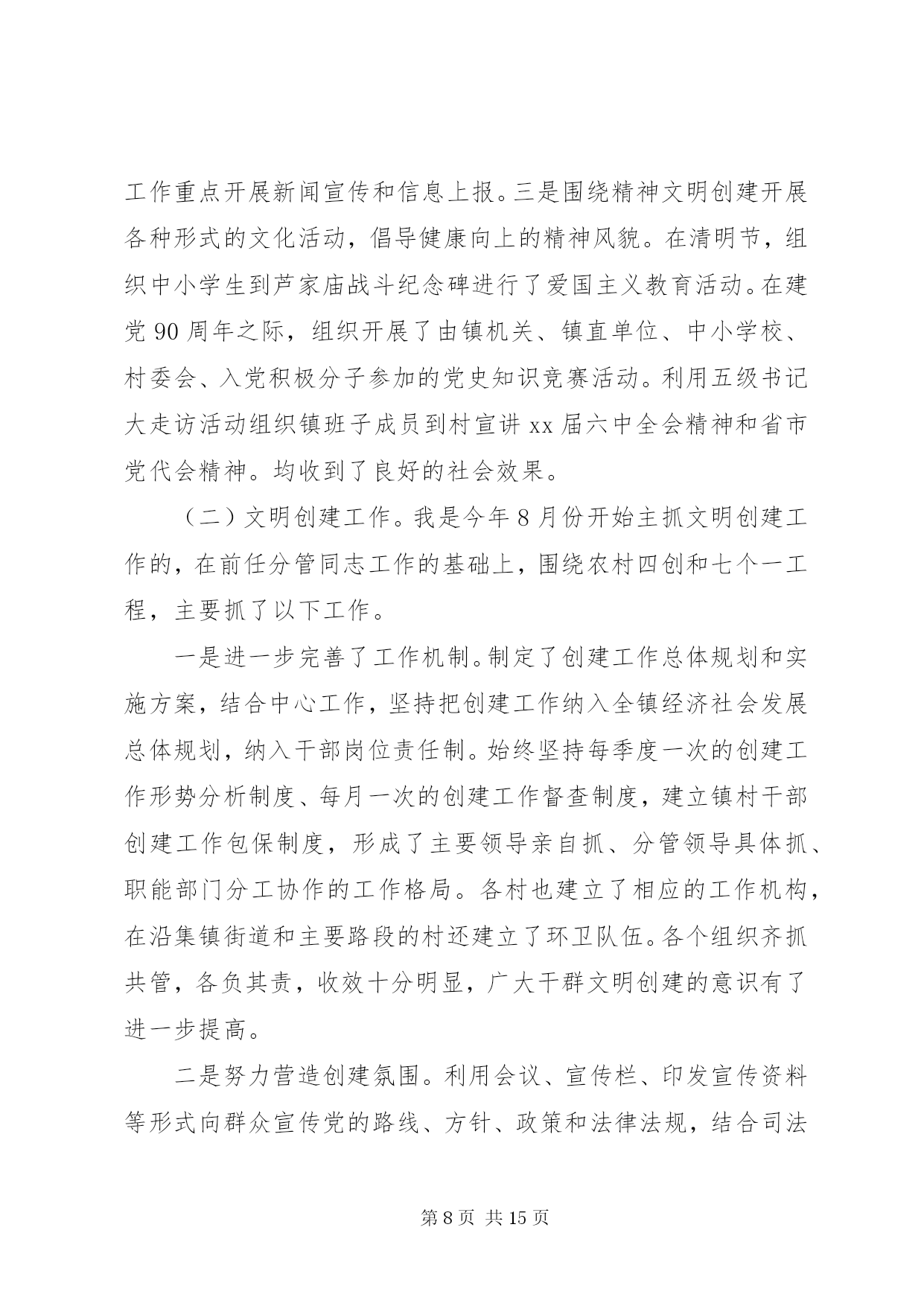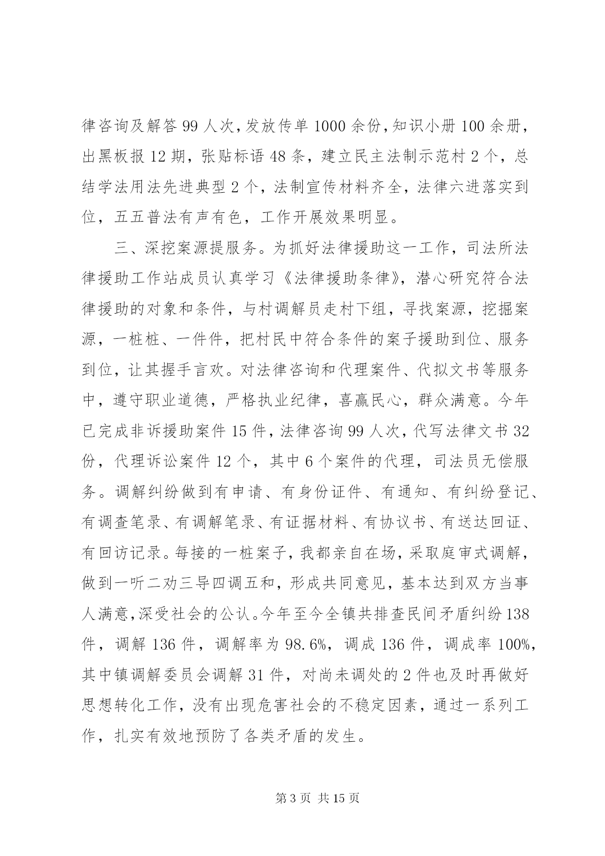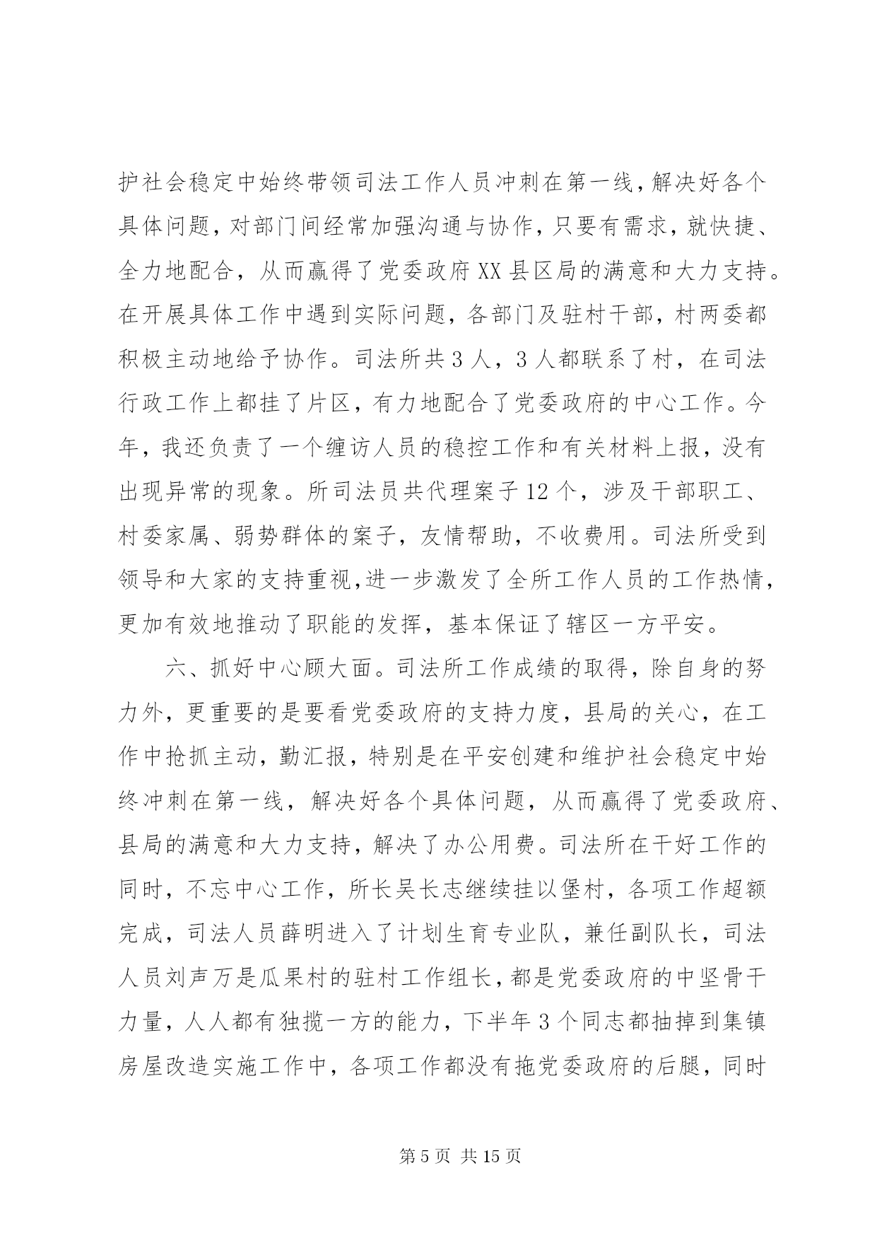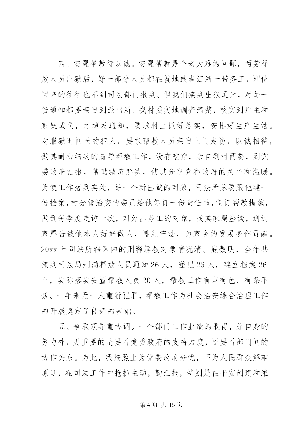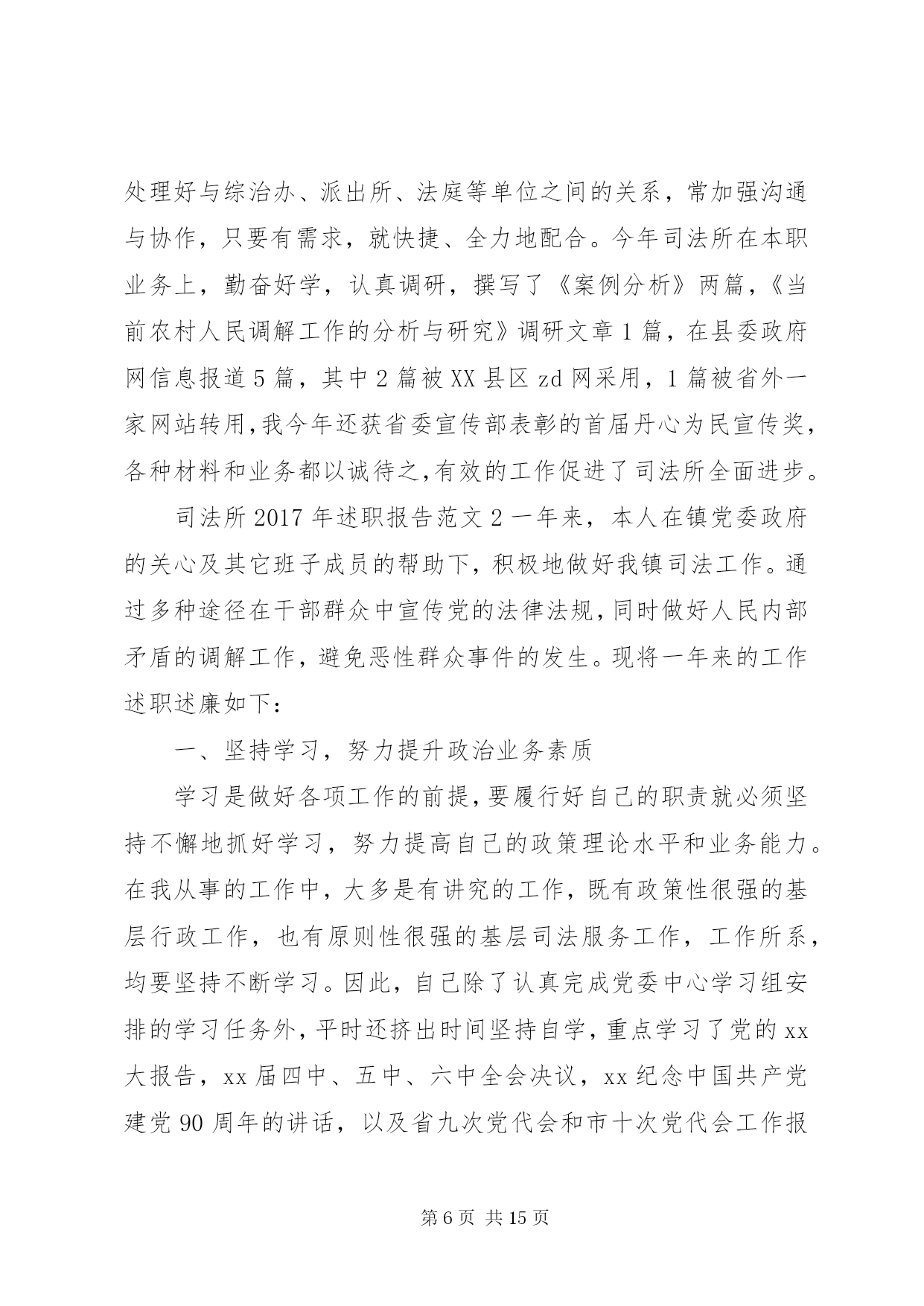 第PAGE\*Arabic\*MERGEFORMAT15页共NUMPAGES\*MERGEFORMAT15页司法所XX年述职报告司法所2017年述职报告范文1尊敬的各位领导,各位同志:20xx年,作为xx司法所长的我,在镇党委、政府XX县区司法局的正确领导和精心指导下,紧紧围绕稳定、改革、发展这一主题,团结带领全所3名同志,认真贯彻落实十七届五中全会精神,学习实践科学发展观,抓普法打基础、重调解破难题、强服务增意识、勤帮教抓重点,强化基础建设,落实责任措施,在维护基层社会稳定中较好地发挥第一道防线的作用,为实现建设平安xx的目标奠定了坚实的基础,从而显著提升司法所在党委、政府各部门中的重要地位,推进司法行政工作健康有序发展。现将我今年来的工作作述职述廉报告,不对之处,敬请批评指正。一、勤于苦学专业务。为了更好地适应岗位的需要,更好地履行所长职责,我始终注意把学习放在重要的位置。在工作中或在工作之余,认真学习学习有关文件、法律法规及《云南司法》、《人民调解》、《XX省社区矫正工作文件资料汇编》等司法行政有关内容,充实自己的理论基础,掌握司法行政业务,合理运用方式方法,做到用理论指导实践,用实践促进理论学习。通过一系列的学习,以弥补自己不足,努力提高政治业务素质,不断夯实从事司法行政工作的理论基础,以务实的作风踏实干好本职工作,履行所长职责。二、身先士卒抓普法。xx司法所,在迎接今年五五普法法制宣传教育中,按照五五普法验收标准,紧扣构建和谐社会主体,充分发挥法制宣传教育思想教育,舆论导向、疏导矛盾、法律服务等功能作用,整合资源,巩固学法用法阵地,积极开展法律六进活动,着力提高公民的法律意识和法律素质,推进依法治镇进程。我带领3名同志,一是认真抓好阵地宣传,做好每月一期的黑板报法律宣传活动。二是认真抓好阶段性工作宣传,以组织抓好禁毒防艾,构建和谐为主题的6.26、10.26两个禁毒日和12.4一个法制宣传日的宣传活动,强化舆论氛围。三是积极组织农民学习《中华人民共和国农村土地承包经营纠纷调解仲裁法》,在各村、各小组组织辅导和培训,让广大干部群众更好地掌握了解这部法律的基本知识,找到解决农村土地承包调解和仲裁的法律依据和法律效率。四是亲临中、小学上法制课开展讲座,到各村宣讲《教师法》、《九年义务教育法》、《未成年人保护法》、《森林法》等法律法规和各种文件,出黑板报,挂大幅标语,有力地使政府普九和林改两项工作得以顺利实施。五是组织xx中心学校认真开展学法守法用法,建设美好祖国青少年法律知识竞赛活动,充分调动广大青少年学法用法的积极性和自觉性,增强青少年法制宣传教育的针对性、时效性和有效性。今年普法对象49000人,参训人数36700人,参训率达70%以上,建立学法制度单位2个,创建平安校园3个,宣讲法制场次23次,开展法律咨询及解答99人次,发放传单1000余份,知识小册100余册,出黑板报12期,张贴标语48条,建立民主法制示范村2个,总结学法用法先进典型2个,法制宣传材料齐全,法律六进落实到位,五五普法有声有色,工作开展效果明显。三、深挖案源提服务。为抓好法律援助这一工作,司法所法律援助工作站成员认真学习《法律援助条律》,潜心研究符合法律援助的对象和条件,与村调解员走村下组,寻找案源,挖掘案源,一桩桩、一件件,把村民中符合条件的案子援助到位、服务到位,让其握手言欢。对法律咨询和代理案件、代拟文书等服务中,遵守职业道德,严格执业纪律,喜赢民心,群众满意。今年已完成非诉援助案件15件,法律咨询99人次,代写法律文书32份,代理诉讼案件12个,其中6个案件的代理,司法员无偿服务。调解纠纷做到有申请、有身份证件、有通知、有纠纷登记、有调查笔录、有调解笔录、有证据材料、有协议书、有送达回证、有回访记录。每接的一桩案子,我都亲自在场,采取庭审式调解,做到一听二劝三导四调五和,形成共同意见,基本达到双方当事人满意,深受社会的公认。今年至今全镇共排查民间矛盾纠纷138件,调解136件,调解率为98.6%,调成136件,调成率100%,其中镇调解委员会调解31件,对尚未调处的2件也及时再做好思想转化工作,没有出现危害社会的不稳定因素,通过一系列工作,扎实有效地预防了各类矛盾的发生。四、安置帮教待以诚。安置帮教是个老大难的问题,两劳释放人员出狱后,好一部分人员都在就地或者江浙一带务工,即使回来的往往也不到司法部门报到。但我们接到出狱通知,对每一份通知都要亲自到派出所、找村委实地调查清楚,核实到户主和家庭成员,才填发通知,要求村上抓好落实,安排好生产生活。对服狱时间长的犯人,要求帮教人员亲自上门走访,以诚相待,做其耐心细致的疏导帮教工作,没有吃穿,亲自到村两委,到党委政府汇报,帮助救济解决,使其分享党和政府的关怀和温暖。为使工作