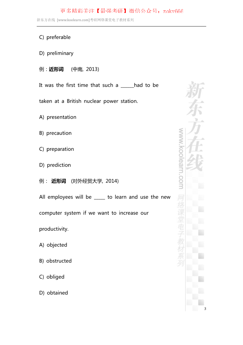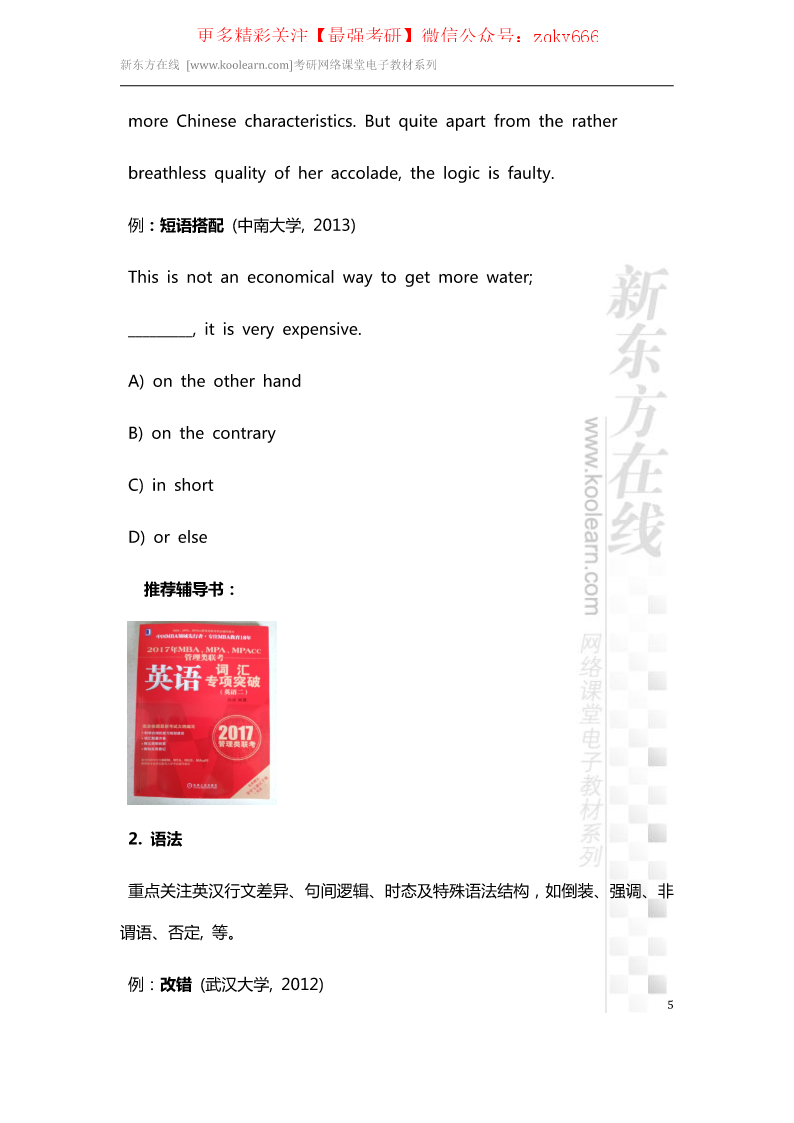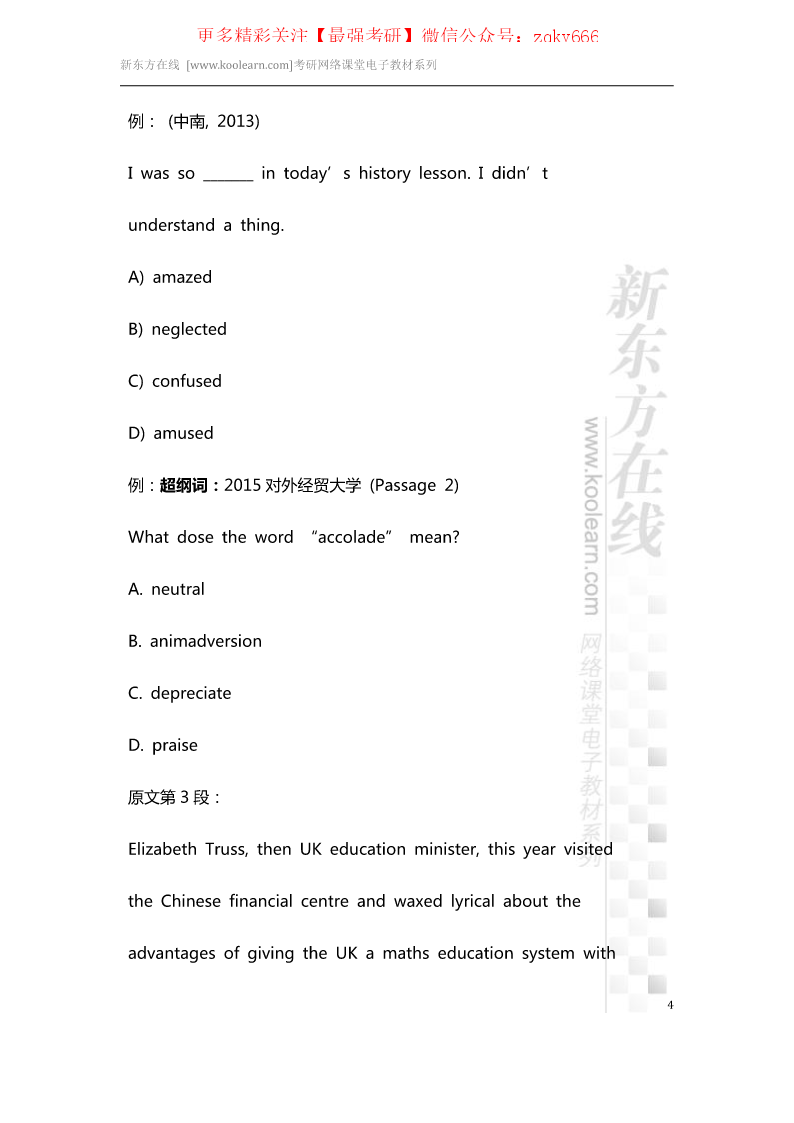更多精彩关注【最强考研】微信公众号:zqky666新东方在线考研网络课堂电子教材系列[www.koolearn.com]翻译硕士(MTI)阅读导学篇主讲:薛冰Correspondence:邮箱:ncexb@163.comQQ:1242606690微博:weibo.com/ncexb新浪博客:blog.sina.com.cn/u/2205522701欢迎使用新东方在线电子教材(。・∀・)ノ゙嗨,如对课程和讲义内容有任何疑问,请及时在知识堂反馈哦~我们将在24小时内解决。0更多精彩关注【最强考研】微信公众号:zqky666新东方在线考研网络课堂电子教材系列[www.koolearn.com]想少走弯路,得这样复习—翻硕备考从真题说起主讲:薛冰新东方元老级教师。多年主讲考研英语,经验丰富。曾获新东方教学十年功勋戒指和20周年功勋教师奖牌。新东方在线网络课程:MTI(翻译硕士)主讲,新概念英语三、四册主讲,30天攻克英语长难句(初、中、高)主讲。数次荣获新东方优秀教师,曾任新东方人力资源部招聘师,新东方教师委员会成员,创办“无敌英语阅读”项目,独创“三位一体”教学法。曾在美国访学,获得马萨诸塞州立大学“教育理念和领导力”培训结业证书。在国家核心期刊出版学术论文16篇,国家级出版社出版著作15部。一.考试题型/分值二.复习规划1.词汇2.语法3.阅读4.写作《政治》:全国统一出题,100分;《翻译硕士英语》:各校自主命题,100分;《英语翻译基础》:各校自主命题,150分;《汉语写作与百科知识》:各校自主命题,150分。1更多精彩关注【最强考研】微信公众号:zqky666新东方在线考研网络课堂电子教材系列[www.koolearn.com]《翻译硕士英语》分为三个部分:词汇语法30分阅读理解40分英语写作30分词汇语法部分出题灵活,题型多样,最常见的是选择题形式以及比较有难度的改错题形式,其难度相当于英语专业八级的水平。1.词汇:认知词汇量在10,000以上,掌握6000以上的积极词汇,即能正确而熟练地运用常用词汇及其常用搭配,如counton,bankon,relievesbofsth,attribute..to…,attach…to…,associate…with….字母表顺序背诵+阅读背诵;重点:动词、形容词、名词、近形词、近义词。生词、超纲词逻辑线索(转折、对比、递进、条件等)例:近形词(北航,2013)A______examinationisonewhichisinpreparationforsomething.A)predominantB)premature2更多精彩关注【最强考研】微信公众号:zqky666新东方在线考研网络课堂电子教材系列[www.koolearn.com]C)preferableD)preliminary例:近形词(中南,2013)Itwasthefirsttimethatsucha______hadtobetakenataBritishnuclearpowerstation.A)presentationB)precautionC)preparationD)prediction例:近形词(对外经贸大学,2014)Allemployeeswillbe_____tolearnandusethenewcomputersystemifwewanttoincreaseourproductivity.A)objectedB)obstructedC)obligedD)obtained3更多精彩关注【最强考研】微信公众号:zqky666新东方在线考研网络课堂电子教材系列[www.koolearn.com]例:(中南,2013)Iwasso_______intoday’shistorylesson.Ididn’tunderstandathing.A)amazedB)neglectedC)confusedD)amused例:超纲词:2015对外经贸大学(Passage2)Whatdosetheword“accolade”mean?A.neutralB.animadversionC.depreciateD.praise原文第3段:ElizabethTruss,thenUKeducationminister,thisyear