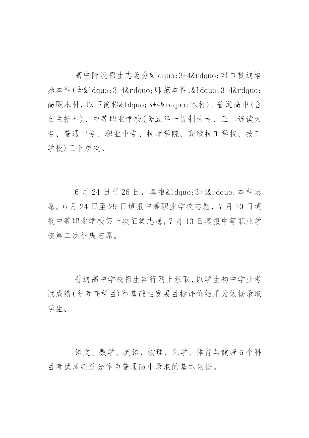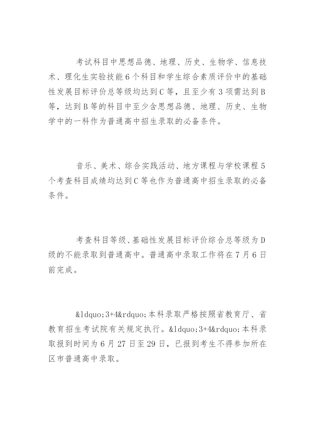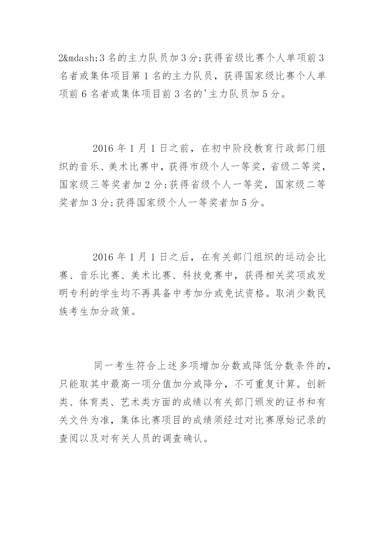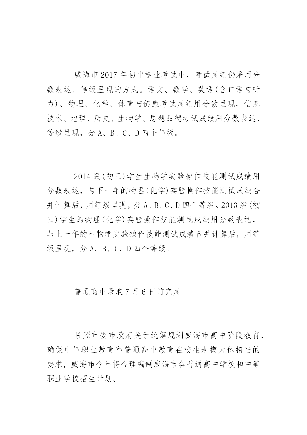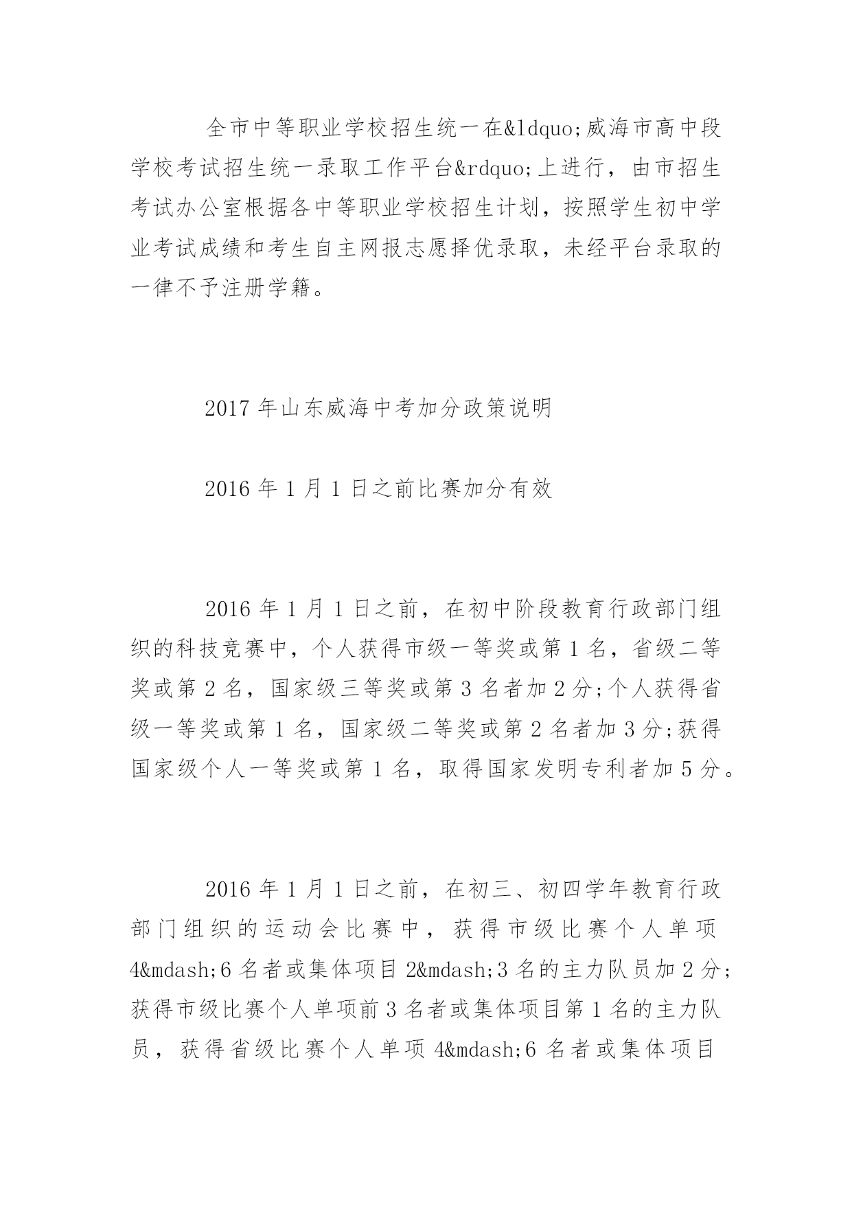 山东威海中考政策公布2017年山东威海中考政策公布中考招生录取政策是各学校录取学生的重要工作进程,大家都了解中考招生录取政策?下面是百分网小编整理的2017年山东威海中考招生录取政策,希望能帮到你。2017年山东威海中考政策公布昨日,山东省威海市2017年初中学业考试及高中段学校招生录取工作意见出炉。从威海市招办了解到,今年威海市初中学业考试政策与去年大致相同,英语考试仍包含口语与听力,考试成绩仍采用分数加等级的方式呈现。中考3天,6月23日前公布成绩根据威海市2017年初中学业考试安排,2013级(初四)学生考试科目为语文、数学、英语(含口语与听力)、物理(含实验操作技能)、化学(含实验操作技能)、思想品德、体育与健康,其中物理和化学实验操作技能的测试实行二选一;2014级(初三)学生考试科目为历史、生物学(含实验操作技能),2015级(初二)学生考试科目为地理、信息技术。已参加地理、信息技术考试、历史、生物学考试,对成绩不满意的考生可申请重考1次,取最好成绩作为最终成绩。初二、初三阶段未考的科目,可申请报名补考。考查科目采用过程性评价和终结性评价相结合的方式。音乐、美术、综合实践活动的终结性评价在初四学年第二学期进行,地方课程与学校课程的终结性评价在课程结业时进行。威海市以外初中学校转入的学生均须参加上述所有科目考试。根据考试安排,语文、数学、英语、思想品德、物理、化学、历史、生物学、地理学科,考试时间仍为6月12日至14日。6月20日前完成评卷、数据检查及统计工作,6月23日前公布成绩。考试成绩仍用分数表达、等级呈现威海市2017年初中学业考试中,考试成绩仍采用分数表达、等级呈现的方式。语文、数学、英语(含口语与听力)、物理、化学、体育与健康考试成绩用分数呈现,信息技术、地理、历史、生物学、思想品德考试成绩用分数表达、等级呈现,分A、B、C、D四个等级。2014级(初三)学生生物学实验操作技能测试成绩用分数表达,与下一年的物理(化学)实验操作技能测试成绩合并计算后,用等级呈现,分A、B、C、D四个等级。2013级(初四)学生的物理(化学)实验操作技能测试成绩用分数表达,与上一年的生物学实验操作技能测试成绩合并计算后,用等级呈现,分A、B、C、D四个等级。普通高中录取7月6日前完成按照市委市政府关于统筹规划威海市高中阶段教育,确保中等职业教育和普通高中教育在校生规模大体相当的要求,威海市今年将合理编制威海市各普通高中学校和中等职业学校招生计划。高中阶段招生志愿分“3+4”对口贯通培养本科(含“3+4”师范本科、“3+4”高职本科,以下简称“3+4”本科)、普通高中(含自主招生)、中等职业学校(含五年一贯制大专、三二连读大专、普通中专、职业中专、技师学院、高级技工学校、技工学校)三个层次。6月24日至26日,填报“3+4”本科志愿。6月24日至29日填报中等职业学校志愿,7月10日填报中等职业学校第一次征集志愿,7月13日填报中等职业学校第二次征集志愿。普通高中学校招生实行网上录取,以学生初中学业考试成绩(含考查科目)和基础性发展目标评价结果为依据录取学生。语文、数学、英语、物理、化学、体育与健康6个科目考试成绩总分作为普通高中录取的基本依据。考试科目中思想品德、地理、历史、生物学、信息技术、理化生实验技能6个科目和学生综合素质评价中的基础性发展目标评价总等级均达到C等,且至少有3项需达到B等,达到B等的科目中至少含思想品德、地理、历史、生物学中的一科作为普通高中招生录取的必备条件。音乐、美术、综合实践活动、地方课程与学校课程5个考查科目成绩均达到C等也作为普通高中招生录取的必备条件。考查科目等级、基础性发展目标评价综合总等级为D级的不能录取到普通高中。普通高中录取工作将在7月6日前完成。“3+4”本科录取严格按照省教育厅、省教育招生考试院有关规定执行。“3+4”本科录取报到时间为6月27日至29日,已报到考生不得参加所在区市普通高中录取。全市中等职业学校招生统一在“威海市高中段学校考试招生统一录取工作平台”上进行,由市招生考试办公室根据各中等职业学校招生计划,按照学生初中学业考试成绩和考生自主网报志愿择优录取,未经平台录取的一律不予注册学籍。2017年山东威海中考加分政策说明2016年1月1日之前比赛加分有效2016年1月1日之前,在初中阶段教育行政部门组织的科技竞赛中,个人获得市级一等奖或第1名,省级二等奖或第2名,国家级三等奖或第3名者加2分;个人获得省级一等奖或第1名,国家级