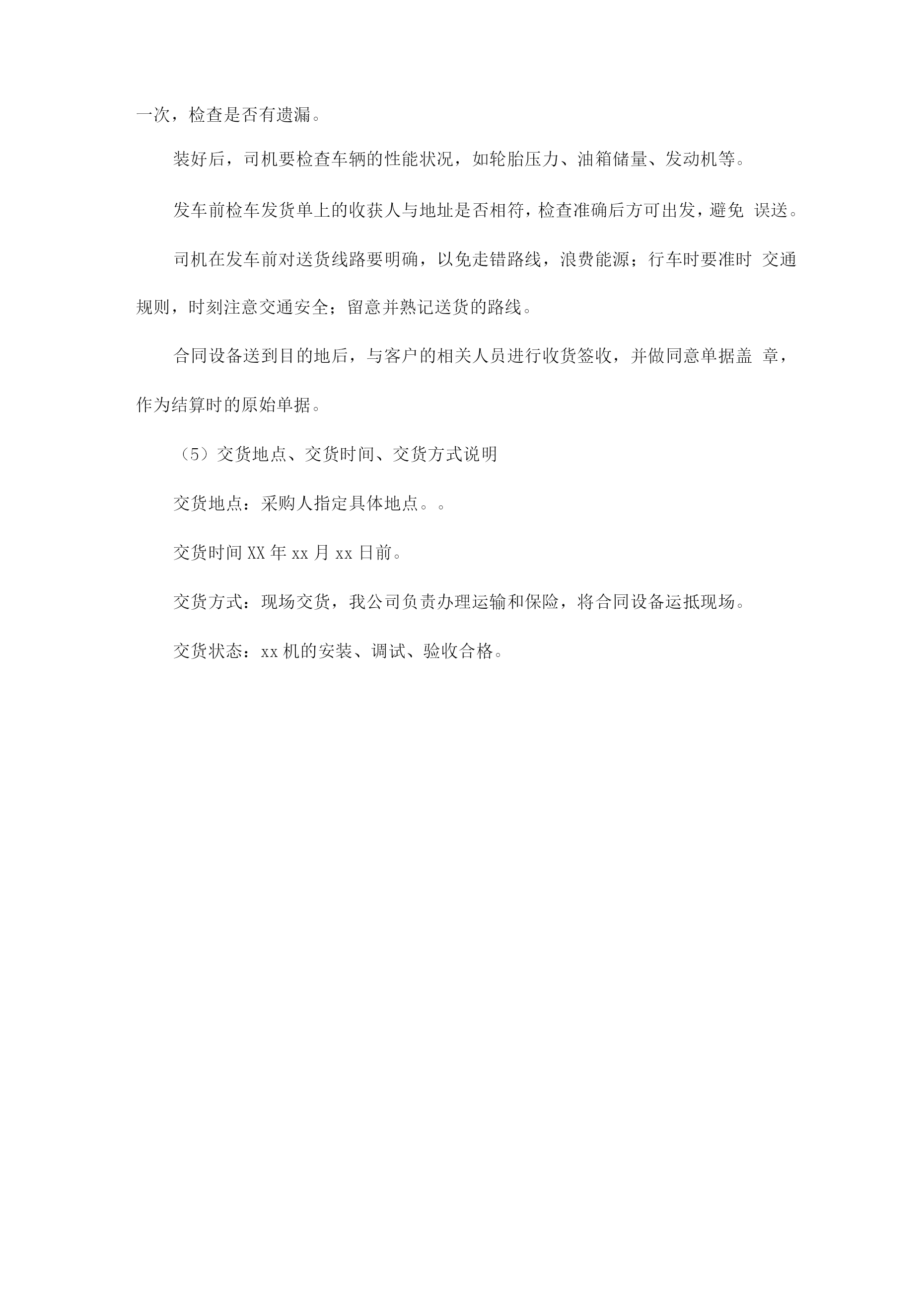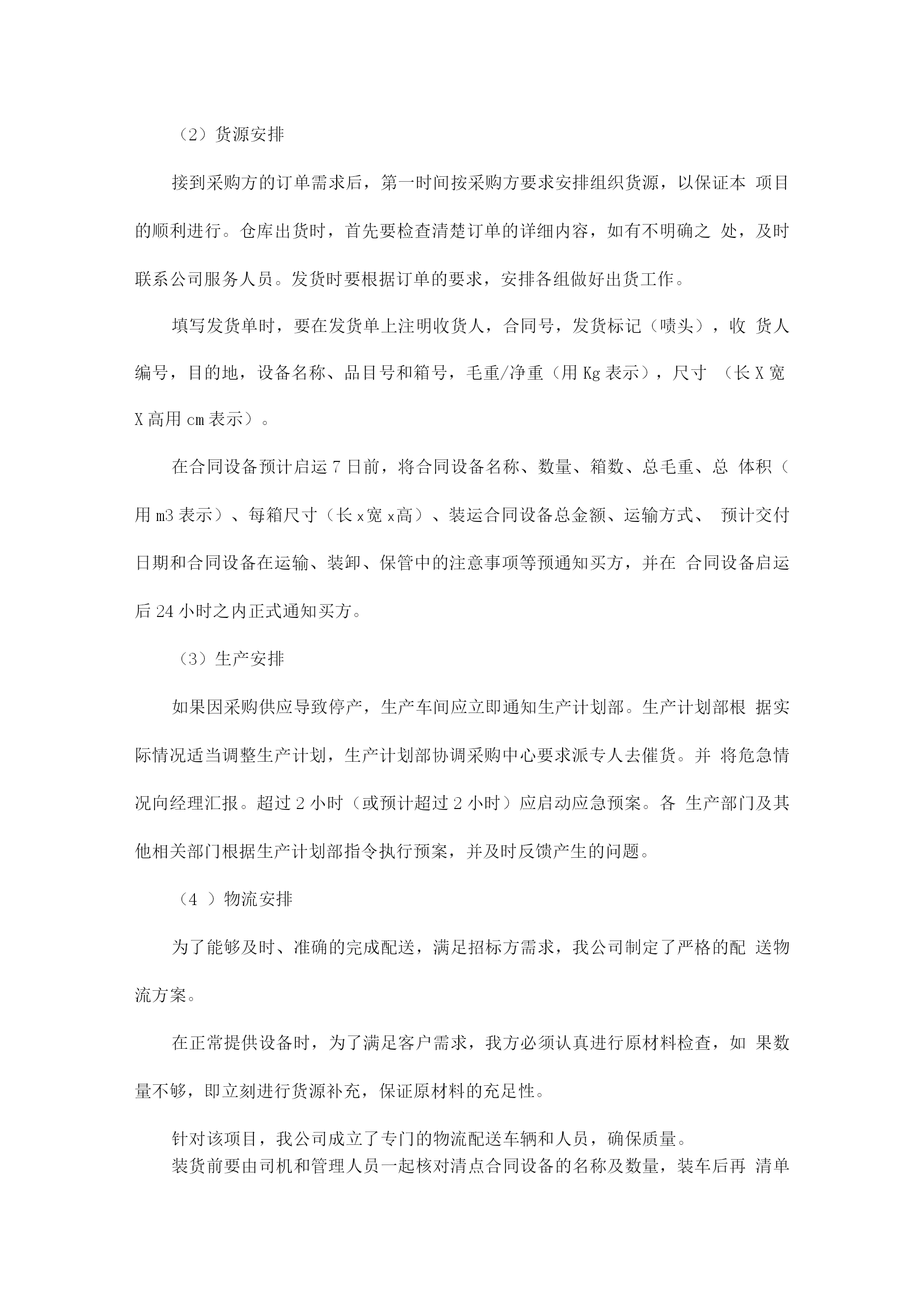 机械设备供货方案针对本项目特点,为保证供货质量及进度,我公司成立正、负极xx机供货小组,拟定如下图所示的保证体系。(1)订单管理现场联络人员时刻与采购方保持联系,及时将采购方需求和变更计划反馈到本公司,以便及时调整供货方案。服务人员收到订单后,首先要详细检查并填好有关内容:1)合同设备(正、负极XX机)的数量,规格,名称等。2)配送地址,电话号码。3)接单日期。4)接单经手人签名。确认订单内容准确无误后,统一由项目组负责,传订单到财务审核,审核通过后再传到服务人员手中。服务人员把当天的原始订单整理好,统一交项目组的相关人员保管,编写当日订单流水号,按时间顺序装订成册。服务人员对合同设备进行配送前的检测,采购检测合格后,由管理人员做派送前准备。(2)货源安排接到采购方的订单需求后,第一时间按采购方要求安排组织货源,以保证本项目的顺利进行。仓库出货时,首先要检查清楚订单的详细内容,如有不明确之处,及时联系公司服务人员。发货时要根据订单的要求,安排各组做好出货工作。填写发货单时,要在发货单上注明收货人,合同号,发货标记(啧头),收货人编号,目的地,设备名称、品目号和箱号,毛重/净重(用Kg表示),尺寸(长X宽X高用cm表示)。在合同设备预计启运7日前,将合同设备名称、数量、箱数、总毛重、总体积(用m3表示)、每箱尺寸(长x宽x高)、装运合同设备总金额、运输方式、预计交付日期和合同设备在运输、装卸、保管中的注意事项等预通知买方,并在合同设备启运后24小时之内正式通知买方。(3)生产安排如果因采购供应导致停产,生产车间应立即通知生产计划部。生产计划部根据实际情况适当调整生产计划,生产计划部协调采购中心要求派专人去催货。并将危急情况向经理汇报。超过2小时(或预计超过2小时)应启动应急预案。各生产部门及其他相关部门根据生产计划部指令执行预案,并及时反馈产生的问题。(4)物流安排为了能够及时、准确的完成配送,满足招标方需求,我公司制定了严格的配送物流方案。在正常提供设备时,为了满足客户需求,我方必须认真进行原材料检查,如果数量不够,即立刻进行货源补充,保证原材料的充足性。针对该项目,我公司成立了专门的物流配送车辆和人员,确保质量。装货前要由司机和管理人员一起核对清点合同设备的名称及数量,装车后再清单一次,检查是否有遗漏。装好后,司机要检查车辆的性能状况,如轮胎压力、油箱储量、发动机等。发车前检车发货单上的收获人与地址是否相符,检查准确后方可出发,避免误送。司机在发车前对送货线路要明确,以免走错路线,浪费能源;行车时要准时交通规则,时刻注意交通安全;留意并熟记送货的路线。合同设备送到目的地后,与客户的相关人员进行收货签收,并做同意单据盖章,作为结算时的原始单据。(5)交货地点、交货时间、交货方式说明交货地点:采购人指定具体地点。。交货时间XX年xx月xx日前。交货方式:现场交货,我公司负责办理运输和保险,将合同设备运抵现场。交货状态:xx机的安装、调试、验收合格。