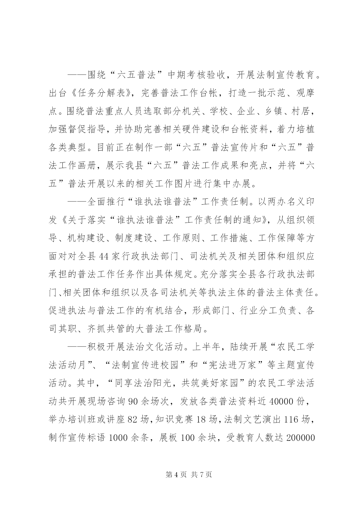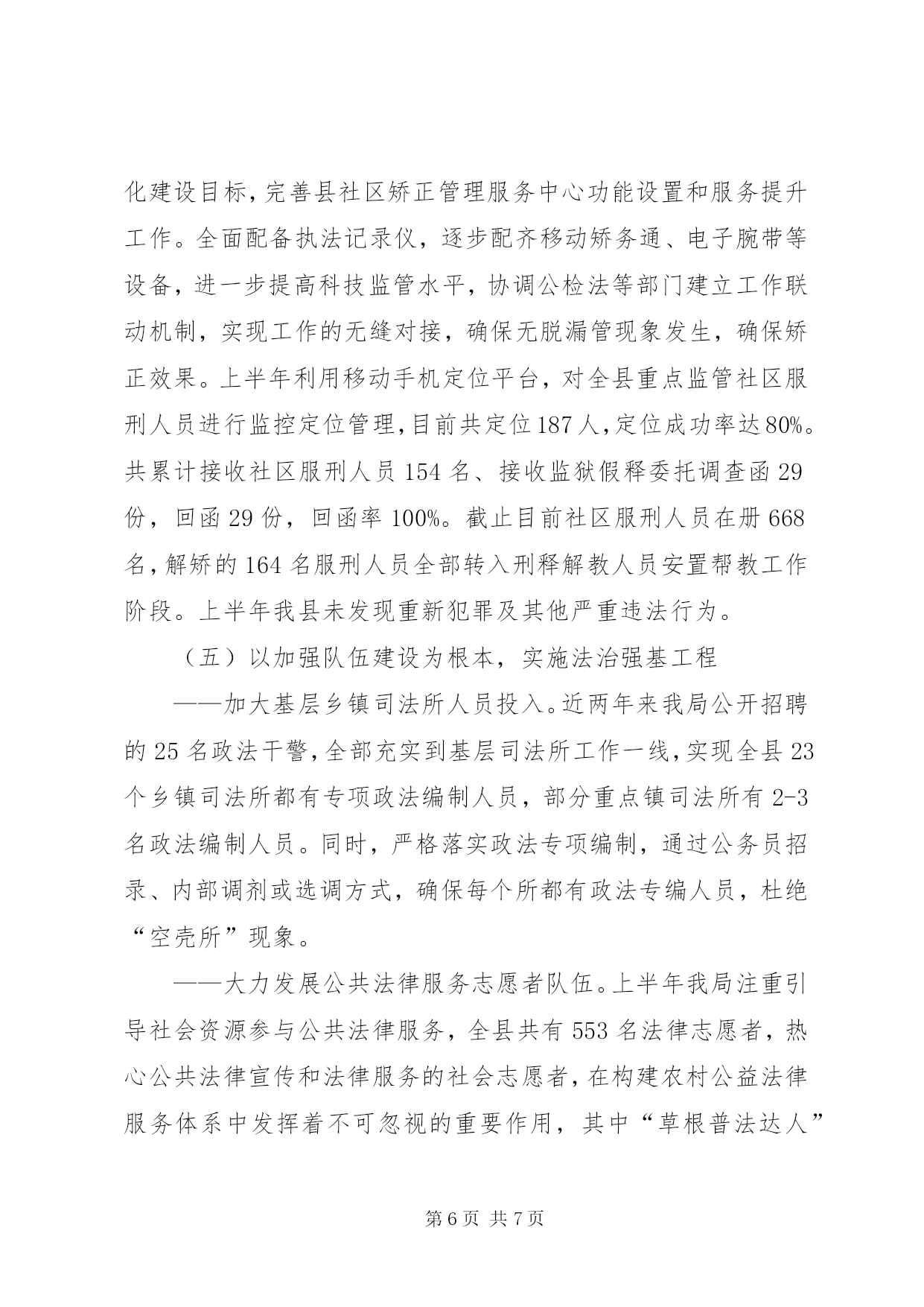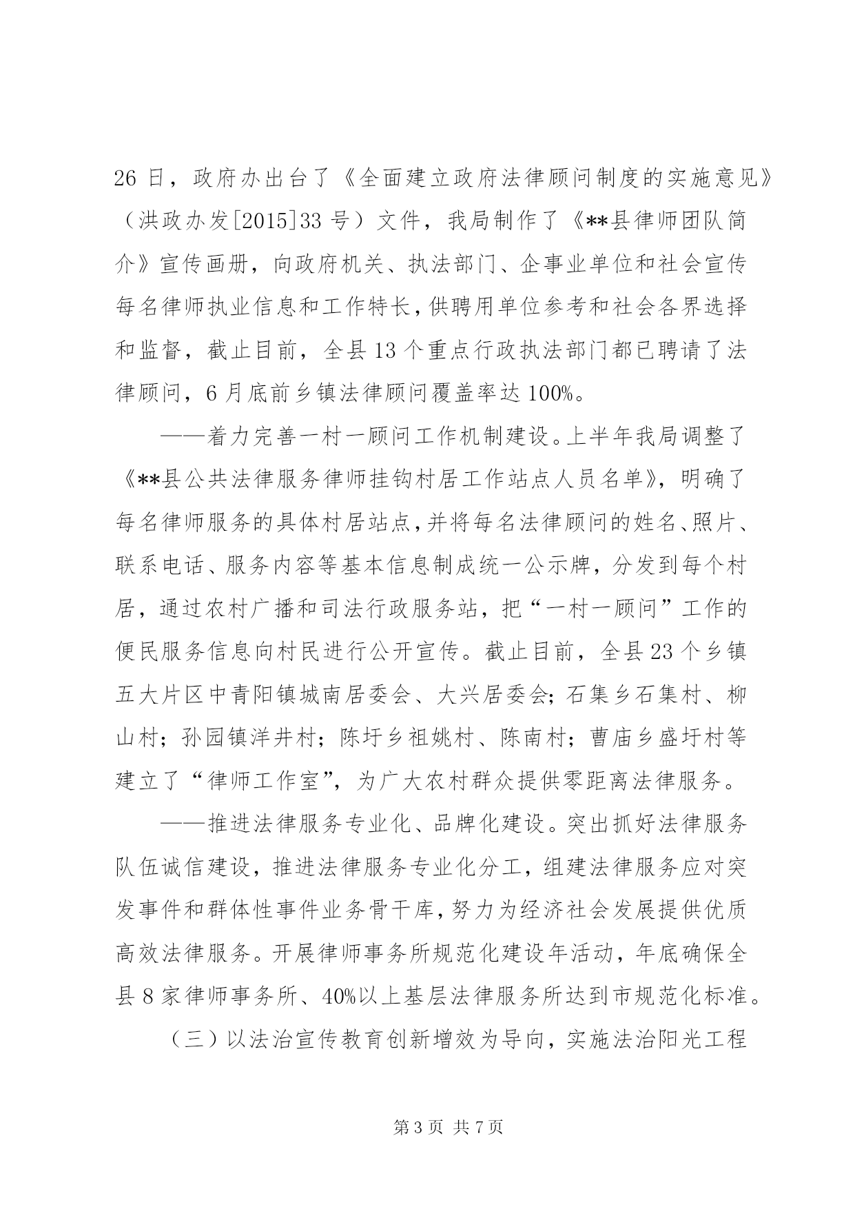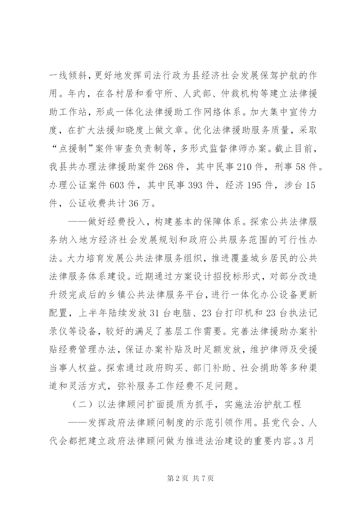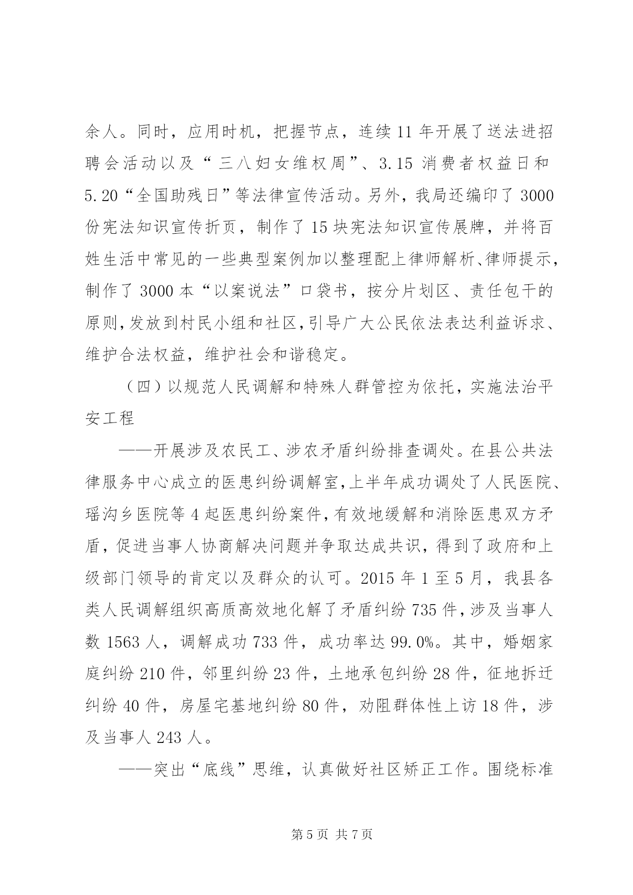 第PAGE\*Arabic\*MERGEFORMAT7页共NUMPAGES\*MERGEFORMAT7页司法局XX年年中工作总结2015年上半年,我局紧紧围绕县委、县政府提出的“稳中求进、适应新常态”的工作主基调,全面深入推进“五大工程”建设,为全县社会稳定和经济发展提供了强有力的法律服务和法律保障。(一)以公共法律服务水平提升为重点,实施法治惠民工程——加强载体建设,构建完备的县乡村三级平台体系。上半年我局加快拓展延伸基层司法行政服务职能,形成了以县公共法律服务中心为龙头、23个乡镇公共法律服务中心为补充、307个村(居)村居公共法律服务工作站为延伸的公共法律服务平台体系,其中,重点打造了城头、石集、归仁3个规范化乡镇公共法律服务中心,把人民调解、公证咨询、法律援助申请、特殊人群服务管理、安置帮教、法律顾问、法治宣传教育等零散服务功能集中起来,形成一个平台多功能服务,一揽子解决多项法律服务事项。截止目前,全县公共法律服务工作站共调处矛盾纠纷532件,调解成功530件,调解率100%,调解成功率99.6%,提供法律咨询700多人次,联系公证事项143件,联系法律援助案件76件,法律服务站已成为农村群众寻求法律帮助、咨询法律问题和化解矛盾纠纷的新平台。——明确职能定位,构建高效的服务体系。创新定位法律援助、公证、司法鉴定等职能,注重服务向乡村基层延伸,向企业一线倾斜,更好地发挥司法行政为县经济社会发展保驾护航的作用。年内,在各村居和看守所、人武部、仲裁机构等建立法律援助工作站,形成一体化法律援助工作网络体系。加大集中宣传力度,在扩大法援知晓度上做文章。优化法律援助服务质量,采取“点援制”案件审查负责制等,多形式监督律师办案。截止目前,我县共办理法律援助案件268件,其中民事210件,刑事58件。办理公证案件603件,其中民事393件,经济195件,涉台15件,公证收费共计36万。——做好经费投入,构建基本的保障体系。探索公共法律服务纳入地方经济社会发展规划和政府公共服务范围的可行性办法。大力培育发展公共法律服务组织,推进覆盖城乡居民的公共法律服务体系建设。近期通过方案设计招投标形式,对部分改造升级完成后的乡镇公共法律服务平台,进行一体化办公设备更新配置,上半年陆续发放31台电脑、23台打印机和23台执法记录仪等设备,较好的满足了基层工作需要。完善法律援助办案补贴经费管理办法,保证办案补贴及时足额发放,维护律师及受援当事人权益。探索通过政府购买、部门补助、社会捐助等多种渠道和灵活方式,弥补服务工作经费不足问题。(二)以法律顾问扩面提质为抓手,实施法治护航工程——发挥政府法律顾问制度的示范引领作用。县党代会、人代会都把建立政府法律顾问做为推进法治建设的重要内容。3月26日,政府办出台了《全面建立政府法律顾问制度的实施意见》(洪政办发[2015]33号)文件,我局制作了《**县律师团队简介》宣传画册,向政府机关、执法部门、企事业单位和社会宣传每名律师执业信息和工作特长,供聘用单位参考和社会各界选择和监督,截止目前,全县13个重点行政执法部门都已聘请了法律顾问,6月底前乡镇法律顾问覆盖率达100%。——着力完善一村一顾问工作机制建设。上半年我局调整了《**县公共法律服务律师挂钩村居工作站点人员名单》,明确了每名律师服务的具体村居站点,并将每名法律顾问的姓名、照片、联系电话、服务内容等基本信息制成统一公示牌,分发到每个村居,通过农村广播和司法行政服务站,把“一村一顾问”工作的便民服务信息向村民进行公开宣传。截止目前,全县23个乡镇五大片区中青阳镇城南居委会、大兴居委会;石集乡石集村、柳山村;孙园镇洋井村;陈圩乡祖姚村、陈南村;曹庙乡盛圩村等建立了“律师工作室”,为广大农村群众提供零距离法律服务。——推进法律服务专业化、品牌化建设。突出抓好法律服务队伍诚信建设,推进法律服务专业化分工,组建法律服务应对突发事件和群体性事件业务骨干库,努力为经济社会发展提供优质高效法律服务。开展律师事务所规范化建设年活动,年底确保全县8家律师事务所、40%以上基层法律服务所达到市规范化标准。(三)以法治宣传教育创新增效为导向,实施法治阳光工程——围绕“六五普法”中期考核验收,开展法制宣传教育。出台《任务分解表》,完善普法工作台帐,打造一批示范、观摩点。围绕普法重点人员选取部分机关、学校、企业、乡镇、村居,加强督促指导,并协助完善相关硬件建设和台帐资料,着力培植各类典型。目前正在制作一部“六五”普法宣传片和“六五”普法工作画册,展示我县“六五”普法工作成果和亮点,并将“六五”普法开展以来的相关工作图片进行集中办展。——全面推行“谁执法谁普法”工作责任制。以两办名义印发《关于落实“谁执法谁普法”工作责任制的通知》,从组织领导、机构建设、制