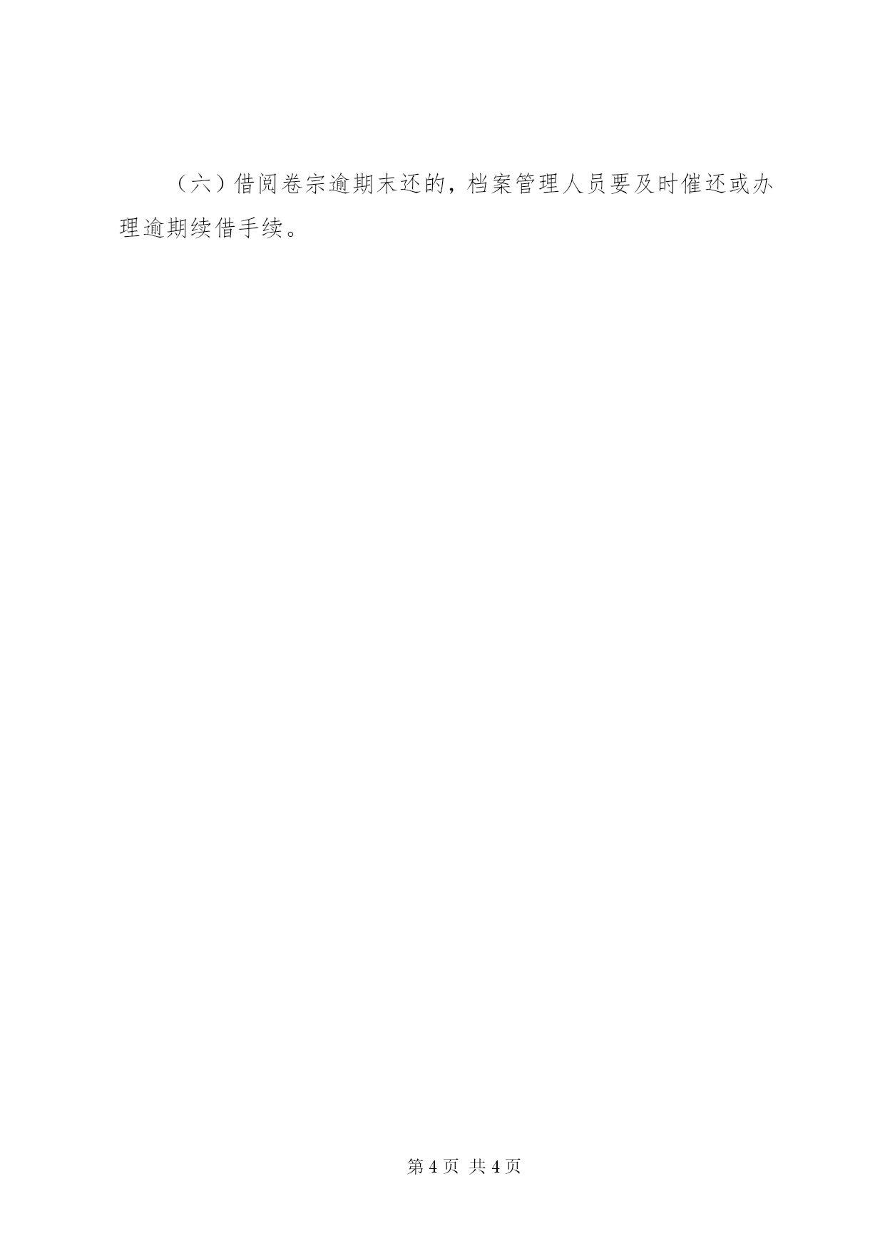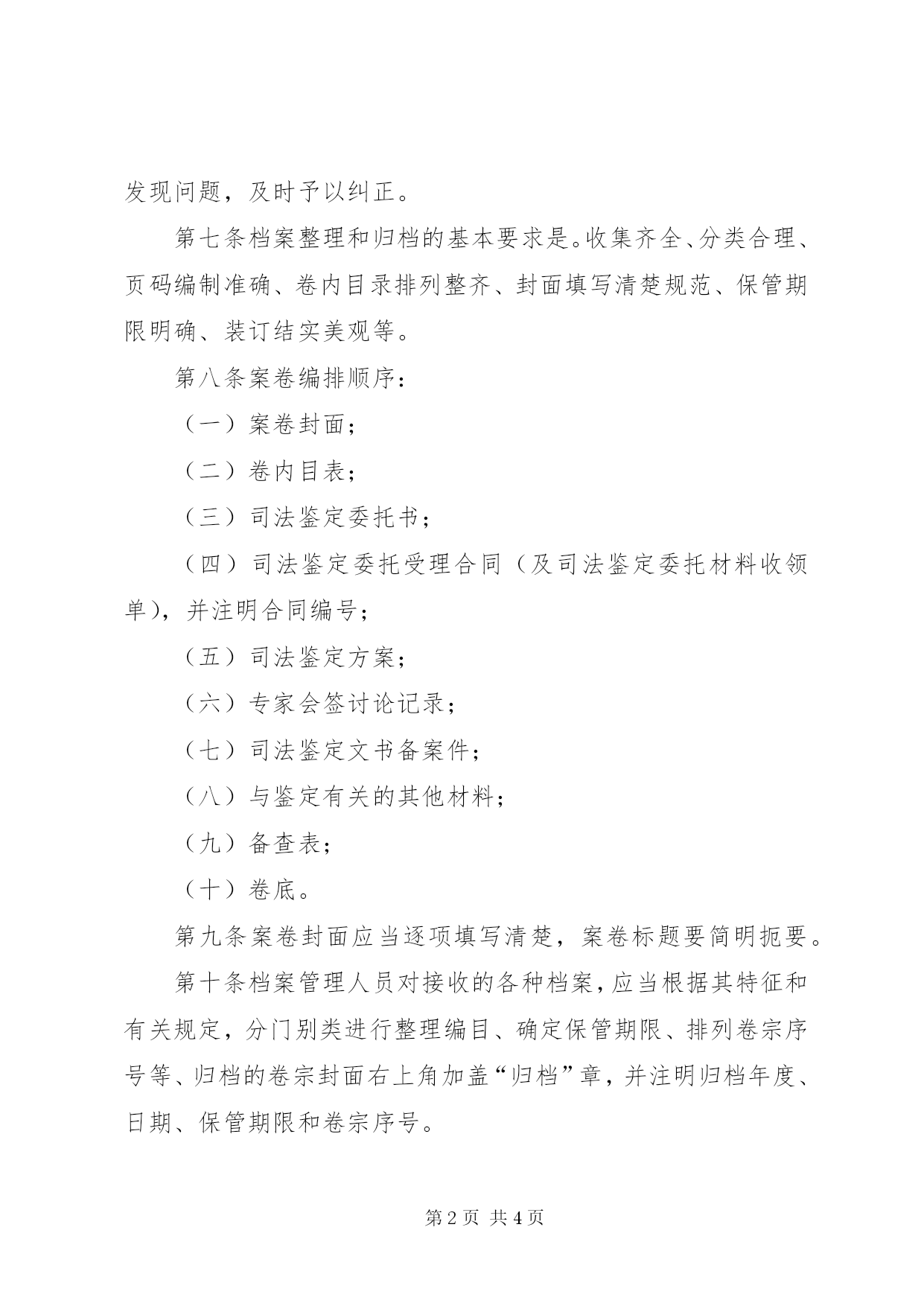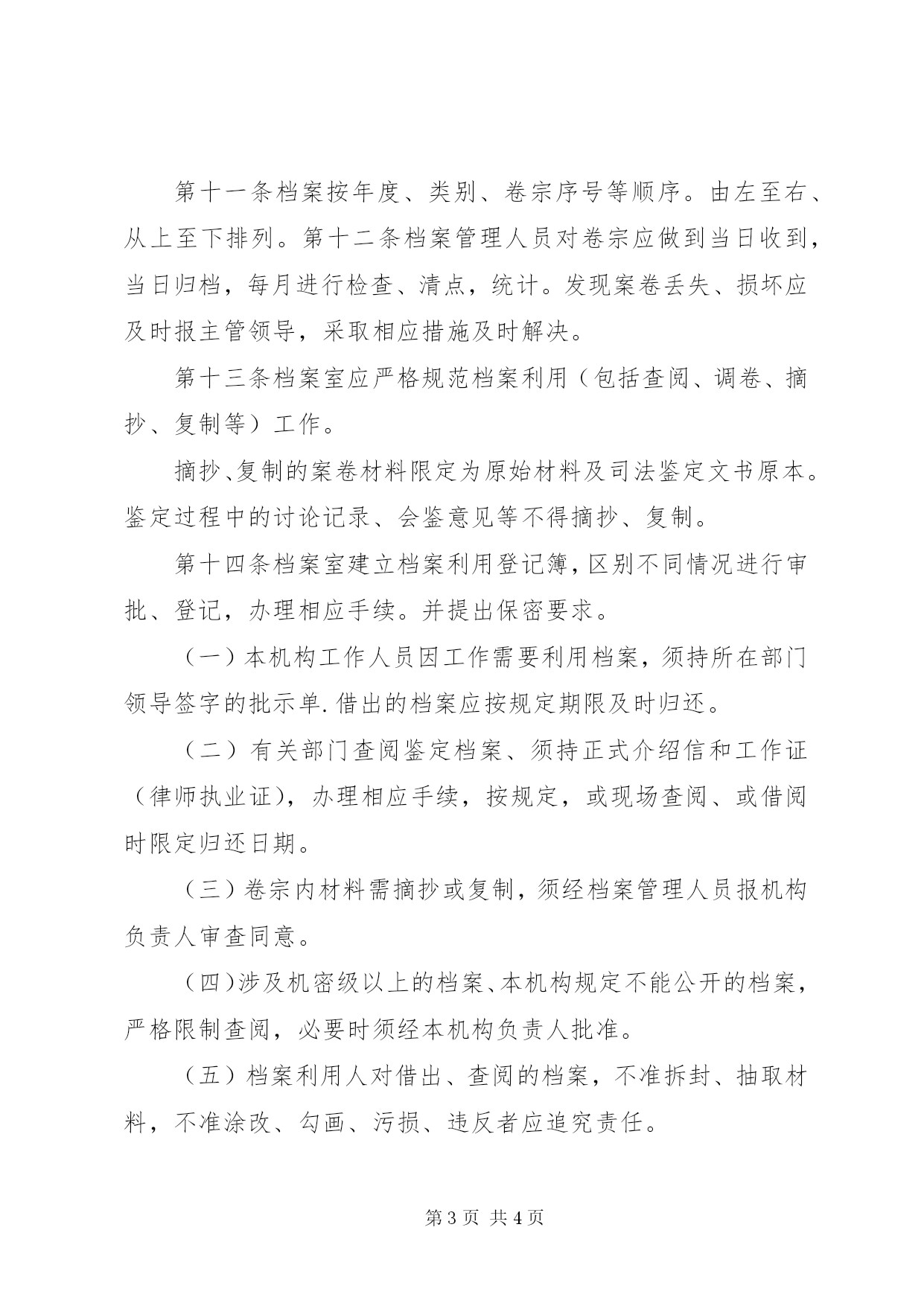 第PAGE\*Arabic\*MERGEFORMAT4页共NUMPAGES\*MERGEFORMAT4页XX省司法局司法鉴定工作档案管理制度司法鉴定所档案管理制度第一条为加强司法鉴定档案的管理,充分发挥档案的作用,更好地服务于司法鉴定工作,根据中华人民共和国《档案法》和有关法规、规章,结合工作实际,制定本办法。第二条档案管理遵循集中统一、维护档案的完整与安全的原则和便于利用的原则。第三条司法鉴定档案是存储信息的载体,是司法鉴定过程各个环节形成的或涉及的各种材料的总和。包括司法鉴定委托书、送鉴材料、调查材料。实验和检查记录、出庭质证记录、专家会鉴意见、司法鉴定文书、照片、数据、图表、图谱、音像资料、信函等等。第四条本机构设置档案室,并设专职档案管理人员。档案室统一收集、整理、保管、统计档案,并开展档案开发、利用和编研工作,为司法鉴定活动服务。档案管理人员要忠于职守、遵守纪律、保守秘密。第五条司法鉴定档案中所有文书资料、档案名称、档案目录、档案备查表等要求字迹清晰,必须用碳素或蓝黑墨水书写。第六条司法鉴定人在完成一项司法鉴定任务后,应当及时整理本人手中的案卷材料,3个工作日内交予档案管理人员归档。档案管理人员在收集整理时,要对照登记簿一一核对,及时发现问题,及时予以纠正。第七条档案整理和归档的基本要求是。收集齐全、分类合理、页码编制准确、卷内目录排列整齐、封面填写清楚规范、保管期限明确、装订结实美观等。第八条案卷编排顺序:(一)案卷封面;(二)卷内目表;(三)司法鉴定委托书;(四)司法鉴定委托受理合同(及司法鉴定委托材料收领单),并注明合同编号;(五)司法鉴定方案;(六)专家会签讨论记录;(七)司法鉴定文书备案件;(八)与鉴定有关的其他材料;(九)备查表;(十)卷底。第九条案卷封面应当逐项填写清楚,案卷标题要简明扼要。第十条档案管理人员对接收的各种档案,应当根据其特征和有关规定,分门别类进行整理编目、确定保管期限、排列卷宗序号等、归档的卷宗封面右上角加盖“归档”章,并注明归档年度、日期、保管期限和卷宗序号。第十一条档案按年度、类别、卷宗序号等顺序。由左至右、从上至下排列。第十二条档案管理人员对卷宗应做到当日收到,当日归档,每月进行检查、清点,统计。发现案卷丢失、损坏应及时报主管领导,采取相应措施及时解决。第十三条档案室应严格规范档案利用(包括查阅、调卷、摘抄、复制等)工作。摘抄、复制的案卷材料限定为原始材料及司法鉴定文书原本。鉴定过程中的讨论记录、会鉴意见等不得摘抄、复制。第十四条档案室建立档案利用登记簿,区别不同情况进行审批、登记,办理相应手续。并提出保密要求。(一)本机构工作人员因工作需要利用档案,须持所在部门领导签字的批示单.借出的档案应按规定期限及时归还。(二)有关部门查阅鉴定档案、须持正式介绍信和工作证(律师执业证),办理相应手续,按规定,或现场查阅、或借阅时限定归还日期。(三)卷宗内材料需摘抄或复制,须经档案管理人员报机构负责人审查同意。(四)涉及机密级以上的档案、本机构规定不能公开的档案,严格限制查阅,必要时须经本机构负责人批准。(五)档案利用人对借出、查阅的档案,不准拆封、抽取材料,不准涂改、勾画、污损、违反者应追究责任。(六)借阅卷宗逾期末还的,档案管理人员要及时催还或办理逾期续借手续。
