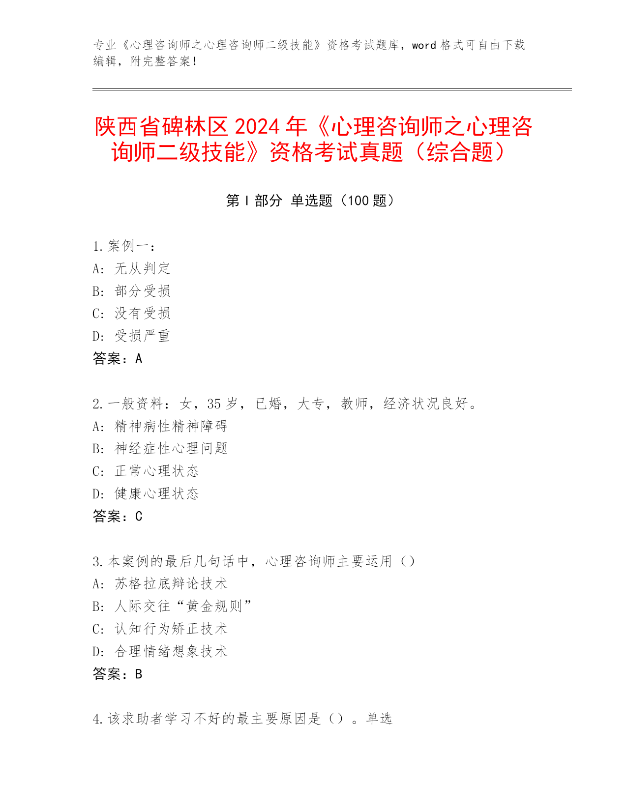 2024陕西省碑林区《心理咨询师之心理咨询师二级技能》资格考试通关秘籍题库(考试直接用)
