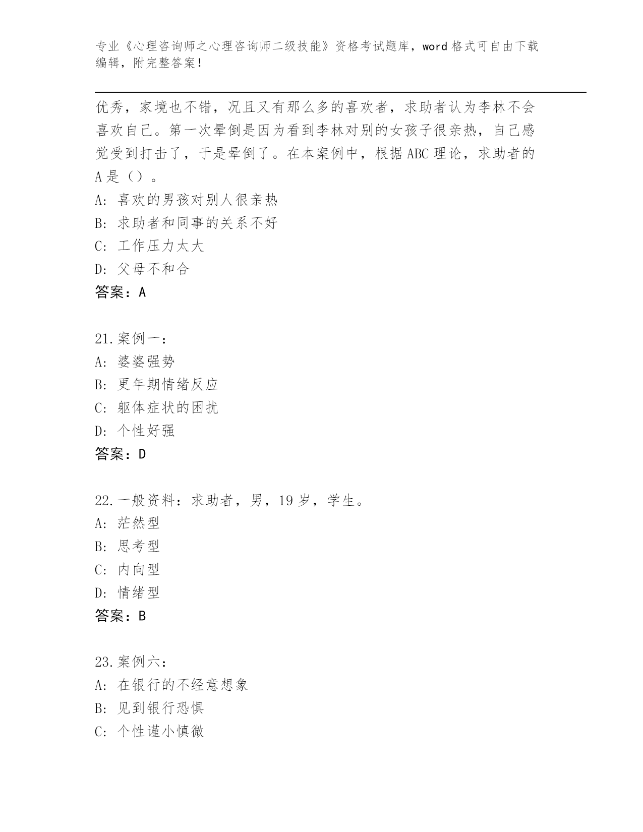 陕西省碑林区2024年《心理咨询师之心理咨询师二级技能》资格考试真题(综合题)