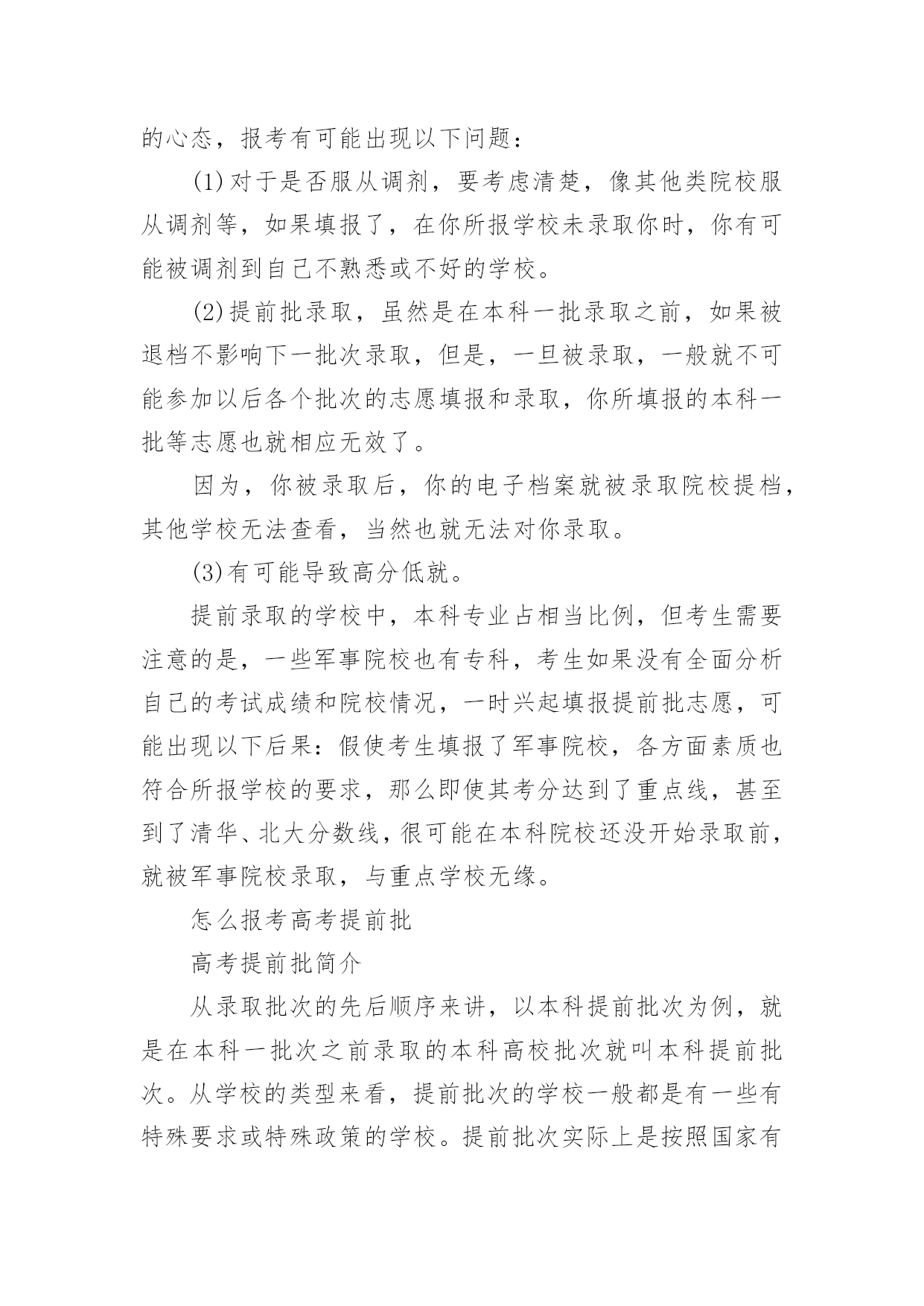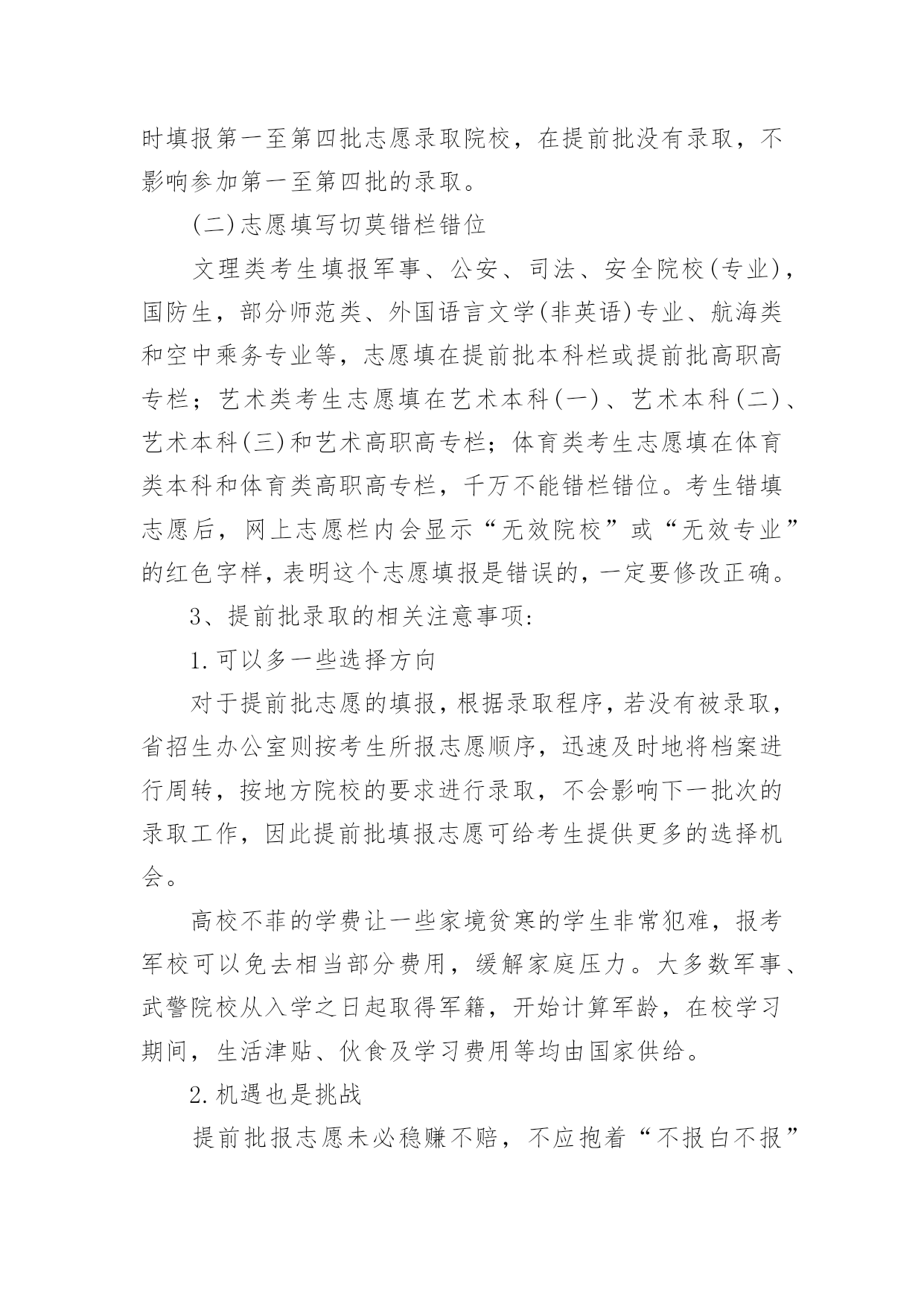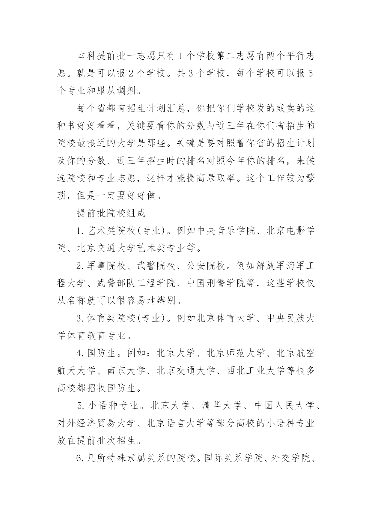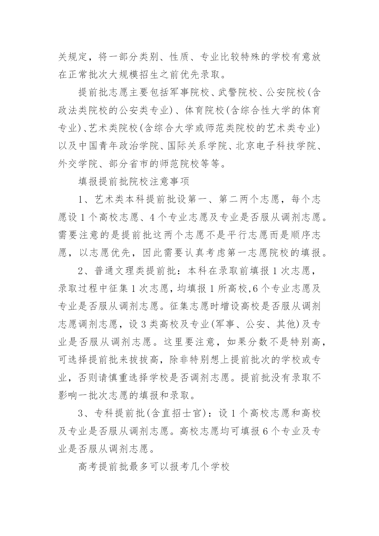 怎么报考高考提前批怎么报考高考提前批“提前批”即在大规模一批、二批招生之前进行的志愿填报。那么,怎么报考高考提前批次呢?下面小编带大家一起来看看详细内容,希望对大家有所帮助!怎么报考高考提前批1、提前批志愿主要包括:(1)军事院校、武警院校、公安院校(含政法类院校的公安类专业)。(2)体育院校(含综合性大学的体育专业)。(3)艺术类院校(含综合大学或师范类院校的艺术类专业)。(4)航海类院校(大连海事大学、上海海事大学)以及中国青年政治学院、国际关系学院、北京电子科技学院、外交学院、部分省市的师范院校等等。2、提前批填报规则(一)最好不要跨类兼报在提前批录取的有文理类、艺术类、体育类,提前批的投档顺序一般为文理类、艺术类、体育类,由于每类录取的要求差异较大,建议考生最好只选报其中一类,不要跨类兼报。如果跨类兼报了,只要是按志愿录取的,不管录取到了哪一类都不能以任何理由要求退档。填报了提前批志愿的考生,还可根据自己文化课考试科类和成绩在第二次填报志愿时填报第一至第四批志愿录取院校,在提前批没有录取,不影响参加第一至第四批的录取。(二)志愿填写切莫错栏错位文理类考生填报军事、公安、司法、安全院校(专业),国防生,部分师范类、外国语言文学(非英语)专业、航海类和空中乘务专业等,志愿填在提前批本科栏或提前批高职高专栏;艺术类考生志愿填在艺术本科(一)、艺术本科(二)、艺术本科(三)和艺术高职高专栏;体育类考生志愿填在体育类本科和体育类高职高专栏,千万不能错栏错位。考生错填志愿后,网上志愿栏内会显示“无效院校”或“无效专业”的红色字样,表明这个志愿填报是错误的,一定要修改正确。3、提前批录取的相关注意事项:1.可以多一些选择方向对于提前批志愿的填报,根据录取程序,若没有被录取,省招生办公室则按考生所报志愿顺序,迅速及时地将档案进行周转,按地方院校的要求进行录取,不会影响下一批次的录取工作,因此提前批填报志愿可给考生提供更多的选择机会。高校不菲的学费让一些家境贫寒的学生非常犯难,报考军校可以免去相当部分费用,缓解家庭压力。大多数军事、武警院校从入学之日起取得军籍,开始计算军龄,在校学习期间,生活津贴、伙食及学习费用等均由国家供给。2.机遇也是挑战提前批报志愿未必稳赚不赔,不应抱着“不报白不报”的心态,报考有可能出现以下问题:(1)对于是否服从调剂,要考虑清楚,像其他类院校服从调剂等,如果填报了,在你所报学校未录取你时,你有可能被调剂到自己不熟悉或不好的学校。(2)提前批录取,虽然是在本科一批录取之前,如果被退档不影响下一批次录取,但是,一旦被录取,一般就不可能参加以后各个批次的志愿填报和录取,你所填报的本科一批等志愿也就相应无效了。因为,你被录取后,你的电子档案就被录取院校提档,其他学校无法查看,当然也就无法对你录取。(3)有可能导致高分低就。提前录取的学校中,本科专业占相当比例,但考生需要注意的是,一些军事院校也有专科,考生如果没有全面分析自己的考试成绩和院校情况,一时兴起填报提前批志愿,可能出现以下后果:假使考生填报了军事院校,各方面素质也符合所报学校的要求,那么即使其考分达到了重点线,甚至到了清华、北大分数线,很可能在本科院校还没开始录取前,就被军事院校录取,与重点学校无缘。怎么报考高考提前批高考提前批简介从录取批次的先后顺序来讲,以本科提前批次为例,就是在本科一批次之前录取的本科高校批次就叫本科提前批次。从学校的类型来看,提前批次的学校一般都是有一些有特殊要求或特殊政策的学校。提前批次实际上是按照国家有关规定,将一部分类别、性质、专业比较特殊的学校有意放在正常批次大规模招生之前优先录取。提前批志愿主要包括军事院校、武警院校、公安院校(含政法类院校的公安类专业)、体育院校(含综合性大学的体育专业)、艺术类院校(含综合大学或师范类院校的艺术类专业)以及中国青年政治学院、国际关系学院、北京电子科技学院、外交学院、部分省市的师范院校等等。填报提前批院校注意事项1、艺术类本科提前批设第一、第二两个志愿,每个志愿设1个高校志愿、4个专业志愿及专业是否服从调剂志愿。需要注意的是提前批这两个志愿不是平行志愿而是顺序志愿,以志愿优先,因此需要认真考虑第一志愿院校的填报。2、普通文理类提前批:本科在录取前填报1次志愿,录取过程中征集1次志愿,均填报1所高校,6个专业志愿及专业是否服从调剂志愿。征集志愿时增设高校是否服从调剂志愿调剂志愿,设3类高校及专业(军事、公安、其他)及专业是否服从调剂志愿。这里要注意,如果分数不是特别高,可选择提前批来拔拔高,除非特别想上提前批次的学校或专业,否则请慎重选择学校是否调剂志愿。提前批没有录取不影响一批次志愿的填报和录取。3、专科提前批(含直招士官):设1个高校志愿和高校及专业是否服从调剂志愿。高校志愿均可填报6