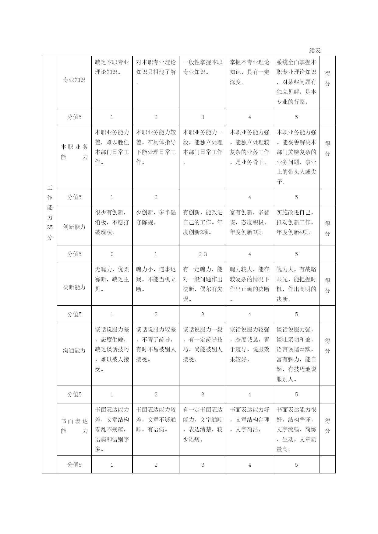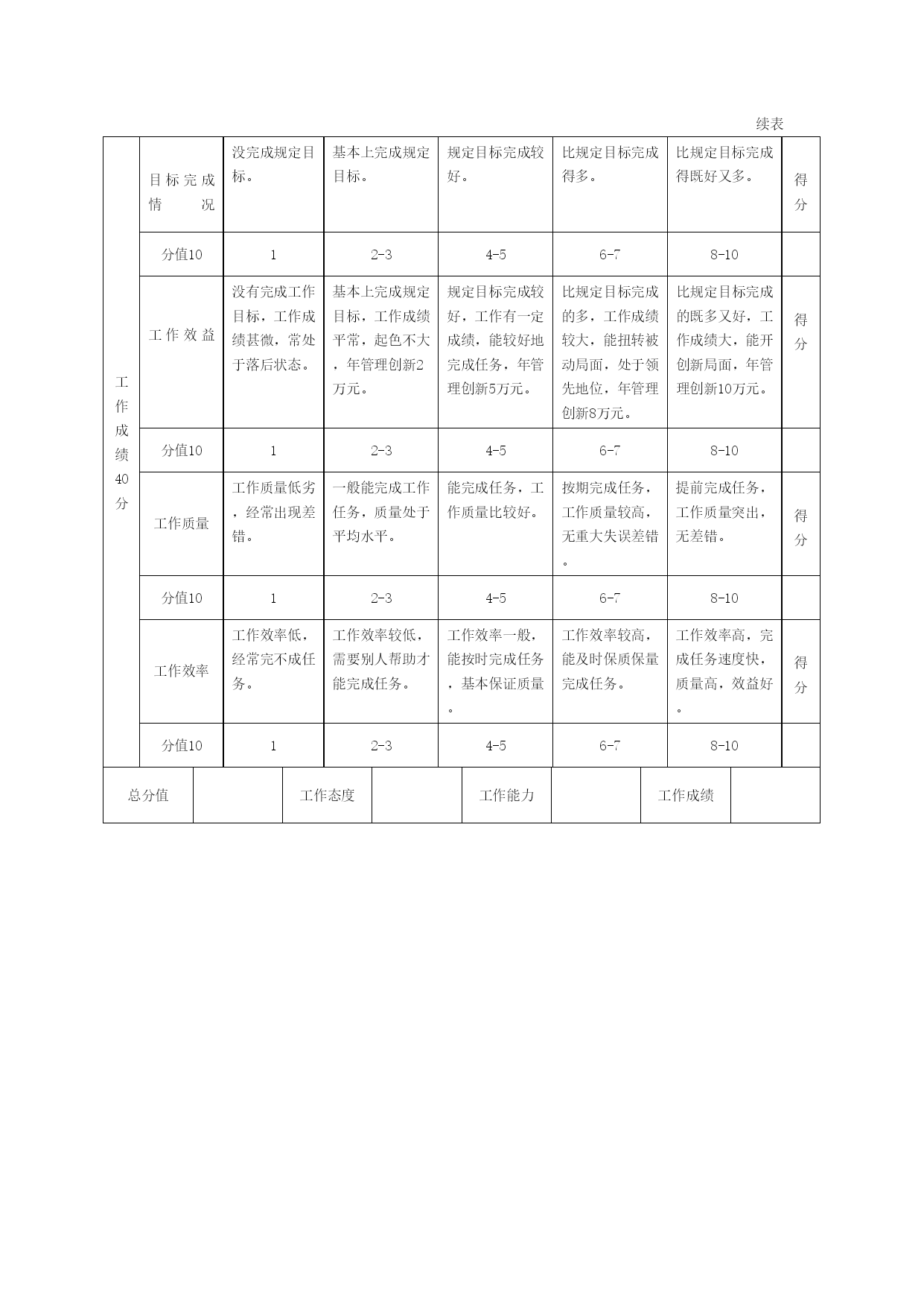 基层管理人员绩效评价标准评价目标评价标准得分工作态度25分责任心消极被动不负责任。有时责任心强,但多数情况下缺乏责任心。有一定的责任心并敢于对自己的工作负责,知错就改。责任心强,能清楚地知道自己的责任,并勇于负责。对任何事情都有强烈的责任心且积极付诸行动。得分分值5012-345积极性无论怎样督促也不上进,工作挑挑拣拣,避难就易。遇问题和困难就垂头丧气,不出成果。不知疲倦,不断进取。求知欲强,并把知识用于实践,弥补自己工作中的短处,永不满足,努力提高自己素质。勇于挑战,不畏困难;为实现目标竭尽全力。得分分值512345原则性原则性差,是非不分,常常拿原则做交易。原则性较差,有时为了情面放弃原则。一般情况下,能坚持原则,但不能硬碰。原则性较强,是非分明,能开展批评与自我批评。原则性强,敢于硬碰,能够同违法乱纪的现象作不懈的斗争。得分分值5012-345协调性不推不动,但求自己方便合适。只考虑本职工作,对其他事情不闻不问。理解领导意图,主动为领导分担责任,乐于助人。充分理解群体目标,乐意为群体目标的实现做贡献。不惜牺牲自我,通力合作。得分分值512345纪律性组织纪律性差,有违法乱纪行为。组织纪律性较差,规章制度执行不严,偶有违纪现象。有一定组织纪律性,能遵守党纪国法和各项规章制度。组织纪律性较强,自觉遵守党纪国法和各项规章制度。组织纪律性强,带头遵守党纪国法和各项规章制度,并督促他人遵守。得分分值5012-345续表工作能力35分专业知识缺乏本职专业理论知识。对本职专业理论知识只粗浅了解。一般性掌握本职专业知识。掌握本专业理论知识,具有一定深度。系统全面掌握本职专业理论知识,对某些问题有独立见解,是本专业的行家。得分分值512345本职业务能力本职业务能力差,难以胜任本部门日常工作。本职业务能力较差,在具体指导下能处理日常工作。本职业务能力一般,能独立处理本部门日常工作。本职业务能力强,能独立处理较复杂的业务工作,是业务骨干。本职业务能力强,能妥善解决本部门关键复杂的业务问题,事业上的带头人或尖子。得分分值51245创新能力很少有创新,消极,不愿打破现状。少创新,多半墨守陈规。有创新,能改进自己的工作。年度创新2项。富有创新,多智谋,态度积极。年度创新3项。实施改进自己,推动创新工作,年度创新4项。得分分值5012-345决断能力无魄力,优柔寡断,缺乏主见。魄力小,遇事迟疑,不能当机立断。有一定魄力,能对一般问题作出决断,偶尔有失误。魄力较大,能在较复杂的情况下作出正确的决断。魄力大,有战略眼光,能把握时机,作出高明的决断。得分分值512345沟通能力谈话说服力差,态度生硬,缺乏谈话技巧,难以被人接受。谈话说服力较差,不善于疏导,有时不易被别人接受。谈话说服力一般,有一定疏导技巧,尚能被别人接受。谈话说服力较强,态度诚恳,善于疏导,说服效果较好。谈话说服力强,谈吐亲切和蔼,语言诙谐幽默,富有魅力,能自然、有技巧地说服别人。得分分值512345书面表达能力书面表达能力差,文章结构零乱不规范,语病和错别字多。书面表达能力较差,文章不够通顺,有语病。有一定书面表达能力,文字通顺,表达清楚,较少语病。书面表达能力好,文章结构合理,文字简洁。书面表达能力很好,结构严谨,文字流畅、简练、生动,文章质量高。得分分值512345续表工作成绩40分目标完成情况没完成规定目标。基本上完成规定目标。规定目标完成较好。比规定目标完成得多。比规定目标完成得既好又多。得分分值1012-34-56-78-10工作效益没有完成工作目标,工作成绩甚微,常处于落后状态。基本上完成规定目标,工作成绩平常,起色不大,年管理创新2万元。规定目标完成较好,工作有一定成绩,能较好地完成任务,年管理创新5万元。比规定目标完成的多,工作成绩较大,能扭转被动局面,处于领先地位,年管理创新8万元。比规定目标完成的既多又好,工作成绩大,能开创新局面,年管理创新10万元。得分分值1012-34-56-78-10工作质量工作质量低劣,经常出现差错。一般能完成工作任务,质量处于平均水平。能完成任务,工作质量比较好。按期完成任务,工作质量较高,无重大失误差错。提前完成任务,工作质量突出,无差错。得分分值1012-34-56-78-10工作效率工作效率低,经常完不成任务。工作效率较低,需要别人帮助才能完成任务。工作效率一般,能按时完成任务,基本保证质量。工作效率较高,能及时保质保量完成任务。工作效率高,完成任务速度快,质量高,效益好。得分分值1012-34-56-78-10总分值工作态度工作能力工作成绩