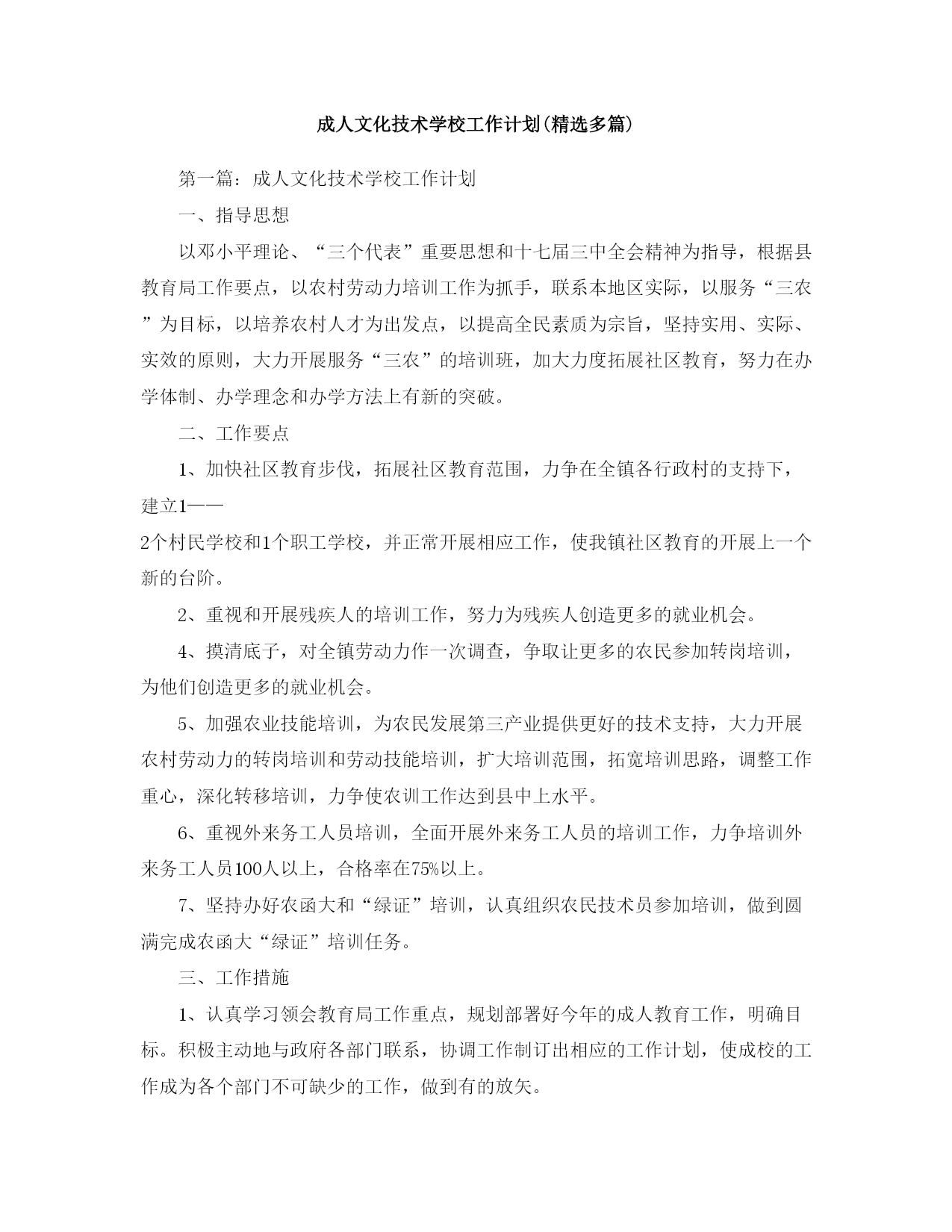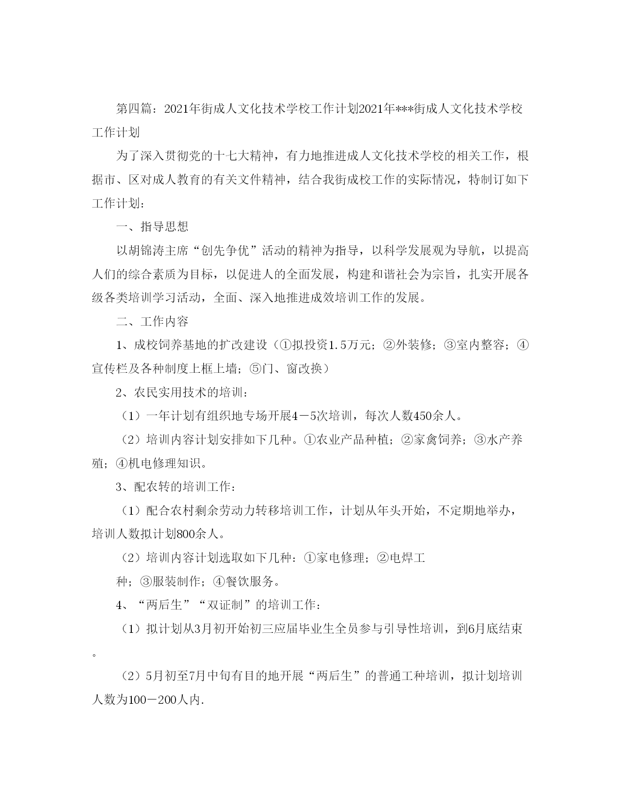 成人文化技术学校工作计划范文(完整版)文档资料可直接使用,可编辑,欢迎下载成人文化技术学校工作计划(精选多篇)第一篇:成人文化技术学校工作计划一、指导思想以邓小平理论、“三个代表”重要思想和十七届三中全会精神为指导,根据县教育局工作要点,以农村劳动力培训工作为抓手,联系本地区实际,以服务“三农”为目标,以培养农村人才为出发点,以提高全民素质为宗旨,坚持实用、实际、实效的原则,大力开展服务“三农”的培训班,加大力度拓展社区教育,努力在办学体制、办学理念和办学方法上有新的突破。二、工作要点1、加快社区教育步伐,拓展社区教育范围,力争在全镇各行政村的支持下,建立1——2个村民学校和1个职工学校,并正常开展相应工作,使我镇社区教育的开展上一个新的台阶。2、重视和开展残疾人的培训工作,努力为残疾人创造更多的就业机会。4、摸清底子,对全镇劳动力作一次调查,争取让更多的农民参加转岗培训,为他们创造更多的就业机会。5、加强农业技能培训,为农民发展第三产业提供更好的技术支持,大力开展农村劳动力的转岗培训和劳动技能培训,扩大培训范围,拓宽培训思路,调整工作重心,深化转移培训,力争使农训工作达到县中上水平。6、重视外来务工人员培训,全面开展外来务工人员的培训工作,力争培训外来务工人员100人以上,合格率在75%以上。7、坚持办好农函大和“绿证”培训,认真组织农民技术员参加培训,做到圆满完成农函大“绿证”培训任务。三、工作措施1、认真学习领会教育局工作重点,规划部署好今年的成人教育工作,明确目标。积极主动地与政府各部门联系,协调工作制订出相应的工作计划,使成校的工作成为各个部门不可缺少的工作,做到有的放矢。2、大力开展社区教育,我们将在已经建立社区教育中心的基础上,投入一定的资金,调动一定的人力资源,将全镇的青少年培训、农技培训、计划生育宣传服务、家长培训以及第三产业技能培训融合到社区教育中去。并争取在取得成绩的基础上,向全镇辐射,全面促进我镇社区建设的发展。3、加大对残疾人员的培训力度,针对性地进行培训,通过培训,让他们重树生活信心,掌握一定的技能,为社会和政府排忧解难。4、加大农民技术培训力度,在前几年对失地农民培训取得成绩的基础上,今年要将这项工作做的更细更好,保质保量地完成任务,让更多的农民参加转岗和技能培训,让他们掌握一技之长,为他们再就业创造更好的机会。5、外来务工人员在我镇经济工作中发挥的作用已越来越不能缺少他们,在全镇各个行业里都有他们的存在,是我镇经济发展的一支重要队伍,他们为我镇的经济发展起到了不可替代的作用。今年将紧密联系企业,办几期职业技能资格证的培训班,为企业发展尽一份力。6、没有第二、第三产业的发展,就没有当地经济的飞跃,没有第二、第三产业的发展,社会就多了许多的不稳定性。我们要高度重视第二、第三产业就业人员的培训,今年打算聘请各类专家、技术人员为第三产业人员进行培训,搭建多层次、多渠道、多规格的培训平台,让更多的人从事第三产业,服务社会,造福于当地,使我镇的经济有质的飞跃。7、继续办好一年一度的农函大“绿证”教育班,与农函大“绿证”培训挂钩,不使农函大“绿证”培训单一化。特别要认真组织农民技术员参加培训,让他们能做到学有所专,学有所能。做到圆满完成农函大“绿证”培训。同时密切联系有关部门,做好农民技术员等级培训的任务。8、继续抓好农科教项目的技术服务,同时做好项目的辐射作用,使项目真正起到扶、帮、带,成为农民致富的“助推器”。第二篇:xxx成人文化技术学校2021年工作计划xxx成人文化技术学校2021年工作计划为进一步提升xxx成人教育学校的办学档次和办学质量,积极探索成人教育参与xx经济发展结合点,为全处三个文明建设作出贡献。特制定2021年工作计划如下:一、指导思想:以“三个代表”思想为指导,以服务于农村、农业、农民为宗旨,大力开展转移劳动力培训,积极推进现代农民教育工程,以岗位培训为突破口,深入开展社区教育工作,促进农科教相结合,培养、造就一批高素质的创业型劳动者,大力推广农村实用技术,开拓办学思路,举办各种形式的培训教育,充分发挥成人技校多功能作用。二、工作目标继续抓好农村转移劳动力工作。充分发挥实训基地的作用,使之成为学校特色。社区教育要深入开展,并有明显进展。2021年将进一步加强合作与沟通,加大教育资源的整合力度,面向全处农村党员、基层干部及农村剩余劳动力(包括外来务工人员)和失地农民,利用专题讲座、“送科技下乡”、观看vcd等多种形式,进行花卉种植、蔬菜种植、水产品养殖、卫生保健知识、政治理论教育等方面的全方位知识培训。全年将开办各类技术培训达到本处农村总人口的3﹪,其中农村实用技术培训300人次;劳动力(含外来劳动力)转移培训260人次;创业培