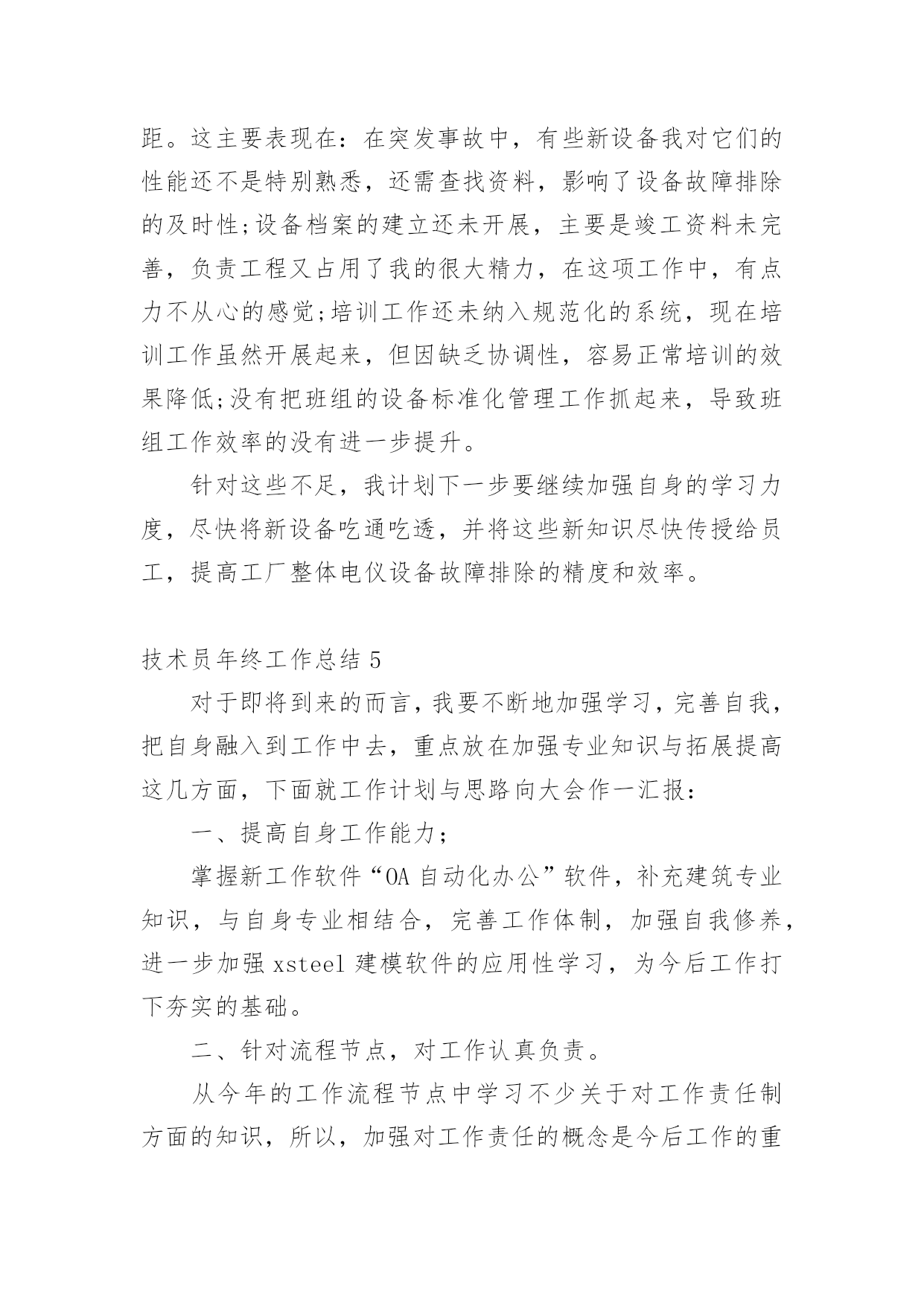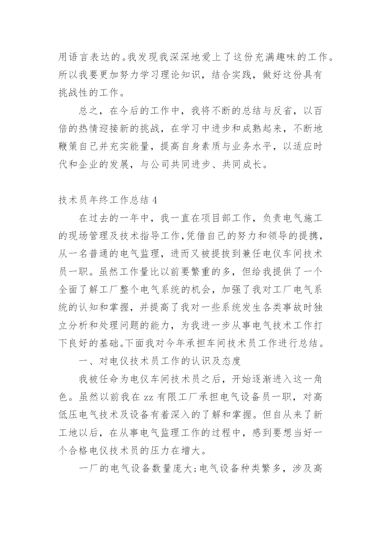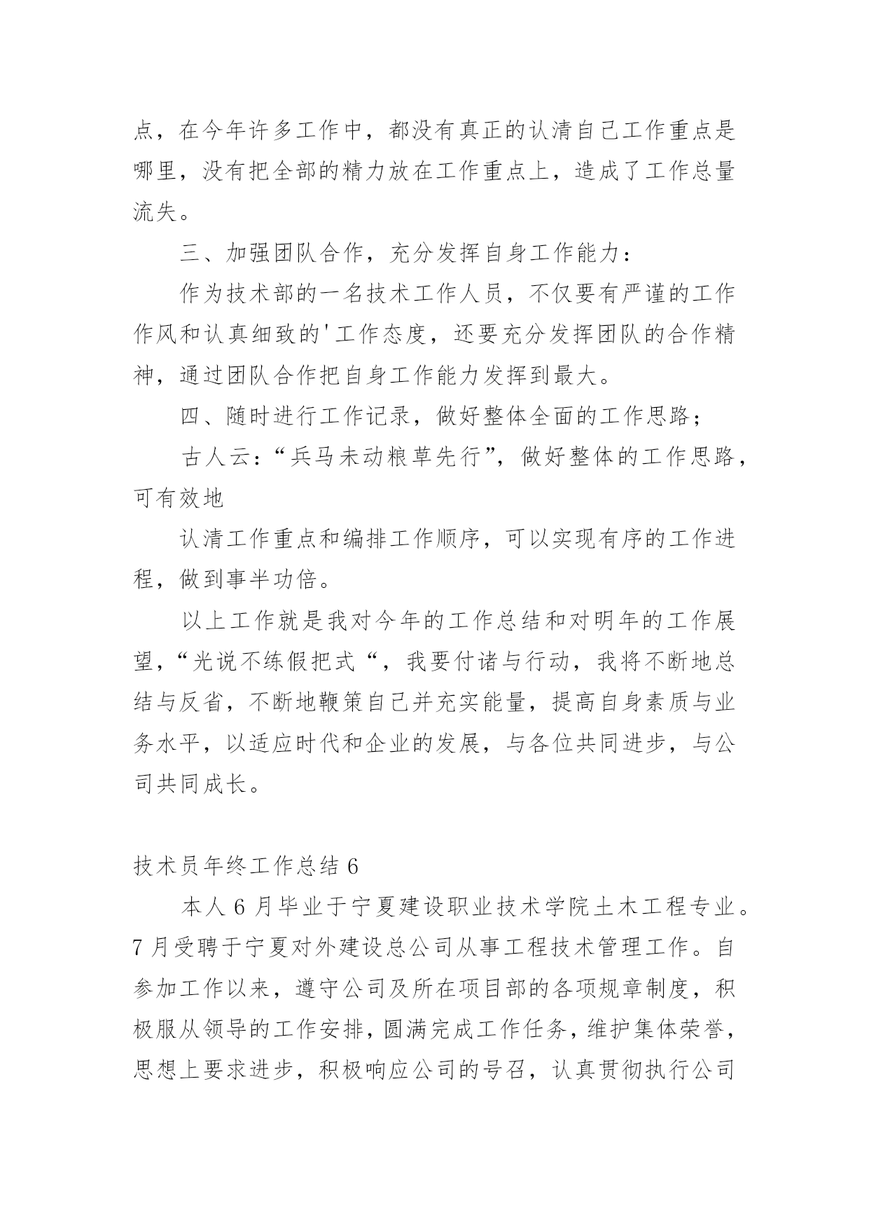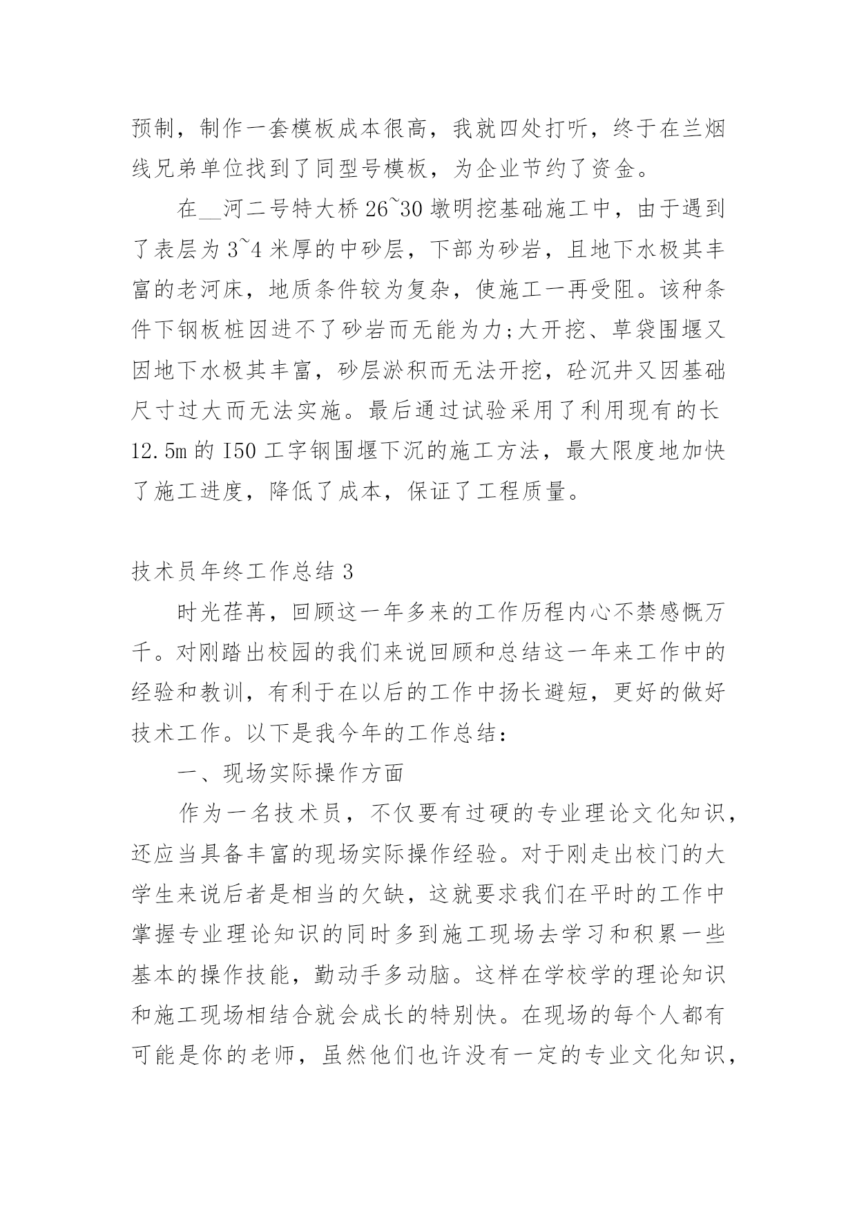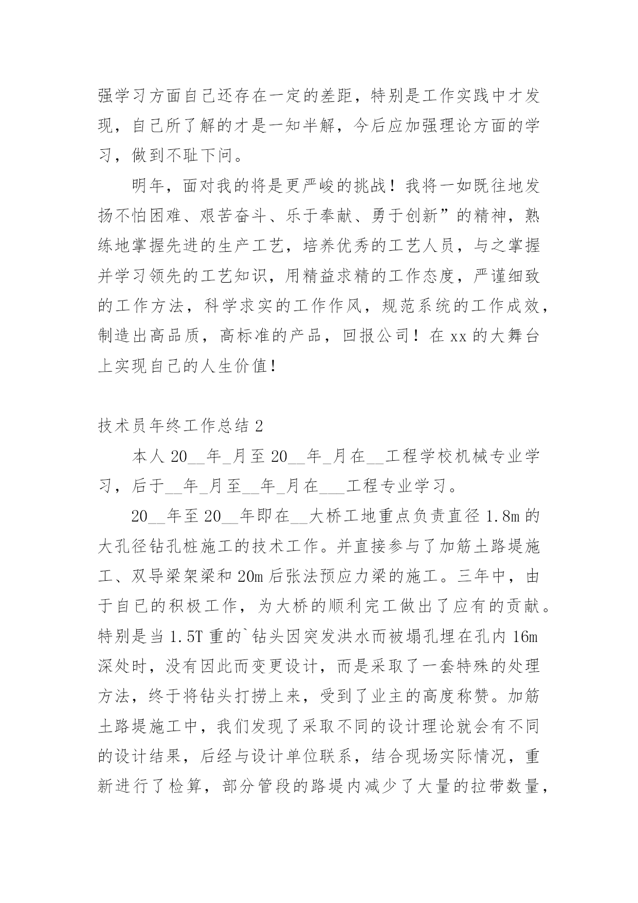 技术员年终工作总结技术员年终工作总结15篇总结是对某一阶段的工作、学习或思想中的经验或情况进行分析研究的书面材料,它能帮我们理顺知识结构,突出重点,突破难点,因此,让我们写一份总结吧。那么总结要注意有什么内容呢?下面是小编帮大家整理的技术员年终工作总结,希望对大家有所帮助。技术员年终工作总结1转眼间的工作已经结束,作为一名技术人员,我将工作定位为协助好车间生产工作,理论联系实际,在实践中验证理论,用理论指导生产、服务生产,在实践和生产过程中不断的自我学习充实。现将这一年里,我的工作内容与取得的一些成绩作以下简要总结。一、在生产过程中坚持理论联系实际对现有工艺人员及镀膜工序员工进行培训,用理论武装生产,培训内容涵盖工艺知识、操作规程、岗位安全制度等。其中大规模的培训四次,利用班前、班后会针对生产过程中出现的问题加以纠正式的培训若干,现工艺人员已经初步掌握了真空管膜层的基础知识,能够熟练的针对膜层颜色、性能、换靶周期等作以调整。在生产的同时,我还不间断的积累实验数据,协助技术实验室抽检、送检真空管,根据实验数据,调整膜层工艺,使车间生产的真空管合格率屡创新高。针对年初市场反应的膜层颜色杂乱等现象,每天要求工艺人员针对所开启镀膜机做样管对比,出炉不达标的限时调整,并编制了各工序控制膜层颜色的暂行办法,半年来成绩显著,侧面了解市场反应良好。二、根据市场需要开发研究新产品根据市场需要,一年来,多次开发研究了具有xx特色的真空管,如xx紫墨金真空管、黑膜真空管、偏心真空管外镀膜技术,有效的拓宽了市场,其中紫墨金真空管年销售量累计达x万支,黑膜真空管仅一次性供货就达x万支。根据实验数据多次研究,开发了xx金三角真空管,有效的降低了真空管对于热水器热损的影响,产品将拓宽并服务于xx的市场,现此产品已经定型为xx市场产品。自今年以来,许多先进、自动化程度较高的设备不断落户真空管车间,作为车间工艺主管的我,只有不断向人学习,了解先进技术,才能胜任此职务。一年来我不断学习,并修改、制定了车间操作工艺,岗位安全操作规程等。三、工作中存在的不足工作成绩的取得离不开领导的关心与帮助,成绩斐然,总结过去的工作,自己觉着有许多方面还存在不足,通过自己的反思和查找,我认为主要由于思想解放的'不够,日常工作中求稳的成份占的多一些,还有些放不开,对待工作还是不那么灵活。对待问题的探索和实践步子还不够大。在加强学习方面自己还存在一定的差距,特别是工作实践中才发现,自己所了解的才是一知半解,今后应加强理论方面的学习,做到不耻下问。明年,面对我的将是更严峻的挑战!我将一如既往地发扬不怕困难、艰苦奋斗、乐于奉献、勇于创新”的精神,熟练地掌握先进的生产工艺,培养优秀的工艺人员,与之掌握并学习领先的工艺知识,用精益求精的工作态度,严谨细致的工作方法,科学求实的工作作风,规范系统的工作成效,制造出高品质,高标准的产品,回报公司!在xx的大舞台上实现自己的人生价值!技术员年终工作总结2本人20__年_月至20__年_月在__工程学校机械专业学习,后于__年_月至__年_月在___工程专业学习。20__年至20__年即在__大桥工地重点负责直径1.8m的大孔径钻孔桩施工的技术工作。并直接参与了加筋土路堤施工、双导梁架梁和20m后张法预应力梁的施工。三年中,由于自已的积极工作,为大桥的顺利完工做出了应有的贡献。特别是当1.5T重的`钻头因突发洪水而被塌孔埋在孔内16m深处时,没有因此而变更设计,而是采取了一套特殊的处理方法,终于将钻头打捞上来,受到了业主的高度称赞。加筋土路堤施工中,我们发现了采取不同的设计理论就会有不同的设计结果,后经与设计单位联系,结合现场实际情况,重新进行了检算,部分管段的路堤内减少了大量的拉带数量,为企业增加了效益。岷江大桥被业主评为优质工程和优秀管理奖。由于本人的积极工作,__年被破格晋升为工程师。在__二期工程中,我任九队技术主管,直接参与了铁道部科研项目16mSRC型钢梁的施工,积累了大量的资料和经验。特别是在济南东站(原北关站)站场改造中,设计要求在保证既有线通车的条件下,对既有桥墩台进行加高并撤换部分梁体,这是一项十分艰巨的工程。由于施组编制的合理,现场组织有力,即保证了安全质量,也保证了工期,创出了较好的经济效益。在__铁路__大桥施工中,我对墩帽模板采取了特殊设计,利用墩身上的预留螺栓建立工作平台,不设地面支撑,而且砼内不设一根拉筋,减少了劳动强度,提高了工作效率,增加了砼的表面光洁度。菏日复线施工中,身为总工程师,主持了全标段58.4km包括180座桥涵工程、路基工程、轨道工程、给排水工程、房建工程、通信信号工程、电力工程等全面的技术工作,主持编写了全标段的实施性施工组织设计和三个站场改造,三处换边的过渡方案的制定。在__大桥板式墩身模板设