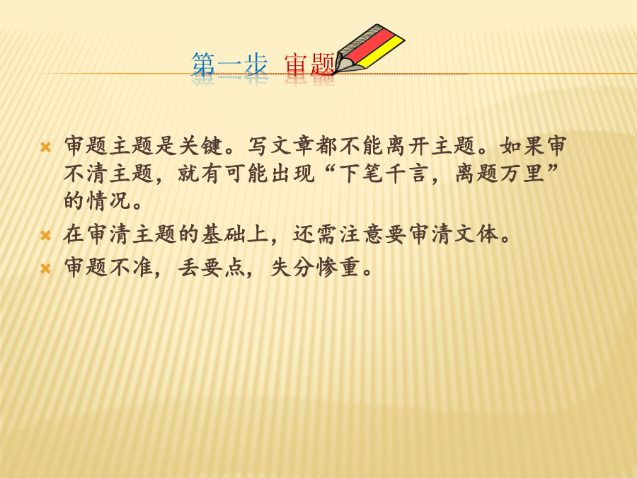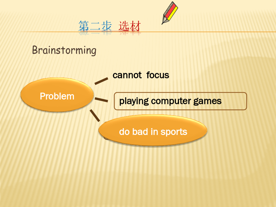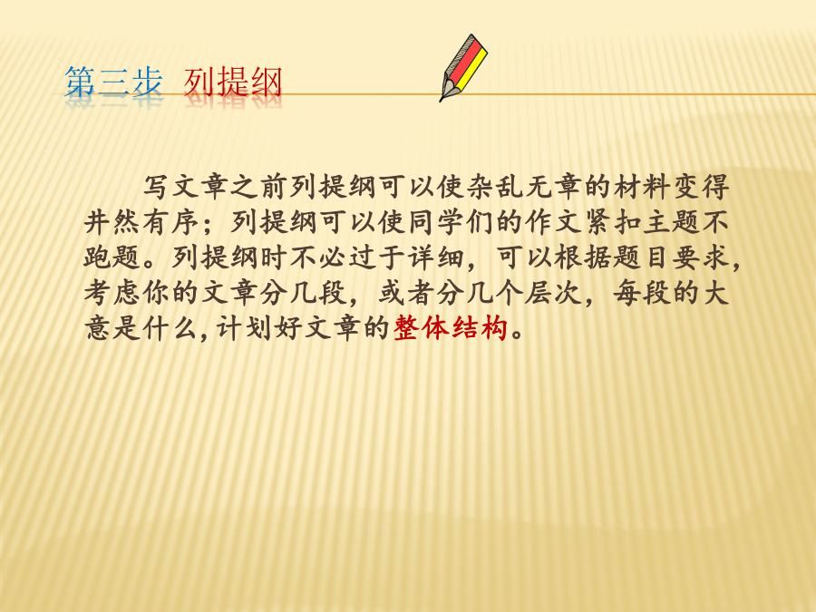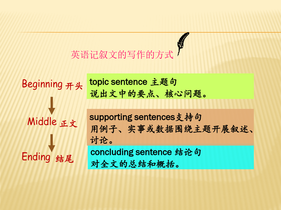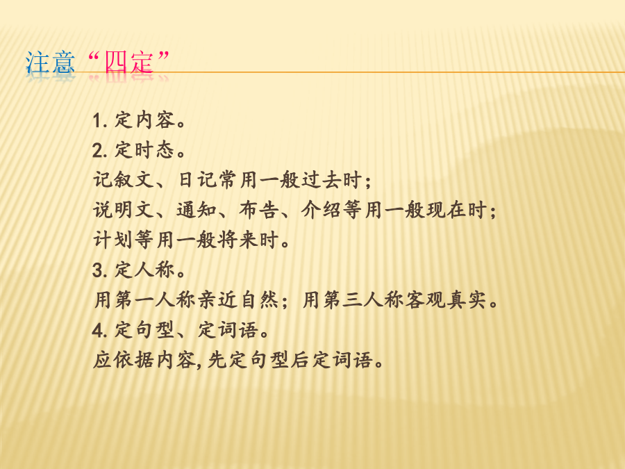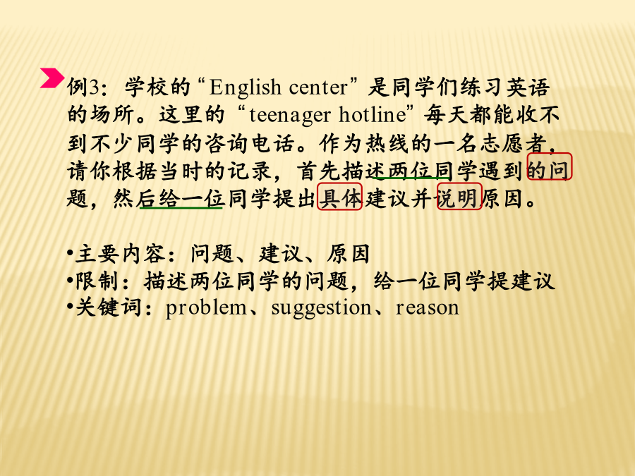 第一步审题例2:Iwanttodosomethingformyschool例3:学校的“Englishcenter”是同学们练习英语的场所。这里的“teenagerhotline”每天都能收不到不少同学的咨询电话。作为热线的一名志愿者,请你根据当时的记录,首先描述两位同学遇到的问题,然后给一位同学提出具体建议并说明原因。主要内容:问题、建议、原因限制:描述两位同学的问题,给一位同学提建议关键词:problem、suggestion、reasondobadinsports注意“四定”第三步列提纲例1:利弊型作文——Microblog的利与弊Para1:(综述)withthedevelopmentofinternet…moreandmorepopular…Para2:(利)First,convenient,anywhere,anytime;Second,share…with…;Last,expressviewsfree,money-free…Para3:(弊)However,eachcoinhastwosides.Ontheonehand,awasteoftime;Ontheotherhand,notsafe——beinghacked…Para4:(总结)Asastudent,makegooduseofit.例2:计划安排型作文——谈假期安排Para1:(综述)holidayiscoming,planforthisholidayPara2:(正文)Firstly,studycomesfirst.makepreparationsforthegrade9;Secondly,visittouristattractions;Lastbutnotleast,dosportstobuildupmybody.Para3:(总结)IamsureI’llhaveameaningfulholiday.(I’mlookingforwardtothecomingholiday.)(Ican’twaittoenjoymysummervocation.)第四步写全文ManypeoplesaythatChristmasismorepopularthantheSpringFestival.ButIdon’tthinkso.Asweallknow,Englishbecomesmoreandmorepopular/important.记叙文常用的句子间连接词:Atfirst;atlast;intheend…then/next/afterthat…when/while/assoonas/not…until…atthesametime;attimes;onceinawhile;sothattoone’ssurpriseluckily/fortunately/unluckily/unfortunatelyinaword/inall表示转折的:however;but;表示举例的:forexample;forinstance;suchas…;like…;表示总结的:inall/short;inaword;lastbutnotleast;last;表示利弊的:begood/badforsb.;beharmfultosb.;doharmtosb.;…havegreat/muchinfluenceonsb.;表示喜爱的:love/like/enjoy…;befondof…;beinterestedin…;showgreatinterestin;putone’sheartinto…;表达个人想法的:Ithink/believe…;(as)forme;inmyopinion;fromthebottomofmyheart;personally;其他:tobehonest;totellthetruth;makeupone’smindtodo;…结尾画龙点睛,首尾呼应MakeaconcludingsentenceLet’stryourbesttobeanenvironmentprotector.Inoneword,it’snecessaryforustoprotecttheenvironment.HowbeautifulBeijingis!WhynotcometoBeijingandenjoyyourself?常见的作文类型模板:书信开头常用语书信结尾常用语2图表、数字比例型Nowadays…isbecomingmoreandmorepopular.Ithasmanyadvantages.First,优点1…Besides,优点2…However,everycoinhastwosides.Italsobringsusba