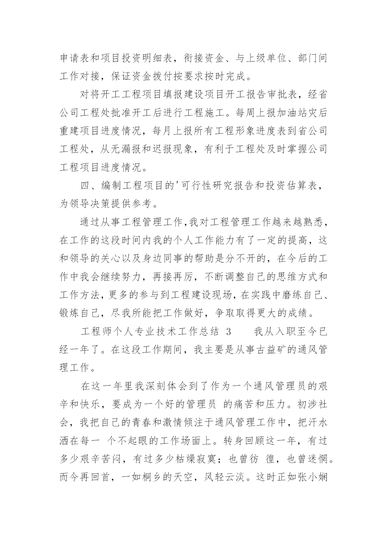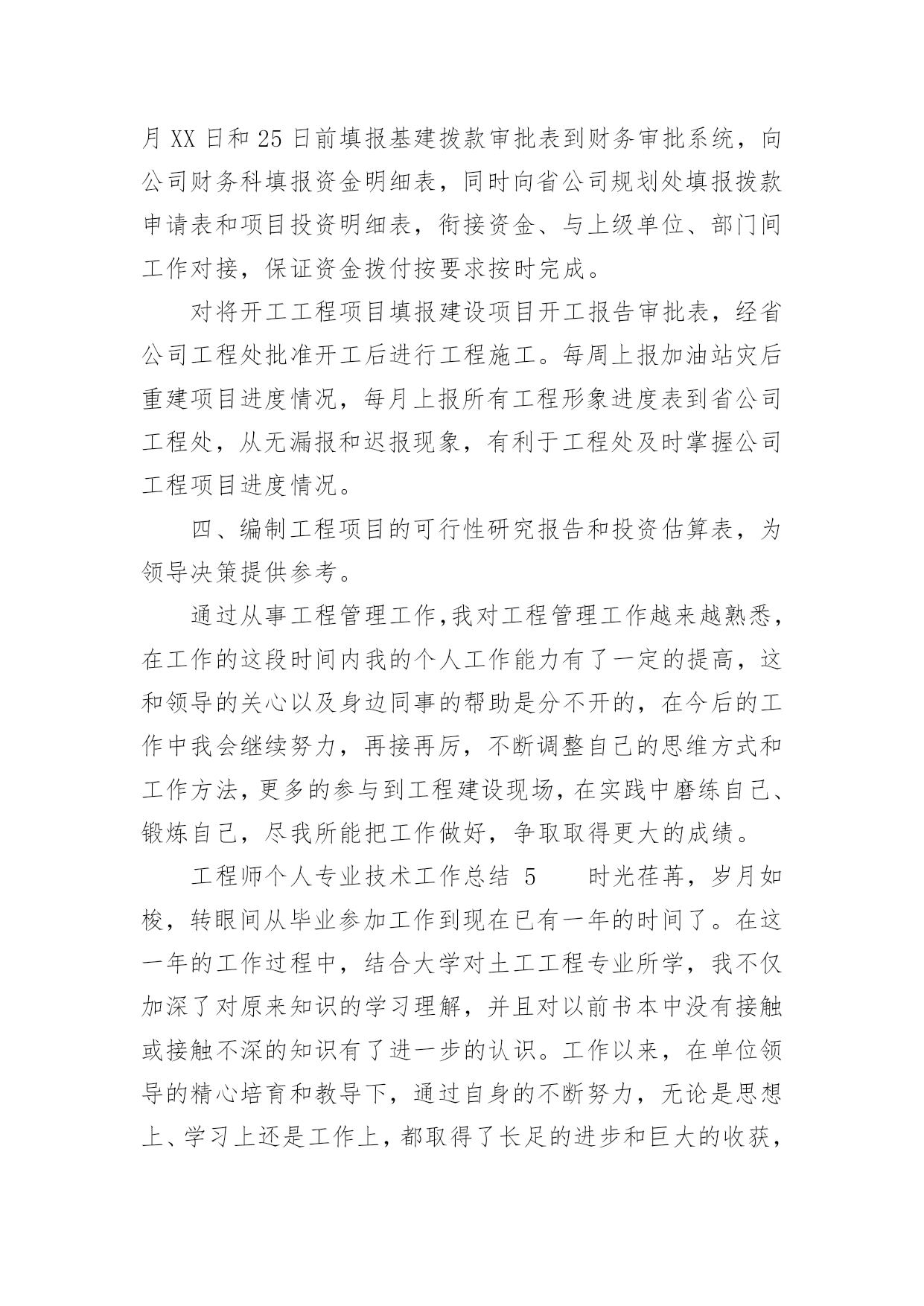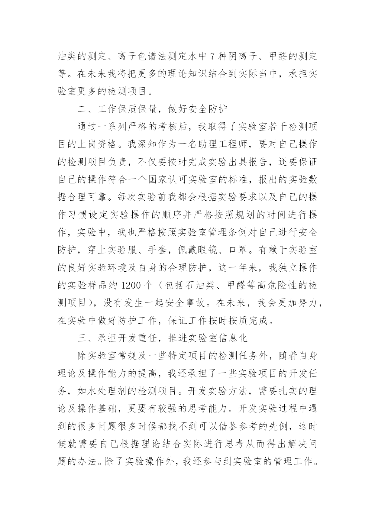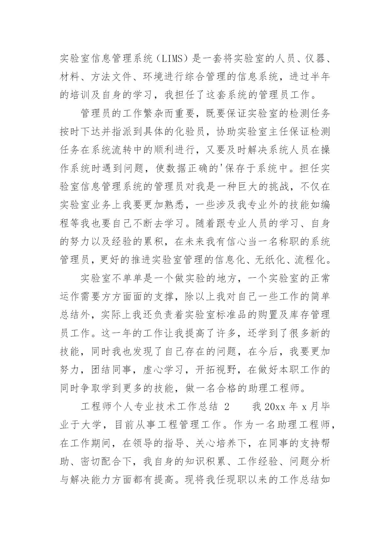 工程师个人专业技术工作总结工程师个人专业技术工作总结(精选16篇)总结是在某一特定时间段对学习和工作生活或其完成情况,包括取得的成绩、存在的问题及得到的经验和教训加以回顾和分析的书面材料,它可以明确下一步的工作方向,少走弯路,少犯错误,提高工作效益,因此十分有必须要写一份总结哦。但是总结有什么要求呢?下面是小编帮大家整理的工程师个人专业技术工作总结,欢迎阅读,希望大家能够喜欢。工程师个人专业技术工作总结120xx年x月我毕业于大学,本科专业为环境工程。毕业后我来到公司并一直从事水质化验分析工作。在此期间,我一直严格要求自己,努力钻研专业技术知识,虚心向前辈同事学习,回顾这一年的学习和工作生活,我感到收获颇丰,下面从专业技术角度,将我这一年的学习和工作情况总结如下:一、学习专业知识,提升岗位能力作为一名助理工程师,最主要的职责就是做实验。工作后我发现在学校时学到的理论知识仍不能满足实际的应用,所以在这一年里,我时刻鞭策自己要不断学习更多的专业知识,虚心向身边的前辈同事学习交流,努力提高自己的岗位技能。通过这一年的理论学习加动手实操,我不仅能操作实验室的日常实验如氨氮、硝酸盐氮、高锰酸盐指数、五日生化需氧量等,还能独立承担实验室的非常规检测项目,如石油类的测定、离子色谱法测定水中7种阴离子、甲醛的测定等。在未来我将把更多的理论知识结合到实际当中,承担实验室更多的检测项目。二、工作保质保量,做好安全防护通过一系列严格的考核后,我取得了实验室若干检测项目的上岗资格。我深知作为一名助理工程师,要对自己操作的检测项目负责,不仅要按时完成实验出具报告,还要保证自己的操作符合一个国家认可实验室的标准,报出的实验数据合理可靠。每次实验前我都会根据实验要求以及自己的操作习惯设定实验操作的顺序并严格按照规划的时间进行操作,实验中,我也严格按照实验室管理条例对自己进行安全防护,穿上实验服、手套,佩戴眼镜、口罩。有赖于实验室的良好实验环境及自身的合理防护,这一年来,我独立操作的实验样品约1200个(包括石油类、甲醛等高危险性的检测项目),没有发生一起安全事故。在未来,我会更加努力,在实验中做好防护工作,保证工作按时按质完成。三、承担开发重任,推进实验室信息化除实验室常规及一些特定项目的检测任务外,随着自身理论及操作能力的提高,我还承担了一些实验项目的开发任务,如水处理剂的检测项目。开发实验方法,需要扎实的理论及操作基础,更要有较强的思考能力。开发实验过程中遇到的很多问题很多时候都找不到可以借鉴参考的先例,这时候就需要自己根据理论结合实际进行思考从而得出解决问题的办法。除了实验操作外,我还参与到实验室的管理工作。实验室信息管理系统(LIMS)是一套将实验室的人员、仪器、材料、方法文件、环境进行综合管理的信息系统,进过半年的培训及自身的学习,我担任了这套系统的管理员工作。管理员的工作繁杂而重要,既要保证实验室的检测任务按时下达并指派到具体的化验员,协助实验室主任保证检测任务在系统流转中的顺利进行,又要及时解决系统人员在操作系统时遇到问题,使数据正确的'保存于系统中。担任实验室信息管理系统的管理员对我是一种巨大的挑战,不仅在实验室业务上我要更加熟悉,一些涉及我专业外的技能如编程等我也要自己不断去学习。随着跟专业人员的学习、自身的努力以及经验的累积,在未来我有信心当一名称职的系统管理员,更好的推进实验室管理的信息化、无纸化、流程化。实验室不单单是一个做实验的地方,一个实验室的正常运作需要方方面面的支撑,除以上我对自己一些工作的简单总结外,实际上我还负责着实验室标准品的购置及库存管理员工作。这一年的工作让我提高了许多,还学到了很多新的技能,同时我也发现了自己存在的问题,在今后,我要更加努力,团结同事,虚心学习,开拓视野,在做好本职工作的同时争取学到更多的技能,做一名合格的助理工程师。工程师个人专业技术工作总结2我20xx年x月毕业于大学,目前从事工程管理工作。作为一名助理工程师,在工作期间,在领导的指导、关心培养下,在同事的支持帮助、密切配合下,我自身的知识积累、工作经验、问题分析与解决能力方面都有提高。现将我任现职以来的工作总结如下:一、加强思想政治建设,积极向党组织靠拢思想上树立正确的世界观、人生观和价值观,努力提高运用理论解决实际问题的能力,坚持实事求是,不断提高自己的政治思想觉悟与水平,并向组织提交了入党申请,积极向党组织靠拢。二、加强学习,提高自身素质我大学本科所学内容与现在工作关联性不大,为了增强自身业务素质,提高自身工作能力,我专门购买了工程管理方面书籍,坚持每天挤出一定时间看书来充实自己,不断改进学习方法,广泛汲取各种营养;主动向同事请教,把所学的知识运用于实际工作中,在实践中检验所学知识,查找不足,提高自己;因工作需要到大学进行工程造价培训