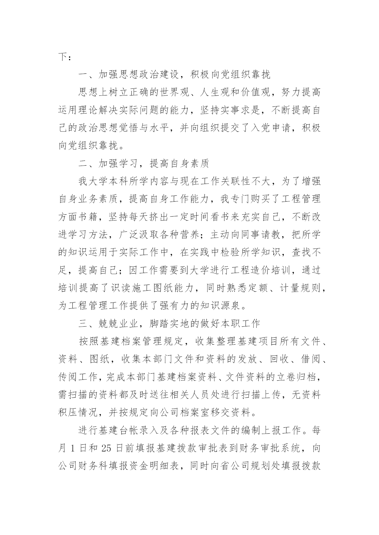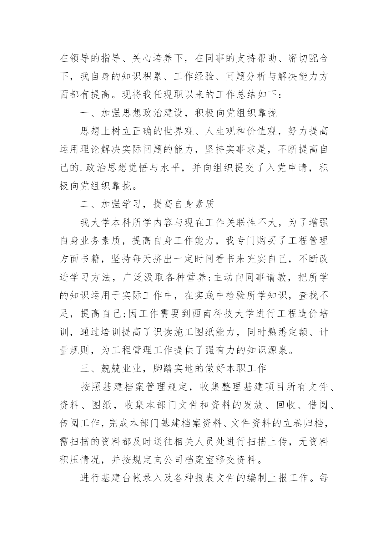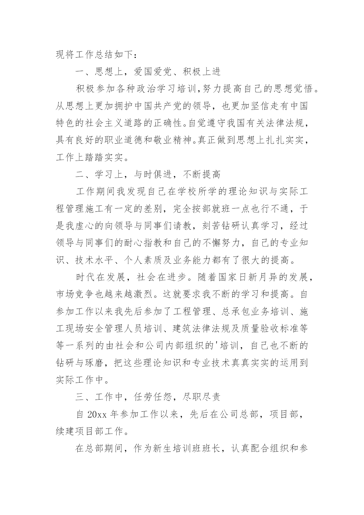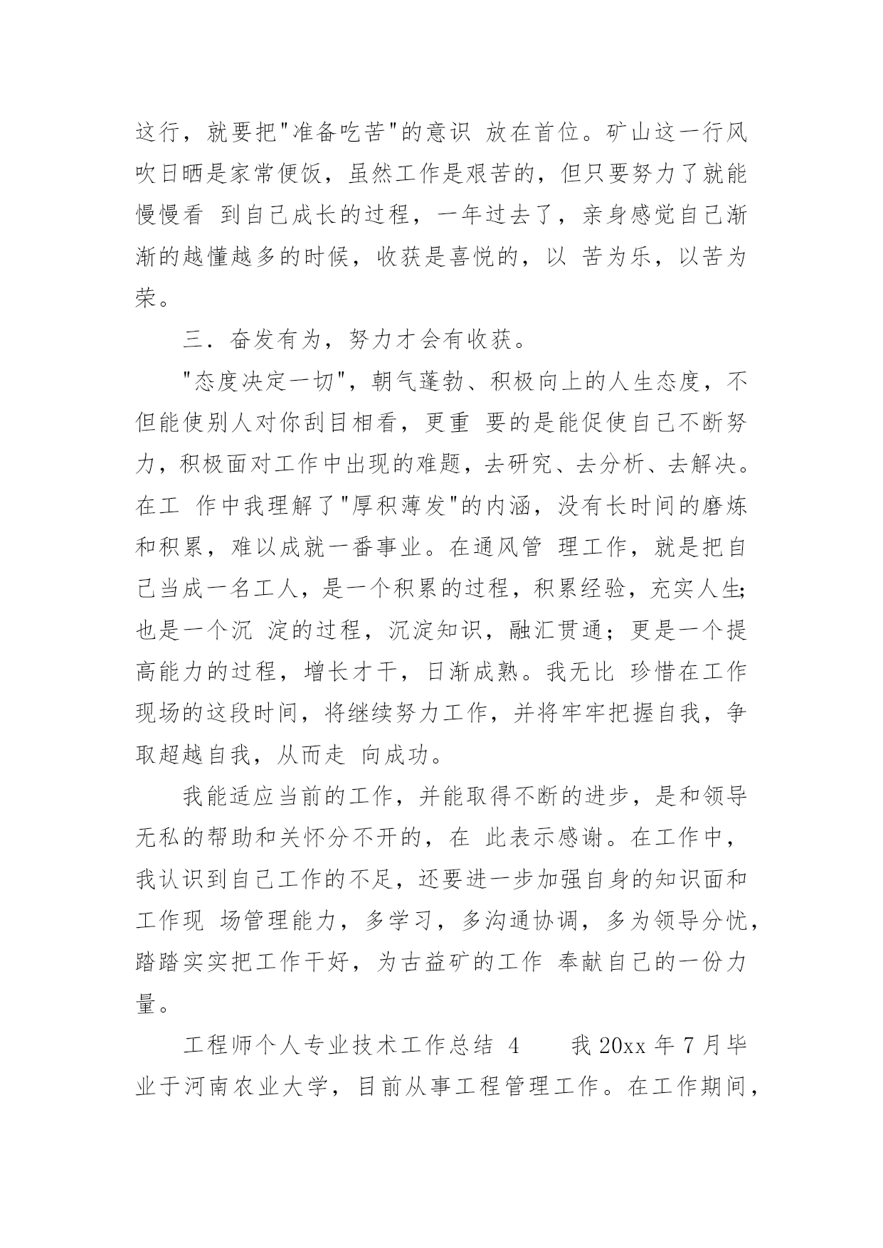 工程师个人专业技术工作总结工程师个人专业技术工作总结(精选16篇)总结是在某一特定时间段对学习和工作生活或其完成情况,包括取得的成绩、存在的问题及得到的经验和教训加以回顾和分析的书面材料,它可以明确下一步的工作方向,少走弯路,少犯错误,提高工作效益,因此十分有必须要写一份总结哦。但是总结有什么要求呢?下面是小编帮大家整理的工程师个人专业技术工作总结,欢迎阅读,希望大家能够喜欢。工程师个人专业技术工作总结120xx年x月我毕业于大学,本科专业为环境工程。毕业后我来到公司并一直从事水质化验分析工作。在此期间,我一直严格要求自己,努力钻研专业技术知识,虚心向前辈同事学习,回顾这一年的学习和工作生活,我感到收获颇丰,下面从专业技术角度,将我这一年的学习和工作情况总结如下:一、学习专业知识,提升岗位能力作为一名助理工程师,最主要的职责就是做实验。工作后我发现在学校时学到的理论知识仍不能满足实际的应用,所以在这一年里,我时刻鞭策自己要不断学习更多的专业知识,虚心向身边的前辈同事学习交流,努力提高自己的岗位技能。通过这一年的理论学习加动手实操,我不仅能操作实验室的日常实验如氨氮、硝酸盐氮、高锰酸盐指数、五日生化需氧量等,还能独立承担实验室的非常规检测项目,如石油类的测定、离子色谱法测定水中7种阴离子、甲醛的测定等。在未来我将把更多的理论知识结合到实际当中,承担实验室更多的检测项目。二、工作保质保量,做好安全防护通过一系列严格的考核后,我取得了实验室若干检测项目的上岗资格。我深知作为一名助理工程师,要对自己操作的检测项目负责,不仅要按时完成实验出具报告,还要保证自己的操作符合一个国家认可实验室的标准,报出的实验数据合理可靠。每次实验前我都会根据实验要求以及自己的操作习惯设定实验操作的顺序并严格按照规划的时间进行操作,实验中,我也严格按照实验室管理条例对自己进行安全防护,穿上实验服、手套,佩戴眼镜、口罩。有赖于实验室的良好实验环境及自身的合理防护,这一年来,我独立操作的实验样品约1200个(包括石油类、甲醛等高危险性的检测项目),没有发生一起安全事故。在未来,我会更加努力,在实验中做好防护工作,保证工作按时按质完成。三、承担开发重任,推进实验室信息化除实验室常规及一些特定项目的检测任务外,随着自身理论及操作能力的提高,我还承担了一些实验项目的开发任务,如水处理剂的检测项目。开发实验方法,需要扎实的理论及操作基础,更要有较强的思考能力。开发实验过程中遇到的很多问题很多时候都找不到可以借鉴参考的先例,这时候就需要自己根据理论结合实际进行思考从而得出解决问题的办法。除了实验操作外,我还参与到实验室的管理工作。实验室信息管理系统(LIMS)是一套将实验室的人员、仪器、材料、方法文件、环境进行综合管理的信息系统,进过半年的培训及自身的学习,我担任了这套系统的管理员工作。管理员的工作繁杂而重要,既要保证实验室的检测任务按时下达并指派到具体的化验员,协助实验室主任保证检测任务在系统流转中的顺利进行,又要及时解决系统人员在操作系统时遇到问题,使数据正确的'保存于系统中。担任实验室信息管理系统的管理员对我是一种巨大的挑战,不仅在实验室业务上我要更加熟悉,一些涉及我专业外的技能如编程等我也要自己不断去学习。随着跟专业人员的学习、自身的努力以及经验的累积,在未来我有信心当一名称职的系统管理员,更好的推进实验室管理的信息化、无纸化、流程化。实验室不单单是一个做实验的地方,一个实验室的正常运作需要方方面面的支撑,除以上我对自己一些工作的简单总结外,实际上我还负责着实验室标准品的购置及库存管理员工作。这一年的工作让我提高了许多,还学到了很多新的技能,同时我也发现了自己存在的问题,在今后,我要更加努力,团结同事,虚心学习,开拓视野,在做好本职工作的同时争取学到更多的技能,做一名合格的助理工程师。工程师个人专业技术工作总结2我20xx年x月毕业于大学,目前从事工程管理工作。作为一名助理工程师,在工作期间,在领导的指导、关心培养下,在同事的支持帮助、密切配合下,我自身的知识积累、工作经验、问题分析与解决能力方面都有提高。现将我任现职以来的工作总结如下:一、加强思想政治建设,积极向党组织靠拢思想上树立正确的世界观、人生观和价值观,努力提高运用理论解决实际问题的能力,坚持实事求是,不断提高自己的政治思想觉悟与水平,并向组织提交了入党申请,积极向党组织靠拢。二、加强学习,提高自身素质我大学本科所学内容与现在工作关联性不大,为了增强自身业务素质,提高自身工作能力,我专门购买了工程管理方面书籍,坚持每天挤出一定时间看书来充实自己,不断改进学习方法,广泛汲取各种营养;主动向同事请教,把所学的知识运用于实际工作中,在实践中检验所学知识,查找不足,提高自己;因工作需要到大学进行工程造价培训