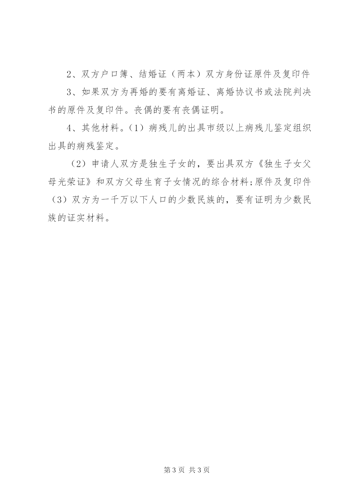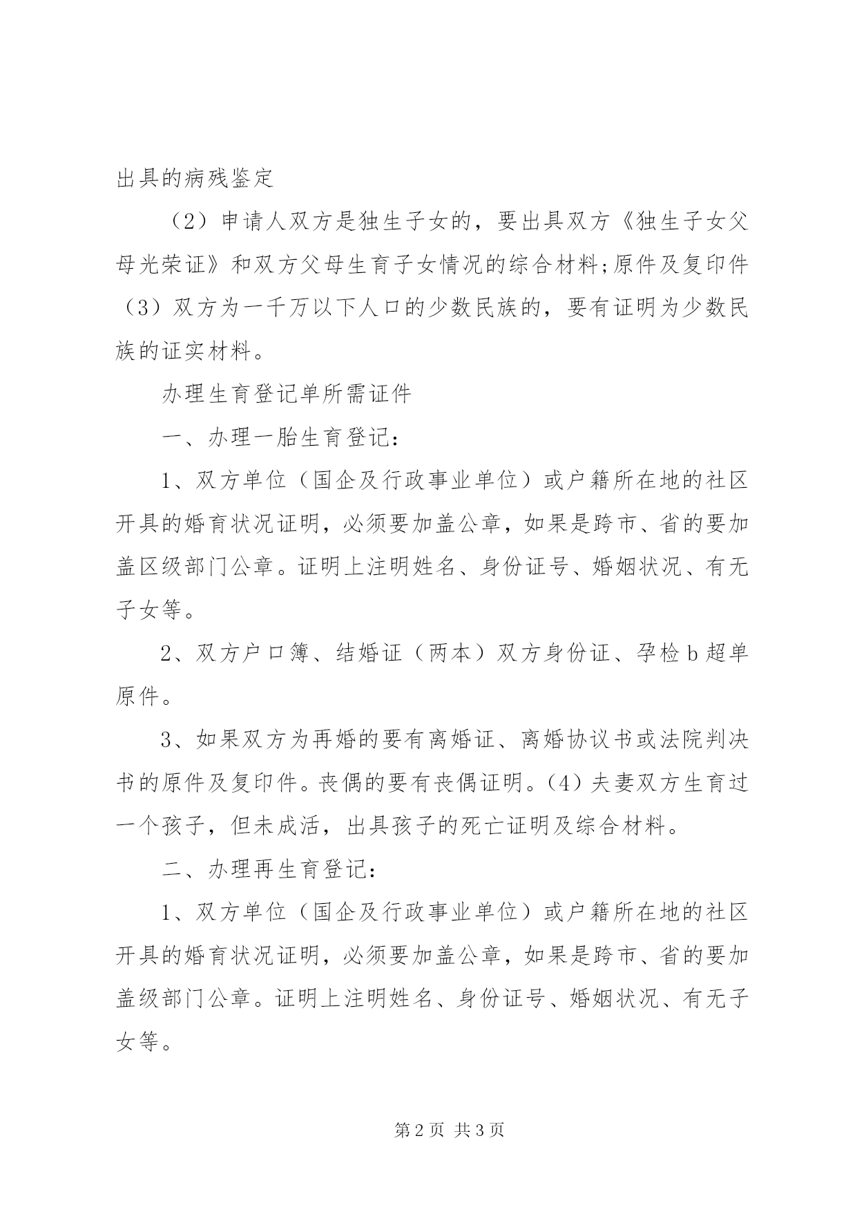 第PAGE\*Arabic\*MERGEFORMAT3页共NUMPAGES\*MERGEFORMAT3页办理生育保险所需材料办理生育登记单所需证件一、办理一胎生育登记:1、双方单位(国企及行政事业单位)或户籍所在地的社区开具的婚育状况证明,必须要加盖公章,如果是跨市、省的要加盖区级部门公章。证明上注明姓名、身份证号、婚姻状况、有无子女等。2、双方户口簿、结婚证(两本)双方身份证、孕检b超单原件。3、如果双方为再婚的要有离婚证、离婚协议书或法院判决书的原件及复印件。丧偶的要有丧偶证明。(4)夫妻双方生育过一个孩子,但未成活,出具孩子的死亡证明及综合材料。二、办理再生育登记:1、双方单位(国企及行政事业单位)或户籍所在地的社区开具的婚育状况证明,必须要加盖公章,如果是跨市、省的要加盖级部门公章。证明上注明姓名、身份证号、婚姻状况、有无子女等。2、双方户口簿、结婚证(两本)双方身份证原件及复印件3、如果双方为再婚的要有离婚证、离婚协议书或法院判决书的原件及复印件。丧偶的要有丧偶证明。4、其他材料:(1)病残儿的出具市级以上病残儿鉴定组织出具的病残鉴定(2)申请人双方是独生子女的,要出具双方《独生子女父母光荣证》和双方父母生育子女情况的综合材料;原件及复印件(3)双方为一千万以下人口的少数民族的,要有证明为少数民族的证实材料。办理生育登记单所需证件一、办理一胎生育登记:1、双方单位(国企及行政事业单位)或户籍所在地的社区开具的婚育状况证明,必须要加盖公章,如果是跨市、省的要加盖区级部门公章。证明上注明姓名、身份证号、婚姻状况、有无子女等。2、双方户口簿、结婚证(两本)双方身份证、孕检b超单原件。3、如果双方为再婚的要有离婚证、离婚协议书或法院判决书的原件及复印件。丧偶的要有丧偶证明。(4)夫妻双方生育过一个孩子,但未成活,出具孩子的死亡证明及综合材料。二、办理再生育登记:1、双方单位(国企及行政事业单位)或户籍所在地的社区开具的婚育状况证明,必须要加盖公章,如果是跨市、省的要加盖级部门公章。证明上注明姓名、身份证号、婚姻状况、有无子女等。2、双方户口簿、结婚证(两本)双方身份证原件及复印件3、如果双方为再婚的要有离婚证、离婚协议书或法院判决书的原件及复印件。丧偶的要有丧偶证明。4、其他材料。(1)病残儿的出具市级以上病残儿鉴定组织出具的病残鉴定。(2)申请人双方是独生子女的,要出具双方《独生子女父母光荣证》和双方父母生育子女情况的综合材料;原件及复印件(3)双方为一千万以下人口的少数民族的,要有证明为少数民族的证实材料。
