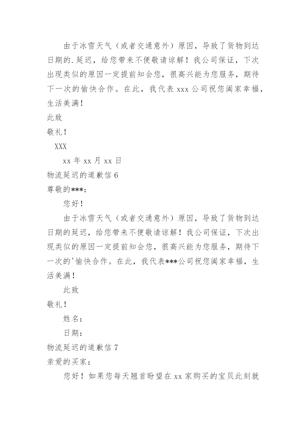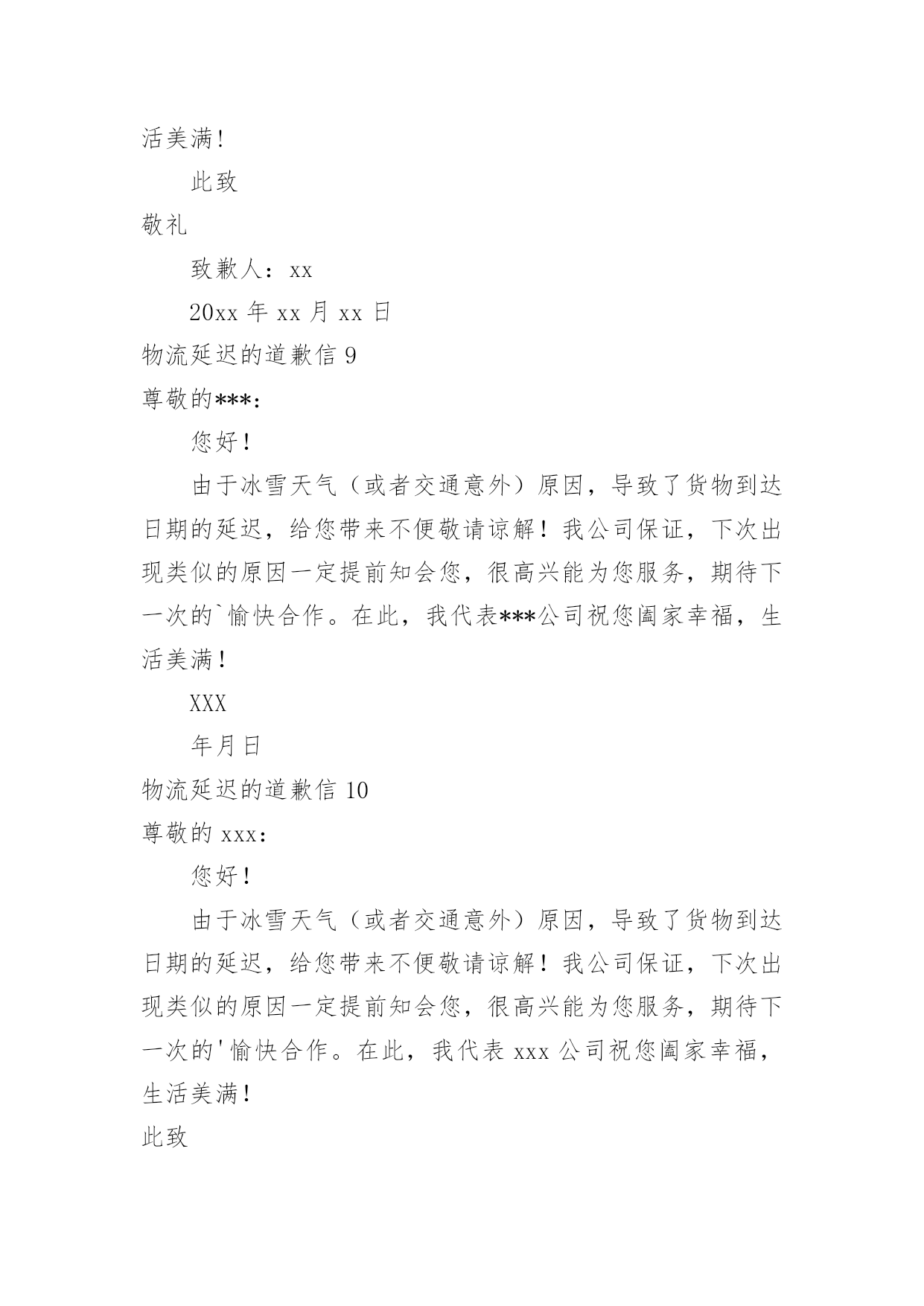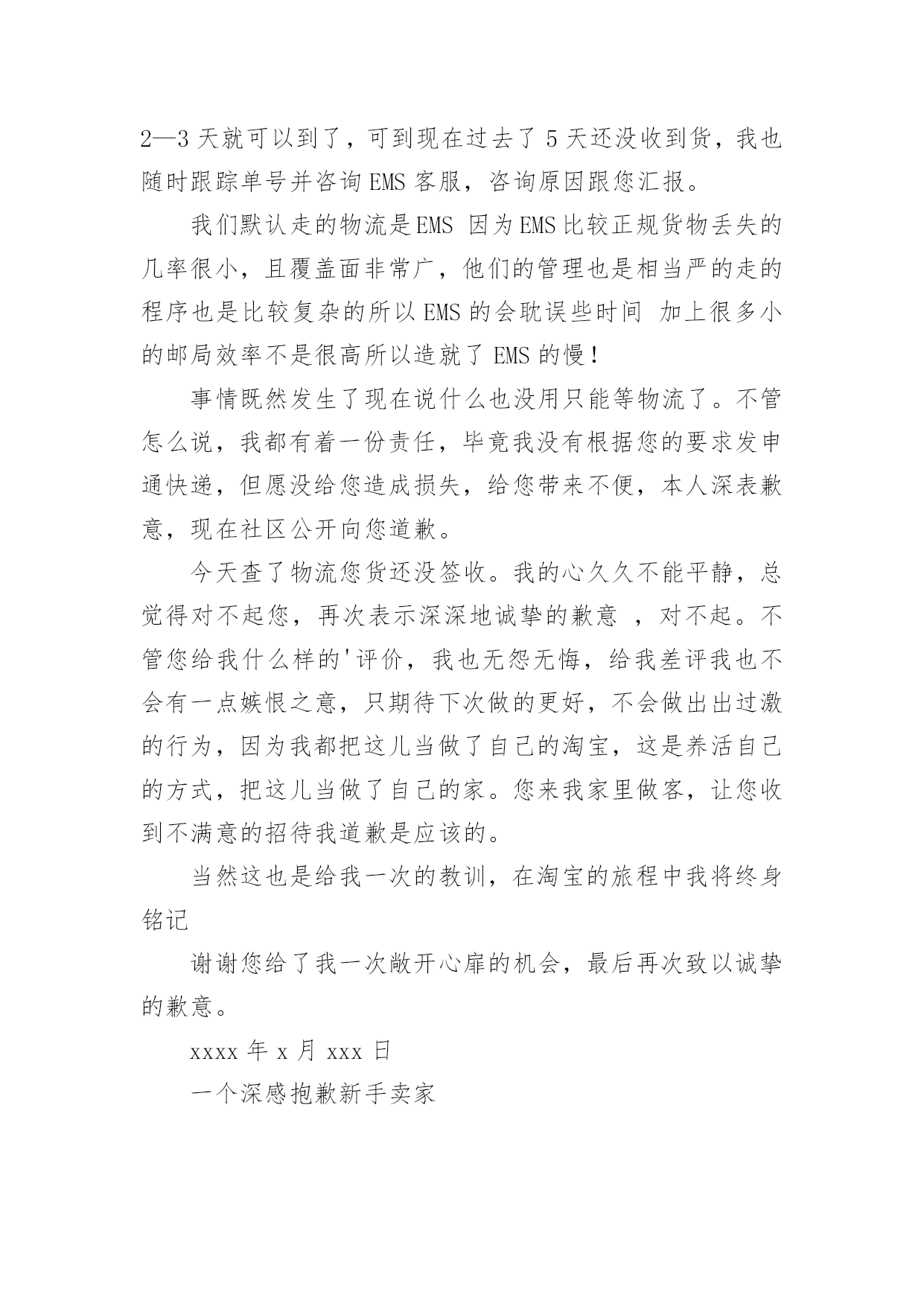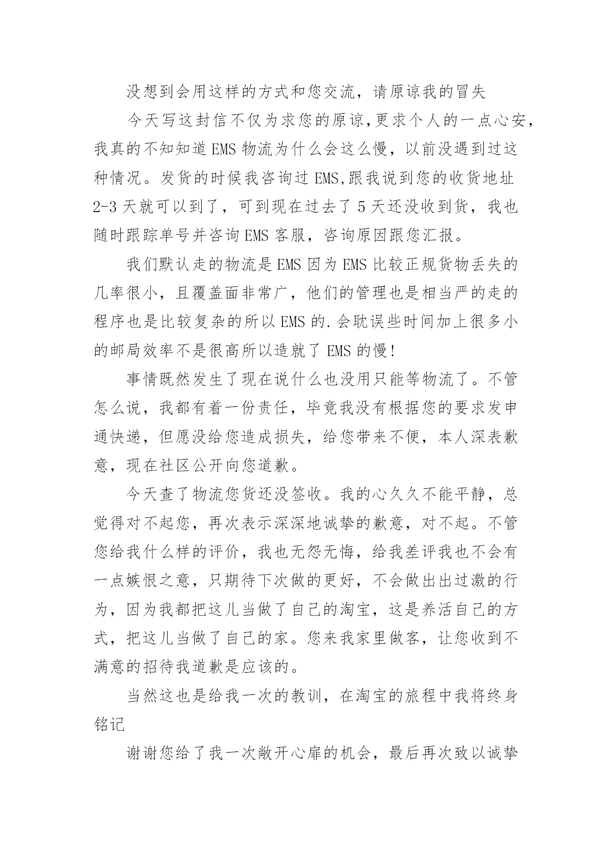 物流延迟的道歉信物流延迟的道歉信现如今,道歉信使用的情况越来越多,通过道歉信可以更好地表示陪礼道歉,消除曲解。在写之前,可以先参考范文,下面是小编整理的物流延迟的道歉信,欢迎阅读,希望大家能够喜欢。物流延迟的道歉信1尊敬的'xxx:您好!由于冰雪天气(或者交通意外)原因,导致了货物到达日期的延迟,给您带来不便敬请谅解!我公司保证,下次出现类似的原因一定提前知会您,很高兴能为您服务,期待下一次的愉快合作。在此,我代表xxx公司祝您阖家幸福,生活美满!此致致敬!xxx20xx年xx月xx日物流延迟的道歉信2亲,您好:没想到会用这样的方式和您交流,请原谅我的冒失今天写这封信不仅为求您的原谅,更求个人的一点心安,我真的不知知道EMS物流为什么会这么慢,以前没遇到过这种情况。发货的时候我咨询过EMS,跟我说到您的收货地址2-3天就可以到了,可到现在过去了5天还没收到货,我也随时跟踪单号并咨询EMS客服,咨询原因跟您汇报。我们默认走的物流是EMS因为EMS比较正规货物丢失的几率很小,且覆盖面非常广,他们的管理也是相当严的走的程序也是比较复杂的所以EMS的.会耽误些时间加上很多小的邮局效率不是很高所以造就了EMS的慢!事情既然发生了现在说什么也没用只能等物流了。不管怎么说,我都有着一份责任,毕竟我没有根据您的要求发申通快递,但愿没给您造成损失,给您带来不便,本人深表歉意,现在社区公开向您道歉。今天查了物流您货还没签收。我的心久久不能平静,总觉得对不起您,再次表示深深地诚挚的歉意,对不起。不管您给我什么样的评价,我也无怨无悔,给我差评我也不会有一点嫉恨之意,只期待下次做的更好,不会做出出过激的行为,因为我都把这儿当做了自己的淘宝,这是养活自己的方式,把这儿当做了自己的家。您来我家里做客,让您收到不满意的招待我道歉是应该的。当然这也是给我一次的教训,在淘宝的旅程中我将终身铭记谢谢您给了我一次敞开心扉的机会,最后再次致以诚挚的歉意。此致敬礼致歉人:xx20xx年xx月xx日物流延迟的道歉信3亲,您好:没想到会用这样的方式和您交流,请原谅我的冒失狂天写这封信不仅为求您的原谅,更求个人的一点心安,我真的不知知道EMS物流为什么会这么慢,以前没遇到过这种情况。发货的时候我咨询过EMS,跟我说到您的收货地址2-3天就可以到了,可到现在过去了5天还没收到货,我也随时跟踪单号并咨询EMS客服,咨询原因跟您汇报。我们默认走的物流是EMS因为EMS比较正规货物丢失的几率很小,且覆盖面非常广,他们的管理也是相当严的走的程序也是比较复杂的所以EMS的会耽误些时间加上很多小的邮局效率不是很高所以造就了EMS的慢!事情既然发生了现在说什么也没用只能等物流了。不管怎么说,我都有着一份责任,竟我没有根据您的要求发申通快递,但愿没给您造成损失,给您带来不便,本人深表歉意,现在社区公开向您道歉。狂天查了物流您货还没签收。我的心久久不能平静,总觉得对不起您,再次表示深深地诚挚的歉意,对不起。不管您给我什么样的评价,我也无怨无悔,给我差评我也不会有一点嫉恨之意,只期待下次做的更好,不会做出出过激的行为,因为我都把这儿当做了自己的淘宝,这是养活自己的`方式,把这儿当做了自己的家。您来我家里做客,让您收到不满意的招待我道歉是应该的。当然这也是给我一次的教训,在淘宝的旅程中我将终身铭记谢谢您给了我一次敞开心扉的机会,最后再次致以诚挚的歉意。xxxx年x月xxx日一个深感抱歉新手卖家物流延迟的道歉信4尊敬的xxx:您好!由于冰雪天气(或者交通意外)原因,导致了货物到达日期的'延迟,给您带来不便敬请谅解!我公司保证,下次出现类似的原因一定提前知会您,很高兴能为您服务,期待下一次的愉快合作。在此,我代表xxx公司祝您阖家幸福,生活美满!xxxxxx年xx月xx日物流延迟的道歉信5亲您好!由于冰雪天气(或者交通意外)原因,导致了货物到达日期的.延迟,给您带来不便敬请谅解!我公司保证,下次出现类似的原因一定提前知会您,很高兴能为您服务,期待下一次的愉快合作。在此,我代表xxx公司祝您阖家幸福,生活美满!此致敬礼!XXXxx年xx月xx日物流延迟的道歉信6尊敬的***:您好!由于冰雪天气(或者交通意外)原因,导致了货物到达日期的延迟,给您带来不便敬请谅解!我公司保证,下次出现类似的原因一定提前知会您,很高兴能为您服务,期待下一次的'愉快合作。在此,我代表***公司祝您阖家幸福,生活美满!此致敬礼!姓名:日期:物流延迟的道歉信7亲爱的买家:您好!如果您每天翘首盼望在xx家购买的宝贝此刻就送到手上,却频频失望;如果您怀着期待的心情拆开包装盒,却发现宝贝因为运输途中的磕磕碰碰有一些瑕疵,对此xx家表示深深的歉意。这些都不是我们想看到的,我们只想给亲呈上最好的宝贝,以及最贴心的服务。xx家的晨晨店长恨不