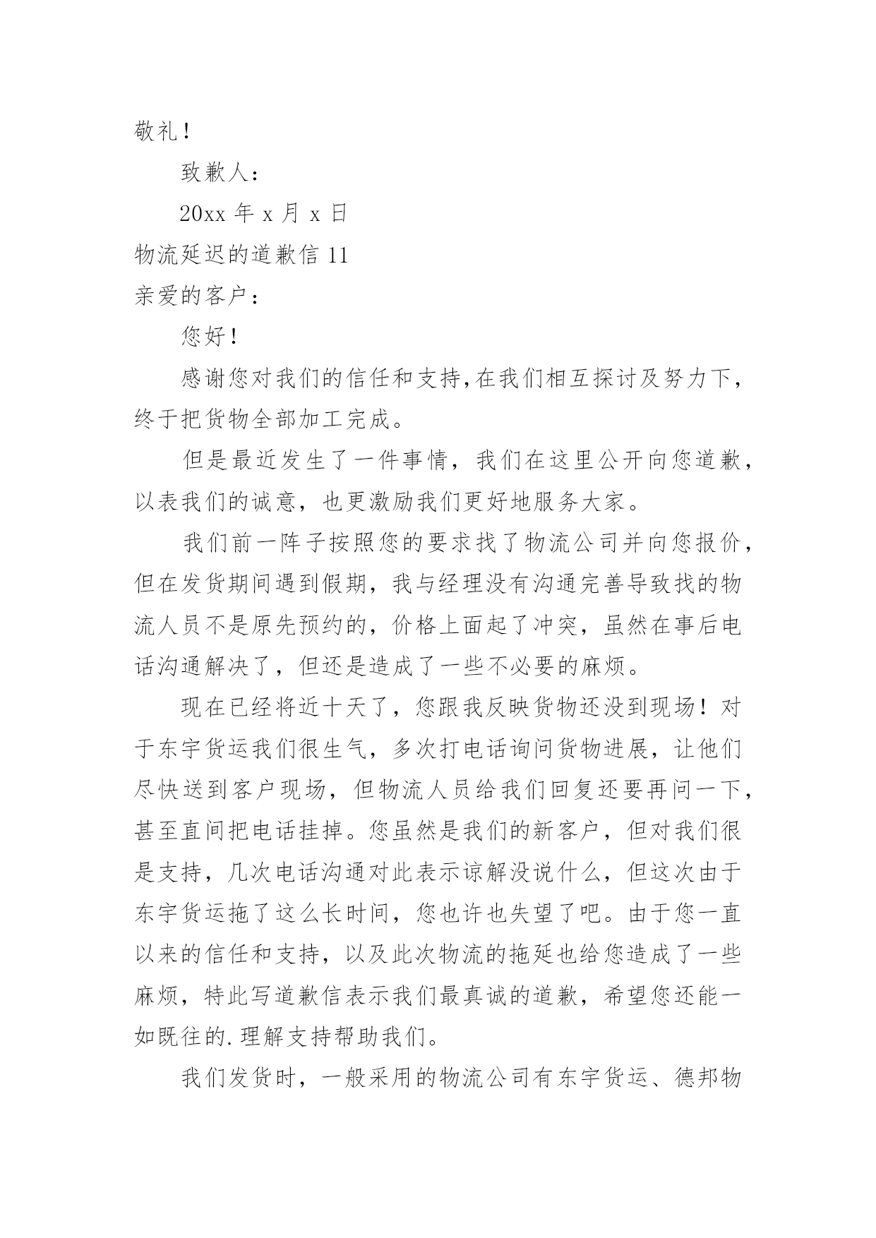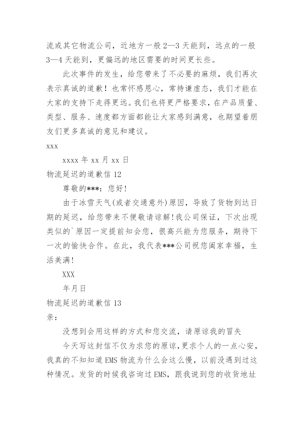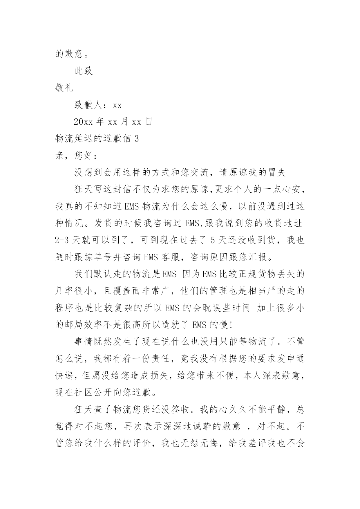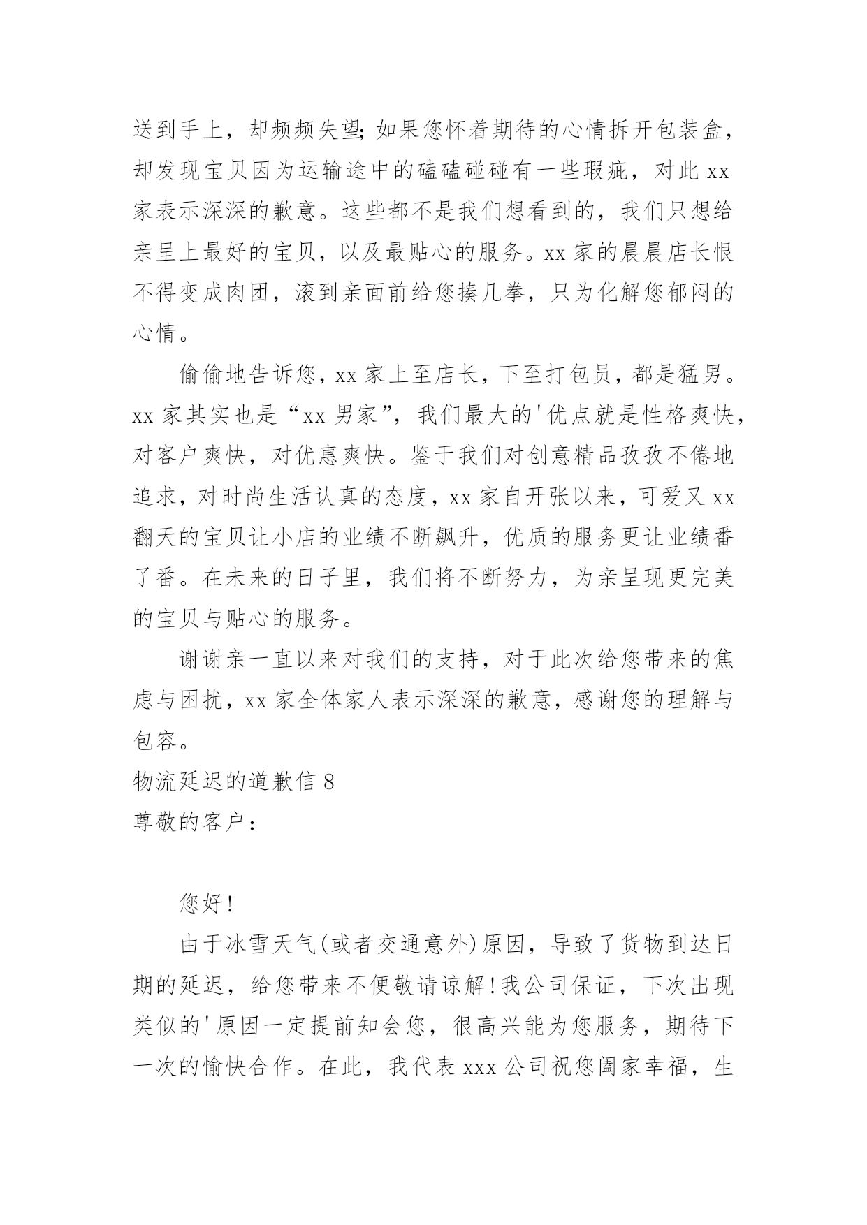 物流延迟的道歉信物流延迟的道歉信现如今,道歉信使用的情况越来越多,通过道歉信可以更好地表示陪礼道歉,消除曲解。在写之前,可以先参考范文,下面是小编整理的物流延迟的道歉信,欢迎阅读,希望大家能够喜欢。物流延迟的道歉信1尊敬的'xxx:您好!由于冰雪天气(或者交通意外)原因,导致了货物到达日期的延迟,给您带来不便敬请谅解!我公司保证,下次出现类似的原因一定提前知会您,很高兴能为您服务,期待下一次的愉快合作。在此,我代表xxx公司祝您阖家幸福,生活美满!此致致敬!xxx20xx年xx月xx日物流延迟的道歉信2亲,您好:没想到会用这样的方式和您交流,请原谅我的冒失今天写这封信不仅为求您的原谅,更求个人的一点心安,我真的不知知道EMS物流为什么会这么慢,以前没遇到过这种情况。发货的时候我咨询过EMS,跟我说到您的收货地址2-3天就可以到了,可到现在过去了5天还没收到货,我也随时跟踪单号并咨询EMS客服,咨询原因跟您汇报。我们默认走的物流是EMS因为EMS比较正规货物丢失的几率很小,且覆盖面非常广,他们的管理也是相当严的走的程序也是比较复杂的所以EMS的.会耽误些时间加上很多小的邮局效率不是很高所以造就了EMS的慢!事情既然发生了现在说什么也没用只能等物流了。不管怎么说,我都有着一份责任,毕竟我没有根据您的要求发申通快递,但愿没给您造成损失,给您带来不便,本人深表歉意,现在社区公开向您道歉。今天查了物流您货还没签收。我的心久久不能平静,总觉得对不起您,再次表示深深地诚挚的歉意,对不起。不管您给我什么样的评价,我也无怨无悔,给我差评我也不会有一点嫉恨之意,只期待下次做的更好,不会做出出过激的行为,因为我都把这儿当做了自己的淘宝,这是养活自己的方式,把这儿当做了自己的家。您来我家里做客,让您收到不满意的招待我道歉是应该的。当然这也是给我一次的教训,在淘宝的旅程中我将终身铭记谢谢您给了我一次敞开心扉的机会,最后再次致以诚挚的歉意。此致敬礼致歉人:xx20xx年xx月xx日物流延迟的道歉信3亲,您好:没想到会用这样的方式和您交流,请原谅我的冒失狂天写这封信不仅为求您的原谅,更求个人的一点心安,我真的不知知道EMS物流为什么会这么慢,以前没遇到过这种情况。发货的时候我咨询过EMS,跟我说到您的收货地址2-3天就可以到了,可到现在过去了5天还没收到货,我也随时跟踪单号并咨询EMS客服,咨询原因跟您汇报。我们默认走的物流是EMS因为EMS比较正规货物丢失的几率很小,且覆盖面非常广,他们的管理也是相当严的走的程序也是比较复杂的所以EMS的会耽误些时间加上很多小的邮局效率不是很高所以造就了EMS的慢!事情既然发生了现在说什么也没用只能等物流了。不管怎么说,我都有着一份责任,竟我没有根据您的要求发申通快递,但愿没给您造成损失,给您带来不便,本人深表歉意,现在社区公开向您道歉。狂天查了物流您货还没签收。我的心久久不能平静,总觉得对不起您,再次表示深深地诚挚的歉意,对不起。不管您给我什么样的评价,我也无怨无悔,给我差评我也不会有一点嫉恨之意,只期待下次做的更好,不会做出出过激的行为,因为我都把这儿当做了自己的淘宝,这是养活自己的`方式,把这儿当做了自己的家。您来我家里做客,让您收到不满意的招待我道歉是应该的。当然这也是给我一次的教训,在淘宝的旅程中我将终身铭记谢谢您给了我一次敞开心扉的机会,最后再次致以诚挚的歉意。xxxx年x月xxx日一个深感抱歉新手卖家物流延迟的道歉信4尊敬的xxx:您好!由于冰雪天气(或者交通意外)原因,导致了货物到达日期的'延迟,给您带来不便敬请谅解!我公司保证,下次出现类似的原因一定提前知会您,很高兴能为您服务,期待下一次的愉快合作。在此,我代表xxx公司祝您阖家幸福,生活美满!xxxxxx年xx月xx日物流延迟的道歉信5亲您好!由于冰雪天气(或者交通意外)原因,导致了货物到达日期的.延迟,给您带来不便敬请谅解!我公司保证,下次出现类似的原因一定提前知会您,很高兴能为您服务,期待下一次的愉快合作。在此,我代表xxx公司祝您阖家幸福,生活美满!此致敬礼!XXXxx年xx月xx日物流延迟的道歉信6尊敬的***:您好!由于冰雪天气(或者交通意外)原因,导致了货物到达日期的延迟,给您带来不便敬请谅解!我公司保证,下次出现类似的原因一定提前知会您,很高兴能为您服务,期待下一次的'愉快合作。在此,我代表***公司祝您阖家幸福,生活美满!此致敬礼!姓名:日期:物流延迟的道歉信7亲爱的买家:您好!如果您每天翘首盼望在xx家购买的宝贝此刻就送到手上,却频频失望;如果您怀着期待的心情拆开包装盒,却发现宝贝因为运输途中的磕磕碰碰有一些瑕疵,对此xx家表示深深的歉意。这些都不是我们想看到的,我们只想给亲呈上最好的宝贝,以及最贴心的服务。xx家的晨晨店长恨不