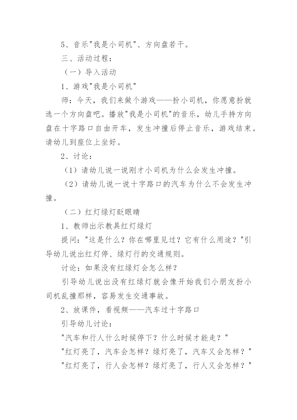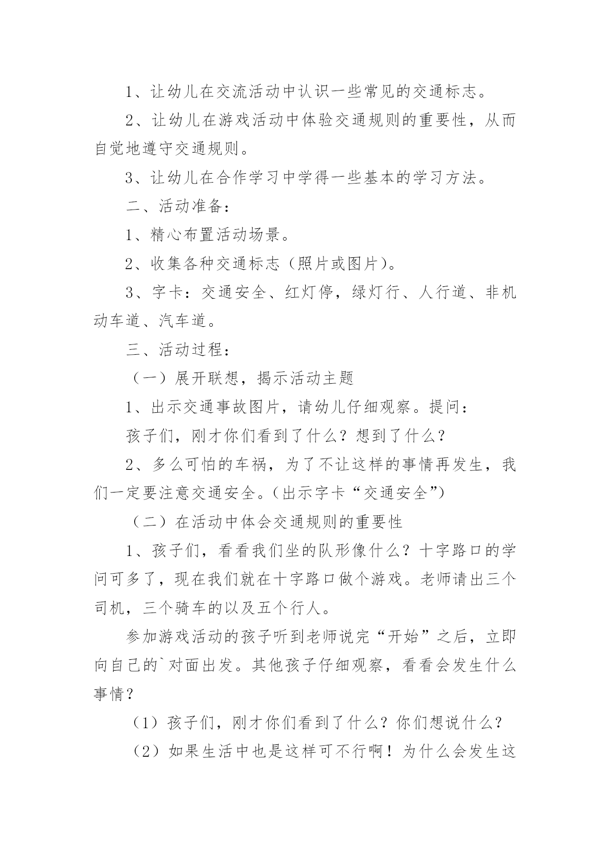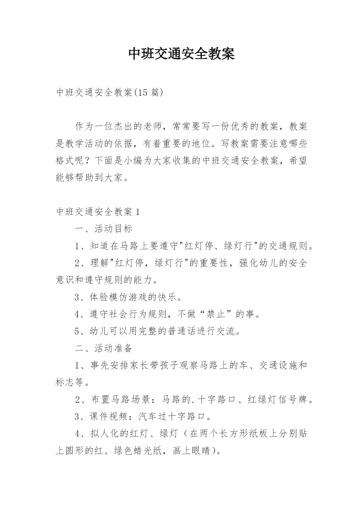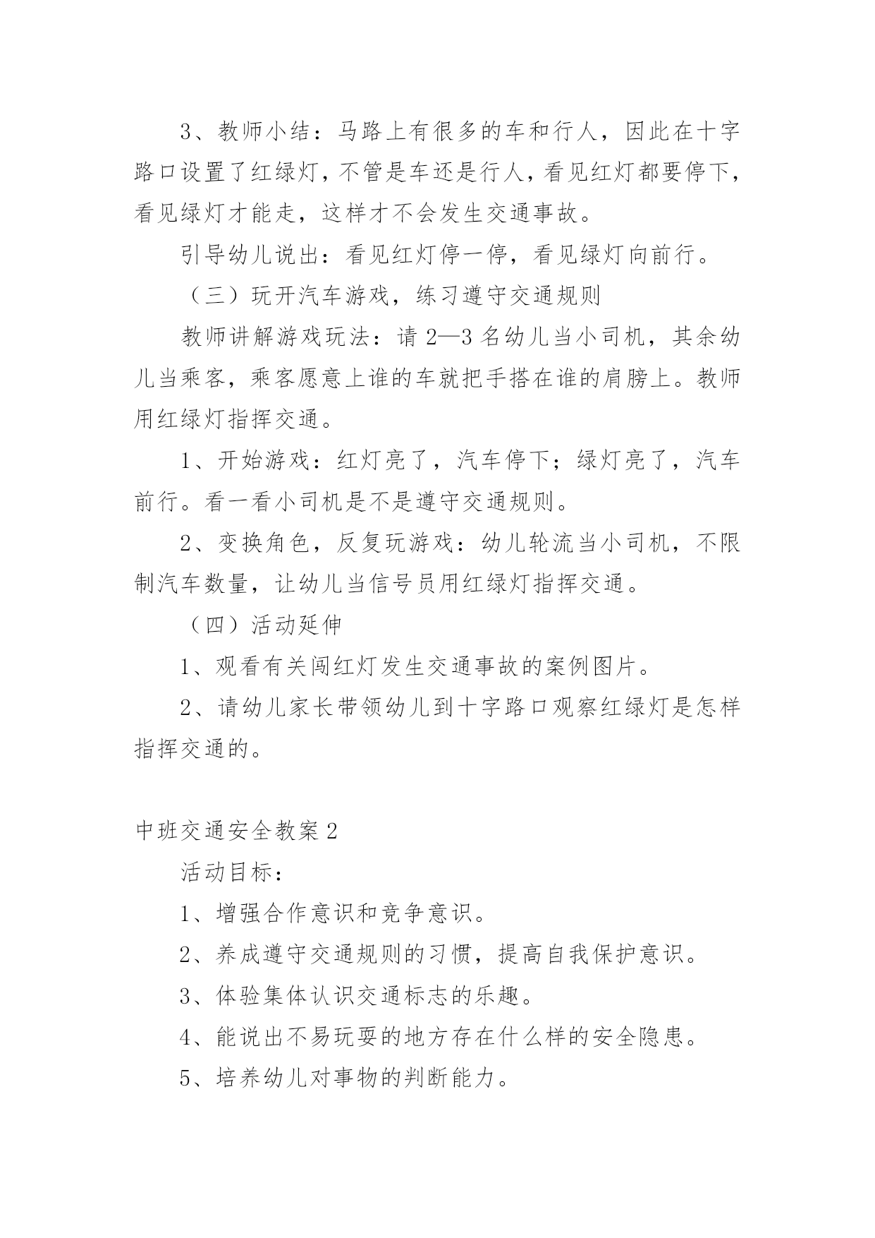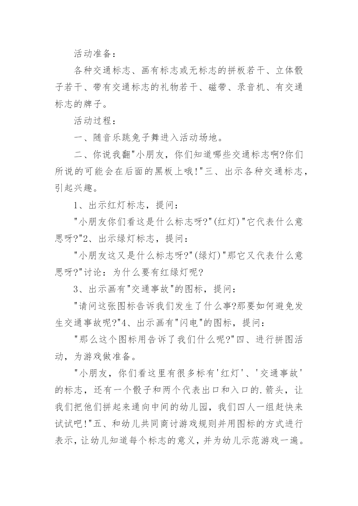 中班交通安全教案中班交通安全教案(15篇)作为一位杰出的老师,常常要写一份优秀的教案,教案是教学活动的依据,有着重要的地位。写教案需要注意哪些格式呢?下面是小编为大家收集的中班交通安全教案,希望能够帮助到大家。中班交通安全教案1一、活动目标1、知道在马路上要遵守"红灯停、绿灯行"的交通规则。2、理解"红灯停,绿灯行"的重要性,强化幼儿的安全意识和遵守规则的能力。3、体验模仿游戏的快乐。4、遵守社会行为规则,不做“禁止”的事。5、幼儿可以用完整的普通话进行交流。二、活动准备1、事先安排家长带孩子观察马路上的车、交通设施和标志等。2、布置马路场景:马路的.十字路口、红绿灯信号牌。3、课件视频:汽车过十字路口。4、拟人化的红灯、绿灯(在两个长方形纸板上分别贴上圆形的红、绿色蜡光纸,画上眼睛)。5、音乐"我是小司机"、方向盘若干。三、活动过程:(一)导入活动1、游戏"我是小司机"师:今天,我们来做个游戏——扮小司机,你愿意扮就选一个方向盘吧。播放"我是小司机"的音乐,幼儿手持方向盘在十字路口自由开车,发生冲撞后停止音乐,游戏结束。请幼儿到座位上坐好。2、讨论:(1)请幼儿说一说刚才小司机为什么会发生冲撞。(2)请幼儿说一说十字路口的汽车为什么不会发生冲撞。(二)红灯绿灯眨眼睛1、教师出示教具红灯绿灯提问:"这是什么?你在哪里见过?它有什么用途?"引导幼儿说出红灯停、绿灯行的交通规则。讨论:如果没有红绿灯会怎么样?引导幼儿说出没有红绿灯就会像开始我们小朋友扮小司机乱撞那样,容易发生交通事故。2、放课件,看视频——汽车过十字路口引导幼儿讨论:"汽车和行人什么时候停下?什么时候才能走?""红灯亮了,汽车会怎样?绿灯亮了,汽车又会怎样?""红灯亮了,行人会怎样?绿灯亮了,行人又会怎样?"3、教师小结:马路上有很多的车和行人,因此在十字路口设置了红绿灯,不管是车还是行人,看见红灯都要停下,看见绿灯才能走,这样才不会发生交通事故。引导幼儿说出:看见红灯停一停,看见绿灯向前行。(三)玩开汽车游戏,练习遵守交通规则教师讲解游戏玩法:请2—3名幼儿当小司机,其余幼儿当乘客,乘客愿意上谁的车就把手搭在谁的肩膀上。教师用红绿灯指挥交通。1、开始游戏:红灯亮了,汽车停下;绿灯亮了,汽车前行。看一看小司机是不是遵守交通规则。2、变换角色,反复玩游戏:幼儿轮流当小司机,不限制汽车数量,让幼儿当信号员用红绿灯指挥交通。(四)活动延伸1、观看有关闯红灯发生交通事故的案例图片。2、请幼儿家长带领幼儿到十字路口观察红绿灯是怎样指挥交通的。中班交通安全教案2活动目标:1、增强合作意识和竞争意识。2、养成遵守交通规则的习惯,提高自我保护意识。3、体验集体认识交通标志的乐趣。4、能说出不易玩耍的地方存在什么样的安全隐患。5、培养幼儿对事物的判断能力。活动准备:各种交通标志、画有标志或无标志的拼板若干、立体骰子若干、带有交通标志的礼物若干、磁带、录音机、有交通标志的牌子。活动过程:一、随音乐跳兔子舞进入活动场地。二、你说我翻"小朋友,你们知道哪些交通标志啊?你们所说的可能会在后面的黑板上哦!"三、出示各种交通标志,引起兴趣。1、出示红灯标志,提问:"小朋友你们看这是什么标志呀?"(红灯)"它代表什么意思呀?"2、出示绿灯标志,提问:"小朋友这又是什么标志呀?"(绿灯)"那它又代表什么意思呀?"讨论:为什么要有红绿灯呢?3、出示画有"交通事故"的图标,提问:"请问这张图标告诉我们发生了什么事?那要如何避免发生交通事故呢?"4、出示画有"闪电"的图标,提问:"那么这个图标用告诉了我们什么呢?"四、进行拼图活动,为游戏做准备。"小朋友,你们看这里有很多标有'红灯'、'交通事故'的标志,还有一个骰子和两个代表出口和入口的.箭头,让我们把他们拼起来通向中间的幼儿园,我们四人一组赶快来试试吧!"五、和幼儿共同商讨游戏规则并用图标的方式进行表示,让幼儿知道每个标志的意义,并为幼儿示范游戏一遍。"我们通向幼儿园的路都拼好了,那我们就可以来玩〈〈争分夺秒〉〉的游戏了。那游戏总要有个规则,那你们想想该怎么定规则呢?"(按幼儿所定的规则在图标旁边进行表示,以便提醒幼儿遵守游戏规则)。教师示范游戏一遍,帮助幼儿掌握游戏规则。"游戏规则都定好了,玩起来一定很有意思,我先来试一试,你们可要给我加油哦!"六、幼儿进行游戏,教师进行指导并维持秩序并提醒幼儿遵守游戏规则。"我刚刚玩得可高兴了,你们一定也想玩了吧,那我就在幼儿园等你们,你们要排好队,轮到的小朋友就要按骰子上的数字前进最先到并遵守游戏规则的小朋友就可以到我的百宝箱里取一个宝贝哦!"七、评价并结束活动。"小朋友今天自己做小棋子一定玩得很高兴吧,那经过这个游戏小朋友一定能对交通规则更加遵守了,现在我们把这些交通规则去告诉小班的弟弟妹妹吧,let's