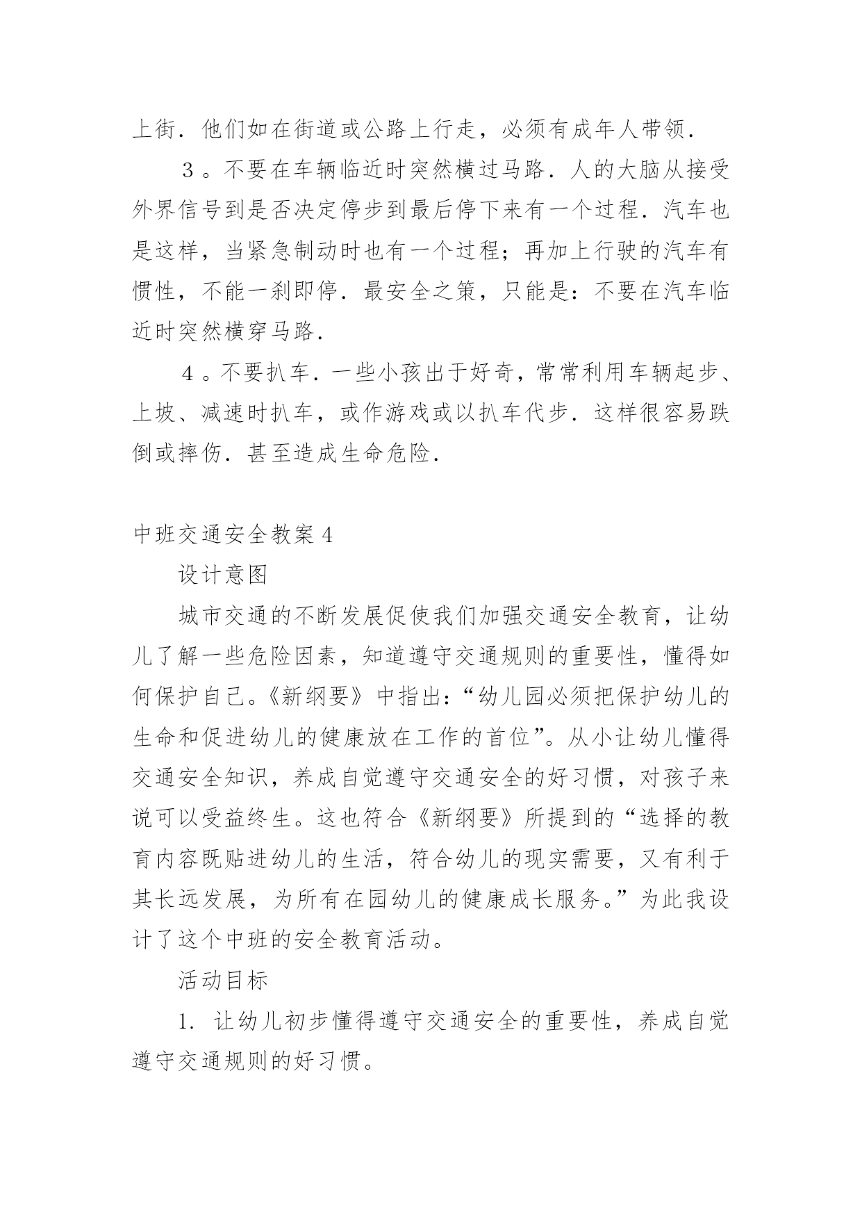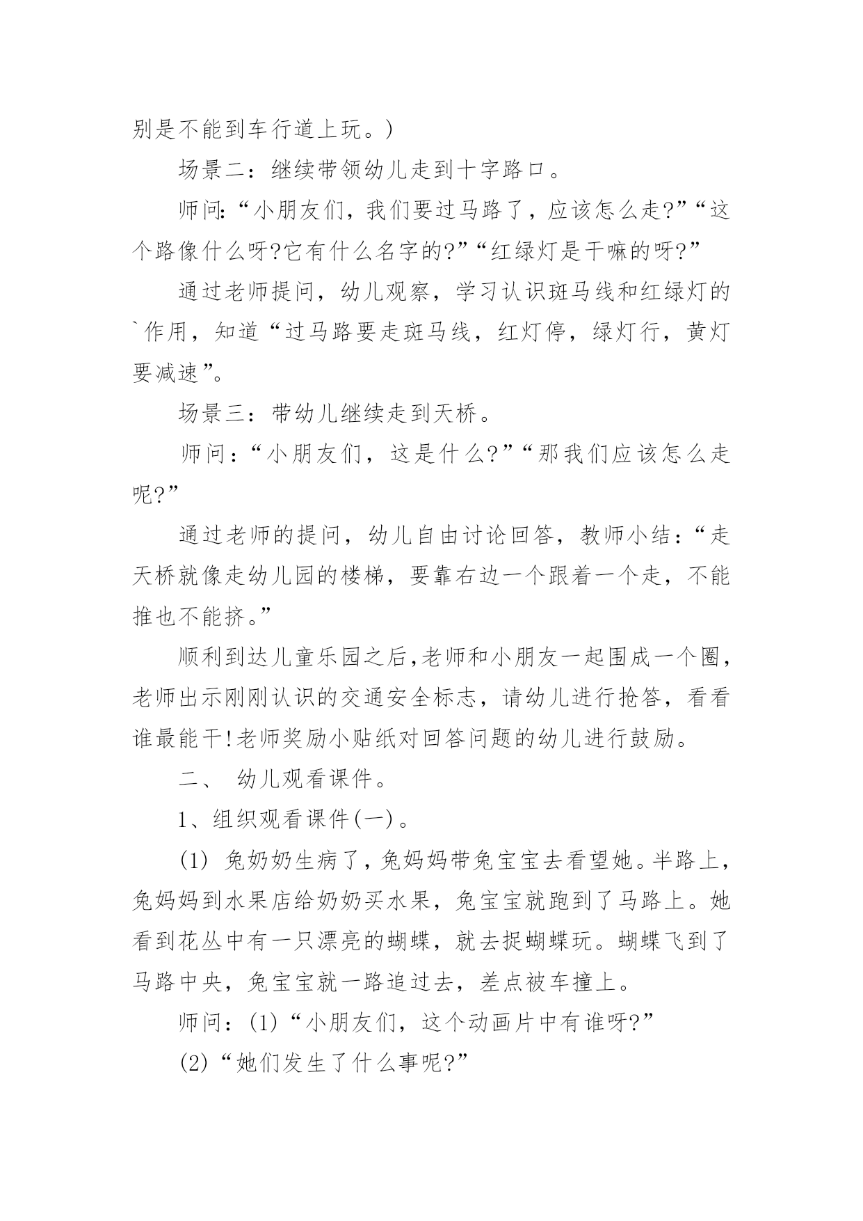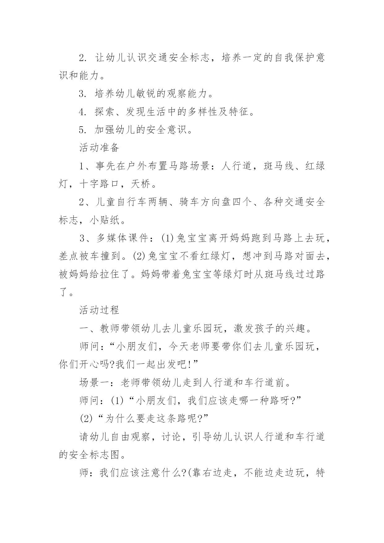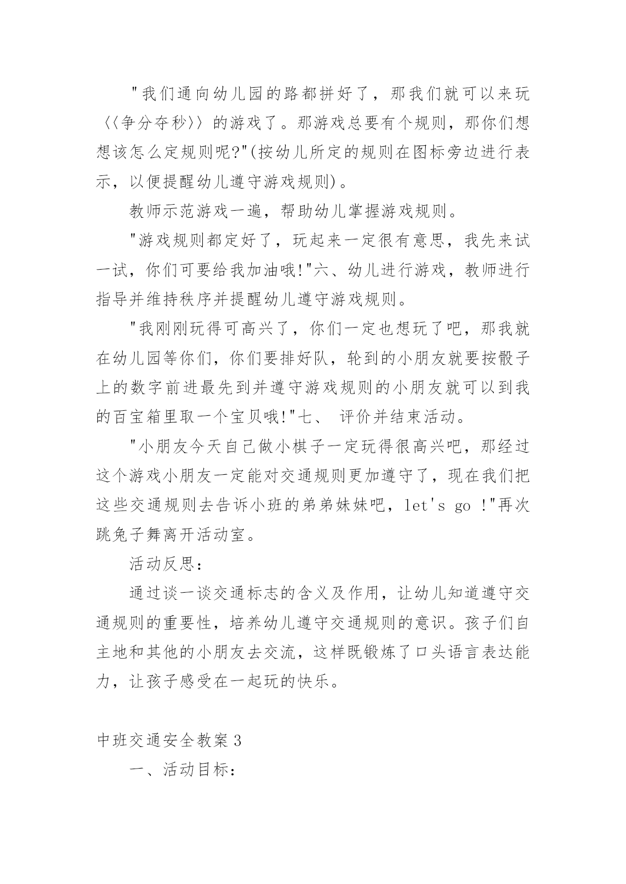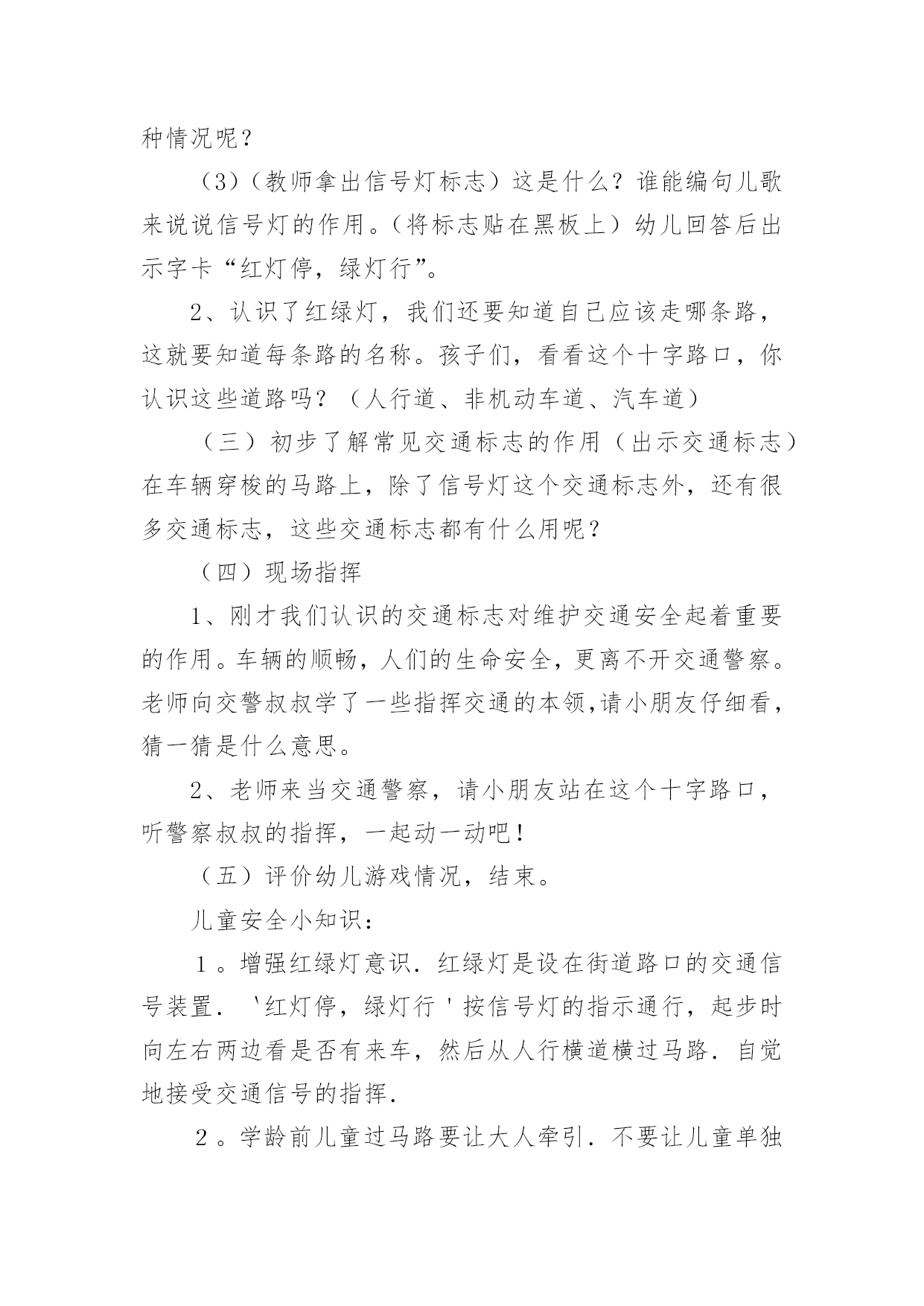 中班交通安全教案中班交通安全教案(15篇)作为一位杰出的老师,常常要写一份优秀的教案,教案是教学活动的依据,有着重要的地位。写教案需要注意哪些格式呢?下面是小编为大家收集的中班交通安全教案,希望能够帮助到大家。中班交通安全教案1一、活动目标1、知道在马路上要遵守"红灯停、绿灯行"的交通规则。2、理解"红灯停,绿灯行"的重要性,强化幼儿的安全意识和遵守规则的能力。3、体验模仿游戏的快乐。4、遵守社会行为规则,不做“禁止”的事。5、幼儿可以用完整的普通话进行交流。二、活动准备1、事先安排家长带孩子观察马路上的车、交通设施和标志等。2、布置马路场景:马路的.十字路口、红绿灯信号牌。3、课件视频:汽车过十字路口。4、拟人化的红灯、绿灯(在两个长方形纸板上分别贴上圆形的红、绿色蜡光纸,画上眼睛)。5、音乐"我是小司机"、方向盘若干。三、活动过程:(一)导入活动1、游戏"我是小司机"师:今天,我们来做个游戏——扮小司机,你愿意扮就选一个方向盘吧。播放"我是小司机"的音乐,幼儿手持方向盘在十字路口自由开车,发生冲撞后停止音乐,游戏结束。请幼儿到座位上坐好。2、讨论:(1)请幼儿说一说刚才小司机为什么会发生冲撞。(2)请幼儿说一说十字路口的汽车为什么不会发生冲撞。(二)红灯绿灯眨眼睛1、教师出示教具红灯绿灯提问:"这是什么?你在哪里见过?它有什么用途?"引导幼儿说出红灯停、绿灯行的交通规则。讨论:如果没有红绿灯会怎么样?引导幼儿说出没有红绿灯就会像开始我们小朋友扮小司机乱撞那样,容易发生交通事故。2、放课件,看视频——汽车过十字路口引导幼儿讨论:"汽车和行人什么时候停下?什么时候才能走?""红灯亮了,汽车会怎样?绿灯亮了,汽车又会怎样?""红灯亮了,行人会怎样?绿灯亮了,行人又会怎样?"3、教师小结:马路上有很多的车和行人,因此在十字路口设置了红绿灯,不管是车还是行人,看见红灯都要停下,看见绿灯才能走,这样才不会发生交通事故。引导幼儿说出:看见红灯停一停,看见绿灯向前行。(三)玩开汽车游戏,练习遵守交通规则教师讲解游戏玩法:请2—3名幼儿当小司机,其余幼儿当乘客,乘客愿意上谁的车就把手搭在谁的肩膀上。教师用红绿灯指挥交通。1、开始游戏:红灯亮了,汽车停下;绿灯亮了,汽车前行。看一看小司机是不是遵守交通规则。2、变换角色,反复玩游戏:幼儿轮流当小司机,不限制汽车数量,让幼儿当信号员用红绿灯指挥交通。(四)活动延伸1、观看有关闯红灯发生交通事故的案例图片。2、请幼儿家长带领幼儿到十字路口观察红绿灯是怎样指挥交通的。中班交通安全教案2活动目标:1、增强合作意识和竞争意识。2、养成遵守交通规则的习惯,提高自我保护意识。3、体验集体认识交通标志的乐趣。4、能说出不易玩耍的地方存在什么样的安全隐患。5、培养幼儿对事物的判断能力。活动准备:各种交通标志、画有标志或无标志的拼板若干、立体骰子若干、带有交通标志的礼物若干、磁带、录音机、有交通标志的牌子。活动过程:一、随音乐跳兔子舞进入活动场地。二、你说我翻"小朋友,你们知道哪些交通标志啊?你们所说的可能会在后面的黑板上哦!"三、出示各种交通标志,引起兴趣。1、出示红灯标志,提问:"小朋友你们看这是什么标志呀?"(红灯)"它代表什么意思呀?"2、出示绿灯标志,提问:"小朋友这又是什么标志呀?"(绿灯)"那它又代表什么意思呀?"讨论:为什么要有红绿灯呢?3、出示画有"交通事故"的图标,提问:"请问这张图标告诉我们发生了什么事?那要如何避免发生交通事故呢?"4、出示画有"闪电"的图标,提问:"那么这个图标用告诉了我们什么呢?"四、进行拼图活动,为游戏做准备。"小朋友,你们看这里有很多标有'红灯'、'交通事故'的标志,还有一个骰子和两个代表出口和入口的.箭头,让我们把他们拼起来通向中间的幼儿园,我们四人一组赶快来试试吧!"五、和幼儿共同商讨游戏规则并用图标的方式进行表示,让幼儿知道每个标志的意义,并为幼儿示范游戏一遍。"我们通向幼儿园的路都拼好了,那我们就可以来玩〈〈争分夺秒〉〉的游戏了。那游戏总要有个规则,那你们想想该怎么定规则呢?"(按幼儿所定的规则在图标旁边进行表示,以便提醒幼儿遵守游戏规则)。教师示范游戏一遍,帮助幼儿掌握游戏规则。"游戏规则都定好了,玩起来一定很有意思,我先来试一试,你们可要给我加油哦!"六、幼儿进行游戏,教师进行指导并维持秩序并提醒幼儿遵守游戏规则。"我刚刚玩得可高兴了,你们一定也想玩了吧,那我就在幼儿园等你们,你们要排好队,轮到的小朋友就要按骰子上的数字前进最先到并遵守游戏规则的小朋友就可以到我的百宝箱里取一个宝贝哦!"七、评价并结束活动。"小朋友今天自己做小棋子一定玩得很高兴吧,那经过这个游戏小朋友一定能对交通规则更加遵守了,现在我们把这些交通规则去告诉小班的弟弟妹妹吧,let's