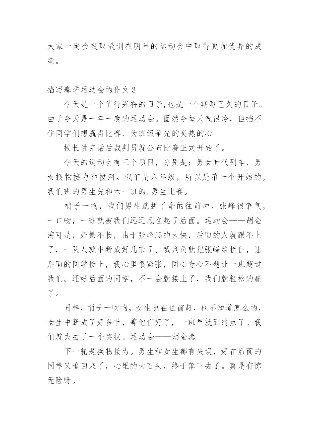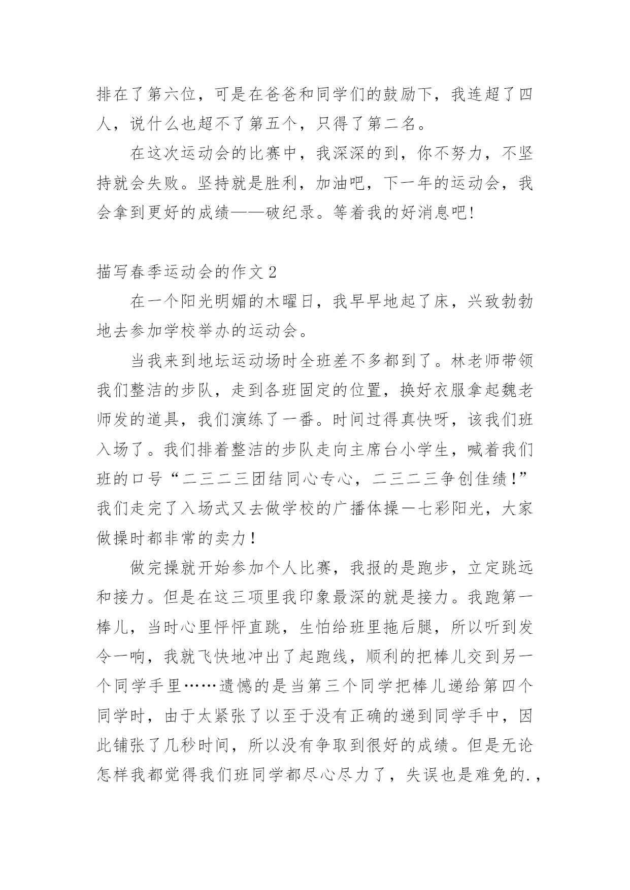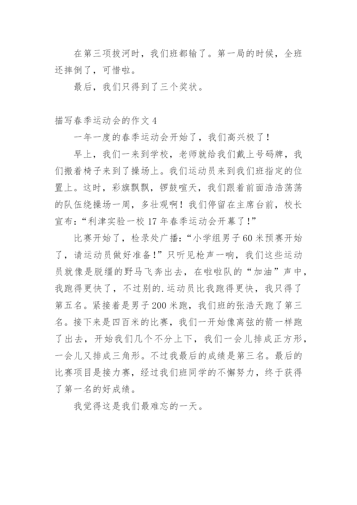 描写春季运动会的作文无论在学习、工作或是生活中,大家或多或少都会接触过作文吧,通过作文可以把我们那些零零散散的思想,聚集在一块。一篇什么样的作文才能称之为优秀作文呢?以下是小编帮大家整理的描写春季运动会的作文,仅供参考,希望能够帮助到大家。描写春季运动会的作文1今天,我们实验二校举行了隆重的春季运动会。首先是精彩的开幕式。四年级的同学们敲敲打打,会场上鼓号齐鸣。径赛开始了,先是九年级的同学比赛,在这一刻,我很紧张。因为李老师让我在最前面看人家怎样冲刺,我仔细的看着,认真的学着。只见这些运动员冲刺的时候,都抬头挺胸,咬紧牙关使劲向前冲。过了一会儿,轮到我的100米上场了,这时,我更加紧张起来,我们班的同学们都积极投稿,给我们运动员鼓舞士气。这时,我的心情也渐渐平静下来。一声枪响,我像一匹飞快的千里马,奔腾而出。不好!有人乱道了,搞得我仅仅得了个第二名。幸好没有去年那么惨,跑了第三被错判成第五。在我跑400米之前,爸爸和老师赶快的`给我支招,怎样才能跑得快,在什么地方加速最合适,爸爸还忙着给我揉腿。我的项目开始了,我不甘示弱。我努力的跑着,现在我排在了第六位,可是在爸爸和同学们的鼓励下,我连超了四人,说什么也超不了第五个,只得了第二名。在这次运动会的比赛中,我深深的到,你不努力,不坚持就会失败。坚持就是胜利,加油吧,下一年的运动会,我会拿到更好的成绩——破纪录。等着我的好消息吧!描写春季运动会的作文2在一个阳光明媚的木曜日,我早早地起了床,兴致勃勃地去参加学校举办的运动会。当我来到地坛运动场时全班差不多都到了。林老师带领我们整洁的步队,走到各班固定的位置,换好衣服拿起魏老师发的道具,我们演练了一番。时间过得真快呀,该我们班入场了。我们排着整洁的步队走向主席台小学生,喊着我们班的口号“二三二三团结同心专心,二三二三争创佳绩!”我们走完了入场式又去做学校的广播体操-七彩阳光,大家做操时都非常的卖力!做完操就开始参加个人比赛,我报的是跑步,立定跳远和接力。但是在这三项里我印象最深的就是接力。我跑第一棒儿,当时心里怦怦直跳,生怕给班里拖后腿,所以听到发令一响,我就飞快地冲出了起跑线,顺利的把棒儿交到另一个同学手里……遗憾的是当第三个同学把棒儿递给第四个同学时,由于太紧张了以至于没有正确的递到同学手中,因此铺张了几秒时间,所以没有争取到很好的成绩。但是无论怎样我都觉得我们班同学都尽心尽力了,失误也是难免的.,大家一定会吸取教训在明年的运动会中取得更加优异的成绩。描写春季运动会的作文3今天是一个值得兴奋的日子,也是一个期盼已久的日子。由于今天是一年一度的运动会。固然今每天气很冷,但挡不住同学们想赢得比赛、为班级争光的炙热的心校长讲完话后裁判员就公布比赛正式开始了。今天的运动会有三个项目,分别是:男女时代列车、男女换物接力和拔河。我们是六年级,所以是第一个开始的,我们班的男生先和六一班的.男生比赛。哨子一响,我们男生就拼了命的往前冲。张峰很争气,一口吻,一班就被我们远远甩在起了后面。运动会——胡金海可是,好景不长,由于张峰爬的太快,后面的人就跟不上了,一队人就中断成好几节了。裁判员就把张峰给拦住,让后面的同学接上,我心里很紧张,同心专心不想让一班超过我们。还好后面的同学,不一会就接上了,我们就轻松的赢了。同样,哨子一吹响,女生也在往前赶,也不知道怎么的,女生中断成了好多节,等他们好了,一班早就到终点了。我们就失去了一个奖状。运动会——胡金海下一轮是换物接力。男生和女生都有失误,好在后面的同学又追回来了,心里的大石头,终于落下去了。真是有惊无险呀。在第三项拔河时,我们班都输了。第一局的时候,全班还摔倒了,可惜啦。最后,我们只得到了三个奖状。描写春季运动会的作文4一年一度的春季运动会开始了,我们高兴极了!早上,我们一来到学校,老师就给我们戴上号码牌,我们搬着椅子来到了操场上。我们运动员来到我们班指定的位置上。这时,彩旗飘飘,锣鼓喧天,我们跟着前面浩浩荡荡的队伍绕操场一周,多壮观啊!我们停留在主席台前,校长宣布:“利津实验一校17年春季运动会开幕了!”比赛开始了,检录处广播:“小学组男子60米预赛开始了,请运动员做好准备!”只听见枪声一响,我们这些运动员就像是脱缰的野马飞奔出去,在啦啦队的“加油”声中,我跑得更快了,不过别的.运动员比我跑得更快,我只得了第五名。紧接着是男子200米跑,我们班的张浩天跑了第三名。接下来是四百米的比赛,我们一开始像离弦的箭一样跑了出去,开始我们几个不分上下,我们一会儿排成正方形,一会儿又排成三角形。不过我最后的成绩是第三名。最后的比赛项目是接力赛,经过我们班同学的不懈努力,终于获得了第一名的好成绩。我觉得这是我们最难忘的一天。