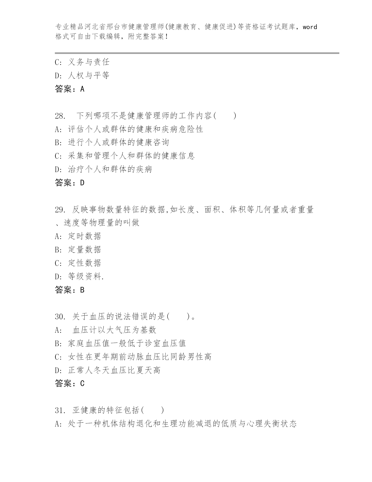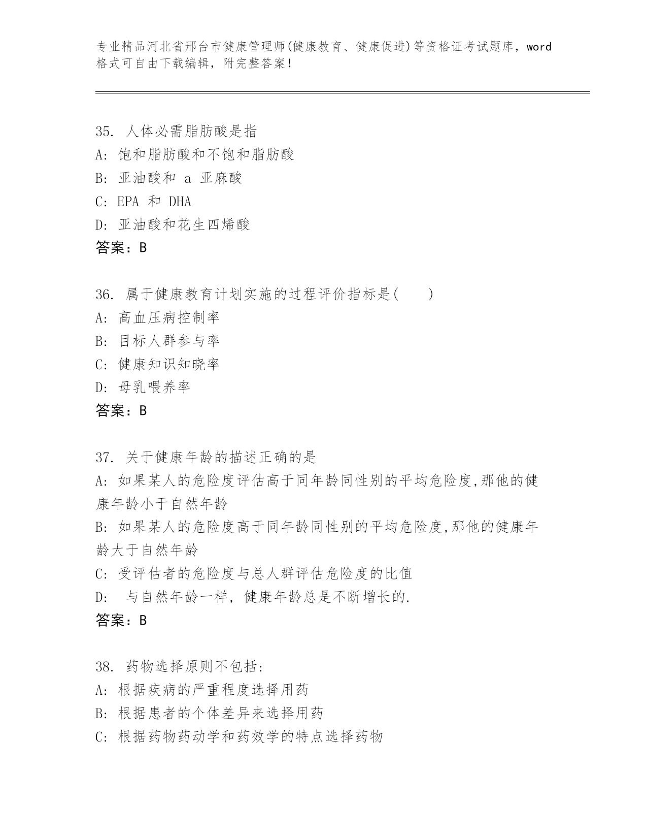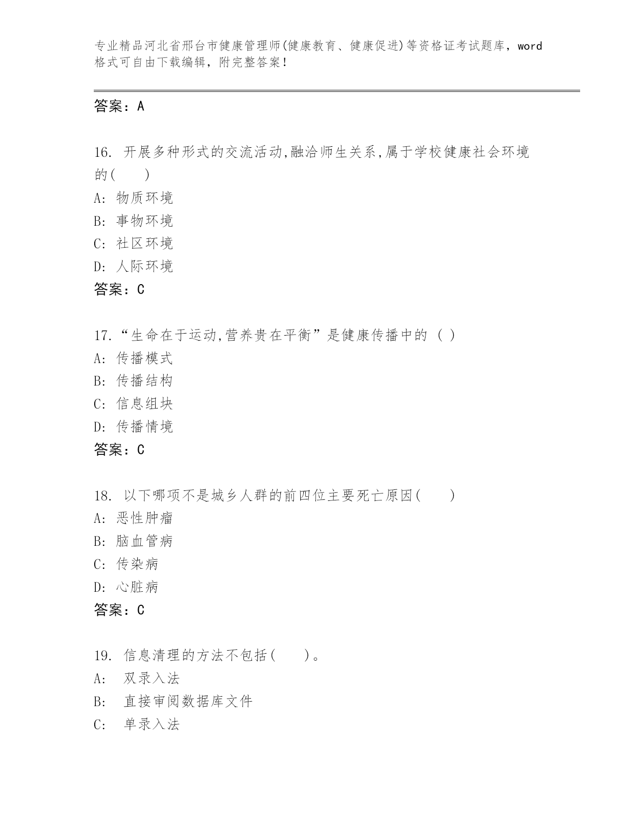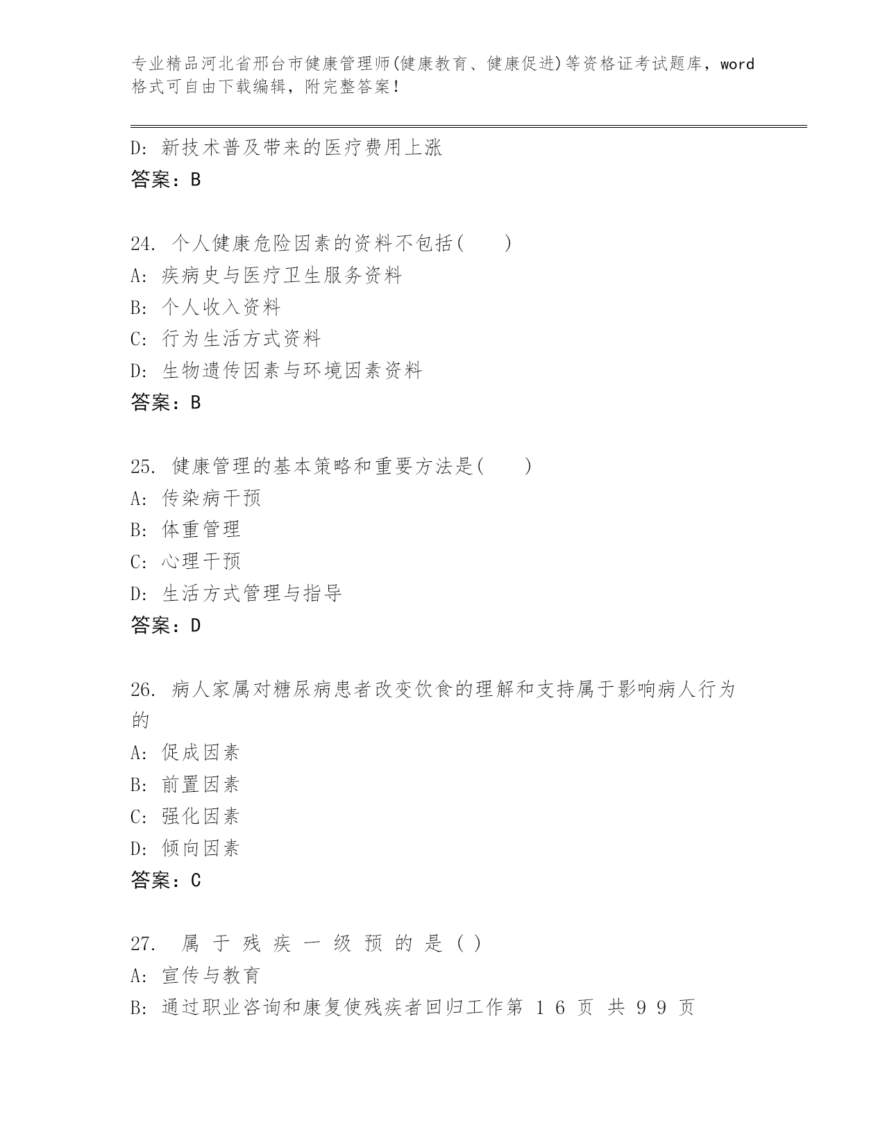 2024年河北省邢台市健康管理师(健康教育、健康促进)等资格证考试通用题库精品及答案