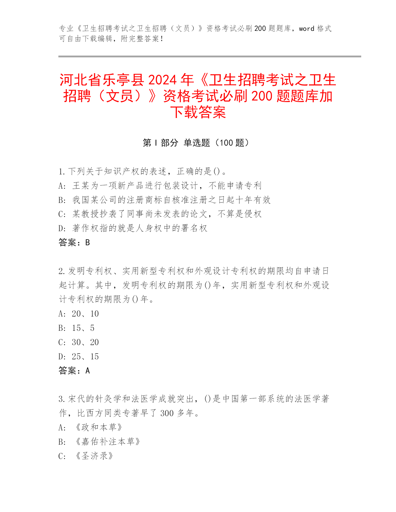 河北省乐亭县2024年《卫生招聘考试之卫生招聘(文员)》资格考试必刷200题题库加下载答案