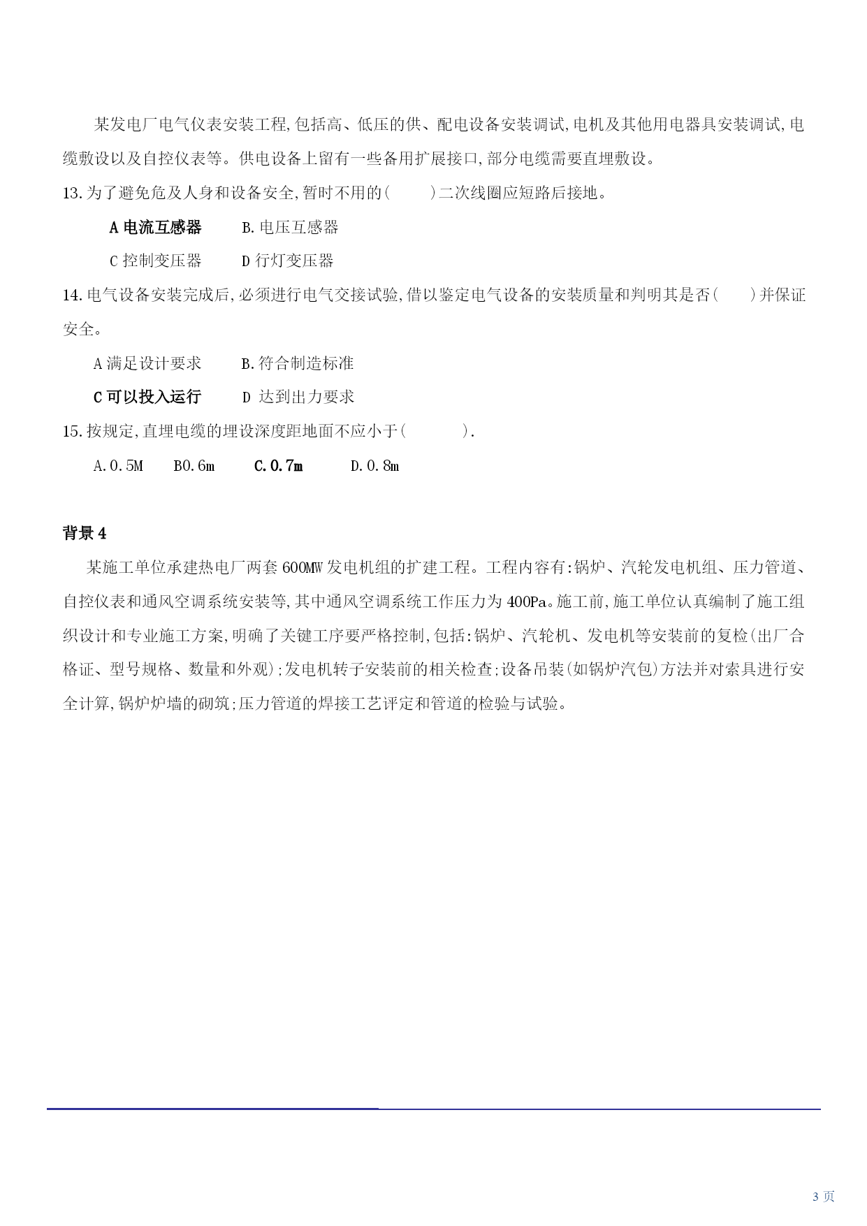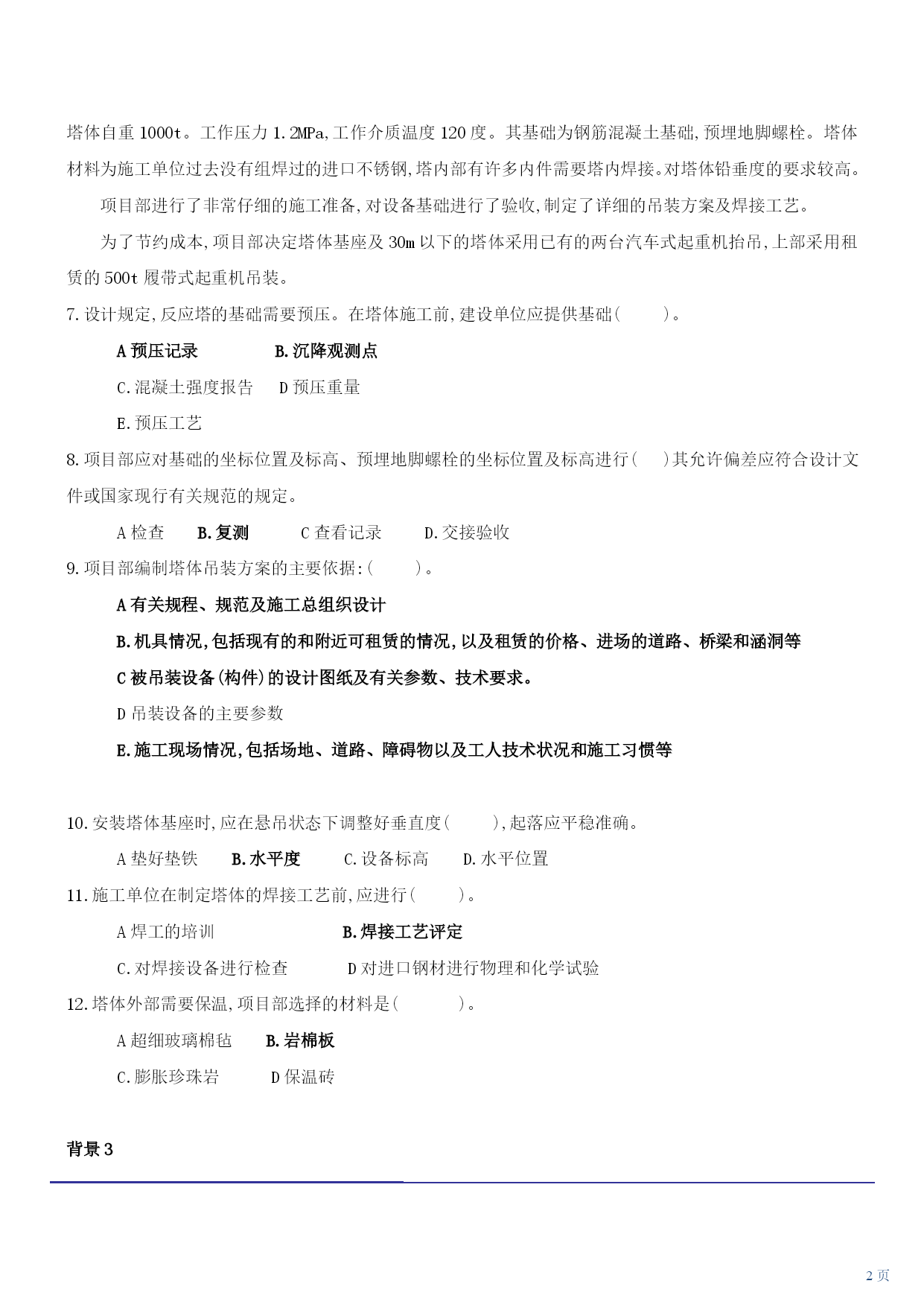 HYPERLINK"http://www.edu24ol.com/"\t"_self"页全国二级建造师执业资格考试命题预测试卷及详解机电工程管理与实务一、选择题(请根据背景选择正确的答案,单项选择题每题1分,每题4个备选项中,只有1个最符合题意。多项选择题每题2分,每题5个备选项中,有2个或者2个以上符合题意,至少1个错项;错选,本题不得分;少选,所选的每个选项得0。5分)背景1A公司承包一个大型商业中心的机电工程。将其中的消防工程和建筑智能化工程分包给B公司安装。商业中心的土建和装饰工程由C公司总承包。建筑智能化设备的供应商已由建设单位选定,建筑智能化系统的深化设计已由设备供应商完成。B公司施工的消防工程已按设计图纸全部安装完成,消防工程经验收后,进入工程移交程序,准备投入使用。1.B公司承包商业中心的智能化工程施工主要内容有()。A深化设计B.供应商选择C.工程实施D系统检测2.本背景中的消防工程验收后,办理工程实体移交手续,以明确工程的()。A检修保养B.检查整改C.施工保修D维护保管3.本工程的智能化系统工程安装完成后的检测,可以按()。A设计要求B.规范要求C.标准要求D产品要求4.背景中的门禁系统是采用()电控锁。A钥匙B.IC卡C密码D指纹5.商业中心设备监控系统设备安装完成后,B公司要对()进行现场测试。A建筑设备B.传感器C.执行器D控制器E.系统功能6.安全防范系统包括()。A门禁系统B.入侵报警系统C.电视监视系统D巡更系统E.停车管理系统背景2某机电安装公司承包了一反应塔的现场组焊安装任务。塔高70m,下部直径12000mm,上部直径6500mm。塔体自重l000t。工作压力1.2MPa,工作介质温度120度。其基础为钢筋混凝土基础,预埋地脚螺栓。塔体材料为施工单位过去没有组焊过的进口不锈钢,塔内部有许多内件需要塔内焊接。对塔体铅垂度的要求较高。项目部进行了非常仔细的施工准备,对设备基础进行了验收,制定了详细的吊装方案及焊接工艺。为了节约成本,项目部决定塔体基座及30m以下的塔体采用已有的两台汽车式起重机抬吊,上部采用租赁的500t履带式起重机吊装。7.设计规定,反应塔的基础需要预压。在塔体施工前,建设单位应提供基础()。A预压记录B.沉降观测点C.混凝土强度报告D预压重量E.预压工艺8.项目部应对基础的坐标位置及标高、预埋地脚螺栓的坐标位置及标高进行()其允许偏差应符合设计文件或国家现行有关规范的规定。A检查B.复测C查看记录D.交接验收9.项目部编制塔体吊装方案的主要依据:()。A有关规程、规范及施工总组织设计B.机具情况,包括现有的和附近可租赁的情况,以及租赁的价格、进场的道路、桥梁和涵洞等C被吊装设备(构件)的设计图纸及有关参数、技术要求。D吊装设备的主要参数E.施工现场情况,包括场地、道路、障碍物以及工人技术状况和施工习惯等10.安装塔体基座时,应在悬吊状态下调整好垂直度(),起落应平稳准确。A垫好垫铁B.水平度C.设备标高D.水平位置11.施工单位在制定塔体的焊接工艺前,应进行()。A焊工的培训B.焊接工艺评定C.对焊接设备进行检查D对进口钢材进行物理和化学试验12.塔体外部需要保温,项目部选择的材料是()。A超细玻璃棉毡B.岩棉板C.膨胀珍珠岩D保温砖背景3某发电厂电气仪表安装工程,包括高、低压的供、配电设备安装调试,电机及其他用电器具安装调试,电缆敷设以及自控仪表等。供电设备上留有一些备用扩展接口,部分电缆需要直埋敷设。13.为了避免危及人身和设备安全,暂时不用的()二次线圈应短路后接地。A电流互感器B.电压互感器C控制变压器D行灯变压器14.电气设备安装完成后,必须进行电气交接试验,借以鉴定电气设备的安装质量和判明其是否()并保证安全。A满足设计要求B.符合制造标准C可以投入运行D达到出力要求15.按规定,直埋电缆的埋设深度距地面不应小于().A.0.5MB0.6mC.0.7mD.0.8m背景4某施工单位承建热电厂两套600MW发电机组的扩建工程。工程内容有:锅炉、汽轮发电机组、压力管道、自控仪表和通风空调系统安装等,其中通风空调系统工作压力为400Pa。施工前,施工单位认真编制了施工组织设计和专业施工方案,明确了关键工序要严格控制,包括:锅炉、汽轮机、发电机等安装前的复检(出厂合格证、型号规格、数量和外观);发电机转子安装前的相关检查;设备吊装(如锅炉汽包)方法并对索具进行安全计算,锅炉炉墙的砌筑;压力管道的焊接工艺评定和管道的检验与试验。