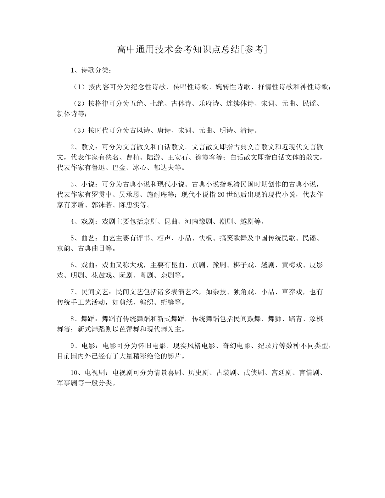 高中通用技术会考知识点总结[参考]1、诗歌分类:(1)按内容可分为纪念性诗歌、传唱性诗歌、婉转性诗歌、抒情性诗歌和神性诗歌;(2)按格律可分为五绝、七绝、古体诗、乐府诗、连续体诗、宋词、元曲、民谣、新体诗等;(3)按时代可分为古风诗、唐诗、宋词、元曲、明诗、清诗。2、散文:可分为文言散文和白话散文。文言散文即指古典文言散文和近现代文言散文,代表作家有佚名、曹植、陆游、王安石、徐霞客等;白话散文即指白话文体的散文,代表作家有鲁迅、巴金、冰心、郁达夫等。3、小说:可分为古典小说和现代小说。古典小说指晚清民国时期创作的古典小说,代表作家有罗贯中、吴承恩、施耐庵等;现代小说指20世纪后出现的现代小说,代表作家有茅盾、郭沫若、陈忠实等。4、戏剧:戏剧主要包括京剧、昆曲、河南豫剧、潮剧、越剧等。5、曲艺:曲艺主要有评书、相声、小品、快板、搞笑歌舞及中国传统民歌、民谣、京韵、古典曲目等。6、戏曲:戏曲又称大戏,主要有昆曲、京剧、豫剧、梆子戏、越剧、黄梅戏、皮影戏、明剧、花鼓戏、阮剧、粤剧、杂剧等。7、民间文艺:民间文艺包括诸多表演艺术,如杂技、独角戏、小品、草莽戏,也有传统手工艺活动,如剪纸、编织、绗缝等。8、舞蹈:舞蹈有传统舞蹈和新式舞蹈。传统舞蹈包括民间鼓舞、舞狮、踏青、象棋舞等;新式舞蹈则以芭蕾舞和现代舞为主。9、电影:电影可分为怀旧电影、现实风格电影、奇幻电影、纪录片等数种不同类型,目前国内外已经有了大量精彩绝伦的影片。10、电视剧:电视剧可分为情景喜剧、历史剧、古装剧、武侠剧、宫廷剧、言情剧、军事剧等一般分类。
