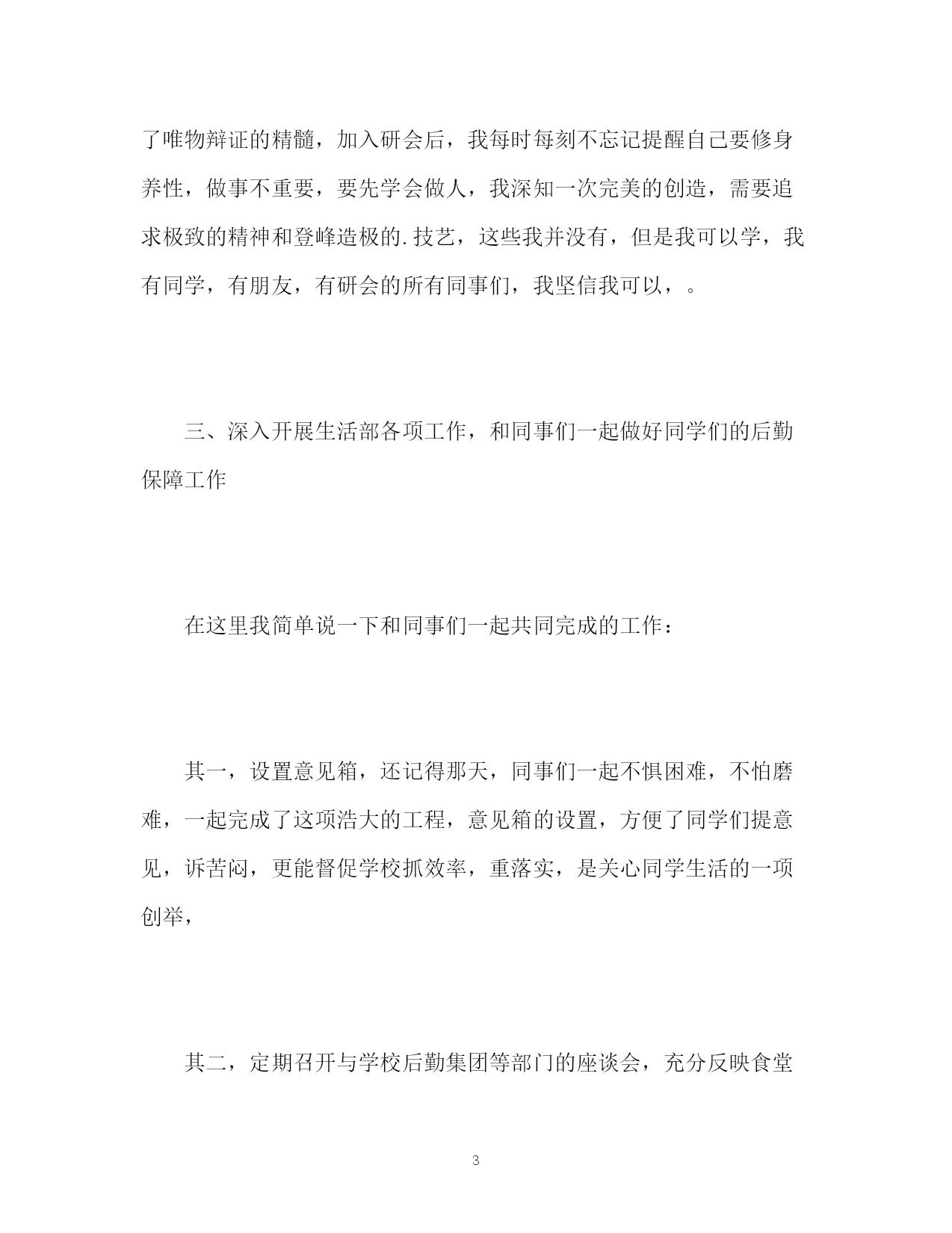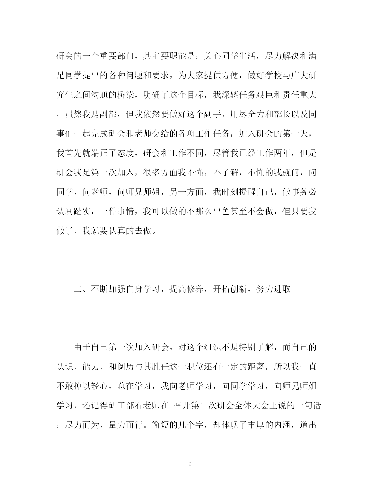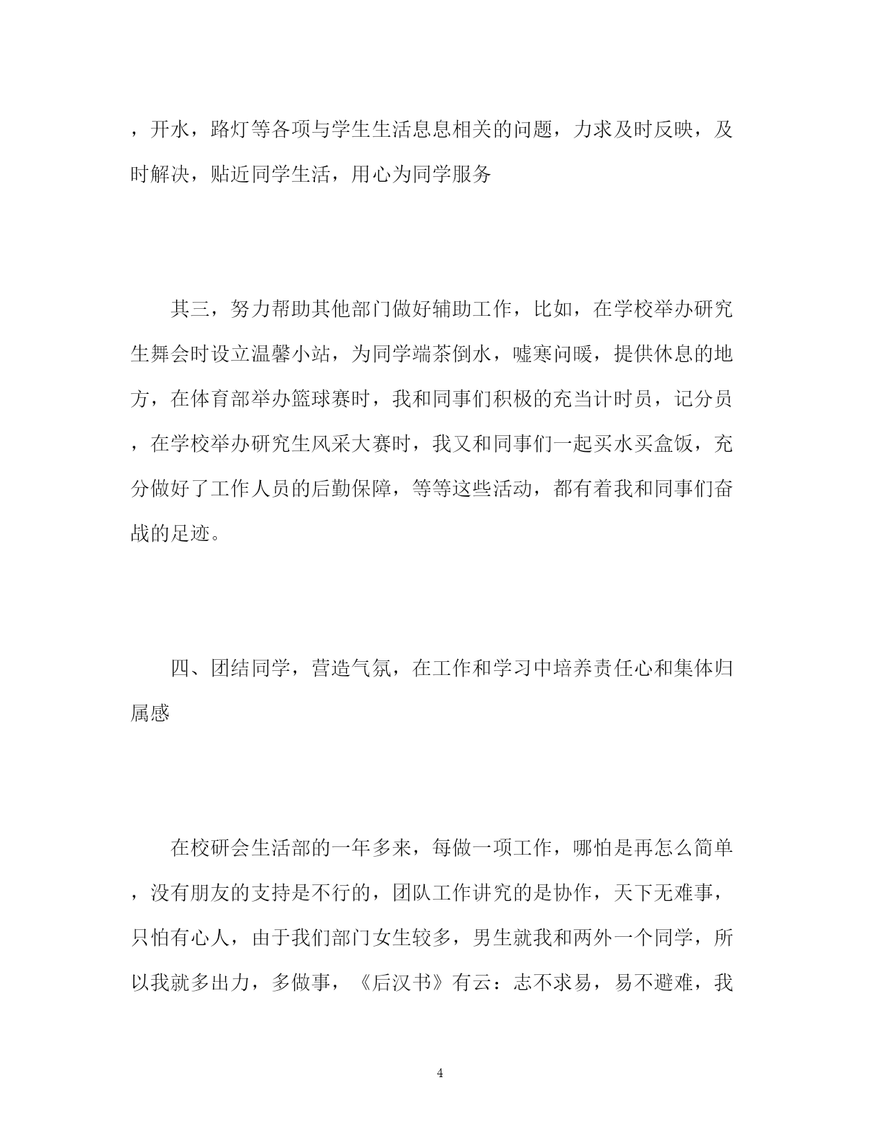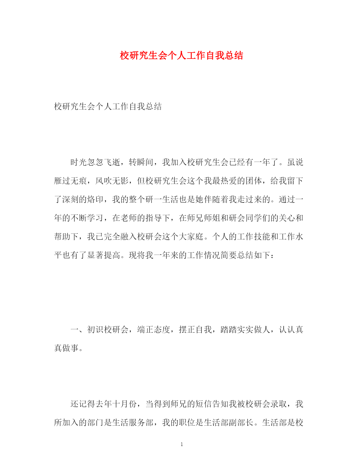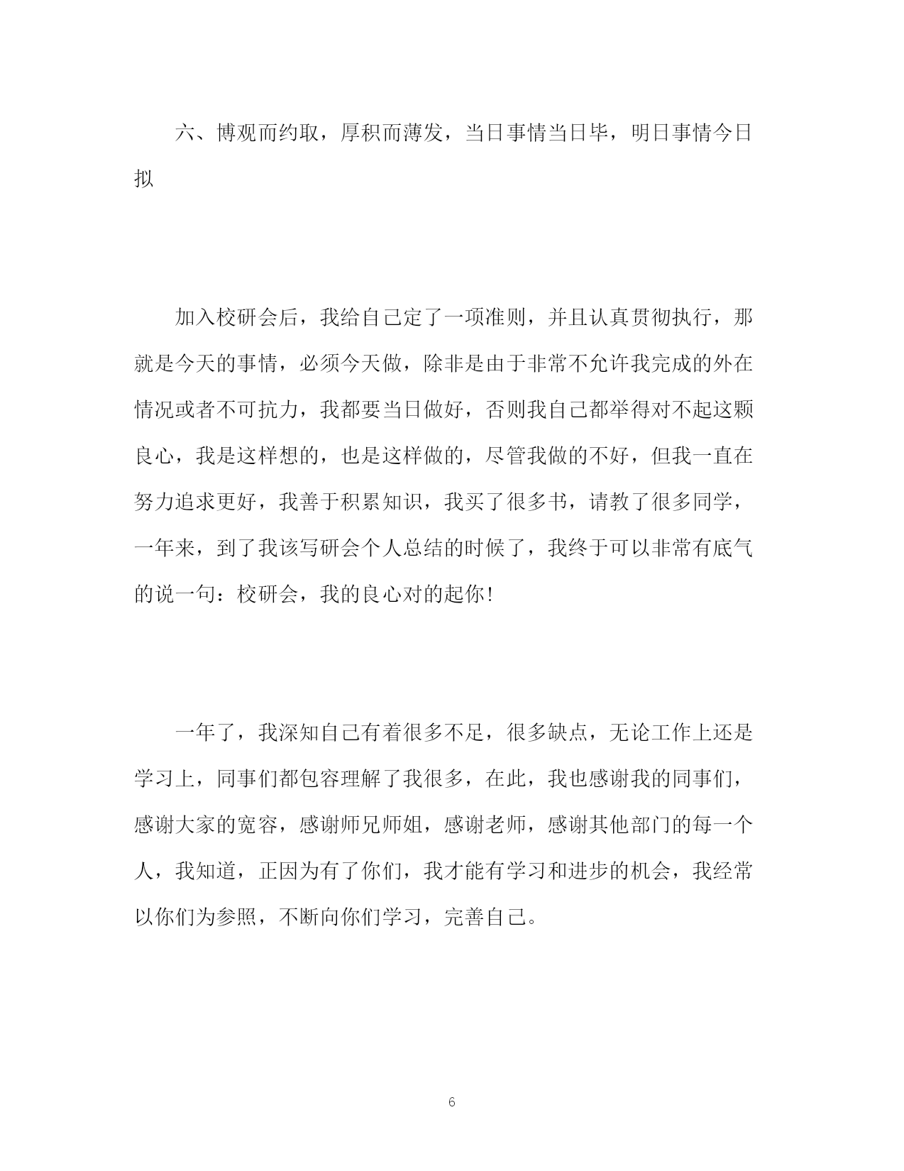 此资料由网络收集而来,如有侵权请告知上传者立即删除。资料共分享,我们负责传递知识。PAGEPAGE6校研究生会个人工作自我总结校研究生会个人工作自我总结时光忽忽飞逝,转瞬间,我加入校研究生会已经有一年了。虽说雁过无痕,风吹无影,但校研究生会这个我最热爱的团体,给我留下了深刻的烙印,我的整个研一生活也是她伴随着我走过来的。通过一年的不断学习,在老师的指导下,在师兄师姐和研会同学们的关心和帮助下,我已完全融入校研会这个大家庭。个人的工作技能和工作水平也有了显著提高。现将我一年来的工作情况简要总结如下:一、初识校研会,端正态度,摆正自我,踏踏实实做人,认认真真做事。还记得去年十月份,当得到师兄的短信告知我被校研会录取,我所加入的部门是生活服务部,我的职位是生活部副部长。生活部是校研会的一个重要部门,其主要职能是:关心同学生活,尽力解决和满足同学提出的各种问题和要求,为大家提供方便,做好学校与广大研究生之间沟通的桥梁,明确了这个目标,我深感任务艰巨和责任重大,虽然我是副部,但我依然要做好这个副手,用尽全力和部长以及同事们一起完成研会和老师交给的各项工作任务,加入研会的第一天,我首先就端正了态度,研会和工作不同,尽管我已经工作两年,但是研会我是第一次加入,很多方面我不懂,不了解,不懂的我就问,问同学,问老师,问师兄师姐,另一方面,我时刻提醒自己,做事务必认真踏实,一件事情,我可以做的不那么出色甚至不会做,但只要我做了,我就要认真的去做。二、不断加强自身学习,提高修养,开拓创新,努力进取由于自己第一次加入研会,对这个组织不是特别了解,而自己的认识,能力,和阅历与其胜任这一职位还有一定的距离,所以我一直不敢掉以轻心,总在学习,我向老师学习,向同学学习,向师兄师姐学习,还记得研工部石老师在召开第二次研会全体大会上说的一句话:尽力而为,量力而行。简短的几个字,却体现了丰厚的内涵,道出了唯物辩证的精髓,加入研会后,我每时每刻不忘记提醒自己要修身养性,做事不重要,要先学会做人,我深知一次完美的创造,需要追求极致的精神和登峰造极的.技艺,这些我并没有,但是我可以学,我有同学,有朋友,有研会的所有同事们,我坚信我可以,。三、深入开展生活部各项工作,和同事们一起做好同学们的后勤保障工作在这里我简单说一下和同事们一起共同完成的工作:其一,设置意见箱,还记得那天,同事们一起不惧困难,不怕磨难,一起完成了这项浩大的工程,意见箱的设置,方便了同学们提意见,诉苦闷,更能督促学校抓效率,重落实,是关心同学生活的一项创举,其二,定期召开与学校后勤集团等部门的座谈会,充分反映食堂,开水,路灯等各项与学生生活息息相关的问题,力求及时反映,及时解决,贴近同学生活,用心为同学服务其三,努力帮助其他部门做好辅助工作,比如,在学校举办研究生舞会时设立温馨小站,为同学端茶倒水,嘘寒问暖,提供休息的地方,在体育部举办篮球赛时,我和同事们积极的充当计时员,记分员,在学校举办研究生风采大赛时,我又和同事们一起买水买盒饭,充分做好了工作人员的后勤保障,等等这些活动,都有着我和同事们奋战的足迹。四、团结同学,营造气氛,在工作和学习中培养责任心和集体归属感在校研会生活部的一年多来,每做一项工作,哪怕是再怎么简单,没有朋友的支持是不行的,团队工作讲究的是协作,天下无难事,只怕有心人,由于我们部门女生较多,男生就我和两外一个同学,所以我就多出力,多做事,《后汉书》有云:志不求易,易不避难,我时常想,无论多么艰难的事情,只要大家都出一份力,献一份策,都会迎刃而解,我相信集体的力量是无穷大的,在一起工作的过程中,我注意和各位同学沟通协作,完成了任务,又培养了感情,工作做完了就没有了,但是同学之间情会源远流长。五、勤以治事,恕以待人,讲守仁义,谦虚谨慎,用事实和行动证明自己的存在无论在哪里,无论做什么,无论我扮演什么角色,我都觉得志向很重要,志向是对某种价值目标追求的宏愿,决心,和坚定的信念。不管是我还是研会的其他同学,当初加入研会,我觉得至少都是有志向的,那就是想学习,想进步,想求知,想做事,既然来了,那就认真到底,这是我一直对自己说的,成事成人者,志向必须坚定不移,回想这一年多来,我正是坚定了这一在研会的志向,才能稳定的连贯的成为我持续前进的动力,风风雨雨都不惧,更不怕遇到苦难和挫折,我深信,只要我能够坚持,这些都是小事。六、博观而约取,厚积而薄发,当日事情当日毕,明日事情今日拟加入校研会后,我给自己定了一项准则,并且认真贯彻执行,那就是今天的事情,必须今天做,除非是由于非常不允许我完成的外在情况或者不可抗力,我都要当日做好,否则我自己都举得对不起这颗良心,我是这样想的,也是这