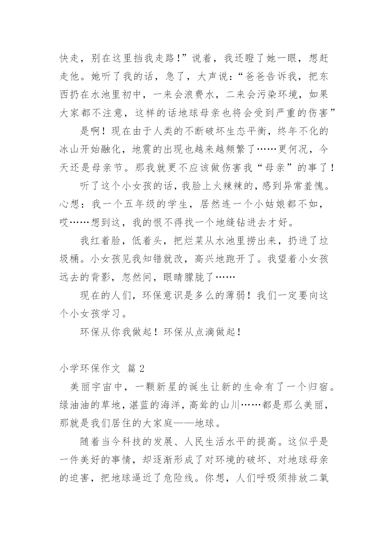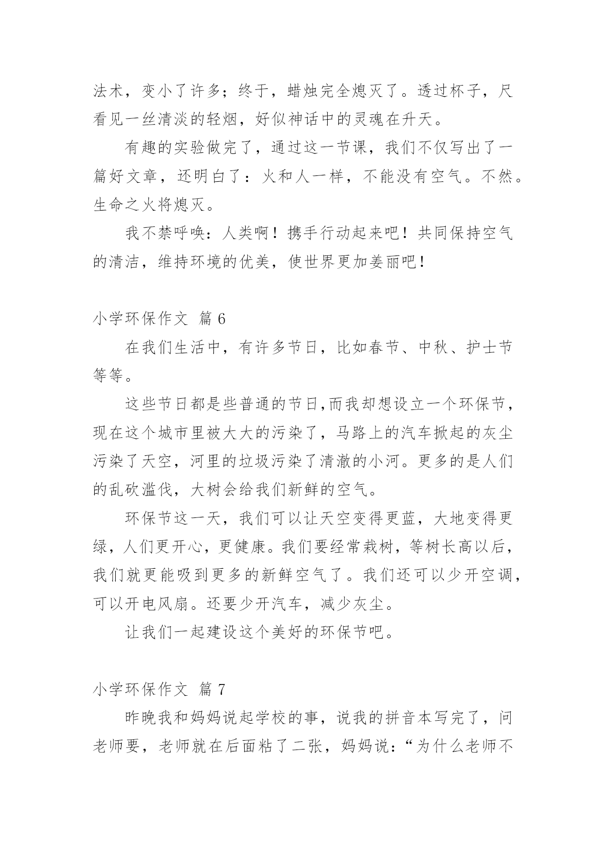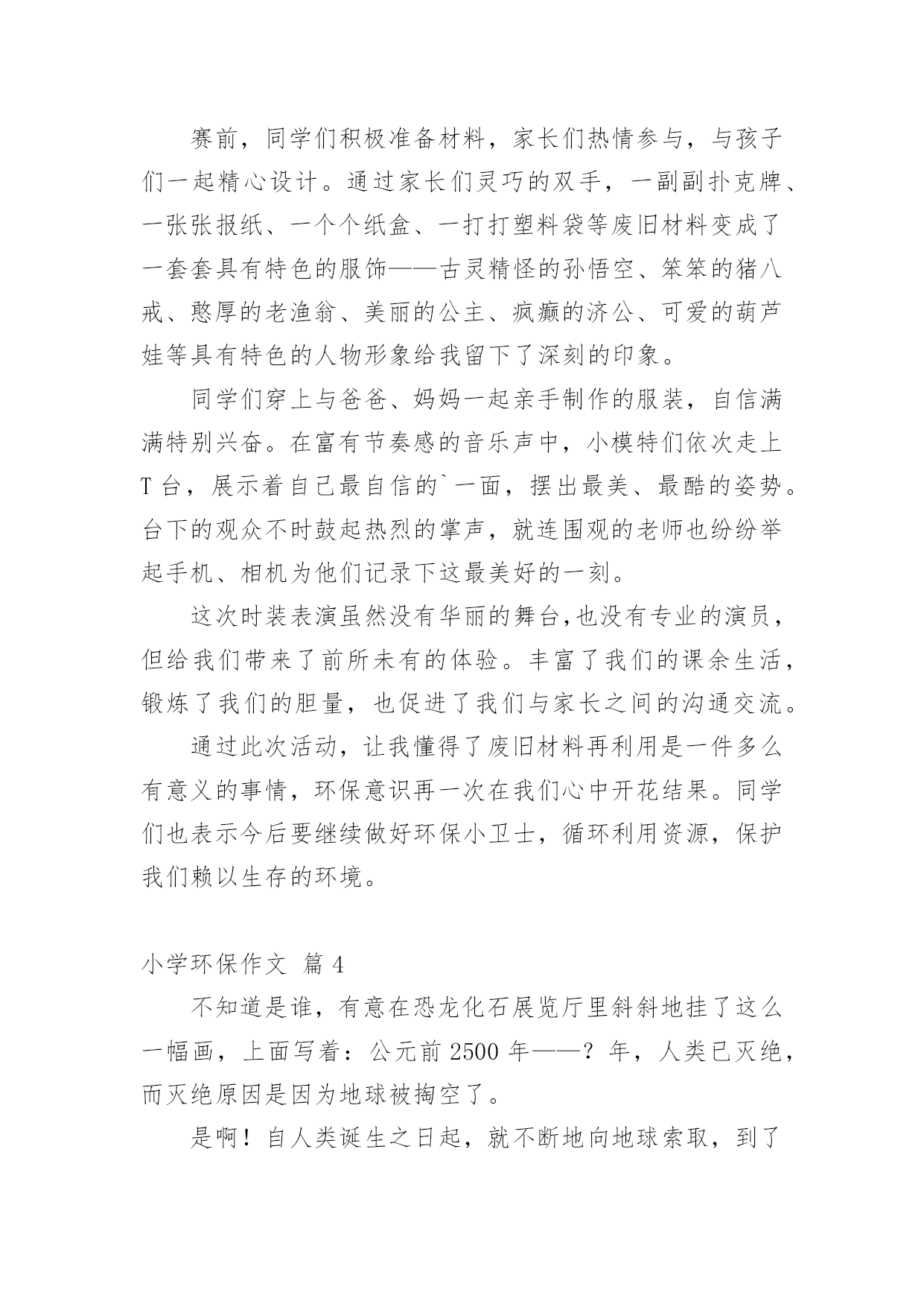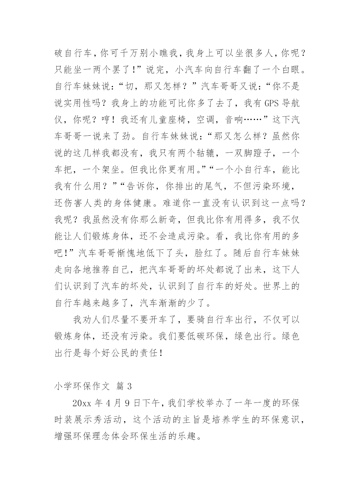 小学环保作文关于小学环保作文九篇在平时的学习、工作或生活中,大家都跟作文打过交道吧,写作文可以锻炼我们的独处习惯,让自己的心静下来,思考自己未来的方向。作文的注意事项有许多,你确定会写吗?下面是小编帮大家整理的小学环保作文9篇,欢迎大家分享。小学环保作文篇1大家都知道,地球是人类共同生存的大花园.可如今有许多人不断在做着伤害她的事情。而我,今天就做了一件,请大家听我细细道来。今天是母亲节,我决定帮妈妈做一些家务。于是,妈妈就安排我去洗菜。我提着一篮菜来到了水池边,拧开水龙头,开始洗菜了。洗菜时,我发现有好几棵菜都生了虫子,烂了。我没注意,随手一扔,都丢在了水池中。正当我洗完菜准备回家时,身边响起了一个小女孩的声音:“小姐姐,请你不要将烂菜扔在水池里,会把下水孔堵住的。”我看了她一眼,从鼻子里哼出了一声,说:“你这个小丫头,不要多管闲事,小心我……”说着,我还向她挥了挥拳头。本以为能吓跑她,没想到她居然又回了一句:“这不是多管闲事,这是保护地球母亲!”这下子,我可火了,对她大声吼起来:“不是多管闲事又怎样?反正不要你管!快走,别在这里挡我走路!”说着,我还瞪了她一眼,想赶走他。她听了我的话,急了,大声说:“爸爸告诉我,把东西扔在水池里初中,一来会浪费水,二来会污染环境,如果大家都不注意,这样的话地球母亲也将会受到严重的伤害”是啊!现在由于人类的不断破坏生态平衡,终年不化的冰山开始融化,地震的出现也越来越频繁了……更何况,今天还是母亲节。那我就更不应该做伤害我“母亲”的事了!听了这个小女孩的话,我脸上火辣辣的,感到异常羞愧。心想:我一个五年级的学生,居然连一个小姑娘都不如,哎……想到这,我的恨不得找一个地缝钻进去才好。我红着脸,低着头,把烂菜从水池里捞出来,扔进了垃圾桶。小女孩见我知错就改,高兴地跑开了。我望着小女孩远去的背影,忽然间,眼睛朦胧了……现在的人们,环保意识是多么的薄弱!我们一定要向这个小女孩学习。环保从你我做起!环保从点滴做起!小学环保作文篇2美丽宇宙中,一颗新星的诞生让新的生命有了一个归宿。绿油油的草地,湛蓝的海洋,高耸的山川……都是那么美丽,那就是我们居住的大家庭——地球。随着当今科技的发展、人民生活水平的提高。这似乎是一件美好的事情,却逐渐形成了对环境的破坏、对地球母亲的迫害,把地球逼近了危险线。你想,人们呼吸须排放二氧化碳,工作、生活都离不开石油,也都须排放二氧化碳。而又伴随人口增多,汽车增加,碳排量远远超出了我们想象的范围,而这一点点稀薄的空气哪里够呀!总不可能,让汽车排出来的是蒸汽,让我们吐出的是有利于空气的气体吧?而现在能控制碳排量的森林也被破坏得仅存无几。世界上百分之八十的原始森林已经荡然无存了。森林正以每天三百七十五平方千米的速度消失,人们大量砍伐树木,毫不考虑后果。所以,我们应该低碳生活、绿色出行。平时出行尽量步行,多骑自行车,多乘坐公交车和地铁,少开私家车;少用一次性的东西;开电脑或是电视的时间都不要太长,大约几小时就关掉;用短的铅笔,做一个笔套,套在上面,可以接着用;随手关灯,随手关水龙头;每天的淘米水可以用来洗手擦家具,干净卫生,自然滋润;出门购物,自己带环保袋,无论是免费或者收费的塑料袋,都减少使用等。如果,人人都可以这样低碳环保、绿色出行,那地球该是多么美好!低碳环保,绿色出行现在街上的汽车越来越多,自行车越来越少。原因是什么呢?在车库里自行车妹妹和小汽车哥哥在黑暗中吵了起来,汽车哥哥说:“哼,瞧你那寒酸的样子谁还骑你呀!现在人们都用汽车出行了,你out了!哈哈哈……”自行车妹妹反驳说:“哼,就算out又怎样?你们汽车虽然好看,但没有实用性那又有什么用呢?”汽车哥哥答道:“哼,寒酸的小破自行车,你可千万别小瞧我,我身上可以坐很多人,你呢?只能坐一两个罢了!”说完,小汽车向自行车翻了一个白眼。自行车妹妹说:“切,那又怎样?”汽车哥哥又说:“你不是说实用性吗?我身上的功能可比你多了去了,我有GPS导航仪,你呢?哼!我还有儿童座椅,空调,音响……”这下汽车哥哥一说来了劲。自行车妹妹说:“那又怎么样?虽然你说的这几样我都没有,我只有两个轱辘,一双脚蹬子,一个车把,一个架坐。但我比你更有用。”“一个小自行车,能比我有什么用?”“告诉你,你排出的尾气,不但污染环境,还伤害人类的身体健康。难道你一直没有认识到这一点吗?我呢?我虽然没有你那么新奇,但我比你有用得多,我不仅能让人们锻炼身体,还不会造成污染。看,我比你有用的多吧!”汽车哥哥惭愧地低下了头,脸红了。随后自行车妹妹走向各地推荐自己,把汽车哥哥的坏处都说了出来,这下人们认识到了汽车的坏处,认识到了自行车的好处。世界上的自行车越来越多了,汽车渐渐的少了。我劝人们尽量不要开车了,要骑自行车出行,不仅可以锻炼身体,还没有污染。我们要低碳环保,绿色出