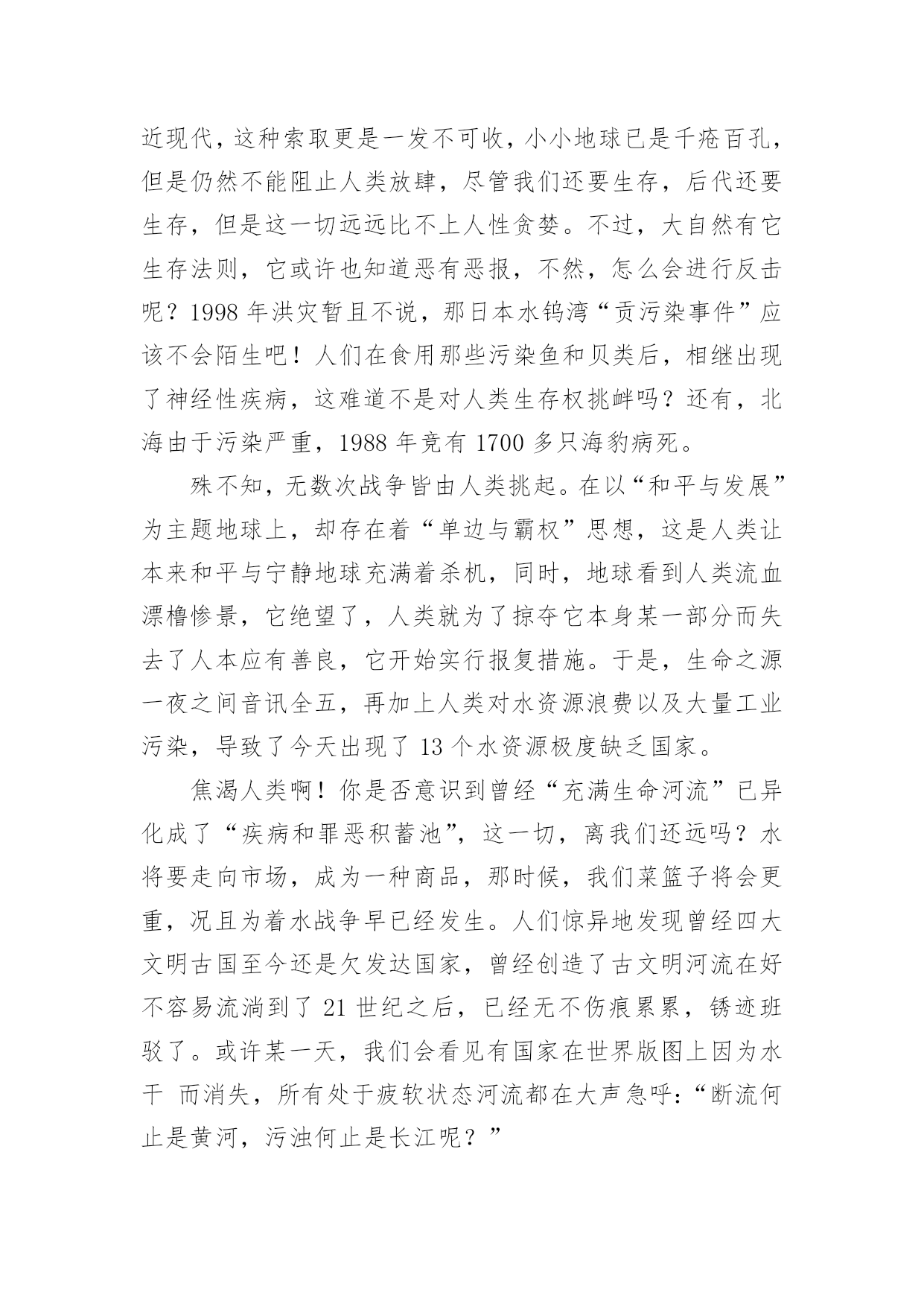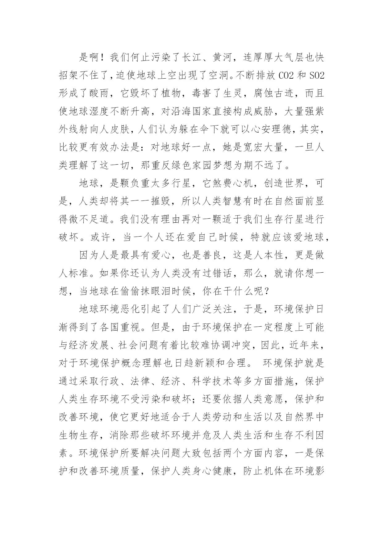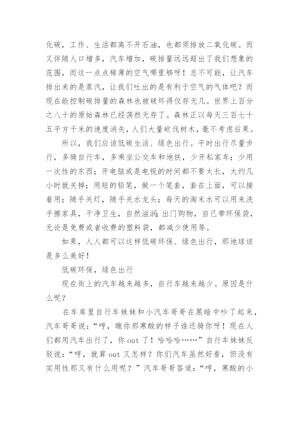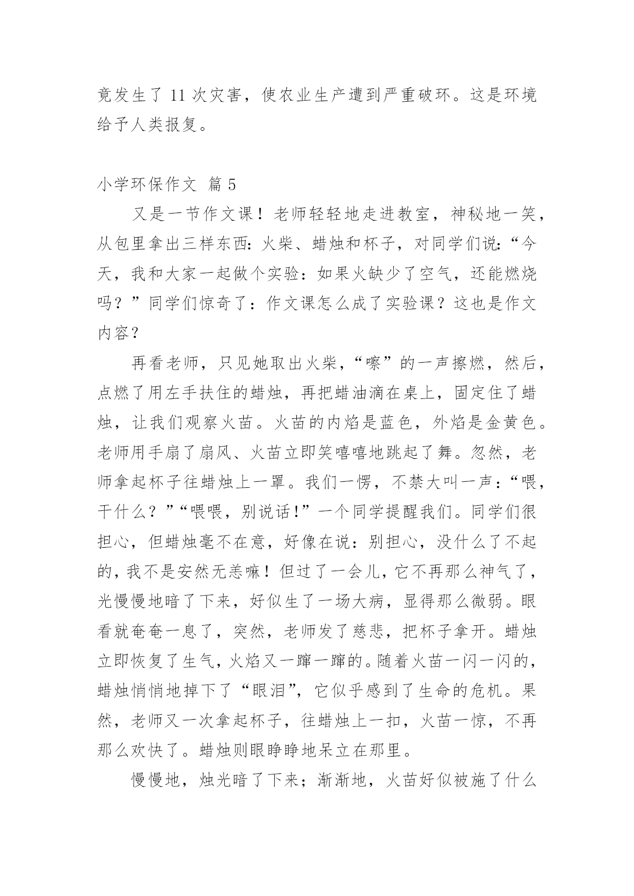 小学环保作文关于小学环保作文九篇在平时的学习、工作或生活中,大家都跟作文打过交道吧,写作文可以锻炼我们的独处习惯,让自己的心静下来,思考自己未来的方向。作文的注意事项有许多,你确定会写吗?下面是小编帮大家整理的小学环保作文9篇,欢迎大家分享。小学环保作文篇1大家都知道,地球是人类共同生存的大花园.可如今有许多人不断在做着伤害她的事情。而我,今天就做了一件,请大家听我细细道来。今天是母亲节,我决定帮妈妈做一些家务。于是,妈妈就安排我去洗菜。我提着一篮菜来到了水池边,拧开水龙头,开始洗菜了。洗菜时,我发现有好几棵菜都生了虫子,烂了。我没注意,随手一扔,都丢在了水池中。正当我洗完菜准备回家时,身边响起了一个小女孩的声音:“小姐姐,请你不要将烂菜扔在水池里,会把下水孔堵住的。”我看了她一眼,从鼻子里哼出了一声,说:“你这个小丫头,不要多管闲事,小心我……”说着,我还向她挥了挥拳头。本以为能吓跑她,没想到她居然又回了一句:“这不是多管闲事,这是保护地球母亲!”这下子,我可火了,对她大声吼起来:“不是多管闲事又怎样?反正不要你管!快走,别在这里挡我走路!”说着,我还瞪了她一眼,想赶走他。她听了我的话,急了,大声说:“爸爸告诉我,把东西扔在水池里初中,一来会浪费水,二来会污染环境,如果大家都不注意,这样的话地球母亲也将会受到严重的伤害”是啊!现在由于人类的不断破坏生态平衡,终年不化的冰山开始融化,地震的出现也越来越频繁了……更何况,今天还是母亲节。那我就更不应该做伤害我“母亲”的事了!听了这个小女孩的话,我脸上火辣辣的,感到异常羞愧。心想:我一个五年级的学生,居然连一个小姑娘都不如,哎……想到这,我的恨不得找一个地缝钻进去才好。我红着脸,低着头,把烂菜从水池里捞出来,扔进了垃圾桶。小女孩见我知错就改,高兴地跑开了。我望着小女孩远去的背影,忽然间,眼睛朦胧了……现在的人们,环保意识是多么的薄弱!我们一定要向这个小女孩学习。环保从你我做起!环保从点滴做起!小学环保作文篇2美丽宇宙中,一颗新星的诞生让新的生命有了一个归宿。绿油油的草地,湛蓝的海洋,高耸的山川……都是那么美丽,那就是我们居住的大家庭——地球。随着当今科技的发展、人民生活水平的提高。这似乎是一件美好的事情,却逐渐形成了对环境的破坏、对地球母亲的迫害,把地球逼近了危险线。你想,人们呼吸须排放二氧化碳,工作、生活都离不开石油,也都须排放二氧化碳。而又伴随人口增多,汽车增加,碳排量远远超出了我们想象的范围,而这一点点稀薄的空气哪里够呀!总不可能,让汽车排出来的是蒸汽,让我们吐出的是有利于空气的气体吧?而现在能控制碳排量的森林也被破坏得仅存无几。世界上百分之八十的原始森林已经荡然无存了。森林正以每天三百七十五平方千米的速度消失,人们大量砍伐树木,毫不考虑后果。所以,我们应该低碳生活、绿色出行。平时出行尽量步行,多骑自行车,多乘坐公交车和地铁,少开私家车;少用一次性的东西;开电脑或是电视的时间都不要太长,大约几小时就关掉;用短的铅笔,做一个笔套,套在上面,可以接着用;随手关灯,随手关水龙头;每天的淘米水可以用来洗手擦家具,干净卫生,自然滋润;出门购物,自己带环保袋,无论是免费或者收费的塑料袋,都减少使用等。如果,人人都可以这样低碳环保、绿色出行,那地球该是多么美好!低碳环保,绿色出行现在街上的汽车越来越多,自行车越来越少。原因是什么呢?在车库里自行车妹妹和小汽车哥哥在黑暗中吵了起来,汽车哥哥说:“哼,瞧你那寒酸的样子谁还骑你呀!现在人们都用汽车出行了,你out了!哈哈哈……”自行车妹妹反驳说:“哼,就算out又怎样?你们汽车虽然好看,但没有实用性那又有什么用呢?”汽车哥哥答道:“哼,寒酸的小破自行车,你可千万别小瞧我,我身上可以坐很多人,你呢?只能坐一两个罢了!”说完,小汽车向自行车翻了一个白眼。自行车妹妹说:“切,那又怎样?”汽车哥哥又说:“你不是说实用性吗?我身上的功能可比你多了去了,我有GPS导航仪,你呢?哼!我还有儿童座椅,空调,音响……”这下汽车哥哥一说来了劲。自行车妹妹说:“那又怎么样?虽然你说的这几样我都没有,我只有两个轱辘,一双脚蹬子,一个车把,一个架坐。但我比你更有用。”“一个小自行车,能比我有什么用?”“告诉你,你排出的尾气,不但污染环境,还伤害人类的身体健康。难道你一直没有认识到这一点吗?我呢?我虽然没有你那么新奇,但我比你有用得多,我不仅能让人们锻炼身体,还不会造成污染。看,我比你有用的多吧!”汽车哥哥惭愧地低下了头,脸红了。随后自行车妹妹走向各地推荐自己,把汽车哥哥的坏处都说了出来,这下人们认识到了汽车的坏处,认识到了自行车的好处。世界上的自行车越来越多了,汽车渐渐的少了。我劝人们尽量不要开车了,要骑自行车出行,不仅可以锻炼身体,还没有污染。我们要低碳环保,绿色出