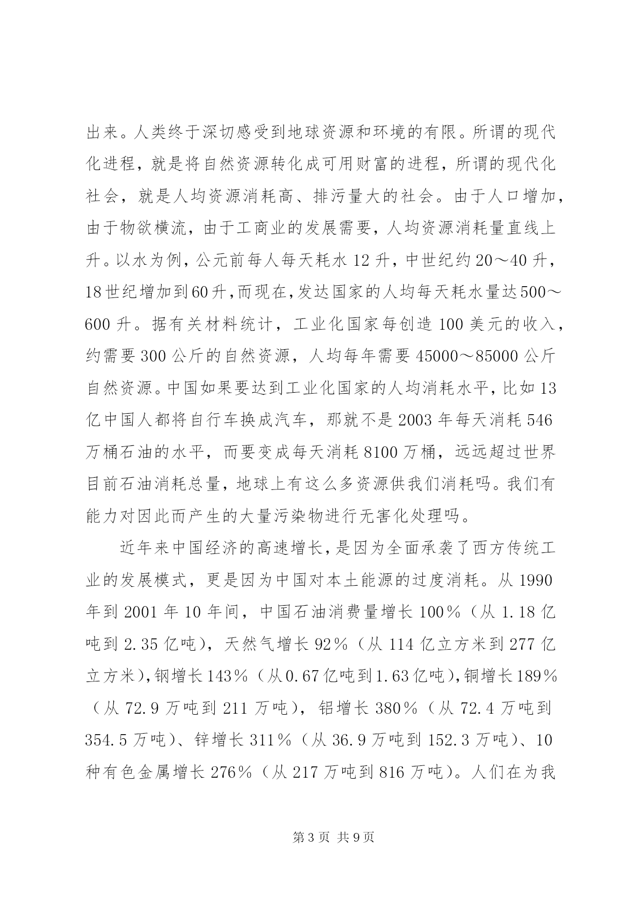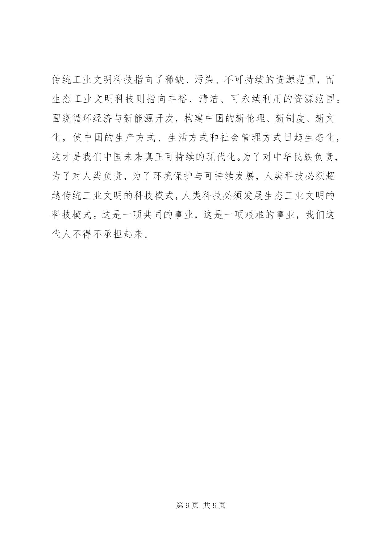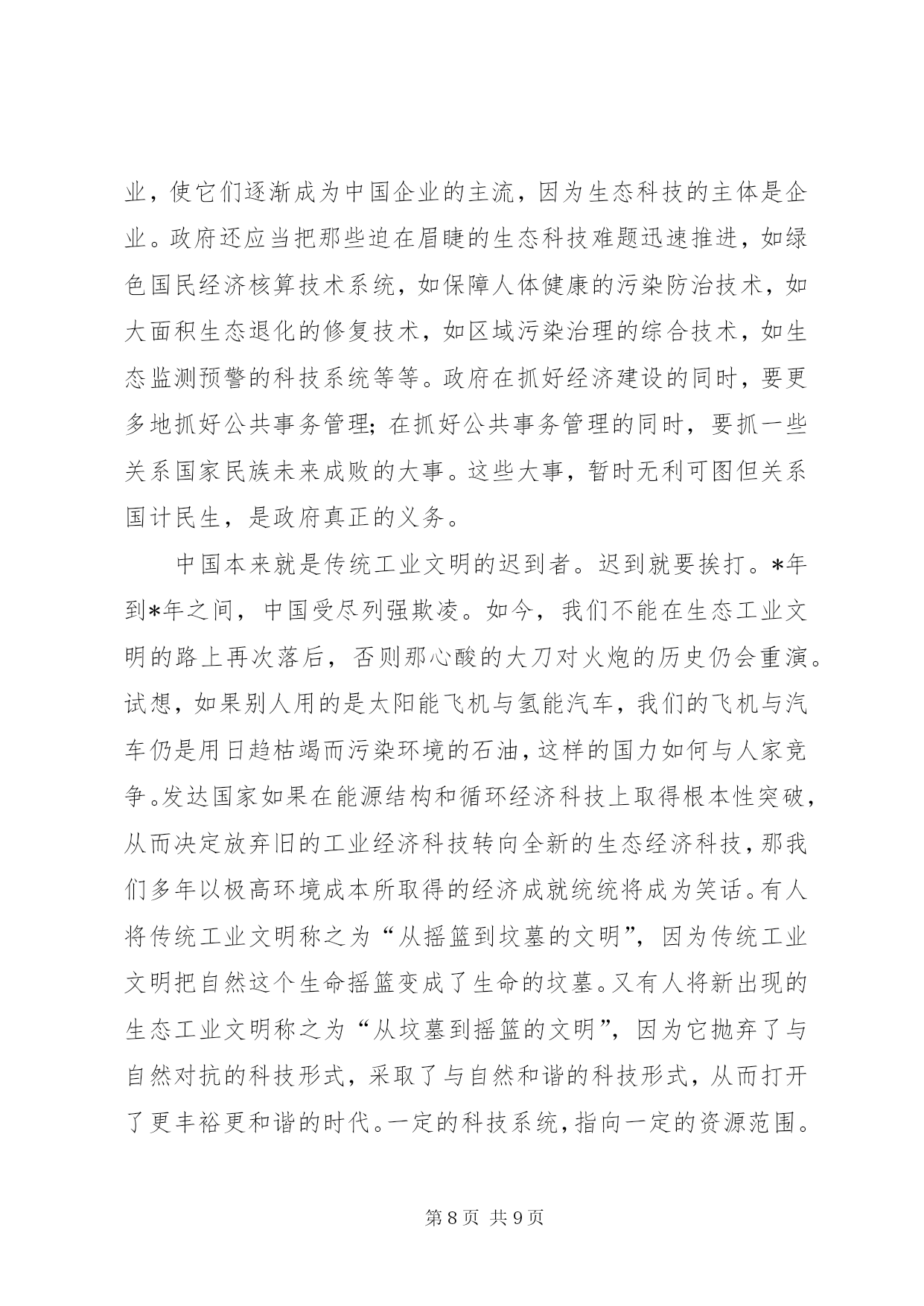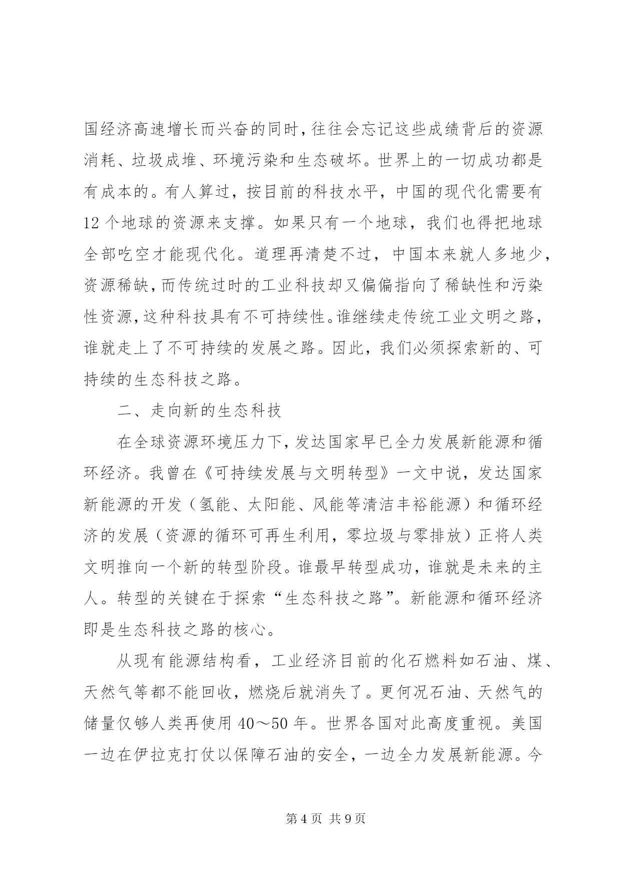 第PAGE\*Arabic\*MERGEFORMAT9页共NUMPAGES\*MERGEFORMAT9页环保与科技整改措施一、超越传统工业科技人类有别于其他动物的特征之一,就是人类能创造和使用工具,还能用特殊的文字符号去解释自然。就是说,人类比其他动物更具有一种科技能力。借助这种能力,人类才能创造出大自然中本不存在的东西———人类文明。科技在不断演化,人类文明也在不断演化。一万年前,在人口资源的压力下,人类由渔猎采集文明向传统农耕文明转型。传统农耕文明经历过两个阶段,第一个阶段是青铜时代,中国的商朝和西周王朝属青铜时代。第二个阶段是黑铁时代,春秋战国时期属黑铁时代。随着铁冶炼和铸造技术的普及,传统的意识形态和社会制度因适应不了新生产力的要求而开始崩溃。直到秦王朝于公元前221年统一中国,一个“铁农具+小农经济+君主官僚制+儒道法意识形态”的中华文明得以成型。农耕文明一万年以来虽有各种自然灾害和战争,但人类总的来说是稳定和安全的,因为当时的科技主流顺应了自然法则。传统的农耕文明对自然资源的利用能力是有限的,对大自然具有很强的依赖性,他们敬畏自然。中国四千年前的夏朝,规定春天不准砍伐树木,夏天不准捕鱼,不准捕杀幼兽和获取鸟蛋;三千年前的周朝,根据气候节令,严格规定了打猎、捕鸟、捕鱼、砍伐树木、烧荒的时间;两千年前的秦朝,禁止春天采集刚刚发芽的植物,禁止捕捉幼小的野兽,禁止毒杀鱼鳖。中国历朝历代,皆有对环境保护的明确法规与禁令。中国历代农民,都知道“取之于地用之于地”的道理,从土地上生产出来的秸秆,消费食物后的粪便,都作为农家肥再还到土地,保持了土地能量的循环使用,中国耕地经几千年而不退化。农民砍伐山林薪柴,也是控制在有限的范围内,使村庄周围的燃料能永续利用。中国人口的膨胀也带来了周期性战争,而周期性的战争又将人口压缩回到自然资源的边界之内。世上任何科技系统,都应该限定在一定的资源范围内,支撑起特定的人口和文明形态。中国传统农耕文明的科技,从来没超出人力畜力和铁制农具的范围。人们自觉地根据耕地、山林草泽和水的资源总量,来安排自己的生产和生活。由于形成了一整套独特的、自我调节的、可持续利用的生存智慧,中华民族和中华文明因此延绵至今。西方近代以牛顿力学、纺纱机、蒸汽机为代表的科技革命,使人类脱离农耕文明,迅速奔向了传统工业文明。与传统农耕文明相比,传统工业文明通过全新的科技手段开发了更多的矿产资源,集约化地利用了更多的土地和森林,带来了人类财富和人口总量的膨胀,形成了一个以扩大物质消费为根本导向的社会。仅上世纪100年来所消耗的能源总量就远远超过人类几千年消耗量的总和。传统工业文明大量开发、大量生产、大量消费、大量排污的生产和生活方式无限扩散,终于将全球性的生态危机逼了出来。人类终于深切感受到地球资源和环境的有限。所谓的现代化进程,就是将自然资源转化成可用财富的进程,所谓的现代化社会,就是人均资源消耗高、排污量大的社会。由于人口增加,由于物欲横流,由于工商业的发展需要,人均资源消耗量直线上升。以水为例,公元前每人每天耗水12升,中世纪约20~40升,18世纪增加到60升,而现在,发达国家的人均每天耗水量达500~600升。据有关材料统计,工业化国家每创造100美元的收入,约需要300公斤的自然资源,人均每年需要45000~85000公斤自然资源。中国如果要达到工业化国家的人均消耗水平,比如13亿中国人都将自行车换成汽车,那就不是2003年每天消耗546万桶石油的水平,而要变成每天消耗8100万桶,远远超过世界目前石油消耗总量,地球上有这么多资源供我们消耗吗。我们有能力对因此而产生的大量污染物进行无害化处理吗。近年来中国经济的高速增长,是因为全面承袭了西方传统工业的发展模式,更是因为中国对本土能源的过度消耗。从1990年到2001年10年间,中国石油消费量增长100%(从1.18亿吨到2.35亿吨),天然气增长92%(从114亿立方米到277亿立方米),钢增长143%(从0.67亿吨到1.63亿吨),铜增长189%(从72.9万吨到211万吨),铝增长380%(从72.4万吨到354.5万吨)、锌增长311%(从36.9万吨到152.3万吨)、10种有色金属增长276%(从217万吨到816万吨)。人们在为我国经济高速增长而兴奋的同时,往往会忘记这些成绩背后的资源消耗、垃圾成堆、环境污染和生态破坏。世界上的一切成功都是有成本的。有人算过,按目前的科技水平,中国的现代化需要有12个地球的资源来支撑。如果只有一个地球,我们也得把地球全部吃空才能现代化。道理再清楚不过,中国本来就人多地少,资源稀缺,而传统过时的工业科技却又偏偏指向了稀缺性和污染性资源,这种科技具有不可持续性。谁继续走传统工业文明之路,谁就走上了不可持续