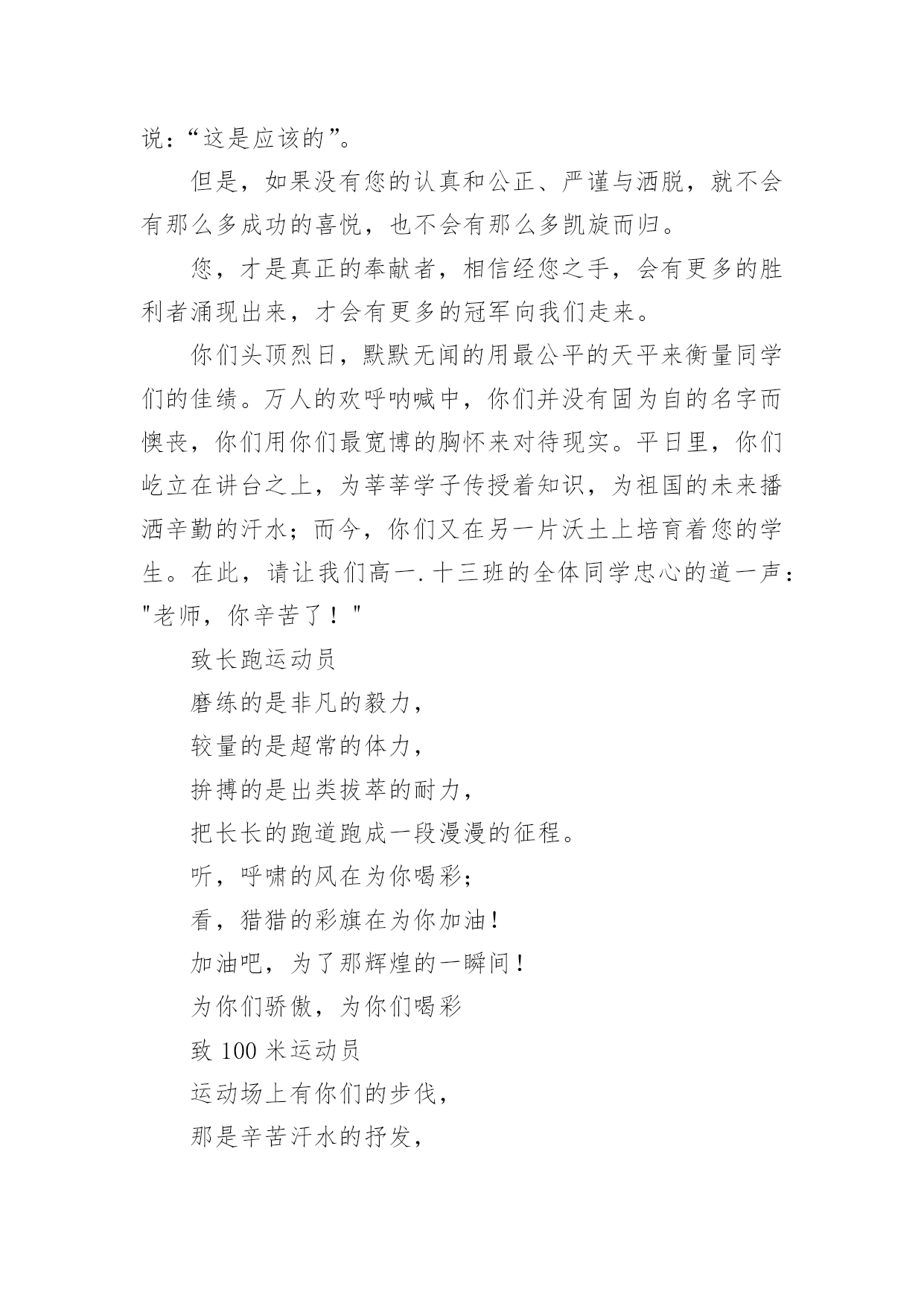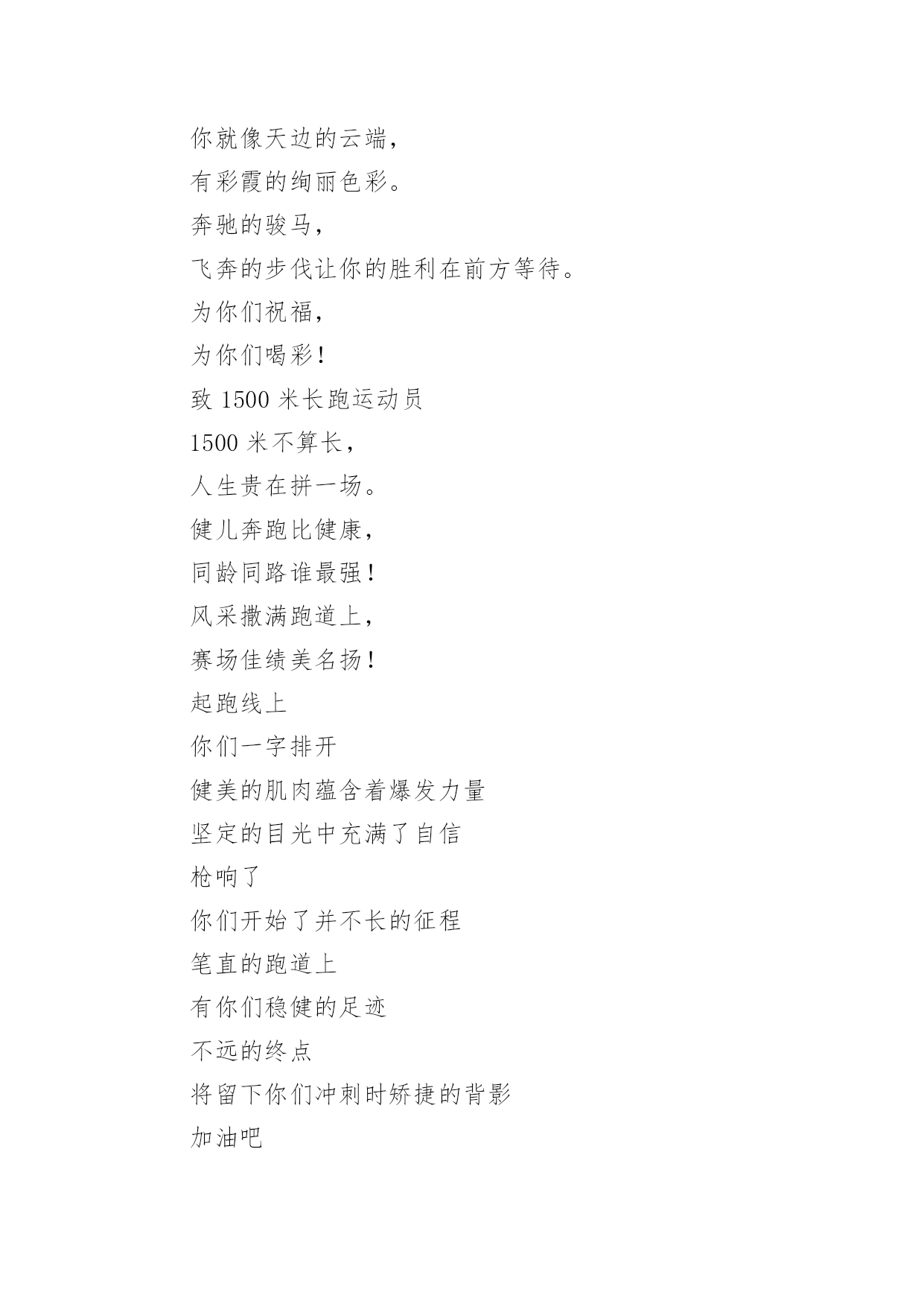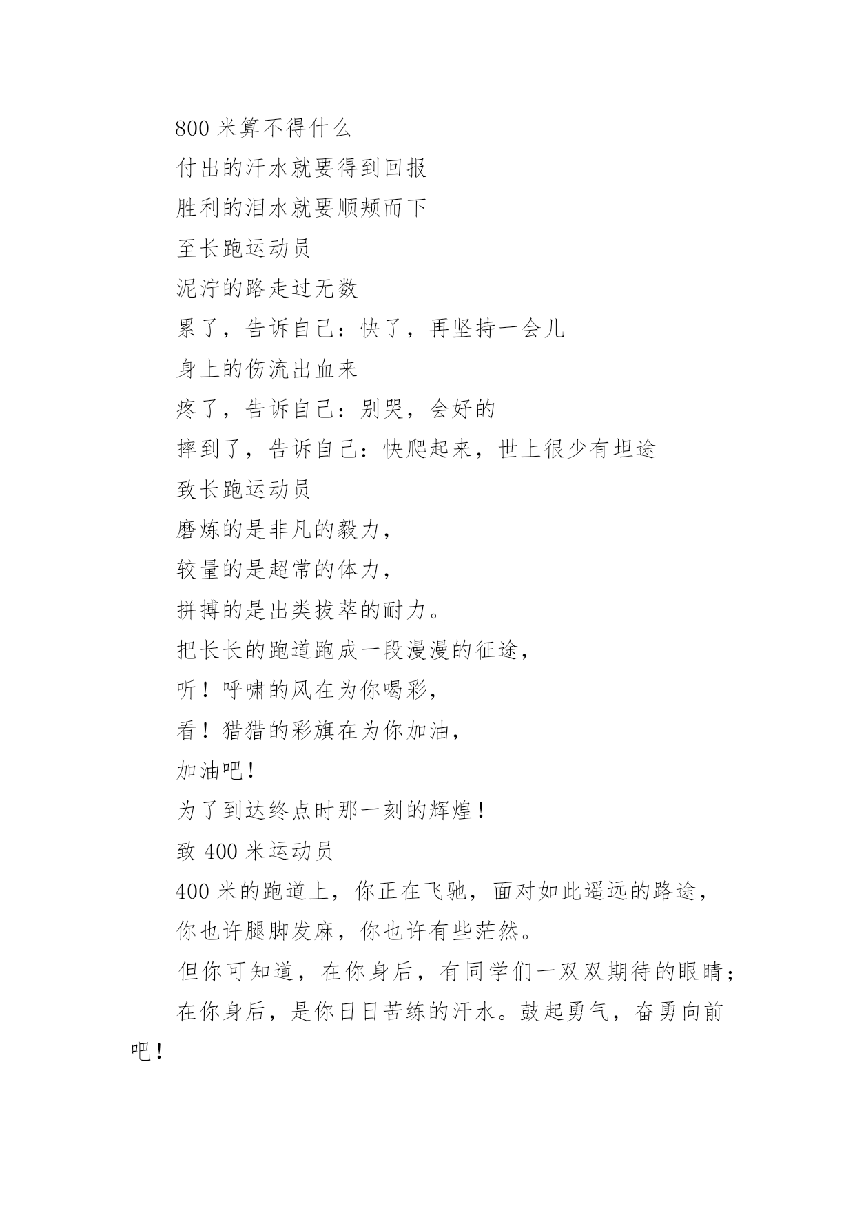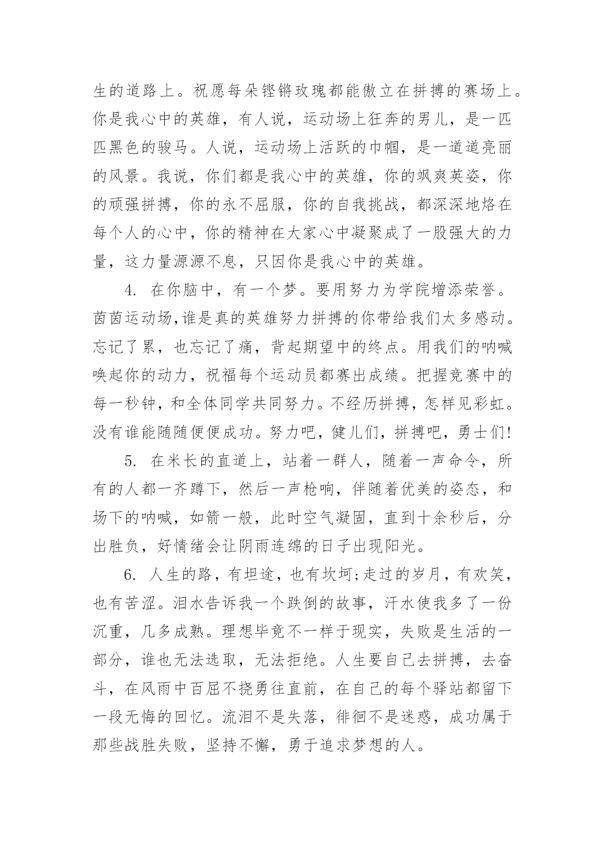 运动会加油稿运动会加油稿集合15篇随着社会一步步向前发展,我们都可能会用到加油稿,借助加油稿可以更好地为他人加油打气。写加油稿的注意事项有许多,你确定会写吗?下面是小编帮大家整理的运动会加油稿,欢迎阅读与收藏。运动会加油稿11、你的毅力令我们全班折服,你的努力,令我们全班佩服,你是我们班的焦点,你是全班的中心,不屈不挠,坚持不懈,你让我们真正体会到奥运精神。2、或许,有意无意之间,你已陷入一场惊心动魄的争夺之中,即使天崩地裂,日月无光,你毫无怨言,永往直前。既然心中已锁定目标,就抛却一切。3、快去追赶对手,快去夺取胜利!相信你会送给我们一个汗水浸湿的微笑!4、不为掌声的诠释,不为刻意的征服,仅有辛勤的汗水化作追求的脚步,心中坚定的信念,脚下沉稳的步伐,你用行动诉说着一个不变的真理。5、踏上跑道,是一种选择。离开起点,是一种勇气。驰骋赛场,是一种胜利。6、不为鲜花的围绕,不为刹那的荣耀,只有执着的信念,化作不停的奔跑,心中燃烧着梦想,脚下不停的步伐,你用行动述说着过程的重要。7、也许流星并不少见,但它燃烧的刹那,留给人间最美丽的回忆!也许笑脸并不少见,但胜利的喜悦,总会留给世界精彩的一瞬!8、泰戈尔在诗中说,天空没有翅膀的影子,但我已飞过;艾青对朋友说,也许有人到达不了彼岸,但我们共同拥有大海。9、一根小小的木棒,连接的是团结和友爱;一根小小的木棒,传递的是勇气和力量;一根小小的木棒,演绎的是奋斗和拼搏;加油吧!10、天空中有道彩虹,它在雨后的天空中美丽夺目,生命中也有一道彩虹,那就是运动,它让生命丰富多彩。充满了生机青春的我们,青春的生命,青春的运动!运动会加油稿2你的汗水一滴滴的滴落在红色的跑道上,你的步伐渐渐沉重、缓慢。想起我曾经对你鼓励的话语,此刻都脆弱的不堪一击。努力、坚持。这些话语此时都没有了意义。我只在心底里为你祝福,为你鼓劲。企盼你能微笑着冲过终点,就在眼前的终点!校运会的召开,牵动着全体师生的心。看那平时伏案备课的老师,此刻也在跑道上跃跃欲试。为学习头疼的同学们,也为夺到第一而雀跃欢呼。严格的体育老师们,现在也细致亲切地为运动员们记录成绩。我不能在运动场上显身手,于是我就用手中的笔记录着美好的瞬间!汗水浸着衣衫,烈日灼着躯体,在这里,在那边,在运动员的每份成绩中,殊不知藏着裁判员的多少付出。正是他们,是他们造就了我们!谢谢你,我们的裁判员,我们会用自己的信念去搏取胜利,为此换来您一点点的欣慰。来吧,让我们为敬爱的裁判员们也来一些掌声吧!不为掌声的诠释,不为刻意的征服,只有辛勤的汗水化作追求的脚步。心中坚定的信念,脚下沉稳的步伐,你用行动诉说着一个不变的真理。没有比脚更长的路,没有比人更高的山。希望在终点向你招手。努力吧,用你坚韧不拔的毅志去迎接终点的鲜花与掌声。相信成功属于你。致跳高运动员如海上的浪花,似浪花上的云燕。灵巧的速跑,轻轻的一跃,落下的是小小的横竿,升起的是不屈的信念赞裁判员柳树抽出新芽,怎能忘了春风的吹拂?小草钻出泥土,怎能忘了春雨的滋润?花儿绽开美丽笑脸,怎能忘了太阳爱抚?孩子们的成长更不能忘记老师的培养。今天,我们成绩的取得,怎能忘记您,公正无私的裁判员老师赞裁判员广播里听不到您的声音,领奖台前看不到您的身影,您说:“这是应该的”。但是,如果没有您的认真和公正、严谨与洒脱,就不会有那么多成功的喜悦,也不会有那么多凯旋而归。您,才是真正的奉献者,相信经您之手,会有更多的胜利者涌现出来,才会有更多的冠军向我们走来。你们头顶烈日,默默无闻的用最公平的天平来衡量同学们的佳绩。万人的欢呼呐喊中,你们并没有固为自的名字而懊丧,你们用你们最宽博的胸怀来对待现实。平日里,你们屹立在讲台之上,为莘莘学子传授着知识,为祖国的未来播洒辛勤的汗水;而今,你们又在另一片沃土上培育着您的学生。在此,请让我们高一.十三班的全体同学忠心的道一声:"老师,你辛苦了!"致长跑运动员磨练的是非凡的毅力,较量的是超常的体力,拚搏的是出类拔萃的耐力,把长长的跑道跑成一段漫漫的征程。听,呼啸的风在为你喝彩;看,猎猎的彩旗在为你加油!加油吧,为了那辉煌的一瞬间!为你们骄傲,为你们喝彩致100米运动员运动场上有你们的步伐,那是辛苦汗水的抒发,你就像天边的云端,有彩霞的绚丽色彩。奔驰的骏马,飞奔的步伐让你的胜利在前方等待。为你们祝福,为你们喝彩!致1500米长跑运动员1500米不算长,人生贵在拼一场。健儿奔跑比健康,同龄同路谁最强!风采撒满跑道上,赛场佳绩美名扬!起跑线上你们一字排开健美的肌肉蕴含着爆发力量坚定的目光中充满了自信枪响了你们开始了并不长的征程笔直的跑道上有你们稳健的足迹不远的终点将留下你们冲刺时矫捷的背影加油吧掌声将为你响起加油吧胜利和鲜花终将属于你们致百米运动员为你们祝福,为你们喝彩。一声枪响伴着飒爽的秋风,你们亮出自己的