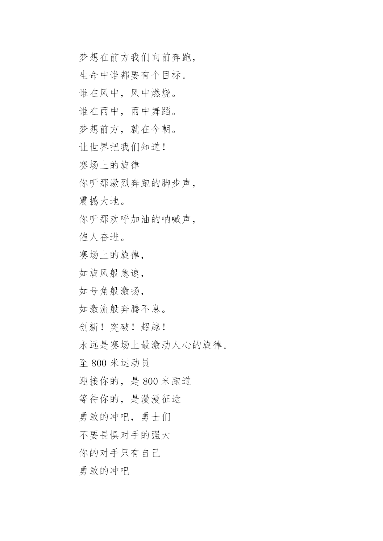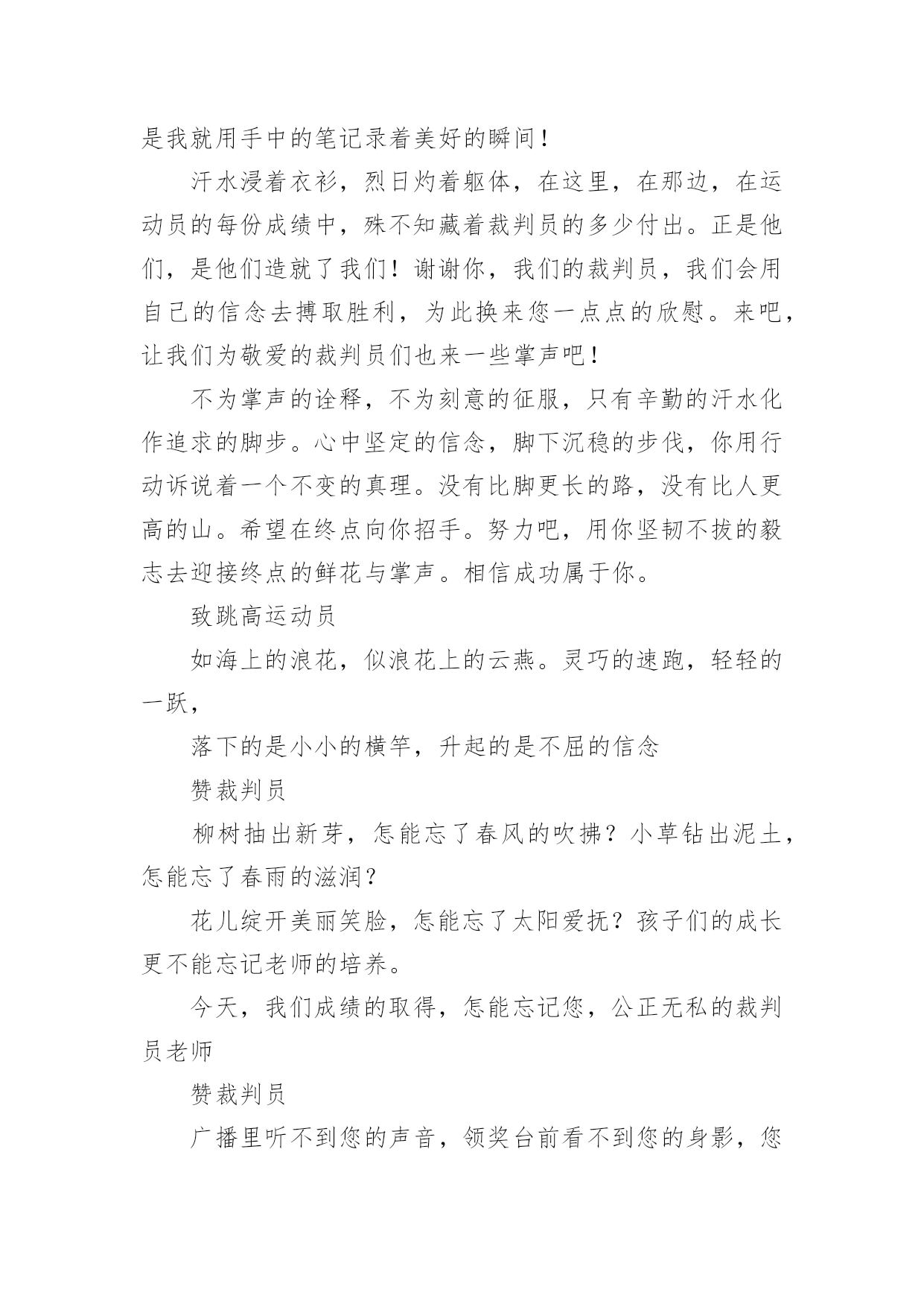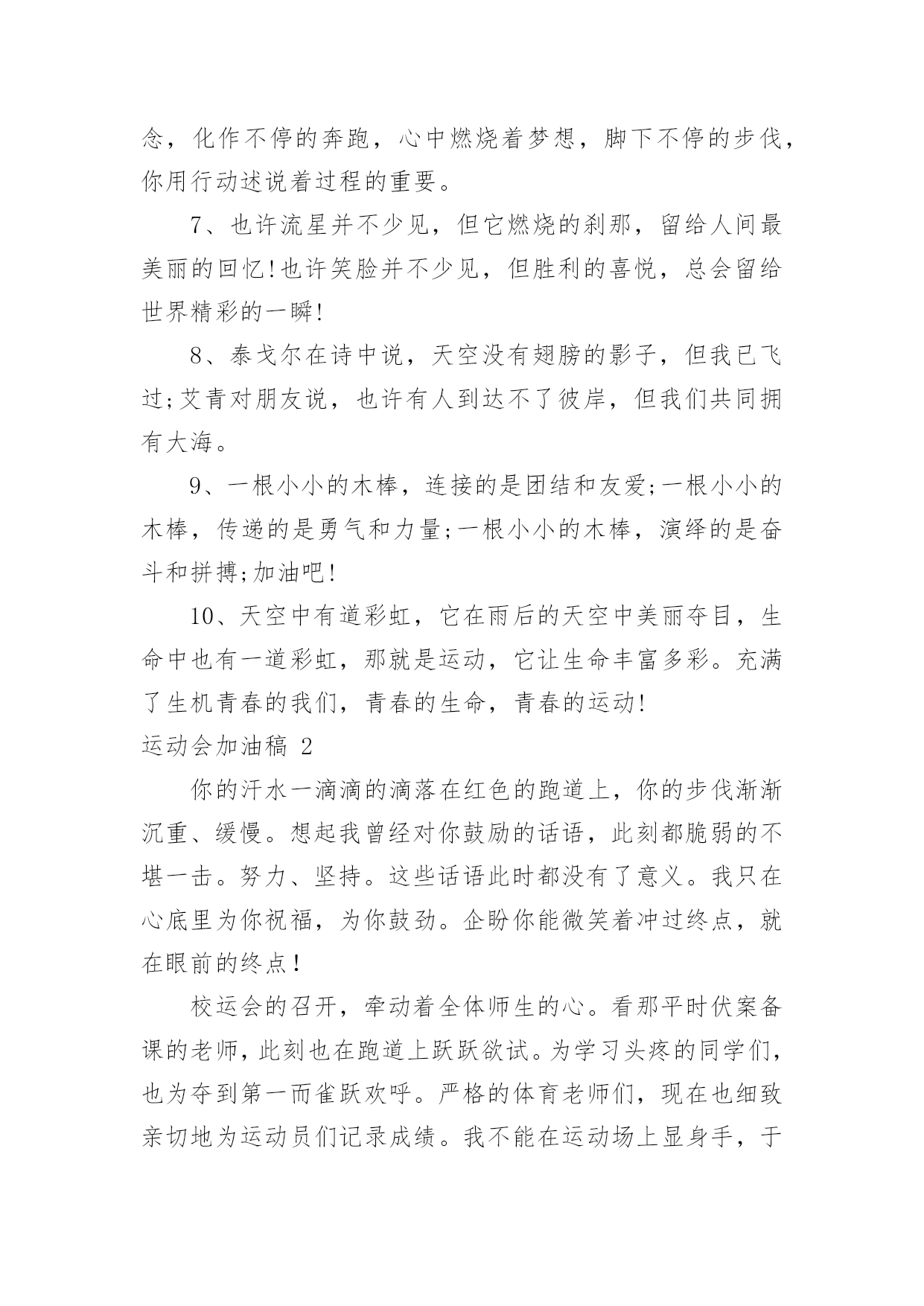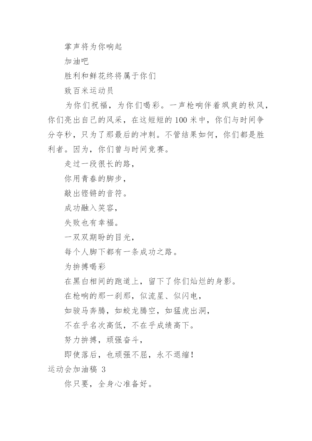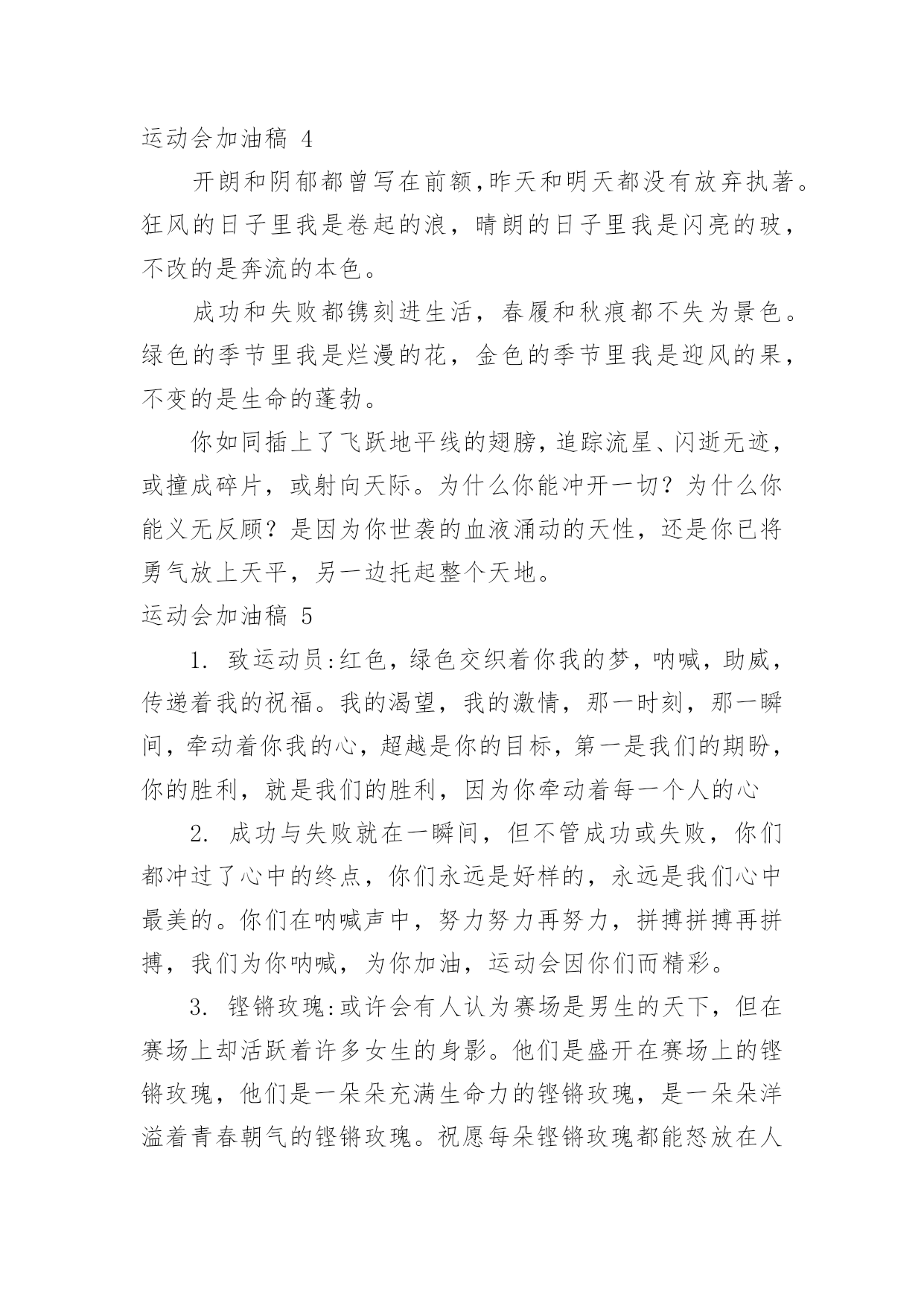 运动会加油稿运动会加油稿集合15篇随着社会一步步向前发展,我们都可能会用到加油稿,借助加油稿可以更好地为他人加油打气。写加油稿的注意事项有许多,你确定会写吗?下面是小编帮大家整理的运动会加油稿,欢迎阅读与收藏。运动会加油稿11、你的毅力令我们全班折服,你的努力,令我们全班佩服,你是我们班的焦点,你是全班的中心,不屈不挠,坚持不懈,你让我们真正体会到奥运精神。2、或许,有意无意之间,你已陷入一场惊心动魄的争夺之中,即使天崩地裂,日月无光,你毫无怨言,永往直前。既然心中已锁定目标,就抛却一切。3、快去追赶对手,快去夺取胜利!相信你会送给我们一个汗水浸湿的微笑!4、不为掌声的诠释,不为刻意的征服,仅有辛勤的汗水化作追求的脚步,心中坚定的信念,脚下沉稳的步伐,你用行动诉说着一个不变的真理。5、踏上跑道,是一种选择。离开起点,是一种勇气。驰骋赛场,是一种胜利。6、不为鲜花的围绕,不为刹那的荣耀,只有执着的信念,化作不停的奔跑,心中燃烧着梦想,脚下不停的步伐,你用行动述说着过程的重要。7、也许流星并不少见,但它燃烧的刹那,留给人间最美丽的回忆!也许笑脸并不少见,但胜利的喜悦,总会留给世界精彩的一瞬!8、泰戈尔在诗中说,天空没有翅膀的影子,但我已飞过;艾青对朋友说,也许有人到达不了彼岸,但我们共同拥有大海。9、一根小小的木棒,连接的是团结和友爱;一根小小的木棒,传递的是勇气和力量;一根小小的木棒,演绎的是奋斗和拼搏;加油吧!10、天空中有道彩虹,它在雨后的天空中美丽夺目,生命中也有一道彩虹,那就是运动,它让生命丰富多彩。充满了生机青春的我们,青春的生命,青春的运动!运动会加油稿2你的汗水一滴滴的滴落在红色的跑道上,你的步伐渐渐沉重、缓慢。想起我曾经对你鼓励的话语,此刻都脆弱的不堪一击。努力、坚持。这些话语此时都没有了意义。我只在心底里为你祝福,为你鼓劲。企盼你能微笑着冲过终点,就在眼前的终点!校运会的召开,牵动着全体师生的心。看那平时伏案备课的老师,此刻也在跑道上跃跃欲试。为学习头疼的同学们,也为夺到第一而雀跃欢呼。严格的体育老师们,现在也细致亲切地为运动员们记录成绩。我不能在运动场上显身手,于是我就用手中的笔记录着美好的瞬间!汗水浸着衣衫,烈日灼着躯体,在这里,在那边,在运动员的每份成绩中,殊不知藏着裁判员的多少付出。正是他们,是他们造就了我们!谢谢你,我们的裁判员,我们会用自己的信念去搏取胜利,为此换来您一点点的欣慰。来吧,让我们为敬爱的裁判员们也来一些掌声吧!不为掌声的诠释,不为刻意的征服,只有辛勤的汗水化作追求的脚步。心中坚定的信念,脚下沉稳的步伐,你用行动诉说着一个不变的真理。没有比脚更长的路,没有比人更高的山。希望在终点向你招手。努力吧,用你坚韧不拔的毅志去迎接终点的鲜花与掌声。相信成功属于你。致跳高运动员如海上的浪花,似浪花上的云燕。灵巧的速跑,轻轻的一跃,落下的是小小的横竿,升起的是不屈的信念赞裁判员柳树抽出新芽,怎能忘了春风的吹拂?小草钻出泥土,怎能忘了春雨的滋润?花儿绽开美丽笑脸,怎能忘了太阳爱抚?孩子们的成长更不能忘记老师的培养。今天,我们成绩的取得,怎能忘记您,公正无私的裁判员老师赞裁判员广播里听不到您的声音,领奖台前看不到您的身影,您说:“这是应该的”。但是,如果没有您的认真和公正、严谨与洒脱,就不会有那么多成功的喜悦,也不会有那么多凯旋而归。您,才是真正的奉献者,相信经您之手,会有更多的胜利者涌现出来,才会有更多的冠军向我们走来。你们头顶烈日,默默无闻的用最公平的天平来衡量同学们的佳绩。万人的欢呼呐喊中,你们并没有固为自的名字而懊丧,你们用你们最宽博的胸怀来对待现实。平日里,你们屹立在讲台之上,为莘莘学子传授着知识,为祖国的未来播洒辛勤的汗水;而今,你们又在另一片沃土上培育着您的学生。在此,请让我们高一.十三班的全体同学忠心的道一声:"老师,你辛苦了!"致长跑运动员磨练的是非凡的毅力,较量的是超常的体力,拚搏的是出类拔萃的耐力,把长长的跑道跑成一段漫漫的征程。听,呼啸的风在为你喝彩;看,猎猎的彩旗在为你加油!加油吧,为了那辉煌的一瞬间!为你们骄傲,为你们喝彩致100米运动员运动场上有你们的步伐,那是辛苦汗水的抒发,你就像天边的云端,有彩霞的绚丽色彩。奔驰的骏马,飞奔的步伐让你的胜利在前方等待。为你们祝福,为你们喝彩!致1500米长跑运动员1500米不算长,人生贵在拼一场。健儿奔跑比健康,同龄同路谁最强!风采撒满跑道上,赛场佳绩美名扬!起跑线上你们一字排开健美的肌肉蕴含着爆发力量坚定的目光中充满了自信枪响了你们开始了并不长的征程笔直的跑道上有你们稳健的足迹不远的终点将留下你们冲刺时矫捷的背影加油吧掌声将为你响起加油吧胜利和鲜花终将属于你们致百米运动员为你们祝福,为你们喝彩。一声枪响伴着飒爽的秋风,你们亮出自己的