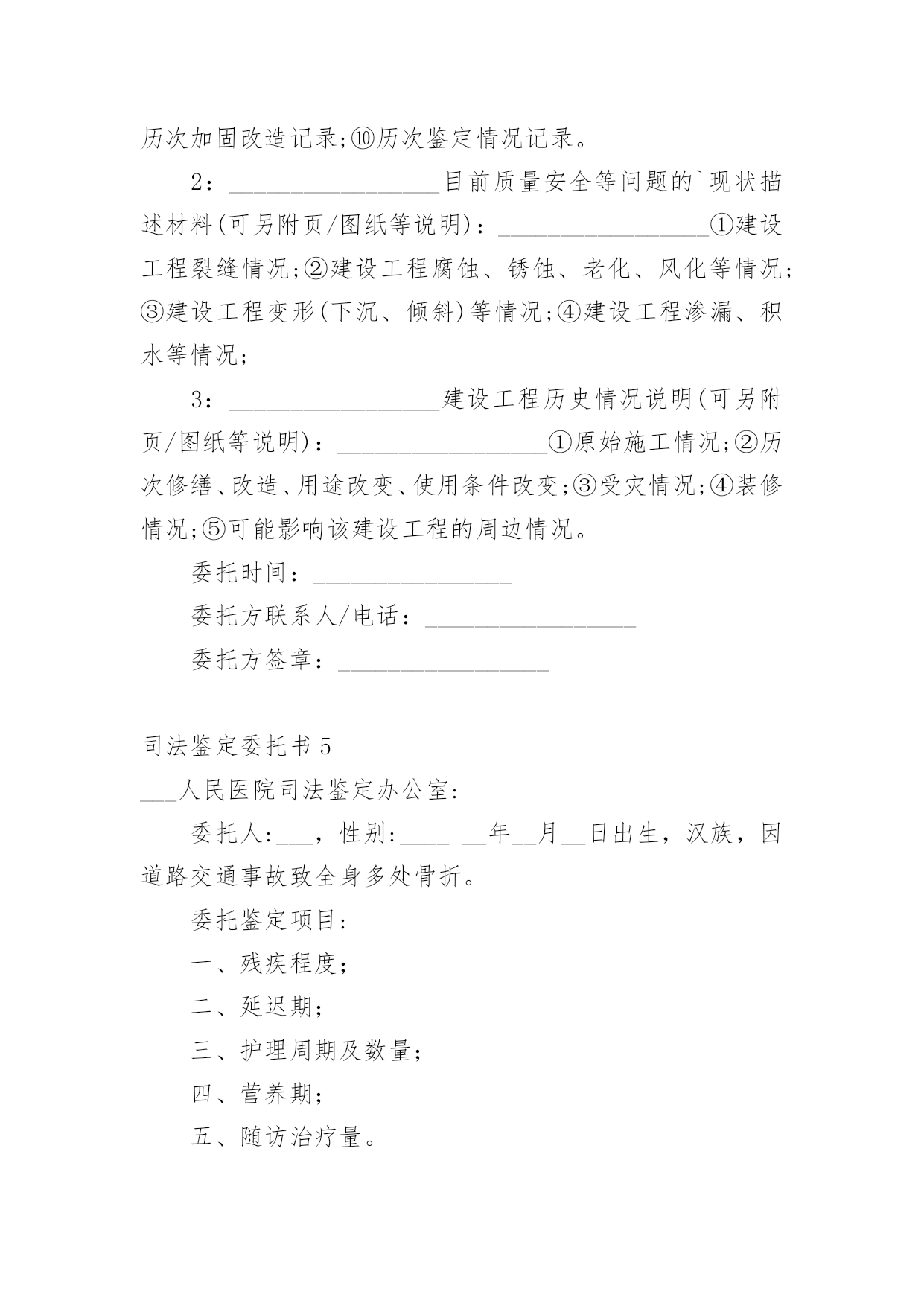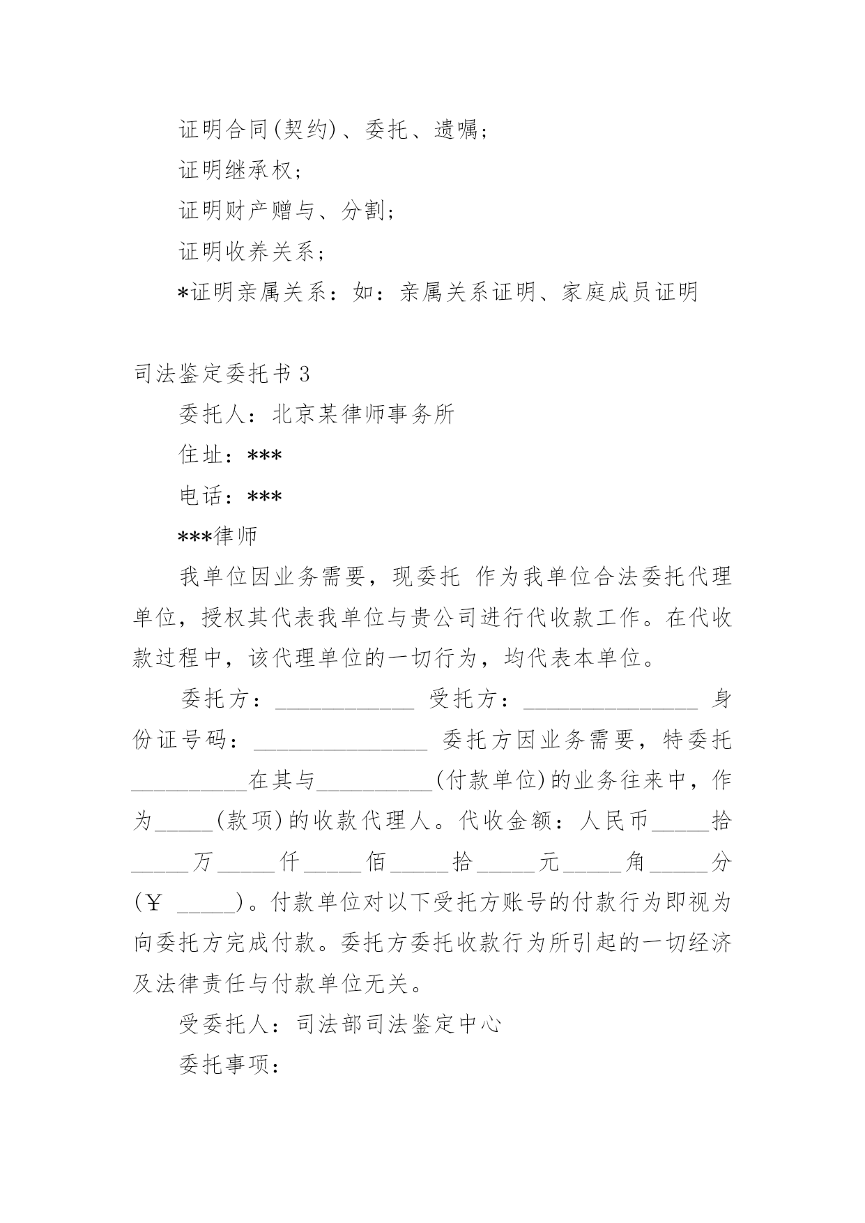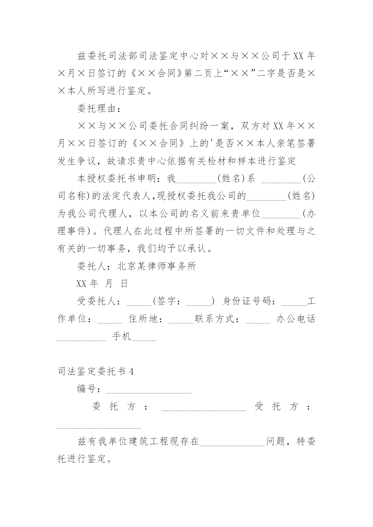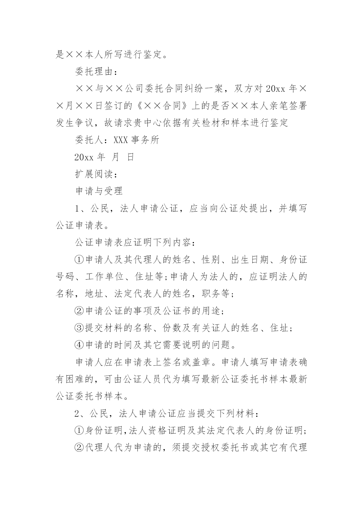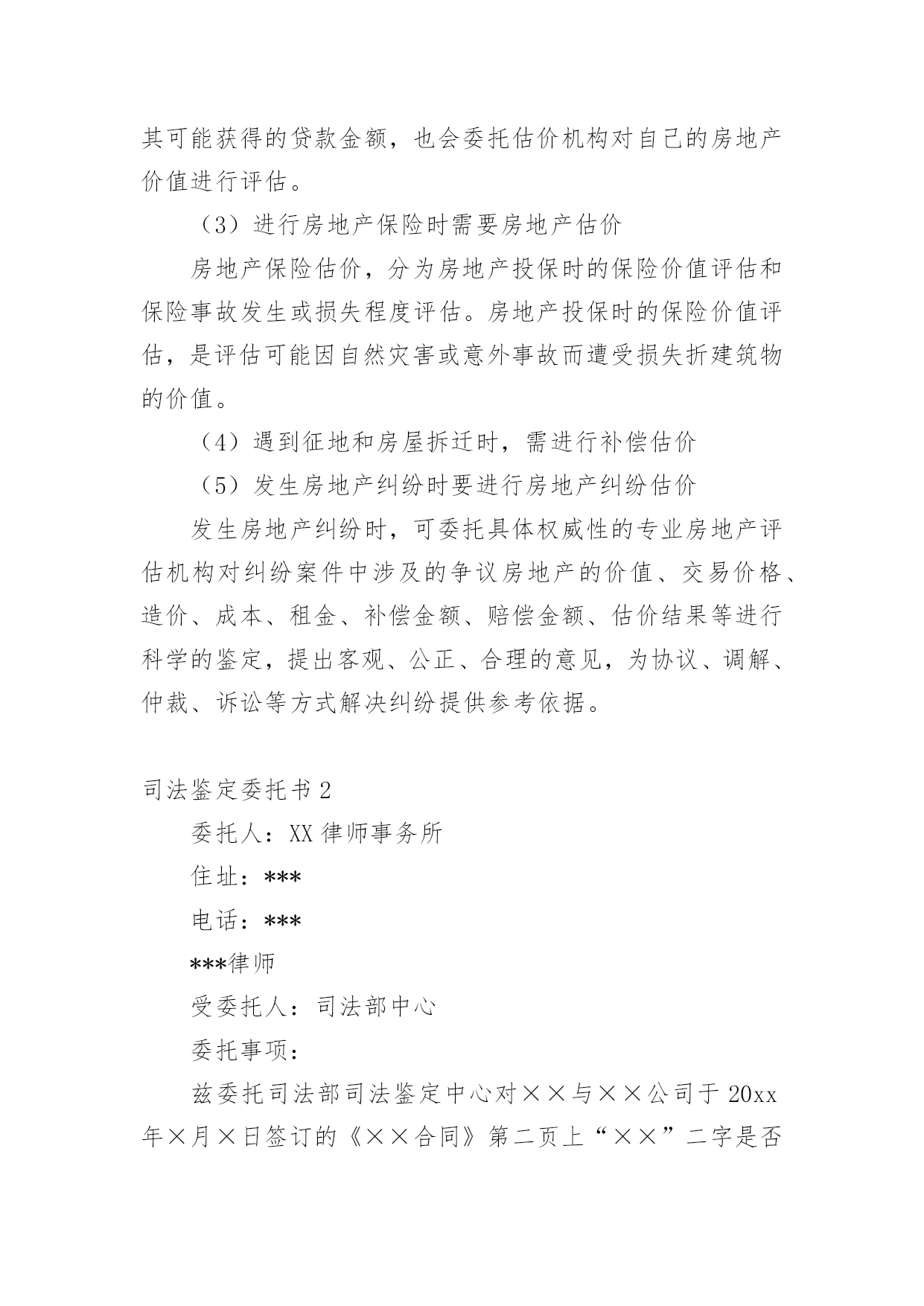 司法鉴定委托书司法鉴定委托书精选15篇被委托人如果没有做出违背国家法律的任何权益,被委托人在行使权力时委托人不得以任何理由反悔。在日新月异的现代社会中,在处理事务上需要使用委托书的情况越来越多,委托书的注意事项有许多,你确定会写吗?下面是小编收集整理的司法鉴定委托书,仅供参考,欢迎大家阅读。司法鉴定委托书1一、房地产司法鉴定委托书可以委托什么房地产司法鉴定委托书可以委托司法鉴定机构对于房地产抵押估价、房屋征收评估、房地产税收估价等情况进行司法鉴定。除了委托之外还有其他的方式,委托并不是唯一的申请鉴定的方式。二、房地产司法鉴定估价的类型(一)司法拍卖估价。涉诉房地产的司法拍卖,需要估价。这是目前最主要的房地产司法鉴定估价业务。(二)分家析产估价。分家析产主要是因家庭成员不能够再在一起生活,而要求分割家庭共有财产。主要有离婚、继承导致的分家析产。分家析产估价中,最典型的是离婚引起的房产估价。具体是一方得房,另一方得钱;得房的一方应给得钱的一方多少钱。(三)损害赔偿估价。房地产损害发生后,不可回避的是如何解决赔偿问题。房地产损害的种类主要有:1、房屋受损,如造成房屋门窗变形、墙体开裂、倾斜、倒塌等;2、采光、日照受影响;3、景观、视野受影响;4、辐射问题,如在附近架设高压线、建变电站等;5、噪声污染,如在附近建高架桥、修铁路等;6、各种房屋质量缺陷,如在层高(或室内净高)、保温隔热、隔声、防水、室内空气质量等方面,开发商竣工交付的房屋未达到合同约定的'标准或不符合国家标准;7、绿地面积减少、建筑密度增加等;8、发生火灾,如世博会后上海发生的火灾;9、因未能履约(如未按照合同约定如期供货、供款等)使他人工程停缓建,给他人造成损失的。10、因对房地产权利行使不当限制,如错误查封,给房地产权利人造成损失的。11、因异议登记不当,造成房地产权利人损害的。《物权法》第十九条规定:“异议登记不当,造成权利人损害的,权利人可以向申请人请求损害赔偿。”12、因非法批准征收、使用土地,给当事人造成损失的。《土地管理法》第七十八条规定:“无权批准征收、使用土地的单位或者个人非法批准占用土地的,超越批准权限非法批准占用土地的,不按照土地利用总体规划确定的用途批准用地的,或者违反法律规定的程序批准占用、征收土地的,其批准文件无效”,“非法批准征收、使用土地,对当事人造成损失的,依法应当承担赔偿责任”。(四)定罪量刑估价。如房地产受贿罪。(五)其他司法鉴定估价。三、二手房转让需要进行的房产估价的情况房地产估价是指专业房地产估价人员,根据特定的估价目的,遵循公认的估价原则,按照严谨的估价程序,运用科学的估价方法,在对影响估价对象价值的因素进行综合分析的基础上,对估价对象在估价时点的价值进行估算和判定的活动。(1)购买房屋时可能需要房地产估价交易双方当事人向房地产管理部门申报其成交价格时,房地产管理部门如果认为明显低于房地产价值,会委托具有一定资质的专业评估机构对交易的房地产进行评估,并以评估的价格作为缴纳税费的依据。此外,交易双方为确定合理的交易价格,也可以委托评估事务所进行评估价作为交易价格的参考。(2)申请抵押贷款时需要房地产估价向银行申请房地产抵押贷款时,抵押人以抵押物作为还款的担保,银行为确定抵押物的担保价值需要对抵押人的房地产进行估价,借款人为了证实其拥有的房地产价值,确定其可能获得的贷款金额,也会委托估价机构对自己的房地产价值进行评估。(3)进行房地产保险时需要房地产估价房地产保险估价,分为房地产投保时的保险价值评估和保险事故发生或损失程度评估。房地产投保时的保险价值评估,是评估可能因自然灾害或意外事故而遭受损失折建筑物的价值。(4)遇到征地和房屋拆迁时,需进行补偿估价(5)发生房地产纠纷时要进行房地产纠纷估价发生房地产纠纷时,可委托具体权威性的专业房地产评估机构对纠纷案件中涉及的争议房地产的价值、交易价格、造价、成本、租金、补偿金额、赔偿金额、估价结果等进行科学的鉴定,提出客观、公正、合理的意见,为协议、调解、仲裁、诉讼等方式解决纠纷提供参考依据。司法鉴定委托书2委托人:XX律师事务所住址:***电话:******律师受委托人:司法部中心委托事项:兹委托司法部司法鉴定中心对××与××公司于20xx年×月×日签订的《××合同》第二页上“××”二字是否是××本人所写进行鉴定。委托理由:××与××公司委托合同纠纷一案,双方对20xx年××月××日签订的《××合同》上的是否××本人亲笔签署发生争议,故请求贵中心依据有关检材和样本进行鉴定委托人:XXX事务所20xx年月日扩展阅读:申请与受理1、公民,法人申请公证,应当向公证处提出,并填写公证申请表。公证申请表应证明下列内容:①申请人及其代理人的姓名、性别、出生日期、身份证号码、工作单位、住址等;申请人