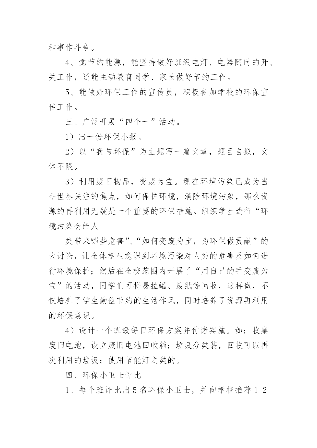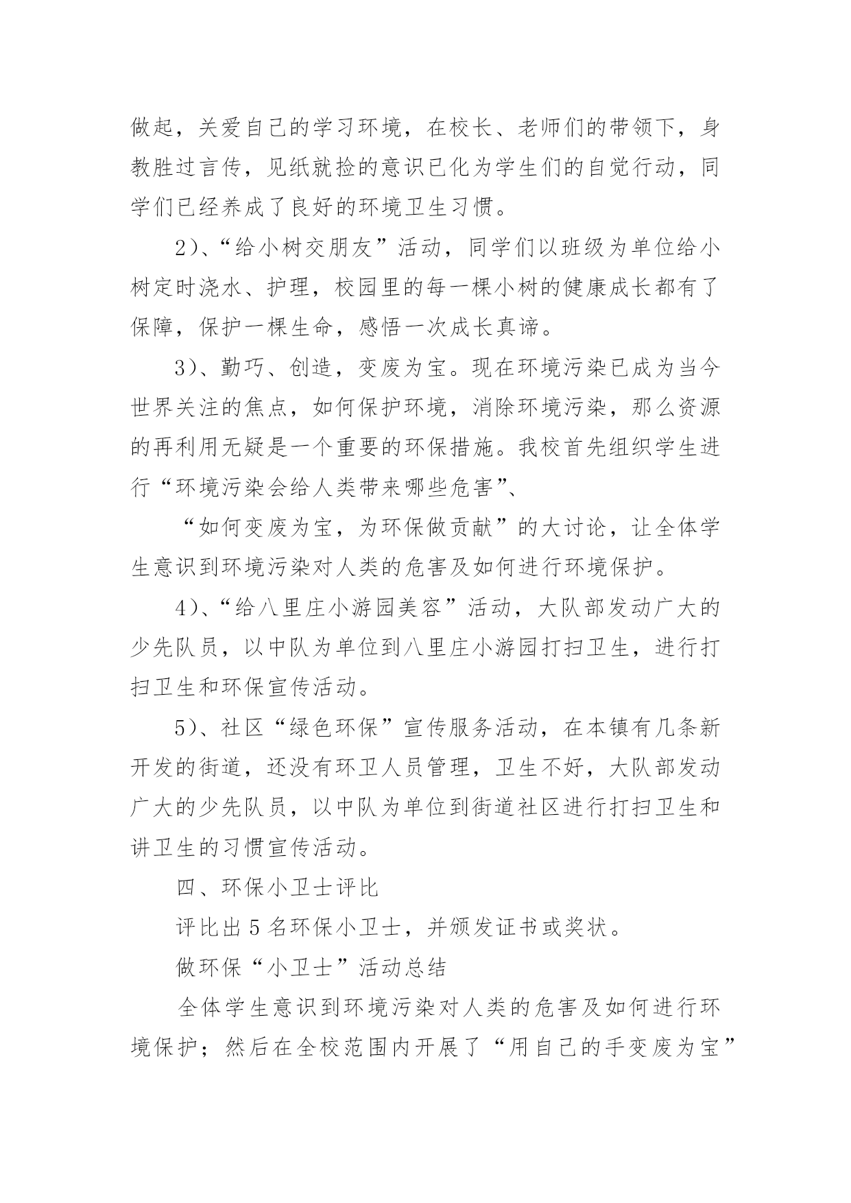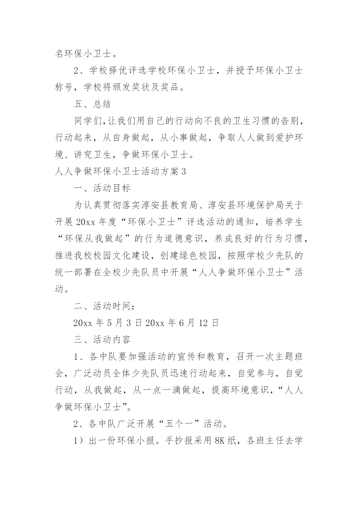 人人争做环保小卫士活动方案人人争做环保小卫士活动方案为了确保工作或事情能高效地开展,我们需要事先制定方案,方案是从目的、要求、方式、方法、进度等都部署具体、周密,并有很强可操作性的计划。那么方案应该怎么制定才合适呢?下面是小编为大家收集的人人争做环保小卫士活动方案,欢迎阅读与收藏。人人争做环保小卫士活动方案1一、活动目标为认真贯彻落实《小学生守则》、《小学生日常行为规范》,培养学生“环保从我做起”的行为道德意识,养成良好的行为习惯,推进我校校园文化建设,创建绿色校园,按照学校少先队的统一部署在五年级开展“人人争做环保小卫士”活动。二、活动宣传时间:20xx.11.8三、活动实施措施1、加强活动的宣传和教育,广泛动员全体学生迅速行动起来,自觉参与,自觉行动,从我做起,从一点一滴做起,提高环境意识,“人人争做环保小卫士”。2、广泛开展活动。1)、开展了“弯弯腰”活动,号召同学们从身边的小事做起,关爱自己的学习环境,在校长、老师们的带领下,身教胜过言传,见纸就捡的意识已化为学生们的自觉行动,同学们已经养成了良好的环境卫生习惯。2)、“给小树交朋友”活动,同学们以班级为单位给小树定时浇水、护理,校园里的每一棵小树的健康成长都有了保障,保护一棵生命,感悟一次成长真谛。3)、勤巧、创造,变废为宝。现在环境污染已成为当今世界关注的焦点,如何保护环境,消除环境污染,那么资源的再利用无疑是一个重要的环保措施。我校首先组织学生进行“环境污染会给人类带来哪些危害”、“如何变废为宝,为环保做贡献”的大讨论,让全体学生意识到环境污染对人类的危害及如何进行环境保护。4)、“给八里庄小游园美容”活动,大队部发动广大的少先队员,以中队为单位到八里庄小游园打扫卫生,进行打扫卫生和环保宣传活动。5)、社区“绿色环保”宣传服务活动,在本镇有几条新开发的街道,还没有环卫人员管理,卫生不好,大队部发动广大的少先队员,以中队为单位到街道社区进行打扫卫生和讲卫生的习惯宣传活动。四、环保小卫士评比评比出5名环保小卫士,并颁发证书或奖状。做环保“小卫士”活动总结全体学生意识到环境污染对人类的危害及如何进行环境保护;然后在全校范围内开展了“用自己的手变废为宝”的活动,一时间,同学们将易拉罐、废旧泡沫、废布料、废纸等制成了一件件精美的艺术品,学校将评出来的“艺术精品”放在学校长廊的展橱里展览。这样做,不仅锻炼了学生动手创造能力,同时培养了资源再利用的环保意识。同学们对八里庄小游园的环境进行了清理后,园区内的环境焕然一新,同学们虽然很累,但是得到了社区居民的认可和赞扬,满脸洋溢着笑容。爱护环境,人人有责!让更多的人行动起来,爱护我们的环境,保护我们的家园,是我们的共同心愿!人人争做环保小卫士活动方案2一、活动目标为培养学生“环保从我做起”的行为道德意识,养成良好的行为习惯,推进我校校园文化建设,创建绿色校园,按照学校的'统一部署在全校开展“人人争做环保小卫士”活动。二、活动内容1、各班要加强活动的宣传和教育,召开一次主题班会,广泛动员全体学生迅速行动起来,自觉参与,自觉行动,从我做起,从一点一滴做起,提高环境意识,“人人争做环保小卫士”。2、能做好个人卫生,积极做好集体卫生。坚持垃圾分类,看到果壳、纸屑等自觉放入垃圾箱。3、爱护学校、小区的花草树木,并能与损坏绿化的人和事作斗争。4、觉节约能源,能坚持做好班级电灯、电器随时的开、关工作,还能主动教育同学、家长做好节约工作。5、能做好环保工作的宣传员,积极参加学校的环保宣传工作。三、广泛开展“四个一”活动。1)出一份环保小报。2)以“我与环保”为主题写一篇文章,题目自拟,文体不限。3)利用废旧物品,变废为宝。现在环境污染已成为当今世界关注的焦点,如何保护环境,消除环境污染,那么资源的再利用无疑是一个重要的环保措施。组织学生进行“环境污染会给人类带来哪些危害”、“如何变废为宝,为环保做贡献”的大讨论,让全体学生意识到环境污染对人类的危害及如何进行环境保护;然后在全校范围内开展了“用自己的手变废为宝”的活动,同学们可将易拉罐、废纸等回收,这样做,不仅培养了学生勤俭节约的生活作风,同时培养了资源再利用的环保意识。4)设计一个班级每日环保方案并付诸实施。如:收集废旧电池,设立废旧电池回收箱;垃圾分类装,回收可以再次利用的垃圾;使用节能灯之类的。四、环保小卫士评比1、每个班评比出5名环保小卫士,并向学校推荐1-2名环保小卫士。2、学校择优评选学校环保小卫士,并授予环保小卫士称号,学校将颁发奖状及奖品。五、总结同学们,让我们用自己的行动向不良的卫生习惯的告别,行动起来,从自身做起,从小事做起,争取人人做到爱护环境、讲究卫生,争做环保小卫士。人人争做环保小卫士活动方案3一、活动目标为认真贯彻落实淳安县教育局、淳安县环境保护局关于开展20xx年度