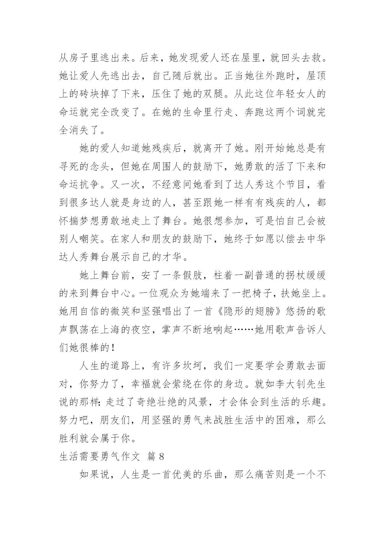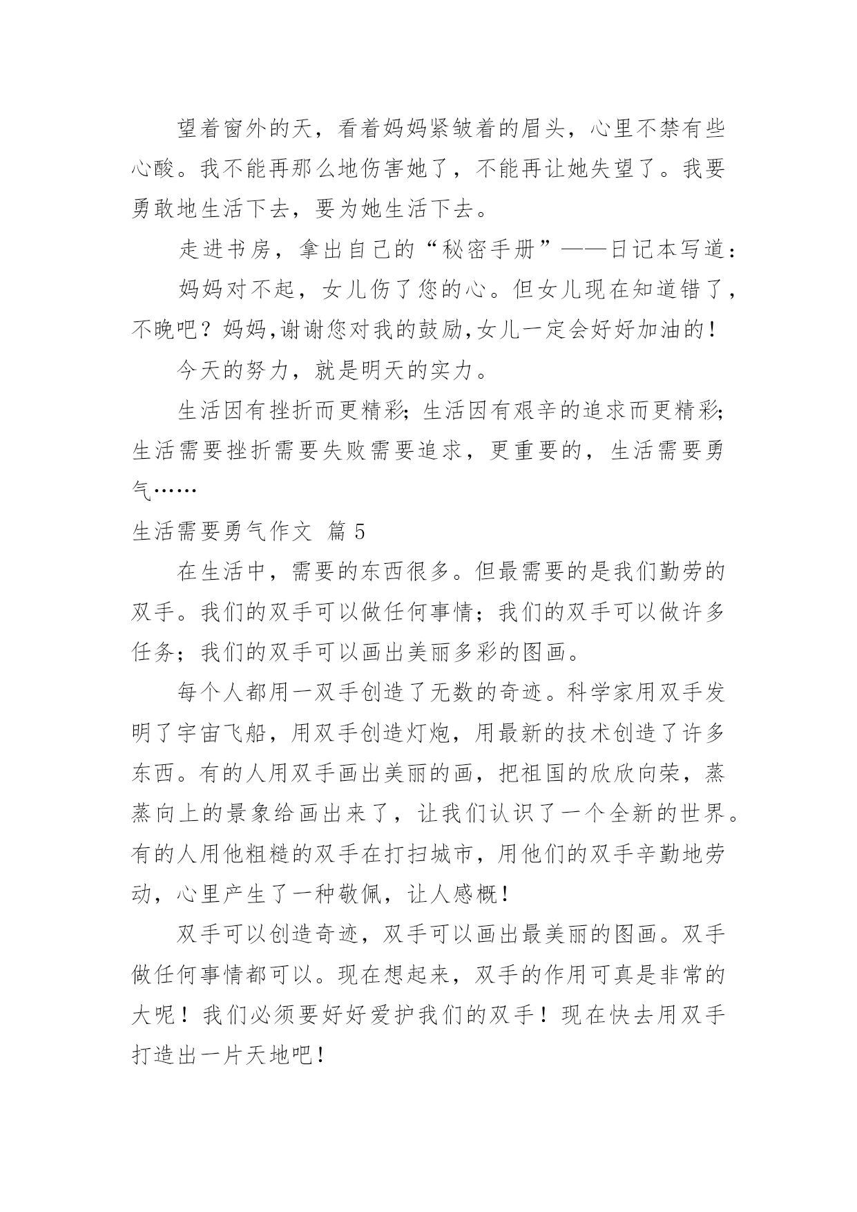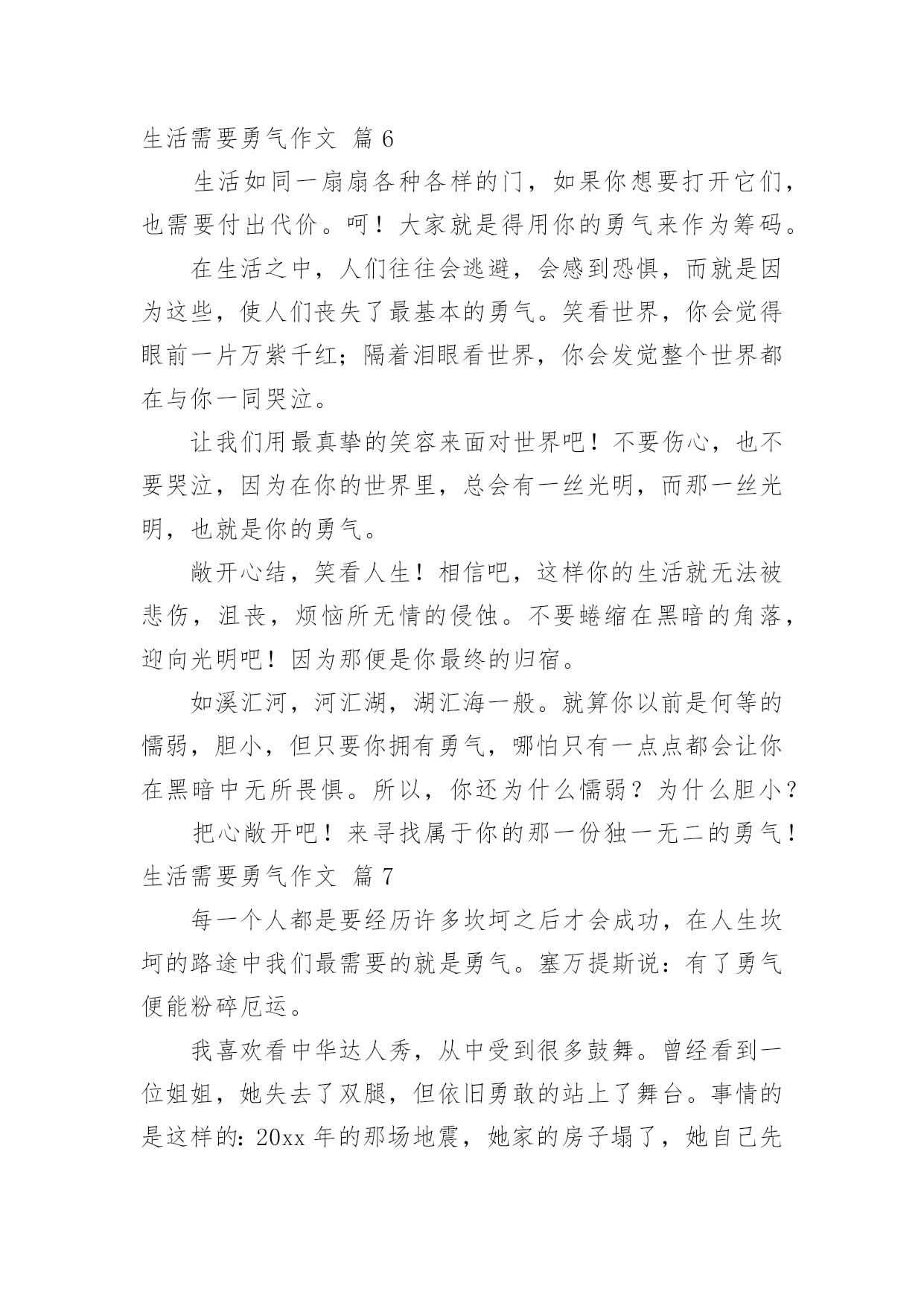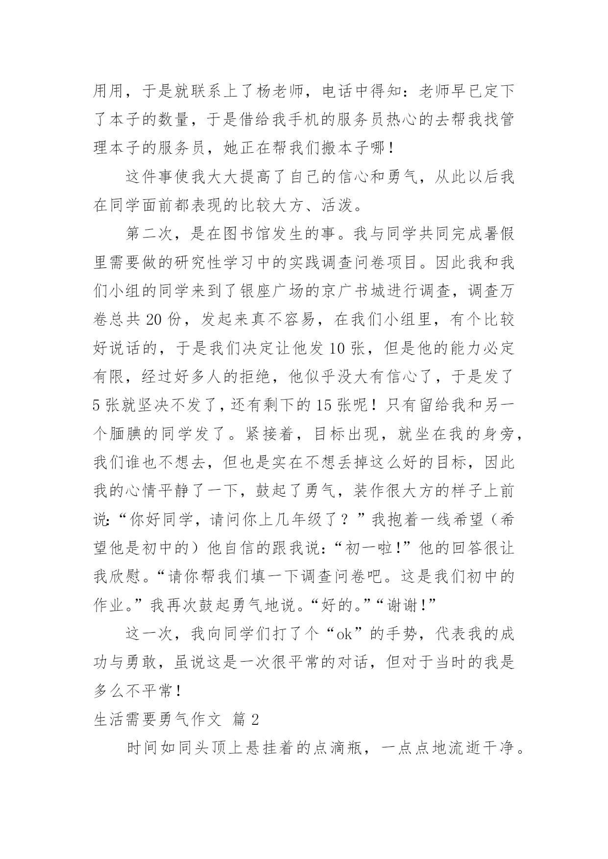 生活需要勇气作文精选生活需要勇气作文合集10篇在平凡的学习、工作、生活中,大家对作文都不陌生吧,写作文是培养人们的观察力、联想力、想象力、思考力和记忆力的重要手段。那么你知道一篇好的作文该怎么写吗?下面是小编为大家整理的生活需要勇气作文10篇,希望能够帮助到大家。生活需要勇气作文篇1在以前的生活中,我只是一个平平凡凡的孩子,我认为,只要紧跟大部队走就不会拉队。可是在现在看来,我当时的想法是错误的,因为在前几年,我是不会比普通同学多做一些事的,因此我对外也很少有交流对外人说话也缺乏自信和勇气,因此产生了孤僻。但是在几次锻炼的过程中,使我渐渐的学会了与外人交流。第一次,是在超市的询问。有一次我和同学一起为学校买本子,但本子的数量存在问题,所以我就习惯的让同我一起去的同学去打听打听,谁知她也不想去,并且还让我去问。现在的情况,只有我去了,我试探着去打听这本子的消息,可是这似乎对服务员丝毫没起作用。他不客气的喊了声:“本子就这些,没有多的了!”她的回答令我非常失望。一气之下,我又鼓起勇气,跑到两个服务员的旁边,问她借一电话用用,于是就联系上了杨老师,电话中得知:老师早已定下了本子的数量,于是借给我手机的服务员热心的去帮我找管理本子的服务员,她正在帮我们搬本子哪!这件事使我大大提高了自己的信心和勇气,从此以后我在同学面前都表现的比较大方、活泼。第二次,是在图书馆发生的事。我与同学共同完成暑假里需要做的研究性学习中的实践调查问卷项目。因此我和我们小组的同学来到了银座广场的京广书城进行调查,调查万卷总共20份,发起来真不容易,在我们小组里,有个比较好说话的,于是我们决定让他发10张,但是他的能力必定有限,经过好多人的拒绝,他似乎没大有信心了,于是发了5张就坚决不发了,还有剩下的15张呢!只有留给我和另一个腼腆的同学发了。紧接着,目标出现,就坐在我的身旁,我们谁也不想去,但也是实在不想丢掉这么好的目标,因此我的心情平静了一下,鼓起了勇气,装作很大方的样子上前说:“你好同学,请问你上几年级了?”我抱着一线希望(希望他是初中的)他自信的跟我说:“初一啦!”他的回答很让我欣慰。“请你帮我们填一下调查问卷吧。这是我们初中的作业。”我再次鼓起勇气地说。“好的。”“谢谢!”这一次,我向同学们打了个“ok”的手势,代表我的成功与勇敢,虽说这是一次很平常的对话,但对于当时的我是多么不平常!生活需要勇气作文篇2时间如同头顶上悬挂着的点滴瓶,一点点地流逝干净。夏日如同滚烫钢砂的风呼应着心跳的暖。抬头仰望天空,湛蓝湛蓝。深呼吸一口气,才发觉,手上已布满了一层细密的汗珠。“14号准备!”广播里的声音听起来毫无人情味。我的目光直视到手心里早已被揉成一团的号码条,偌大的两个数字,仿佛是对我华丽而直接的犀视。眼前是宽敞而空旷舞台,聚光灯流光溢彩,在某一个焦点熠熠生辉,多像一场梦境,它曾经吹红了无数少年的肩膀。我长吸一口气,虽然之前已作好了充分的准备,但还是心里没底。毕竟是第一次登台,怀揣一颗不安的心,把我折磨得将要窒息。“你紧张吗?”好友一声关切的话语,在我的内心注射了一股暖流,耳边红热滚烫。“还……还好吧!”我望向好友,她的瞳孔在灯光的照耀下有异样的'美,似乎有着糖浆般胶着的甜美。“别紧张,自信一点,勇气是很重要的哦!”附带着爽朗的笑意,眼睛弯弯的,象月牙一样可爱。“勇气”,这个词仿佛刺激了我某个神经,血液“哗啦啦”地涌向头顶。到底在纠结什么?到底还有什么无可循迹的惆怅?我暗自问自己。所谓舞台,不过就是一个焦点。壮阔天晨,寒暑枫露,经过了这么多天的演习,还有什么可以懦弱胆怯的呢?望向四周,那些曾和我并肩作战的战友们,他们笑靥如花。我们曾经是在一条黑白起跑线上的少年,不是么?想起好友美好的笑容,她的从容淡定,惭愧如同糠谷,一点点堆积。也许,我是需要勇气,但是,我的生活,勇气却必不可少。黑暗中,我重重点了点头,那些曾被我以粗糙的心态揉碎的情感,如地底挖掘出的温泉,在我的脸上延下一丝温热的触感。第一次流泪,不是因为害怕,而是我终于明白了勇气的可贵。广播里的声音再次响起。我大步流星地走向舞台,芳香四溢。生活需要勇气作文篇3有勇气——一个用来概括男子汉大丈夫的词语。有勇气——从表面上看就是“胆大”,在听“鬼”时,从来不流露出一点慌张的神色;在深更半夜,自己在家而毫不畏惧;在欺负你的人露面之际,狠狠地还几下手。是的,这确实是有勇气的表现,不过单有这些还是不够的——这些并不是有勇气的真正意义。我认为,真正的有勇气,最基本的就是“敢做敢当”。自己做了件错事,被揭穿后,你死活不承认,那你不单单是个犯错的人,你还是个懦夫——更遭人鄙视。有时,认错能够挽回一切。可是,如果你只为了一时地护住你那颗胆小而虚荣的心,那么,将会有更大的痛苦向你袭来。承认错误也是比较难的,它需要你鼓足勇气,花去你