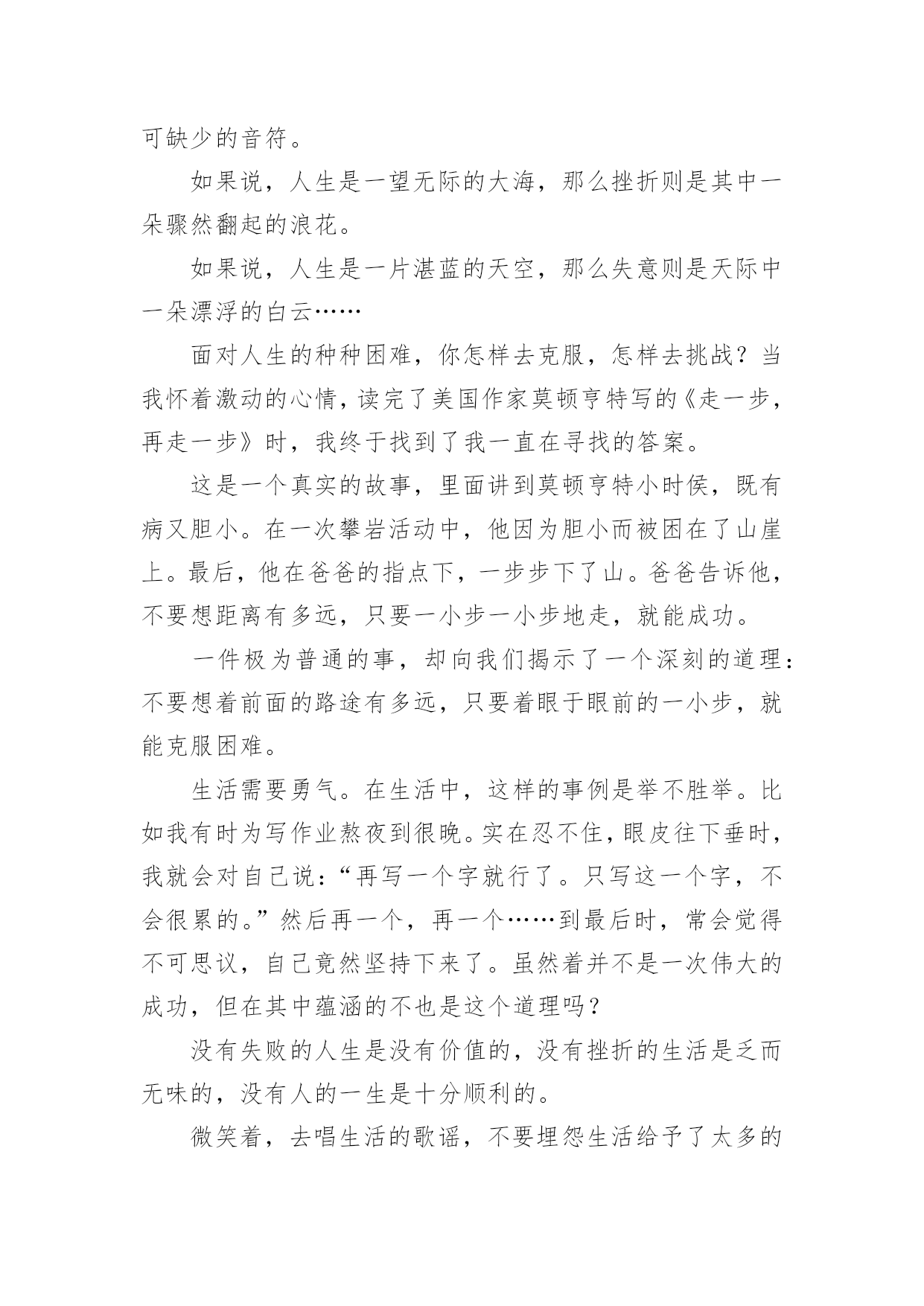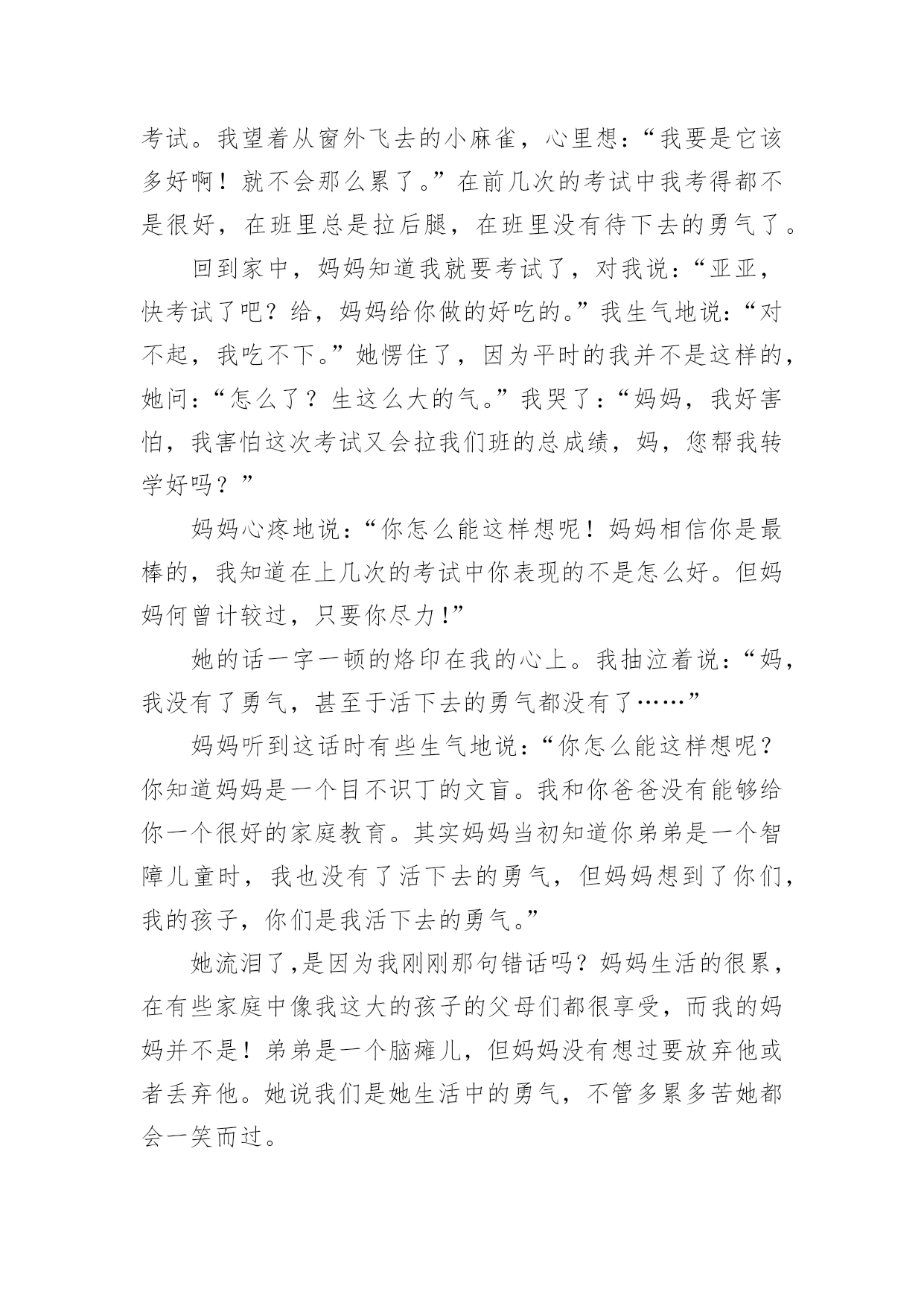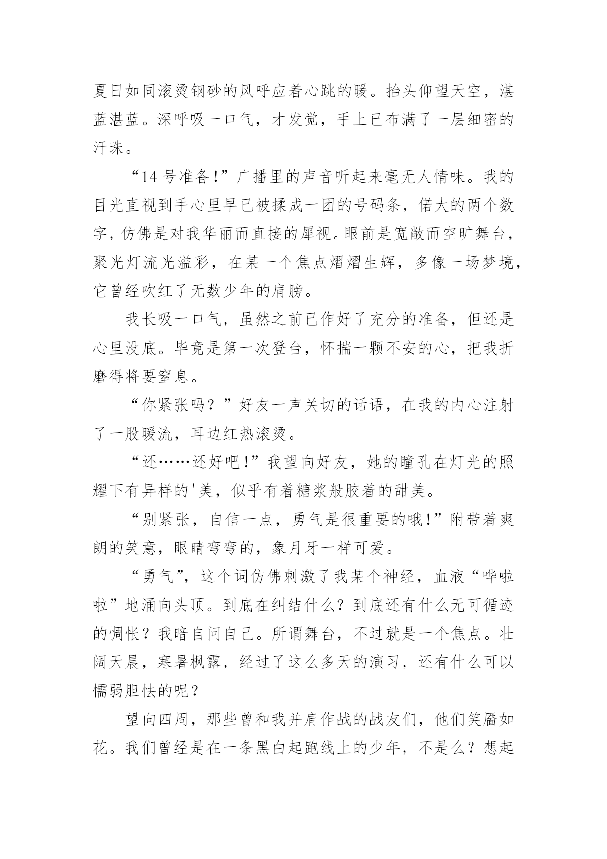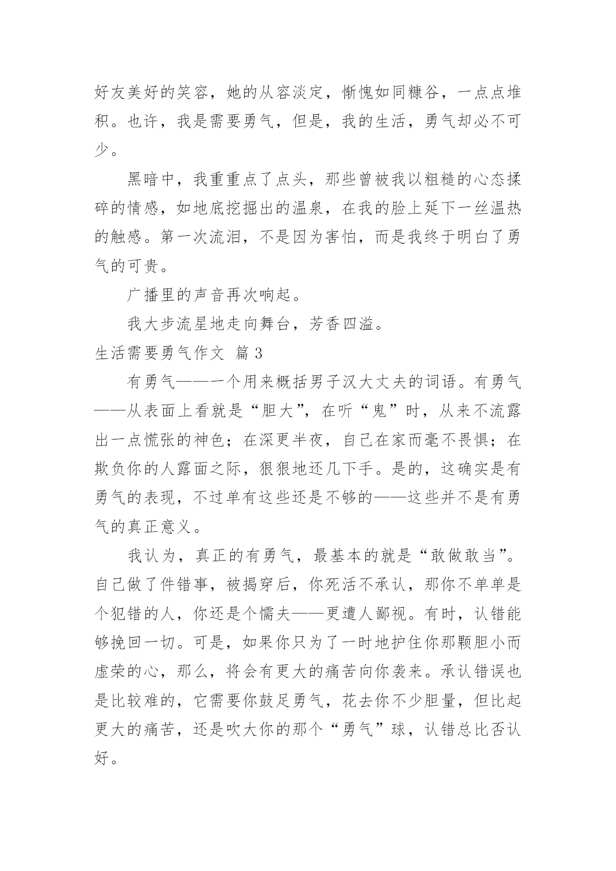 生活需要勇气作文精选生活需要勇气作文合集10篇在平凡的学习、工作、生活中,大家对作文都不陌生吧,写作文是培养人们的观察力、联想力、想象力、思考力和记忆力的重要手段。那么你知道一篇好的作文该怎么写吗?下面是小编为大家整理的生活需要勇气作文10篇,希望能够帮助到大家。生活需要勇气作文篇1在以前的生活中,我只是一个平平凡凡的孩子,我认为,只要紧跟大部队走就不会拉队。可是在现在看来,我当时的想法是错误的,因为在前几年,我是不会比普通同学多做一些事的,因此我对外也很少有交流对外人说话也缺乏自信和勇气,因此产生了孤僻。但是在几次锻炼的过程中,使我渐渐的学会了与外人交流。第一次,是在超市的询问。有一次我和同学一起为学校买本子,但本子的数量存在问题,所以我就习惯的让同我一起去的同学去打听打听,谁知她也不想去,并且还让我去问。现在的情况,只有我去了,我试探着去打听这本子的消息,可是这似乎对服务员丝毫没起作用。他不客气的喊了声:“本子就这些,没有多的了!”她的回答令我非常失望。一气之下,我又鼓起勇气,跑到两个服务员的旁边,问她借一电话用用,于是就联系上了杨老师,电话中得知:老师早已定下了本子的数量,于是借给我手机的服务员热心的去帮我找管理本子的服务员,她正在帮我们搬本子哪!这件事使我大大提高了自己的信心和勇气,从此以后我在同学面前都表现的比较大方、活泼。第二次,是在图书馆发生的事。我与同学共同完成暑假里需要做的研究性学习中的实践调查问卷项目。因此我和我们小组的同学来到了银座广场的京广书城进行调查,调查万卷总共20份,发起来真不容易,在我们小组里,有个比较好说话的,于是我们决定让他发10张,但是他的能力必定有限,经过好多人的拒绝,他似乎没大有信心了,于是发了5张就坚决不发了,还有剩下的15张呢!只有留给我和另一个腼腆的同学发了。紧接着,目标出现,就坐在我的身旁,我们谁也不想去,但也是实在不想丢掉这么好的目标,因此我的心情平静了一下,鼓起了勇气,装作很大方的样子上前说:“你好同学,请问你上几年级了?”我抱着一线希望(希望他是初中的)他自信的跟我说:“初一啦!”他的回答很让我欣慰。“请你帮我们填一下调查问卷吧。这是我们初中的作业。”我再次鼓起勇气地说。“好的。”“谢谢!”这一次,我向同学们打了个“ok”的手势,代表我的成功与勇敢,虽说这是一次很平常的对话,但对于当时的我是多么不平常!生活需要勇气作文篇2时间如同头顶上悬挂着的点滴瓶,一点点地流逝干净。夏日如同滚烫钢砂的风呼应着心跳的暖。抬头仰望天空,湛蓝湛蓝。深呼吸一口气,才发觉,手上已布满了一层细密的汗珠。“14号准备!”广播里的声音听起来毫无人情味。我的目光直视到手心里早已被揉成一团的号码条,偌大的两个数字,仿佛是对我华丽而直接的犀视。眼前是宽敞而空旷舞台,聚光灯流光溢彩,在某一个焦点熠熠生辉,多像一场梦境,它曾经吹红了无数少年的肩膀。我长吸一口气,虽然之前已作好了充分的准备,但还是心里没底。毕竟是第一次登台,怀揣一颗不安的心,把我折磨得将要窒息。“你紧张吗?”好友一声关切的话语,在我的内心注射了一股暖流,耳边红热滚烫。“还……还好吧!”我望向好友,她的瞳孔在灯光的照耀下有异样的'美,似乎有着糖浆般胶着的甜美。“别紧张,自信一点,勇气是很重要的哦!”附带着爽朗的笑意,眼睛弯弯的,象月牙一样可爱。“勇气”,这个词仿佛刺激了我某个神经,血液“哗啦啦”地涌向头顶。到底在纠结什么?到底还有什么无可循迹的惆怅?我暗自问自己。所谓舞台,不过就是一个焦点。壮阔天晨,寒暑枫露,经过了这么多天的演习,还有什么可以懦弱胆怯的呢?望向四周,那些曾和我并肩作战的战友们,他们笑靥如花。我们曾经是在一条黑白起跑线上的少年,不是么?想起好友美好的笑容,她的从容淡定,惭愧如同糠谷,一点点堆积。也许,我是需要勇气,但是,我的生活,勇气却必不可少。黑暗中,我重重点了点头,那些曾被我以粗糙的心态揉碎的情感,如地底挖掘出的温泉,在我的脸上延下一丝温热的触感。第一次流泪,不是因为害怕,而是我终于明白了勇气的可贵。广播里的声音再次响起。我大步流星地走向舞台,芳香四溢。生活需要勇气作文篇3有勇气——一个用来概括男子汉大丈夫的词语。有勇气——从表面上看就是“胆大”,在听“鬼”时,从来不流露出一点慌张的神色;在深更半夜,自己在家而毫不畏惧;在欺负你的人露面之际,狠狠地还几下手。是的,这确实是有勇气的表现,不过单有这些还是不够的——这些并不是有勇气的真正意义。我认为,真正的有勇气,最基本的就是“敢做敢当”。自己做了件错事,被揭穿后,你死活不承认,那你不单单是个犯错的人,你还是个懦夫——更遭人鄙视。有时,认错能够挽回一切。可是,如果你只为了一时地护住你那颗胆小而虚荣的心,那么,将会有更大的痛苦向你袭来。承认错误也是比较难的,它需要你鼓足勇气,花去你