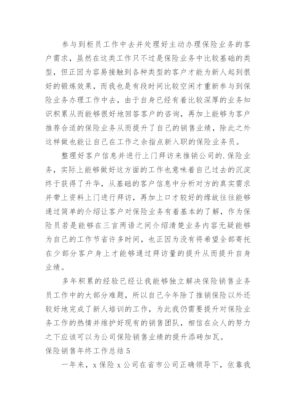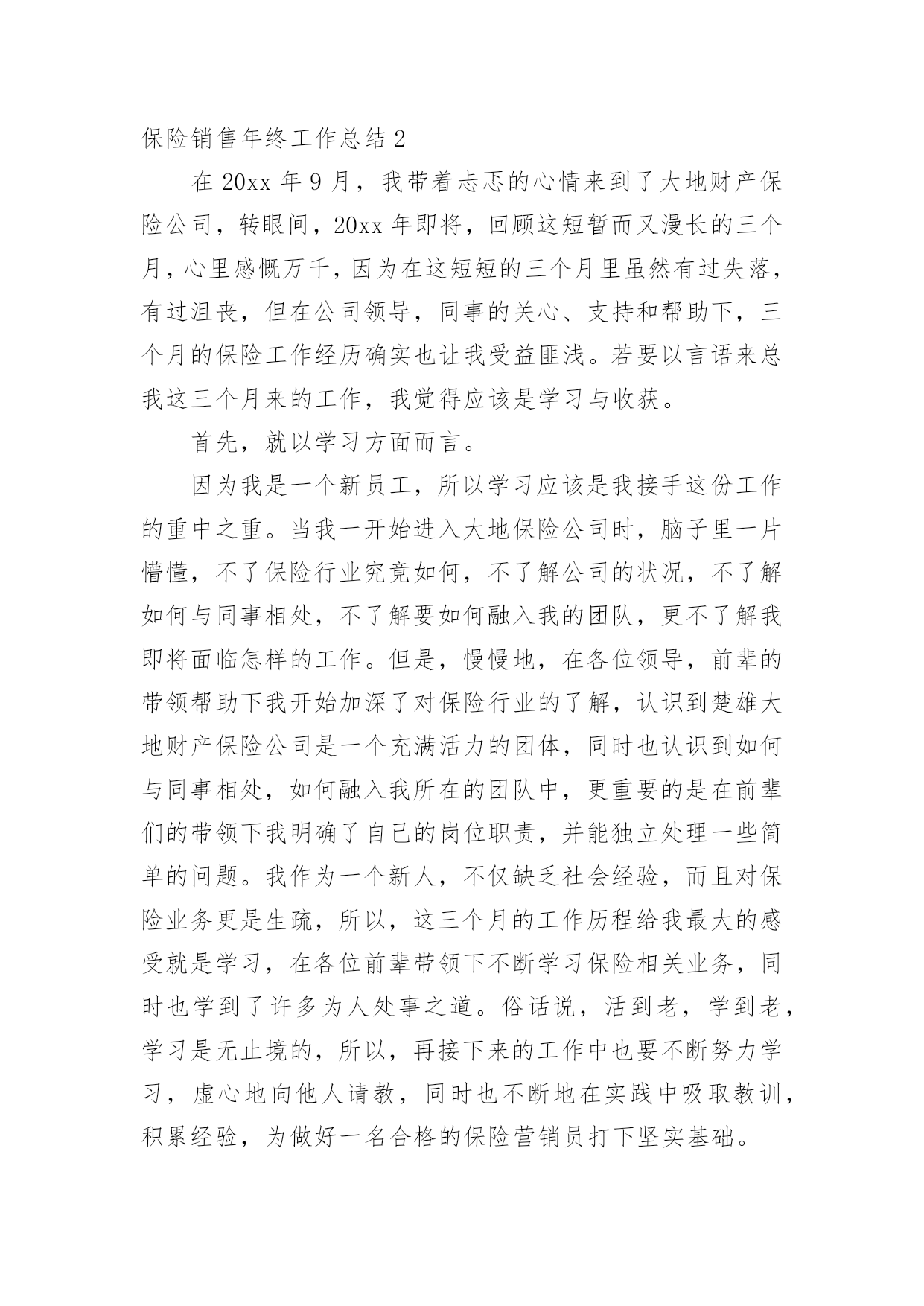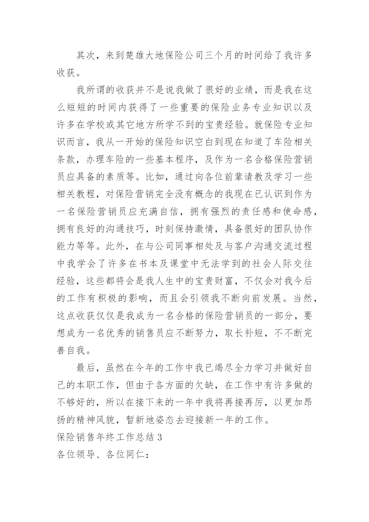保险销售年终工作总结保险销售年终工作总结总结是指社会团体、企业单位和个人对某一阶段的学习、工作或其完成情况加以回顾和分析,得出教训和一些规律性认识的一种书面材料,它可以促使我们思考,让我们一起认真地写一份总结吧。我们该怎么去写总结呢?下面是小编收集整理的保险销售年终工作总结,欢迎大家借鉴与参考,希望对大家有所帮助。保险销售年终工作总结1一年来,在公司领导的亲切关怀和其它主管的热情帮助下,自己从一个保险门外汉到能够很好的为客户提供保险咨询服务,在自己的业务岗位上,做到了无违规行为,和全司伙伴一起共同努力,较好地完成了领导和上级布置的各项工作任务。以下是本人一年来的工作情况总结。一、努力提高政治素养和思想道德水平积极参加上级公司和支公司、本部门组织的各种政治学习、主题教育、职业教育活动以及各项组织活动和文娱活动,没有无故缺席现象;能够坚持正确的政治方向,从各方面主动努力提高自身政治素养和思想道德水平,在思想上政治上都有所进步。二、努力提高业务素质和服务水平积极参加上级公司和支公司、本部门组织的各种业务学习培训和考试考核,勤于学习,善于创造,不断加强自身业务素质的训练,不断提高业务操作技能和为客户服务的基本功,掌握了应有的专业业务技能和服务技巧,能够熟练办理各种业务,知晓本公司经营的各项业务产品并能有针对性地开展宣传和促销。三、严格执行各项规章制度一年来,无论在办理业务还是其它的工作中,都能严格执行上级公司和支公司的各项规章制度、内控规定和服务规定,坚持使用文明用语,不越权办事,不以权谋私,没有出现被客户投诉的行为以及其它违规违章行为。业余生活检点,不参与不良行为。四、较好地完成支公司和本部门下达的各项工作任务一年来,能一直做到兢兢业业、勤勤恳恳地努力工作,上班早来晚走,立足岗位,默默奉献,积极完成支公司和本部门下达的各项工作任务。能够积极主支动关心本部门的各项营销工作和任务,积极营销电子银行业务和各种银行卡等及其它中介业务等。一年多来,本人凭着对保险事业的热爱,竭尽全力来履行自己的工作和岗位职责,努力按上级领导的要求做好各方面工作,取得了一定的成绩,也取得领导和同志们的好评。回首一年过来,在对取得成绩欣慰的同时,也发现存在一定的差距和不足。但我有信心和决心在今后的工作中努力查找差距,勇敢地克服缺点和不足,进一步提高自身综合素质,把该做的工作做实、做好。保险销售年终工作总结2在20xx年9月,我带着忐忑的心情来到了大地财产保险公司,转眼间,20xx年即将,回顾这短暂而又漫长的三个月,心里感慨万千,因为在这短短的三个月里虽然有过失落,有过沮丧,但在公司领导,同事的关心、支持和帮助下,三个月的保险工作经历确实也让我受益匪浅。若要以言语来总我这三个月来的工作,我觉得应该是学习与收获。首先,就以学习方面而言。因为我是一个新员工,所以学习应该是我接手这份工作的重中之重。当我一开始进入大地保险公司时,脑子里一片懵懂,不了保险行业究竟如何,不了解公司的状况,不了解如何与同事相处,不了解要如何融入我的团队,更不了解我即将面临怎样的工作。但是,慢慢地,在各位领导,前辈的带领帮助下我开始加深了对保险行业的了解,认识到楚雄大地财产保险公司是一个充满活力的团体,同时也认识到如何与同事相处,如何融入我所在的团队中,更重要的是在前辈们的带领下我明确了自己的岗位职责,并能独立处理一些简单的问题。我作为一个新人,不仅缺乏社会经验,而且对保险业务更是生疏,所以,这三个月的工作历程给我最大的感受就是学习,在各位前辈带领下不断学习保险相关业务,同时也学到了许多为人处事之道。俗话说,活到老,学到老,学习是无止境的,所以,再接下来的工作中也要不断努力学习,虚心地向他人请教,同时也不断地在实践中吸取教训,积累经验,为做好一名合格的保险营销员打下坚实基础。其次,来到楚雄大地保险公司三个月的时间给了我许多收获。我所谓的收获并不是说我做了很好的业绩,而是我在这么短短的时间内获得了一些重要的保险业务专业知识以及许多在学校或其它地方所学不到的宝贵经验。就保险专业知识而言,我从一开始的保险知识空白到现在知道了车险相关条款,办理车险的一些基本程序,及作为一名合格保险营销员应具备的素质等。比如,通过向各位前辈请教及学习一些相关教程,对保险营销完全没有概念的我现在已认识到作为一名保险营销员应充满自信,拥有强烈的责任感和使命感,拥有良好的沟通技巧,时刻保持激情,具备很好的团队协作能力等等。此外,在与公司同事相处及与客户沟通交流过程中我学会了许多在书本及课堂中无法学到的社会人际交往经验,这些都将会是我人生中的宝贵财富,不仅会对我今后的工作有积极的影响,而且会引领我不断向前发展。当然,这点收获仅仅是我成为一名合格的保险营销员的一部分,要想成为一名优秀的销售员应不断努力,取长补短,不不断完善自我。