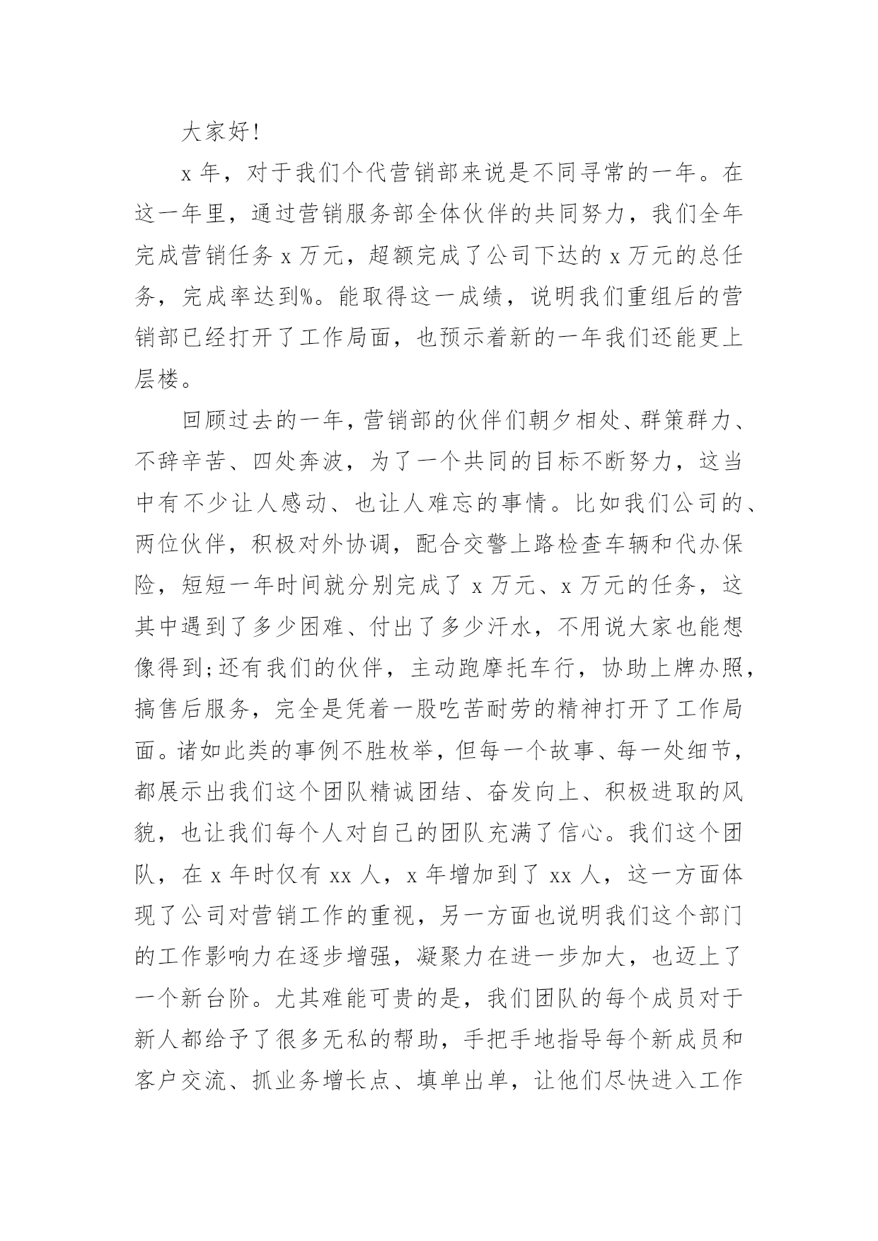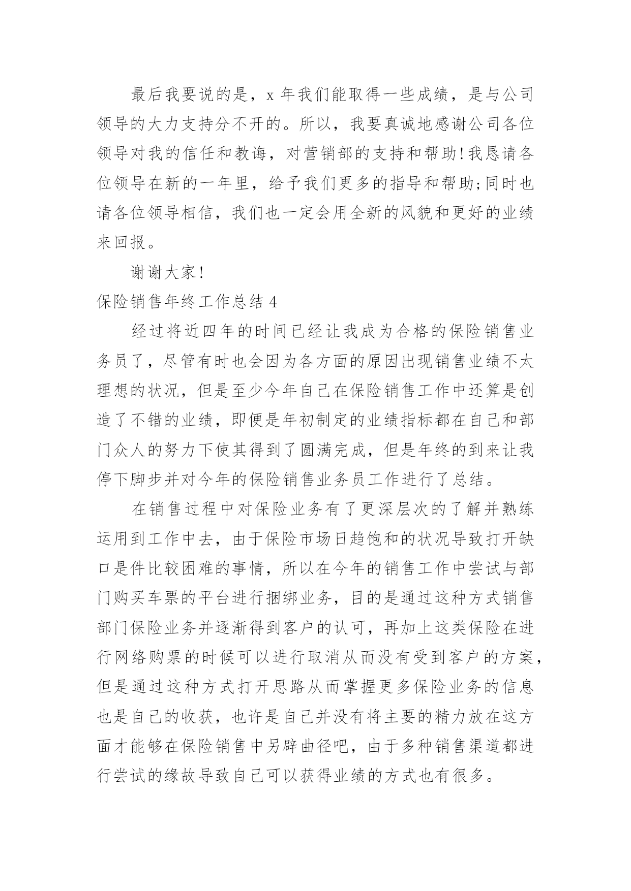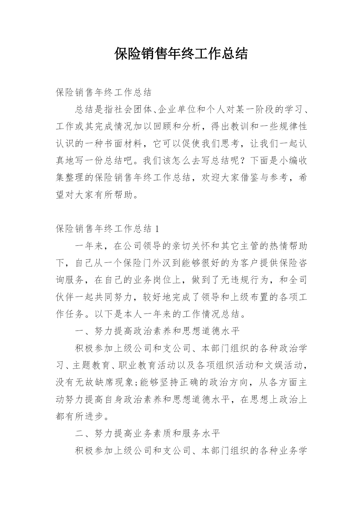 保险销售年终工作总结保险销售年终工作总结总结是指社会团体、企业单位和个人对某一阶段的学习、工作或其完成情况加以回顾和分析,得出教训和一些规律性认识的一种书面材料,它可以促使我们思考,让我们一起认真地写一份总结吧。我们该怎么去写总结呢?下面是小编收集整理的保险销售年终工作总结,欢迎大家借鉴与参考,希望对大家有所帮助。保险销售年终工作总结1一年来,在公司领导的亲切关怀和其它主管的热情帮助下,自己从一个保险门外汉到能够很好的为客户提供保险咨询服务,在自己的业务岗位上,做到了无违规行为,和全司伙伴一起共同努力,较好地完成了领导和上级布置的各项工作任务。以下是本人一年来的工作情况总结。一、努力提高政治素养和思想道德水平积极参加上级公司和支公司、本部门组织的各种政治学习、主题教育、职业教育活动以及各项组织活动和文娱活动,没有无故缺席现象;能够坚持正确的政治方向,从各方面主动努力提高自身政治素养和思想道德水平,在思想上政治上都有所进步。二、努力提高业务素质和服务水平积极参加上级公司和支公司、本部门组织的各种业务学习培训和考试考核,勤于学习,善于创造,不断加强自身业务素质的训练,不断提高业务操作技能和为客户服务的基本功,掌握了应有的专业业务技能和服务技巧,能够熟练办理各种业务,知晓本公司经营的各项业务产品并能有针对性地开展宣传和促销。三、严格执行各项规章制度一年来,无论在办理业务还是其它的工作中,都能严格执行上级公司和支公司的各项规章制度、内控规定和服务规定,坚持使用文明用语,不越权办事,不以权谋私,没有出现被客户投诉的行为以及其它违规违章行为。业余生活检点,不参与不良行为。四、较好地完成支公司和本部门下达的各项工作任务一年来,能一直做到兢兢业业、勤勤恳恳地努力工作,上班早来晚走,立足岗位,默默奉献,积极完成支公司和本部门下达的各项工作任务。能够积极主支动关心本部门的各项营销工作和任务,积极营销电子银行业务和各种银行卡等及其它中介业务等。一年多来,本人凭着对保险事业的热爱,竭尽全力来履行自己的工作和岗位职责,努力按上级领导的要求做好各方面工作,取得了一定的成绩,也取得领导和同志们的好评。回首一年过来,在对取得成绩欣慰的同时,也发现存在一定的差距和不足。但我有信心和决心在今后的工作中努力查找差距,勇敢地克服缺点和不足,进一步提高自身综合素质,把该做的工作做实、做好。保险销售年终工作总结2在20xx年9月,我带着忐忑的心情来到了大地财产保险公司,转眼间,20xx年即将,回顾这短暂而又漫长的三个月,心里感慨万千,因为在这短短的三个月里虽然有过失落,有过沮丧,但在公司领导,同事的关心、支持和帮助下,三个月的保险工作经历确实也让我受益匪浅。若要以言语来总我这三个月来的工作,我觉得应该是学习与收获。首先,就以学习方面而言。因为我是一个新员工,所以学习应该是我接手这份工作的重中之重。当我一开始进入大地保险公司时,脑子里一片懵懂,不了保险行业究竟如何,不了解公司的状况,不了解如何与同事相处,不了解要如何融入我的团队,更不了解我即将面临怎样的工作。但是,慢慢地,在各位领导,前辈的带领帮助下我开始加深了对保险行业的了解,认识到楚雄大地财产保险公司是一个充满活力的团体,同时也认识到如何与同事相处,如何融入我所在的团队中,更重要的是在前辈们的带领下我明确了自己的岗位职责,并能独立处理一些简单的问题。我作为一个新人,不仅缺乏社会经验,而且对保险业务更是生疏,所以,这三个月的工作历程给我最大的感受就是学习,在各位前辈带领下不断学习保险相关业务,同时也学到了许多为人处事之道。俗话说,活到老,学到老,学习是无止境的,所以,再接下来的工作中也要不断努力学习,虚心地向他人请教,同时也不断地在实践中吸取教训,积累经验,为做好一名合格的保险营销员打下坚实基础。其次,来到楚雄大地保险公司三个月的时间给了我许多收获。我所谓的收获并不是说我做了很好的业绩,而是我在这么短短的时间内获得了一些重要的保险业务专业知识以及许多在学校或其它地方所学不到的宝贵经验。就保险专业知识而言,我从一开始的保险知识空白到现在知道了车险相关条款,办理车险的一些基本程序,及作为一名合格保险营销员应具备的素质等。比如,通过向各位前辈请教及学习一些相关教程,对保险营销完全没有概念的我现在已认识到作为一名保险营销员应充满自信,拥有强烈的责任感和使命感,拥有良好的沟通技巧,时刻保持激情,具备很好的团队协作能力等等。此外,在与公司同事相处及与客户沟通交流过程中我学会了许多在书本及课堂中无法学到的社会人际交往经验,这些都将会是我人生中的宝贵财富,不仅会对我今后的工作有积极的影响,而且会引领我不断向前发展。当然,这点收获仅仅是我成为一名合格的保险营销员的一部分,要想成为一名优秀的销售员应不断努力,取长补短,不不断完善自我。