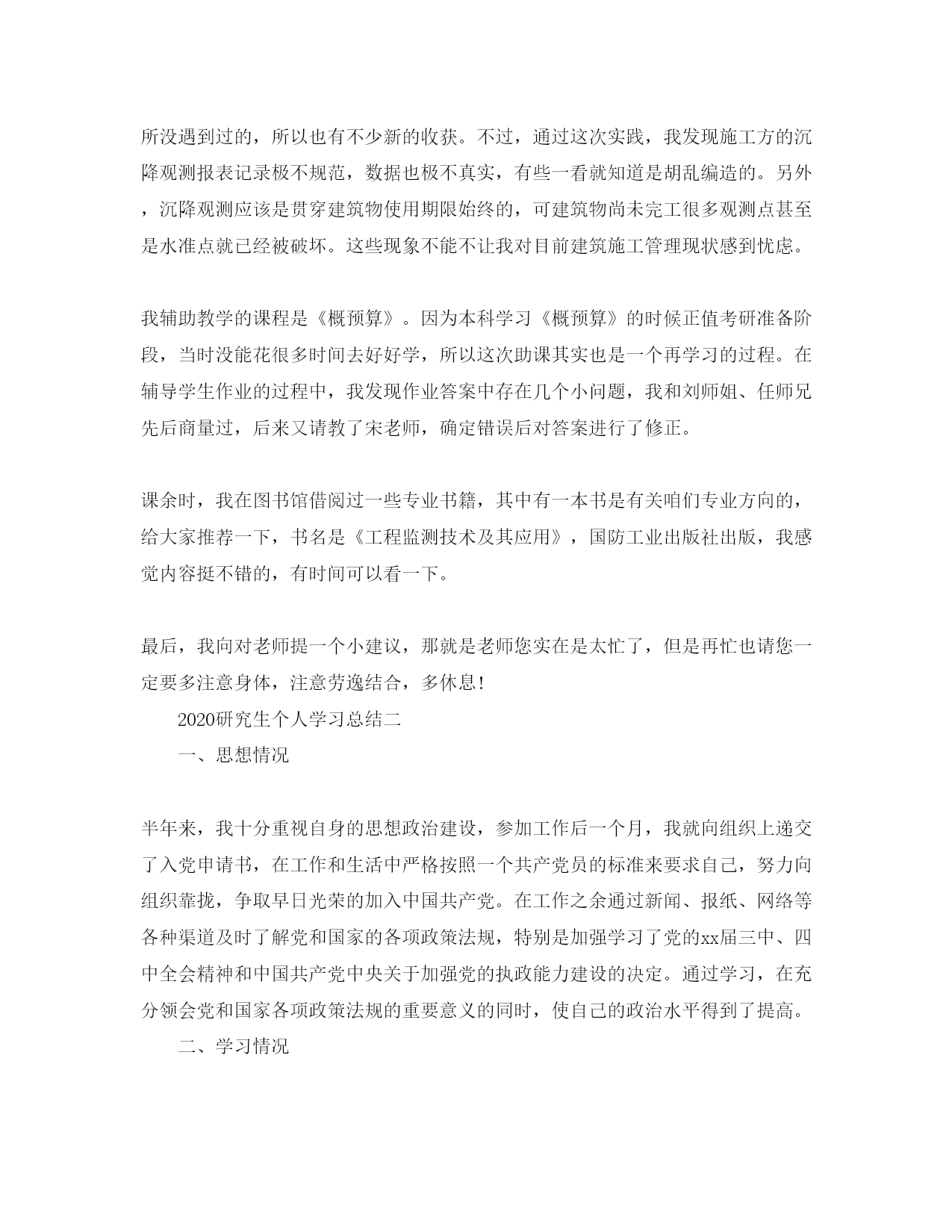 此资料由网络收集而来,如有侵权请告知上传者立即删除。资料共分享,我们负责传递知识。2020研究生个人学习工作总结2020研究生个人学习总结一不知不觉,作为一名研究生的第一个学期就这样结束了。总的来说,研究生生活较之本科有了更多的自由,因而也具有更大的自主性和自由发挥空间。更重要的是,实践的机会更多了,而且这种实践相对于本科的实习来说更具真实性。如果说把本科的实习看作是一个战地记者,能够看到滚滚硝烟,感受到枪林弹雨,那研究生阶段的实践就是一个拿着枪冲锋陷阵的战士了。这学期我一共学习了六门课程,包括科学社会主义理论与实践、自然辩证法、c++程序设计、数值分析、数理统计和随机过程。其中c++程序设计和数值分析两门课程老师讲起课来操着一口标准的河南话。虽然说我在河南也呆了四年多了,但有些河南话还是听不太懂,尤其是对方讲话比较快的时候。所以,这两门课程我在课余花的时间也比较多一点。我主要参与了郑大新区教师公寓楼的沉降观测项目。因为暑假跟着崔师兄在国贸进行了一个暑假的沉降观测,所以这次项目完成得也比较顺利。不过,这其中也遇到和发现了不少问题。首先是测量仪器问题。开始测量的时候,发现水准仪左读数和右读数得出的高差值总是相差很大,但两者差值基本上保持固定。我们几个对仪器经过几次测试和排查,最后确定是尺子的问题。原来测量实验室新买的铟钢尺和以前我们在工地使用过的铟钢尺刻度不一致。其次,这次测量的环境也比较复杂。该工程正处于外墙装修阶段,由于施工原因,很多观测点甚至水准点都被破坏。我们测量了三个组团一共是九个楼,但能用的水准点只有三个,其余的都需要引测。另外,由于建筑物周围地面尚未回填,有些观测点相对水准仪位置较高,所以只能加设转点,或者把仪器架在制高点甚至是阳台上。这些问题都是在国贸测量的时候所没遇到过的,所以也有不少新的收获。不过,通过这次实践,我发现施工方的沉降观测报表记录极不规范,数据也极不真实,有些一看就知道是胡乱编造的。另外,沉降观测应该是贯穿建筑物使用期限始终的,可建筑物尚未完工很多观测点甚至是水准点就已经被破坏。这些现象不能不让我对目前建筑施工管理现状感到忧虑。我辅助教学的课程是《概预算》。因为本科学习《概预算》的时候正值考研准备阶段,当时没能花很多时间去好好学,所以这次助课其实也是一个再学习的过程。在辅导学生作业的过程中,我发现作业答案中存在几个小问题,我和刘师姐、任师兄先后商量过,后来又请教了宋老师,确定错误后对答案进行了修正。课余时,我在图书馆借阅过一些专业书籍,其中有一本书是有关咱们专业方向的,给大家推荐一下,书名是《工程监测技术及其应用》,国防工业出版社出版,我感觉内容挺不错的,有时间可以看一下。最后,我向对老师提一个小建议,那就是老师您实在是太忙了,但是再忙也请您一定要多注意身体,注意劳逸结合,多休息!2020研究生个人学习总结二一、思想情况半年来,我十分重视自身的思想政治建设,参加工作后一个月,我就向组织上递交了入党申请书,在工作和生活中严格按照一个共产党员的标准来要求自己,努力向组织靠拢,争取早日光荣的加入中国共产党。在工作之余通过新闻、报纸、网络等各种渠道及时了解党和国家的各项政策法规,特别是加强学习了党的xx届三中、四中全会精神和中国共产党中央关于加强党的执政能力建设的决定。通过学习,在充分领会党和国家各项政策法规的重要意义的同时,使自己的政治水平得到了提高。二、学习情况作为一名刚刚走出校门的大学生,以前学到的知识并不能很好的跟当前的工作结合起来,只有更加努力地学习各种知识才能满足工作需要。因此,我没有放松对自己的要求,在学习方面的热情反而比任何时候都要高涨。今年月分配到党政办工作以来,我虚心向办公室的老同志学习有关办文、办会等业务知识,请教办公室有关工作的经验,月份,黄书记安排我到区委办公室跟班学习,系统地学习了公文写作、公文处理、信息搜集与发布等业务知识。在领导和同事们的关心和帮助下,我迅速适应了从学校到机关的转变,提高了自己的业务水平,基本熟悉了办公室的相关工作。三、工作情况一个从事办公室工作多年的老前辈曾对我说过,搞办公室工作"无过便是功"从他的话里我深刻体会到办公室的工作真的十分重要却又十分繁琐,做好办公室工作需要付出不懈的努力。今年月分配到党政办以来,我虚心学习各种相关知识,并在工作中得到了实践,取得了一定的成绩。一是参与了洪家山省级森林公园挂牌暨管理处成立庆典、企石公路通车庆典等活动的组织和准备工作;二是按领导要求撰写了各种报告、典型材料等余篇;三是参与编写了第一、二、三期的《简报》,其中发表各类通讯篇;四是积极锻炼自己的写作水平,在《XX日报》、《XX晚报》上发表了篇通讯。半年来,我努力学习各种知识和经验,在思想上对自己严格要求,在工作中积极肯干,取得了一定的成