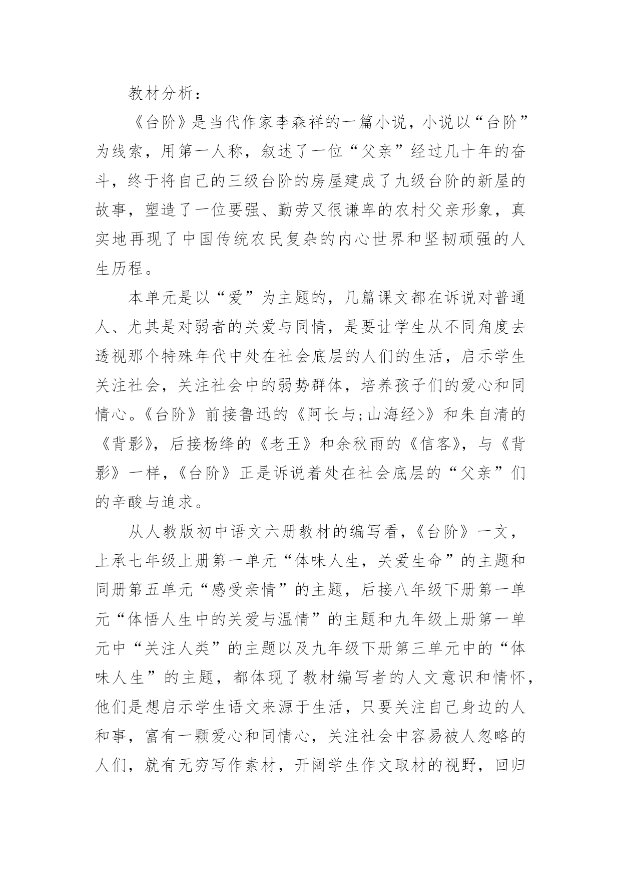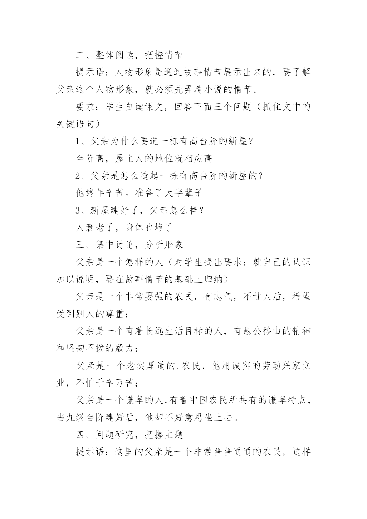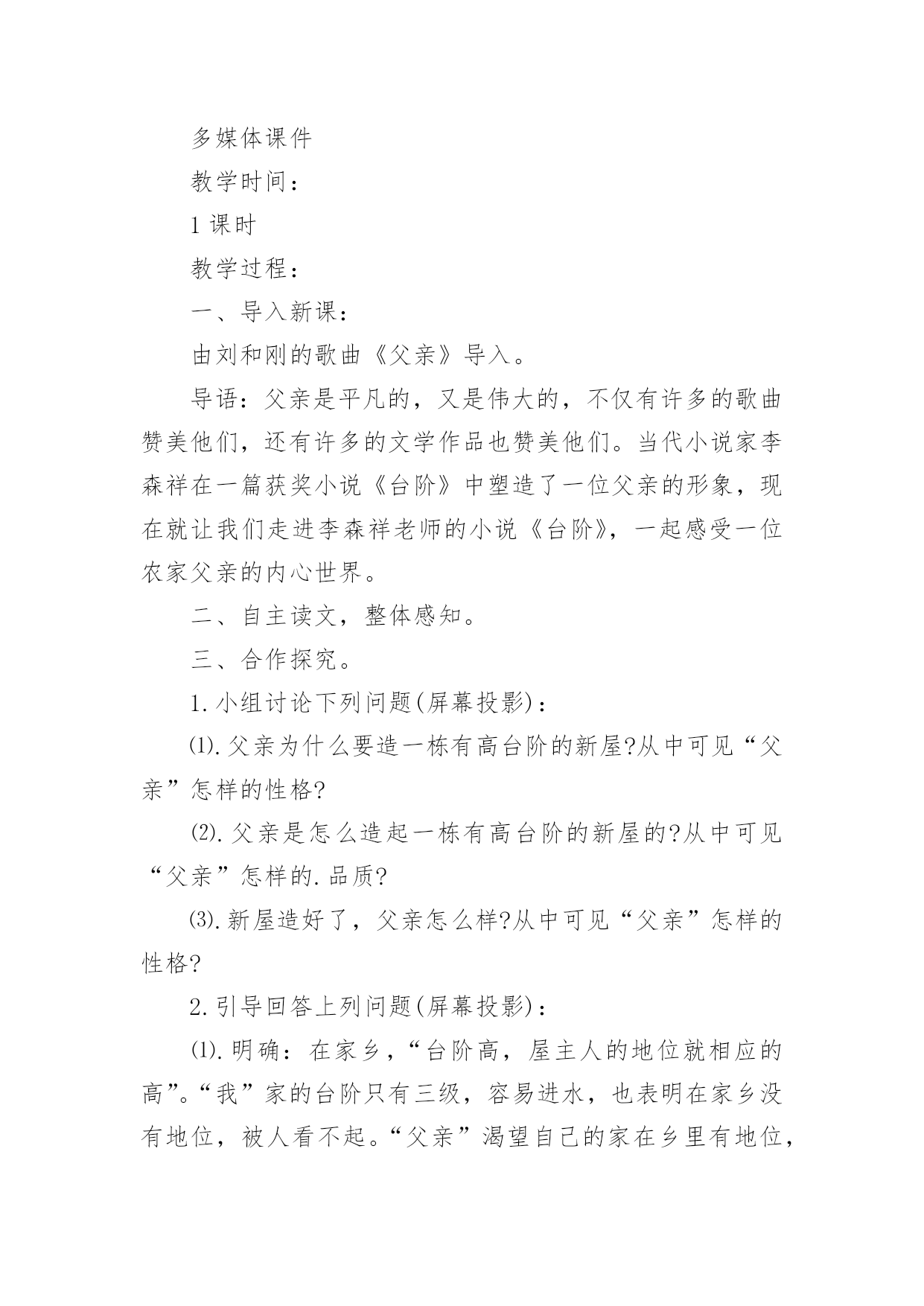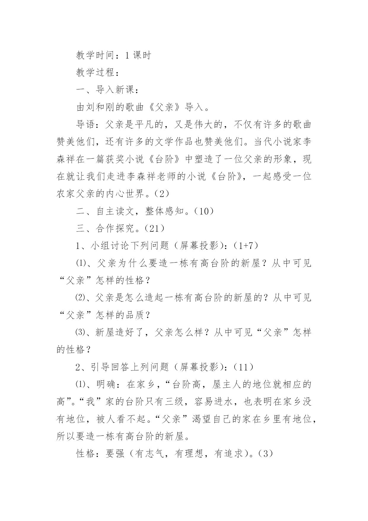 《台阶》教学设计作为一名优秀的教育工作者,编写教学设计是必不可少的,借助教学设计可以更好地组织教学活动。写教学设计需要注意哪些格式呢?以下是小编整理的《台阶》教学设计,欢迎阅读与收藏。《台阶》教学设计篇1教学目标:1.知识与能力:提高学生自主探究的能力;提高学生合作探究的能力;提高学生的阅读理解和口语表达能力。2.过程与方法:在掌握小说内容的过程中分析人物的性格和品质;在写“父亲”的过程中增添写作热情、提高写作水平。3.情感态度与价值观:感受文中“父亲”要强、谦卑的性格和勤劳的品质;感怀自己的父亲。教学重点:在掌握小说内容的过程中分析人物的性格和品质;写自己父亲的一个侧面。教学难点:感受文中“父亲”要强、谦卑的性格和勤劳的品质。教学方法:自主探究法、合作探究法、诱思探究法、。教学准备:多媒体课件教学时间:1课时教学过程:一、导入新课:由刘和刚的歌曲《父亲》导入。导语:父亲是平凡的,又是伟大的,不仅有许多的歌曲赞美他们,还有许多的文学作品也赞美他们。当代小说家李森祥在一篇获奖小说《台阶》中塑造了一位父亲的形象,现在就让我们走进李森祥老师的小说《台阶》,一起感受一位农家父亲的内心世界。二、自主读文,整体感知。三、合作探究。1.小组讨论下列问题(屏幕投影):⑴.父亲为什么要造一栋有高台阶的新屋?从中可见“父亲”怎样的性格?⑵.父亲是怎么造起一栋有高台阶的新屋的?从中可见“父亲”怎样的.品质?⑶.新屋造好了,父亲怎么样?从中可见“父亲”怎样的性格?2.引导回答上列问题(屏幕投影):⑴.明确:在家乡,“台阶高,屋主人的地位就相应的高”。“我”家的台阶只有三级,容易进水,也表明在家乡没有地位,被人看不起。“父亲”渴望自己的家在乡里有地位,所以要造一栋有高台阶的新屋。性格:要强(有志气,有理想,有追求)。⑵.明确:捡砖、拾瓦、砍柴、存角票、编草鞋、踏黄泥。性格:勤劳(吃苦耐劳)⑶.明确:他感到不自在,不对劲。性格:谦卑3.小结父亲的形象:“父亲”是一位很要强、勤劳而又谦卑的父亲。四、拓展延伸,实践演练。过渡语:文中“父亲”是一位要强、勤劳而又谦卑的父亲,他和我们许许多多的父亲一样,向着美好的生活不断的追求着,他坚韧顽强的品质怎能不让我们感动?他怎能不使我们想起家里的父亲?现在就让我们提起笔来,也来写写我们自己的父亲吧!1.提示(屏幕投影):最难忘的是父亲的时候,他。面对父亲,我要说:“________________。”2.组织全班交流。五、小结:父亲的故事是无声的,他用自己的行动默默地教育着我们。父亲的一生可能是平凡的,以至于我们不愿向他人谈起;父亲的一生可能是清贫的,以至于我们无法在别人面前炫耀。可在我们跌倒时,父亲教会我们怎样站立;在我们遇到困难时,鼓励我们勇敢的去面对。所以父亲是平凡的,又是伟大的。让我们在以后的生活中去关注我们平凡的父亲,也关注那些与父亲一样平凡的人们。《台阶》教学设计篇2教材依据:《台阶》是人教版八年级语文上册第二单元中的第三篇课文。设计思路:初中语文新课程标准要求“要重视学生思维能力的发展”、“要注重知识之间、能力之间以及知识、能力、情感之间的联系”,“养成默读习惯,有一定的速度,阅读一般的现代文每分钟不少于500字”,“应该重视语文的熏陶感染作用,注意教学内容的价值取向,同时也应尊重学生在学习过程中的独特体验”,“积极倡导自主、合作、探究的学习方式”,“对课文的内容和表达有自己的心得,能提出自己的看法和疑问,并能运用合作的方式,共同探讨疑难问题”,“多角度地观察生活,发现生活的丰富多彩,捕捉事物的特征,力求有创意地表达”。单元导语对单元教学的要求是:让学生“从课文中感悟到‘爱’这种博大的感情,从而陶冶自己的情操”,“熟读这些课文,从中了解叙述、描写等表达方式,揣摩记叙文语言的特点设计理念:根据新课标、教改探索(自主探究法、合作探究法、诱思探究法。)教材分析:《台阶》是当代作家李森祥的一篇小说,小说以“台阶”为线索,用第一人称,叙述了一位“父亲”经过几十年的奋斗,终于将自己的三级台阶的房屋建成了九级台阶的新屋的故事,塑造了一位要强、勤劳又很谦卑的农村父亲形象,真实地再现了中国传统农民复杂的内心世界和坚韧顽强的人生历程。本单元是以“爱”为主题的,几篇课文都在诉说对普通人、尤其是对弱者的关爱与同情,是要让学生从不同角度去透视那个特殊年代中处在社会底层的人们的生活,启示学生关注社会,关注社会中的弱势群体,培养孩子们的爱心和同情心。《台阶》前接鲁迅的《阿长与;山海经>》和朱自清的《背影》,后接杨绛的《老王》和余秋雨的《信客》,与《背影》一样,《台阶》正是诉说着处在社会底层的“父亲”们的辛酸与追求。从人教版初中语文六册教材的编写看,《台阶》一文,上承七年级上册第一单元“体味人生,关爱生命”的主题和同册第五单元“感受亲