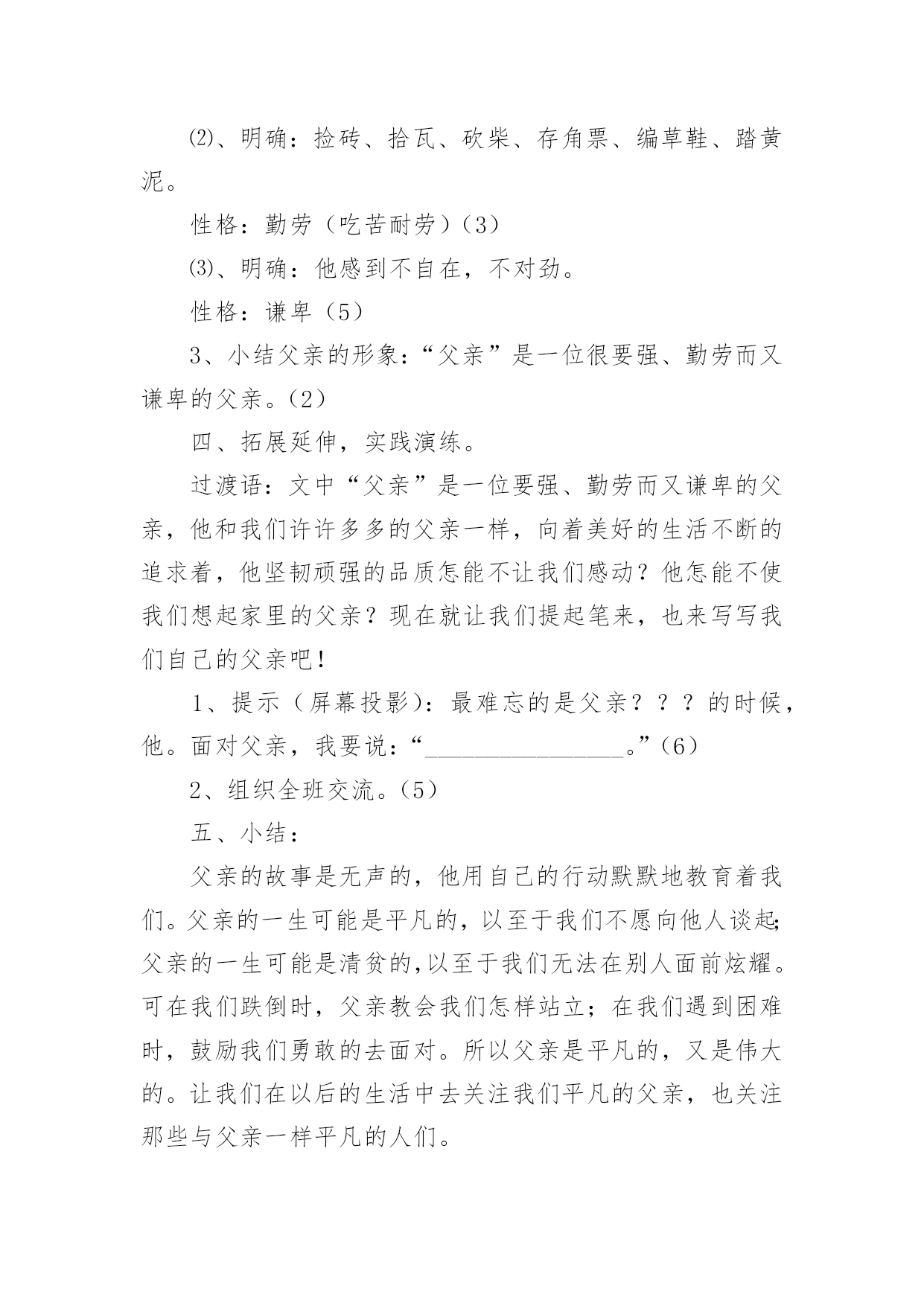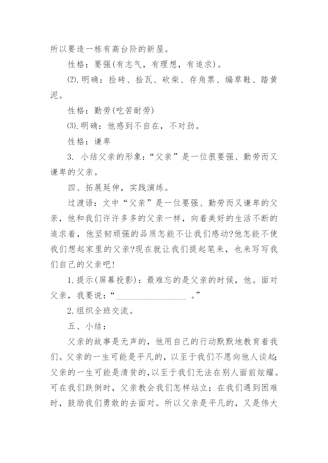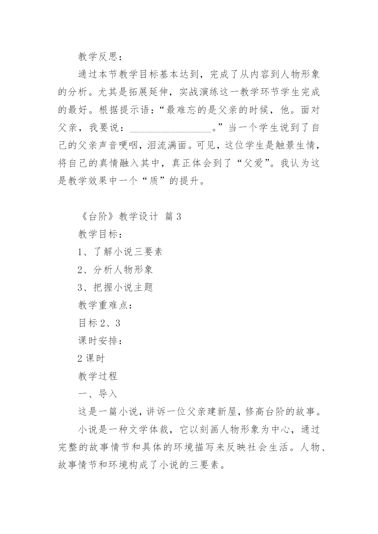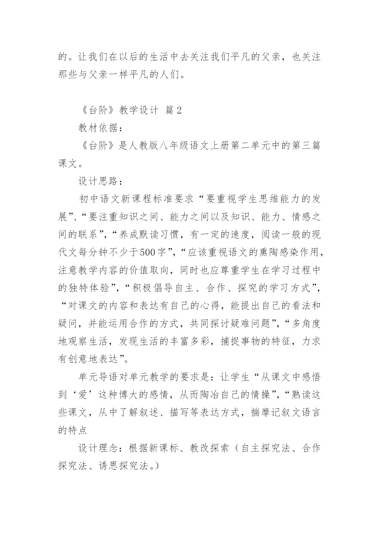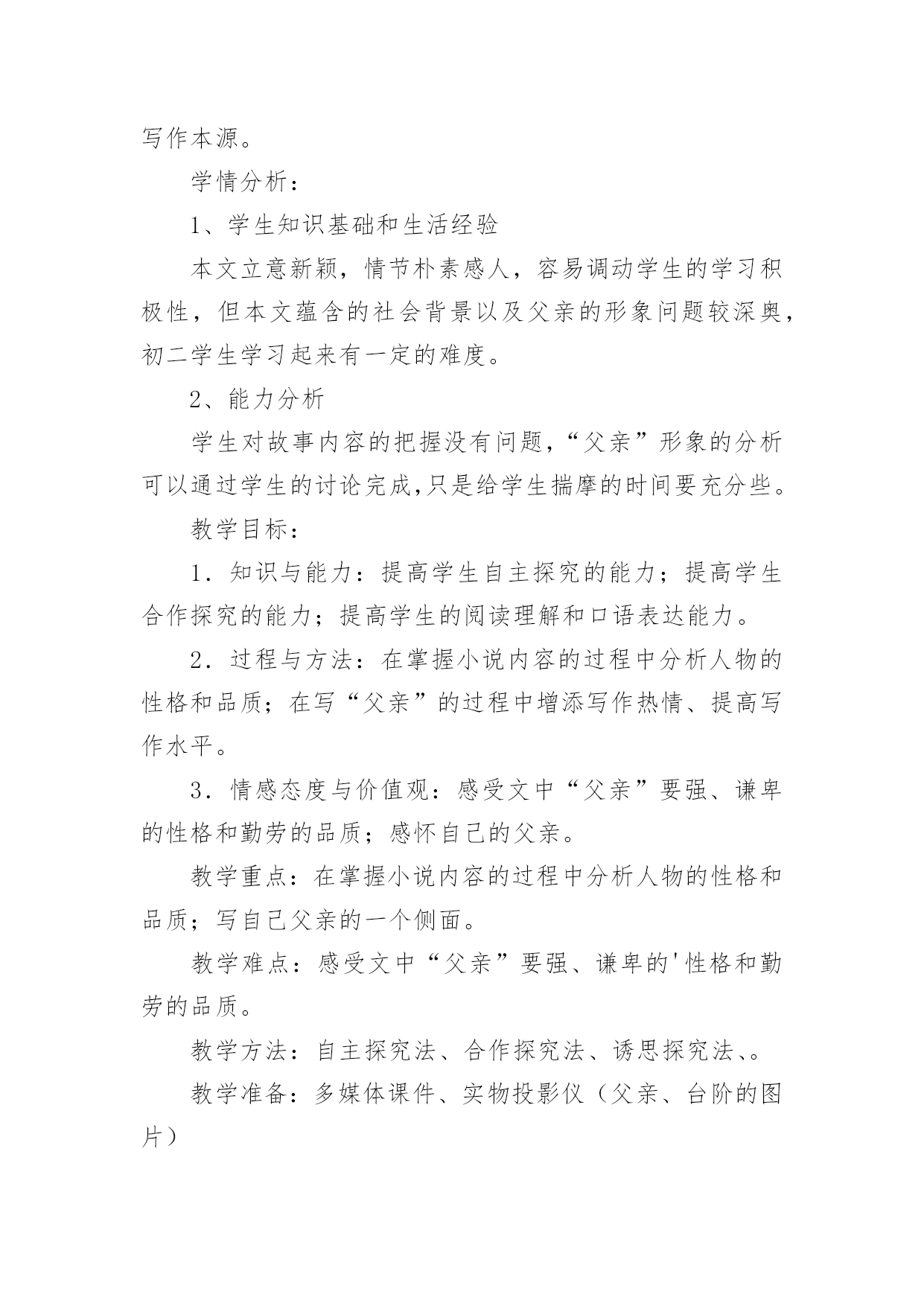 《台阶》教学设计作为一名优秀的教育工作者,编写教学设计是必不可少的,借助教学设计可以更好地组织教学活动。写教学设计需要注意哪些格式呢?以下是小编整理的《台阶》教学设计,欢迎阅读与收藏。《台阶》教学设计篇1教学目标:1.知识与能力:提高学生自主探究的能力;提高学生合作探究的能力;提高学生的阅读理解和口语表达能力。2.过程与方法:在掌握小说内容的过程中分析人物的性格和品质;在写“父亲”的过程中增添写作热情、提高写作水平。3.情感态度与价值观:感受文中“父亲”要强、谦卑的性格和勤劳的品质;感怀自己的父亲。教学重点:在掌握小说内容的过程中分析人物的性格和品质;写自己父亲的一个侧面。教学难点:感受文中“父亲”要强、谦卑的性格和勤劳的品质。教学方法:自主探究法、合作探究法、诱思探究法、。教学准备:多媒体课件教学时间:1课时教学过程:一、导入新课:由刘和刚的歌曲《父亲》导入。导语:父亲是平凡的,又是伟大的,不仅有许多的歌曲赞美他们,还有许多的文学作品也赞美他们。当代小说家李森祥在一篇获奖小说《台阶》中塑造了一位父亲的形象,现在就让我们走进李森祥老师的小说《台阶》,一起感受一位农家父亲的内心世界。二、自主读文,整体感知。三、合作探究。1.小组讨论下列问题(屏幕投影):⑴.父亲为什么要造一栋有高台阶的新屋?从中可见“父亲”怎样的性格?⑵.父亲是怎么造起一栋有高台阶的新屋的?从中可见“父亲”怎样的.品质?⑶.新屋造好了,父亲怎么样?从中可见“父亲”怎样的性格?2.引导回答上列问题(屏幕投影):⑴.明确:在家乡,“台阶高,屋主人的地位就相应的高”。“我”家的台阶只有三级,容易进水,也表明在家乡没有地位,被人看不起。“父亲”渴望自己的家在乡里有地位,所以要造一栋有高台阶的新屋。性格:要强(有志气,有理想,有追求)。⑵.明确:捡砖、拾瓦、砍柴、存角票、编草鞋、踏黄泥。性格:勤劳(吃苦耐劳)⑶.明确:他感到不自在,不对劲。性格:谦卑3.小结父亲的形象:“父亲”是一位很要强、勤劳而又谦卑的父亲。四、拓展延伸,实践演练。过渡语:文中“父亲”是一位要强、勤劳而又谦卑的父亲,他和我们许许多多的父亲一样,向着美好的生活不断的追求着,他坚韧顽强的品质怎能不让我们感动?他怎能不使我们想起家里的父亲?现在就让我们提起笔来,也来写写我们自己的父亲吧!1.提示(屏幕投影):最难忘的是父亲的时候,他。面对父亲,我要说:“________________。”2.组织全班交流。五、小结:父亲的故事是无声的,他用自己的行动默默地教育着我们。父亲的一生可能是平凡的,以至于我们不愿向他人谈起;父亲的一生可能是清贫的,以至于我们无法在别人面前炫耀。可在我们跌倒时,父亲教会我们怎样站立;在我们遇到困难时,鼓励我们勇敢的去面对。所以父亲是平凡的,又是伟大的。让我们在以后的生活中去关注我们平凡的父亲,也关注那些与父亲一样平凡的人们。《台阶》教学设计篇2教材依据:《台阶》是人教版八年级语文上册第二单元中的第三篇课文。设计思路:初中语文新课程标准要求“要重视学生思维能力的发展”、“要注重知识之间、能力之间以及知识、能力、情感之间的联系”,“养成默读习惯,有一定的速度,阅读一般的现代文每分钟不少于500字”,“应该重视语文的熏陶感染作用,注意教学内容的价值取向,同时也应尊重学生在学习过程中的独特体验”,“积极倡导自主、合作、探究的学习方式”,“对课文的内容和表达有自己的心得,能提出自己的看法和疑问,并能运用合作的方式,共同探讨疑难问题”,“多角度地观察生活,发现生活的丰富多彩,捕捉事物的特征,力求有创意地表达”。单元导语对单元教学的要求是:让学生“从课文中感悟到‘爱’这种博大的感情,从而陶冶自己的情操”,“熟读这些课文,从中了解叙述、描写等表达方式,揣摩记叙文语言的特点设计理念:根据新课标、教改探索(自主探究法、合作探究法、诱思探究法。)教材分析:《台阶》是当代作家李森祥的一篇小说,小说以“台阶”为线索,用第一人称,叙述了一位“父亲”经过几十年的奋斗,终于将自己的三级台阶的房屋建成了九级台阶的新屋的故事,塑造了一位要强、勤劳又很谦卑的农村父亲形象,真实地再现了中国传统农民复杂的内心世界和坚韧顽强的人生历程。本单元是以“爱”为主题的,几篇课文都在诉说对普通人、尤其是对弱者的关爱与同情,是要让学生从不同角度去透视那个特殊年代中处在社会底层的人们的生活,启示学生关注社会,关注社会中的弱势群体,培养孩子们的爱心和同情心。《台阶》前接鲁迅的《阿长与;山海经>》和朱自清的《背影》,后接杨绛的《老王》和余秋雨的《信客》,与《背影》一样,《台阶》正是诉说着处在社会底层的“父亲”们的辛酸与追求。从人教版初中语文六册教材的编写看,《台阶》一文,上承七年级上册第一单元“体味人生,关爱生命”的主题和同册第五单元“感受亲
