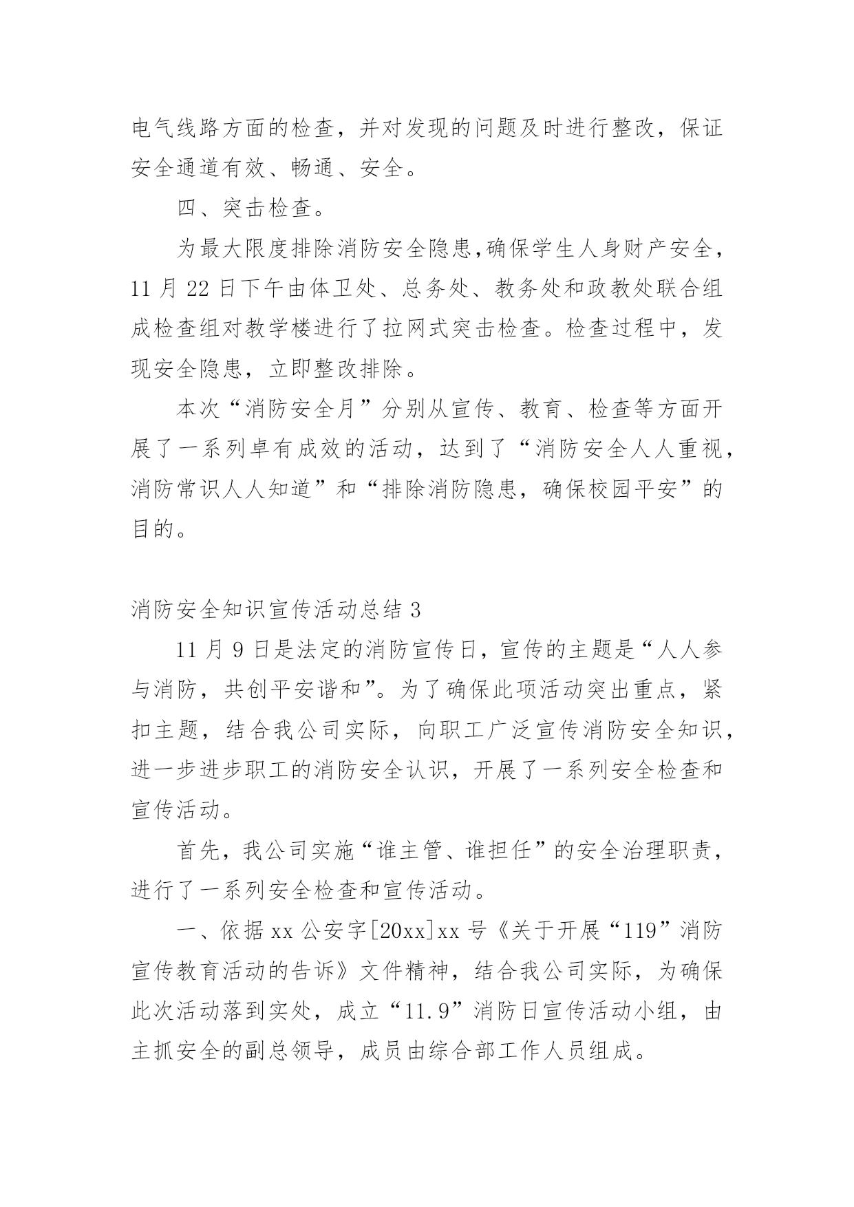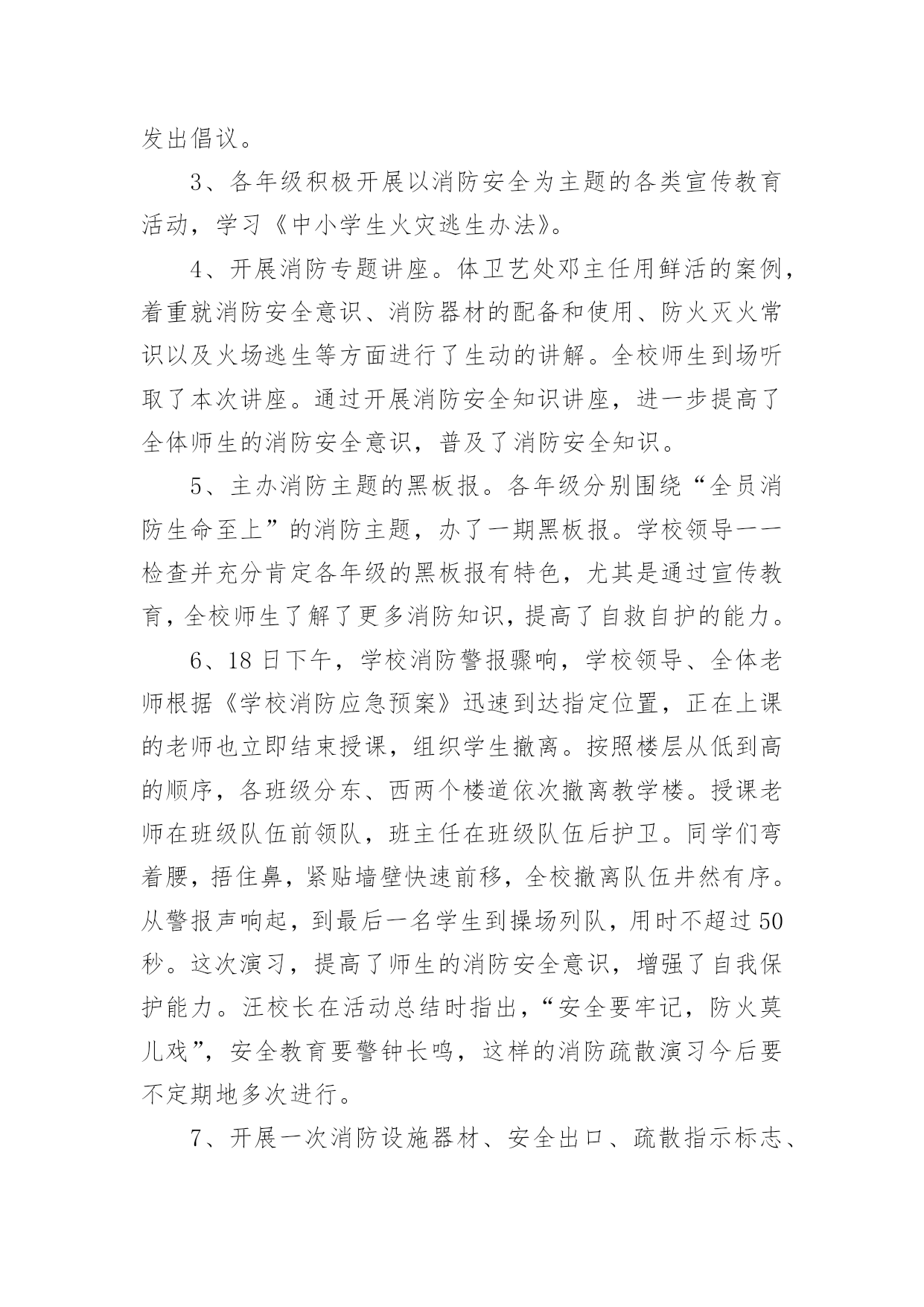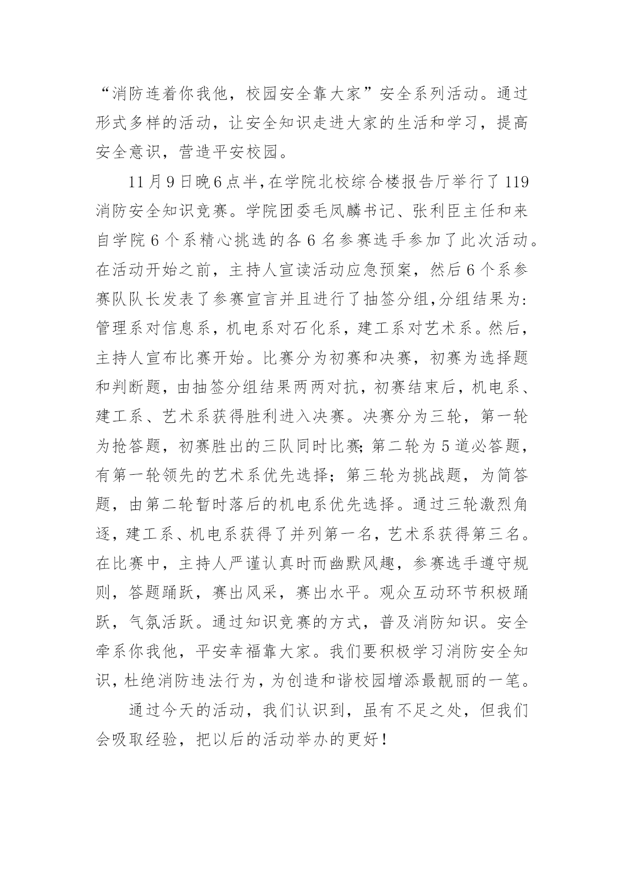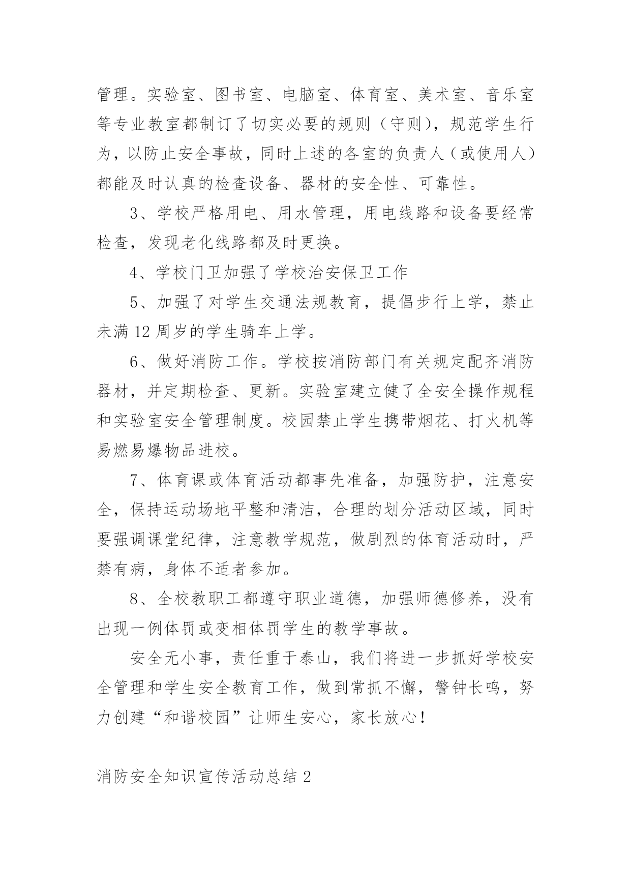 消防安全知识宣传活动总结总结是在某一特定时间段对学习和工作生活或其完成情况,包括取得的成绩、存在的问题及得到的经验和教训加以回顾和分析的书面材料,他能够提升我们的书面表达能力,让我们一起认真地写一份总结吧。总结怎么写才不会千篇一律呢?下面是小编收集整理的消防安全知识宣传活动总结,欢迎大家分享。消防安全知识宣传活动总结1安全无小事,责任重于泰山。我校狠抓学校安全管理和学生安全教育工作,切实落实学校安全责任制,强化薄弱环节的安全管理,全面排查可能出现的安全隐患为核心,严格贯彻落实学校安全工作计划,切实做好了学校的安全工作,x月份学校无一例安全责任事故。现总结如下:一、领导重视,责任意识强“健康安全第一,责任重于泰山”学校领导高度重视,校长亲自抓,分管副校长具体负责,组织和人员落实,强化学校安全组织管理、责任意识,加强安全工作的管理和督查,做到工作落实到人,职责明确,责任到人。学校分别与教师、学生家长签定了安全责任书,强化了安全意识。二、积极进行排查,消除事故隐患1、学校定期对学校用电情况、旧房安全情况进行检查,排除安全隐患。2、广大师生如发现有不安全情况,如电线破损、教室玻璃破损等情况,都及时上报,并及时安排人员进行修理。三、强化安全教育,提高师生自我保护能力安全工作重在预防,所以我们十分重视宣传教育工作,充分利用大队部,学科教学渗透等多种形式,针对学生心理、生理特点以及知识结构、认知能力的差异,开展安全教育活动。宣传教育的主要内容是让学生了解比较系统的防交通事故、防触电、防食物中毒、防病、防体育运动伤害、防火等安全知识,增强学生法制观念,掌握必要的自救自护技能。1、积极利用国旗下讲话机会,向学生宣传珍爱生命,注意安全。利用近期各地相继发生的楼梯间拥挤踩踏、学生乘坐无证客货车发生的重大交通事故、学校组织师生在公路上晨跑发生重大人员伤亡等事故,教育师生,从中吸取教育,增强师生安安观念,提高自我保护能力。2、班级每周安全专题教育雷打不动,每天放学一分钟提示,做到警钟长鸣。3、学校充分利用学校局域网,开展消防、饮食、预防冬春季呼吸道传染病及预防禽流感宣传教育。四、狠抓安全管理,零责任事故。1、高度重视学校周边环境问题,重点整治学校大门口和两侧的乱停车、乱摆摊点的问题,及时消除有碍学校周边秩序和学生安全的各类治安隐患。2、加强了学校各种教学设备、器材和生活设施的安全管理。实验室、图书室、电脑室、体育室、美术室、音乐室等专业教室都制订了切实必要的规则(守则),规范学生行为,以防止安全事故,同时上述的各室的负责人(或使用人)都能及时认真的检查设备、器材的安全性、可靠性。3、学校严格用电、用水管理,用电线路和设备要经常检查,发现老化线路都及时更换。4、学校门卫加强了学校治安保卫工作5、加强了对学生交通法规教育,提倡步行上学,禁止未满12周岁的学生骑车上学。6、做好消防工作。学校按消防部门有关规定配齐消防器材,并定期检查、更新。实验室建立健了全安全操作规程和实验室安全管理制度。校园禁止学生携带烟花、打火机等易燃易爆物品进校。7、体育课或体育活动都事先准备,加强防护,注意安全,保持运动场地平整和清洁,合理的划分活动区域,同时要强调课堂纪律,注意教学规范,做剧烈的体育活动时,严禁有病,身体不适者参加。8、全校教职工都遵守职业道德,加强师德修养,没有出现一例体罚或变相体罚学生的教学事故。安全无小事,责任重于泰山,我们将进一步抓好学校安全管理和学生安全教育工作,做到常抓不懈,警钟长鸣,努力创建“和谐校园”让师生安心,家长放心!消防安全知识宣传活动总结2为了认真贯彻《消防法》,普及消防安全知识,强化消防安全意识,提高消防安全技能,确保我校消防安全,我校根据上级有关文件精神要求,扎实开展消防安全月系列活动。现对具体工作总结如下:一、领导高度重视,安全意识增强。学校成立了以校长为组长,各部门负责人为成员的工作领导小组,并进行了详细分工;体卫艺处详细制定活动实施方案,并及时召开会议,安排部署学校消防安全工作;健全消防组织机构,安排了具体的负责人,落实了责任;完善了各项消防安全制度、实施办法及考核细则,形成了组织健全、制度完善、职责清晰、人人参与,学校、社会共同配合,整体联动的良好格局。二、精心组织,层层发动。深入动员以“全员消防、生命至上”为主题,以“珍爱生命”为主线,以“普及消防安全常识、增强法律意识,学会火灾逃生自救技能”为重点,以“杜绝亡人火灾和较大以上火灾事故,减少控制一般火灾事故”为目标,开展了师生全员参与的宣传教育培训活动,取得了较好的效果。学校自检、自查过程中,对照标准认真排查,找死角,查漏洞,对发现的消防安全隐患及时采取措施进行整改上报。三、活动形式多样,教育效果显著。1、在学校醒目的位置悬挂上“关注消防、珍爱生命”的消防宣传标语。2、11月