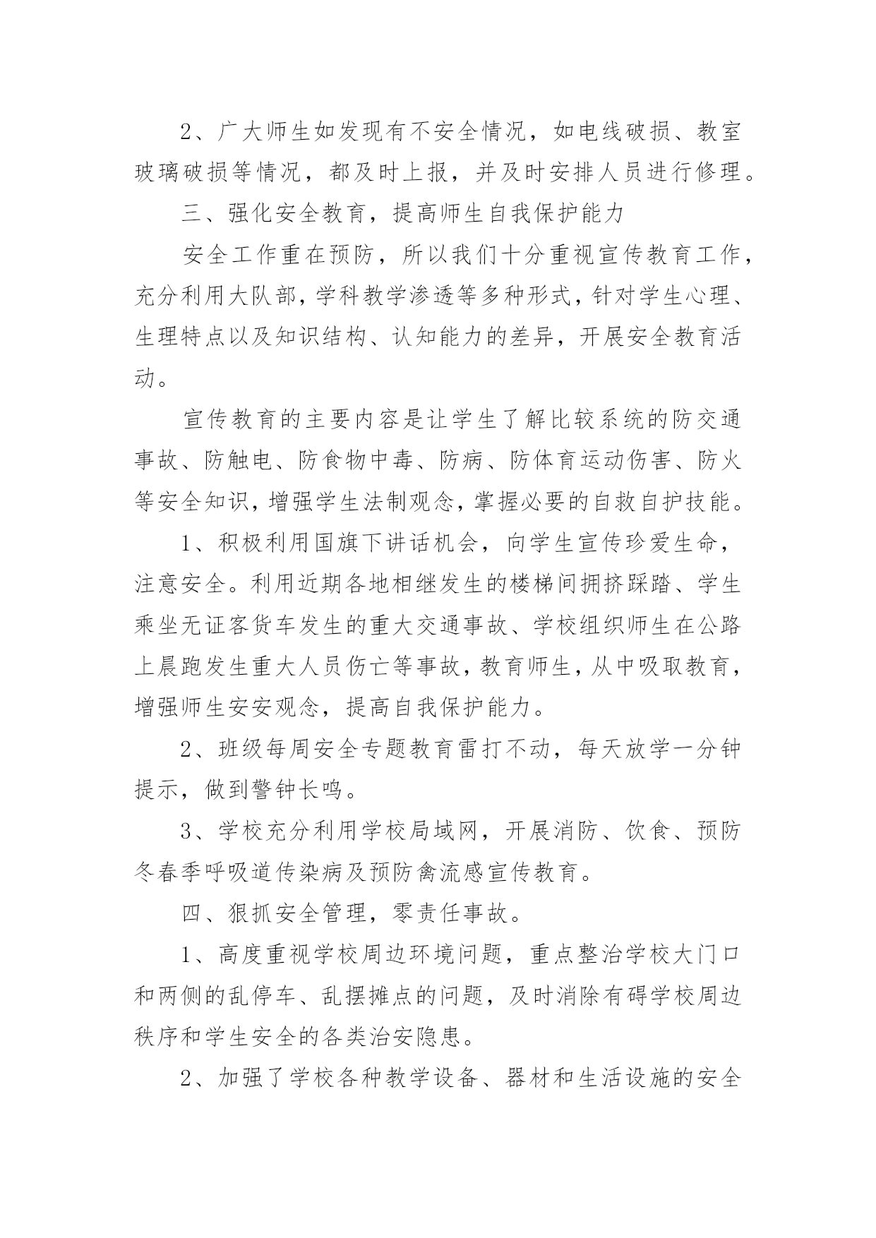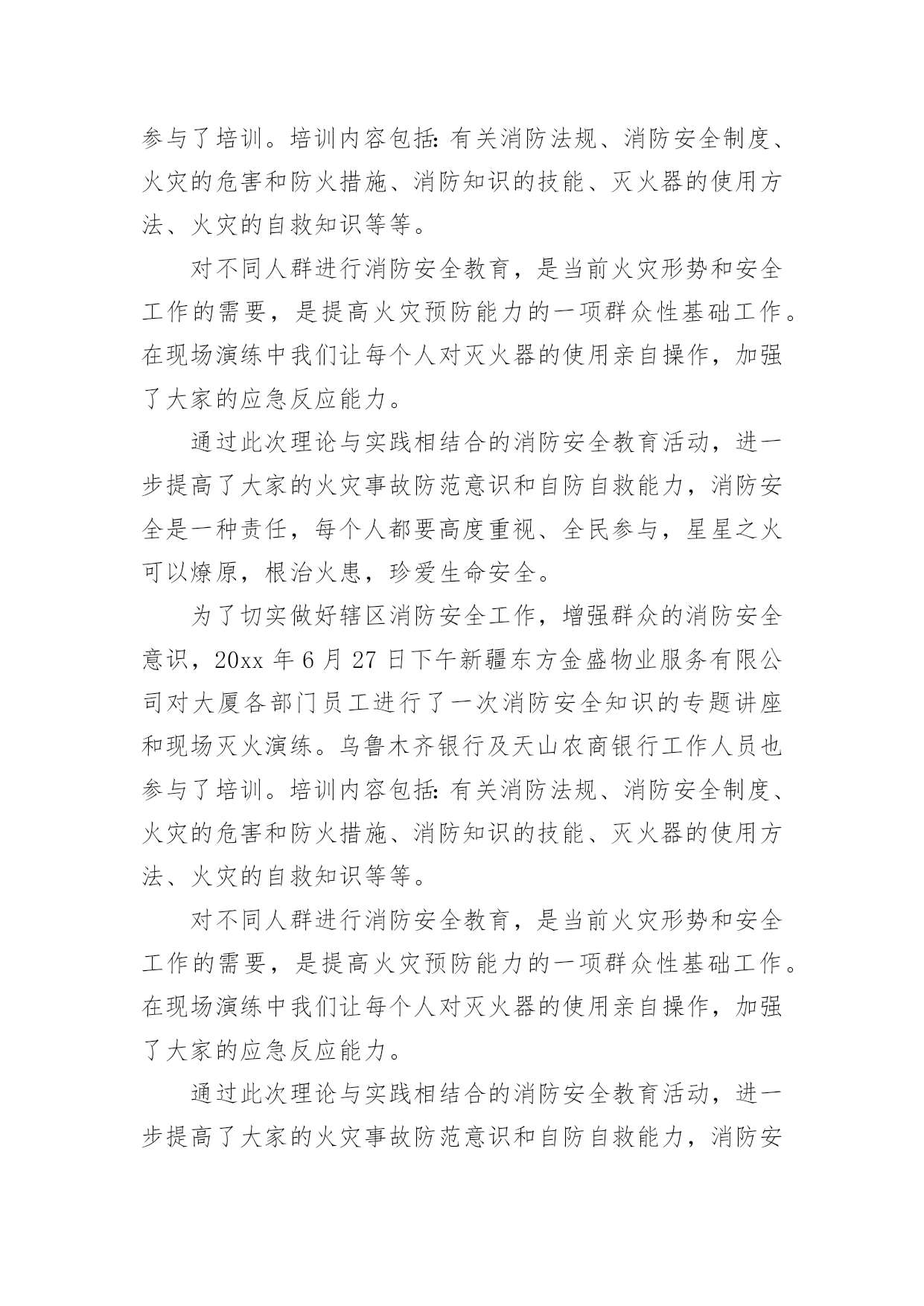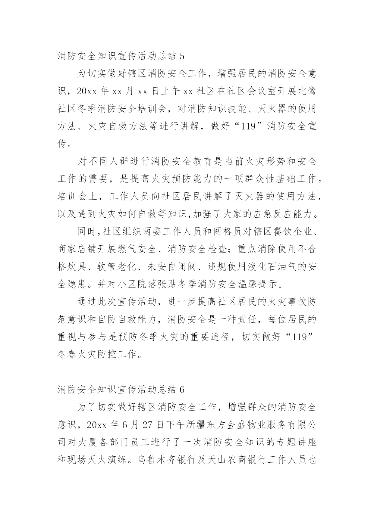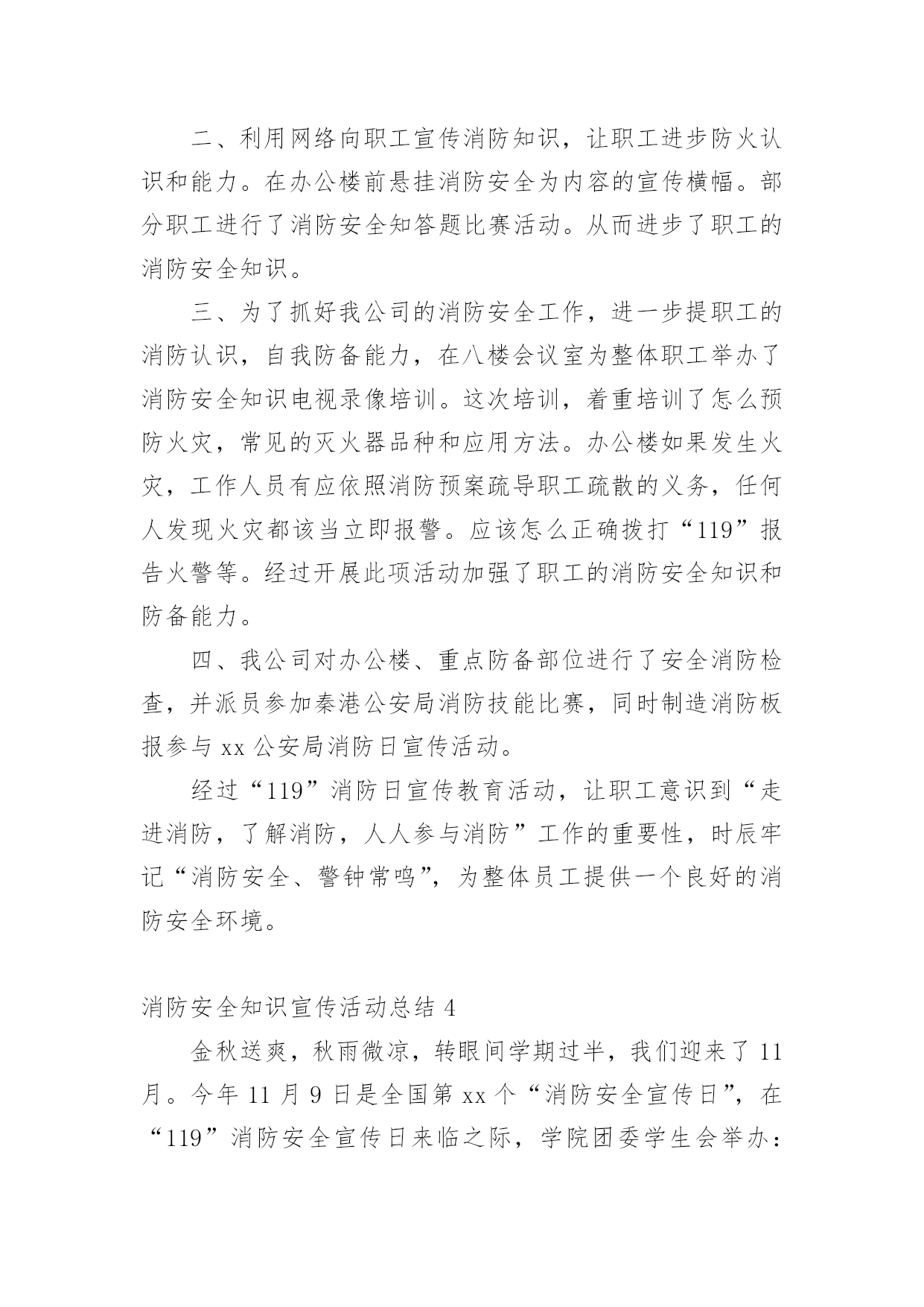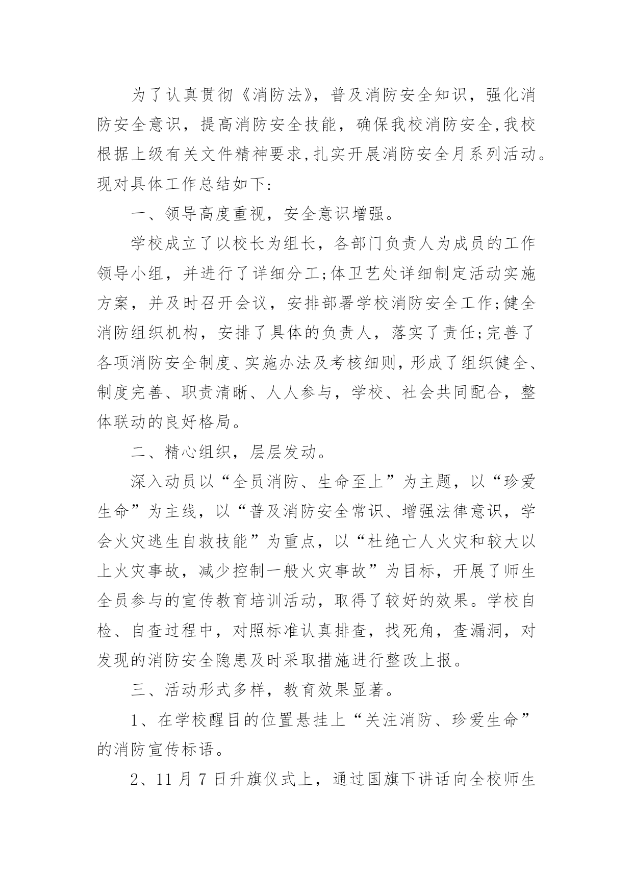 消防安全知识宣传活动总结总结是在某一特定时间段对学习和工作生活或其完成情况,包括取得的成绩、存在的问题及得到的经验和教训加以回顾和分析的书面材料,他能够提升我们的书面表达能力,让我们一起认真地写一份总结吧。总结怎么写才不会千篇一律呢?下面是小编收集整理的消防安全知识宣传活动总结,欢迎大家分享。消防安全知识宣传活动总结1安全无小事,责任重于泰山。我校狠抓学校安全管理和学生安全教育工作,切实落实学校安全责任制,强化薄弱环节的安全管理,全面排查可能出现的安全隐患为核心,严格贯彻落实学校安全工作计划,切实做好了学校的安全工作,x月份学校无一例安全责任事故。现总结如下:一、领导重视,责任意识强“健康安全第一,责任重于泰山”学校领导高度重视,校长亲自抓,分管副校长具体负责,组织和人员落实,强化学校安全组织管理、责任意识,加强安全工作的管理和督查,做到工作落实到人,职责明确,责任到人。学校分别与教师、学生家长签定了安全责任书,强化了安全意识。二、积极进行排查,消除事故隐患1、学校定期对学校用电情况、旧房安全情况进行检查,排除安全隐患。2、广大师生如发现有不安全情况,如电线破损、教室玻璃破损等情况,都及时上报,并及时安排人员进行修理。三、强化安全教育,提高师生自我保护能力安全工作重在预防,所以我们十分重视宣传教育工作,充分利用大队部,学科教学渗透等多种形式,针对学生心理、生理特点以及知识结构、认知能力的差异,开展安全教育活动。宣传教育的主要内容是让学生了解比较系统的防交通事故、防触电、防食物中毒、防病、防体育运动伤害、防火等安全知识,增强学生法制观念,掌握必要的自救自护技能。1、积极利用国旗下讲话机会,向学生宣传珍爱生命,注意安全。利用近期各地相继发生的楼梯间拥挤踩踏、学生乘坐无证客货车发生的重大交通事故、学校组织师生在公路上晨跑发生重大人员伤亡等事故,教育师生,从中吸取教育,增强师生安安观念,提高自我保护能力。2、班级每周安全专题教育雷打不动,每天放学一分钟提示,做到警钟长鸣。3、学校充分利用学校局域网,开展消防、饮食、预防冬春季呼吸道传染病及预防禽流感宣传教育。四、狠抓安全管理,零责任事故。1、高度重视学校周边环境问题,重点整治学校大门口和两侧的乱停车、乱摆摊点的问题,及时消除有碍学校周边秩序和学生安全的各类治安隐患。2、加强了学校各种教学设备、器材和生活设施的安全管理。实验室、图书室、电脑室、体育室、美术室、音乐室等专业教室都制订了切实必要的规则(守则),规范学生行为,以防止安全事故,同时上述的各室的负责人(或使用人)都能及时认真的检查设备、器材的安全性、可靠性。3、学校严格用电、用水管理,用电线路和设备要经常检查,发现老化线路都及时更换。4、学校门卫加强了学校治安保卫工作5、加强了对学生交通法规教育,提倡步行上学,禁止未满12周岁的学生骑车上学。6、做好消防工作。学校按消防部门有关规定配齐消防器材,并定期检查、更新。实验室建立健了全安全操作规程和实验室安全管理制度。校园禁止学生携带烟花、打火机等易燃易爆物品进校。7、体育课或体育活动都事先准备,加强防护,注意安全,保持运动场地平整和清洁,合理的划分活动区域,同时要强调课堂纪律,注意教学规范,做剧烈的体育活动时,严禁有病,身体不适者参加。8、全校教职工都遵守职业道德,加强师德修养,没有出现一例体罚或变相体罚学生的教学事故。安全无小事,责任重于泰山,我们将进一步抓好学校安全管理和学生安全教育工作,做到常抓不懈,警钟长鸣,努力创建“和谐校园”让师生安心,家长放心!消防安全知识宣传活动总结2为了认真贯彻《消防法》,普及消防安全知识,强化消防安全意识,提高消防安全技能,确保我校消防安全,我校根据上级有关文件精神要求,扎实开展消防安全月系列活动。现对具体工作总结如下:一、领导高度重视,安全意识增强。学校成立了以校长为组长,各部门负责人为成员的工作领导小组,并进行了详细分工;体卫艺处详细制定活动实施方案,并及时召开会议,安排部署学校消防安全工作;健全消防组织机构,安排了具体的负责人,落实了责任;完善了各项消防安全制度、实施办法及考核细则,形成了组织健全、制度完善、职责清晰、人人参与,学校、社会共同配合,整体联动的良好格局。二、精心组织,层层发动。深入动员以“全员消防、生命至上”为主题,以“珍爱生命”为主线,以“普及消防安全常识、增强法律意识,学会火灾逃生自救技能”为重点,以“杜绝亡人火灾和较大以上火灾事故,减少控制一般火灾事故”为目标,开展了师生全员参与的宣传教育培训活动,取得了较好的效果。学校自检、自查过程中,对照标准认真排查,找死角,查漏洞,对发现的消防安全隐患及时采取措施进行整改上报。三、活动形式多样,教育效果显著。1、在学校醒目的位置悬挂上“关注消防、珍爱生命”的消防宣传标语。2、11月