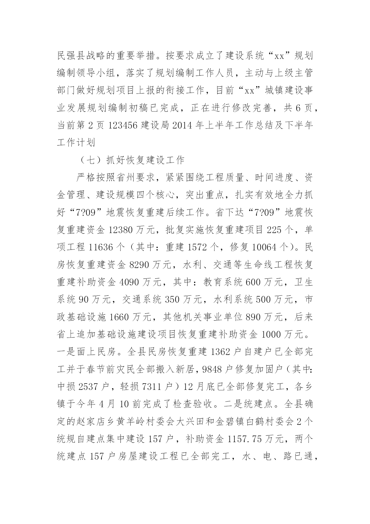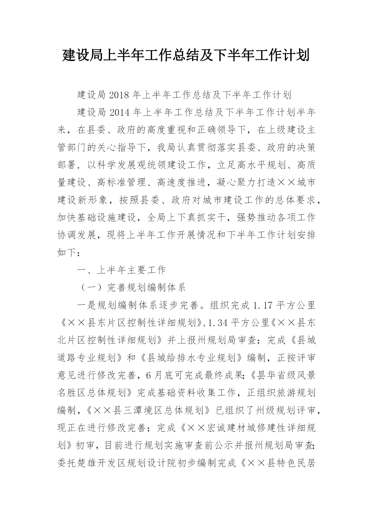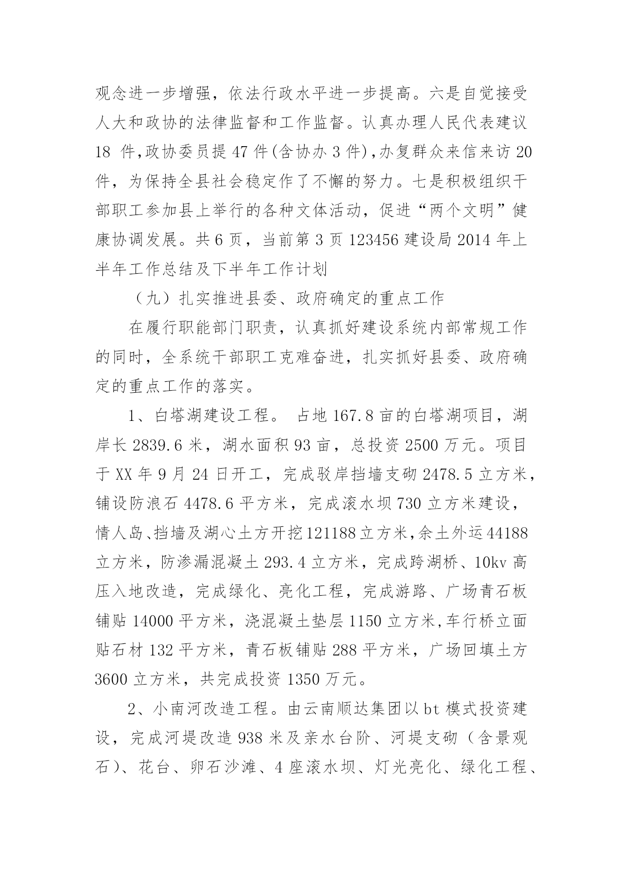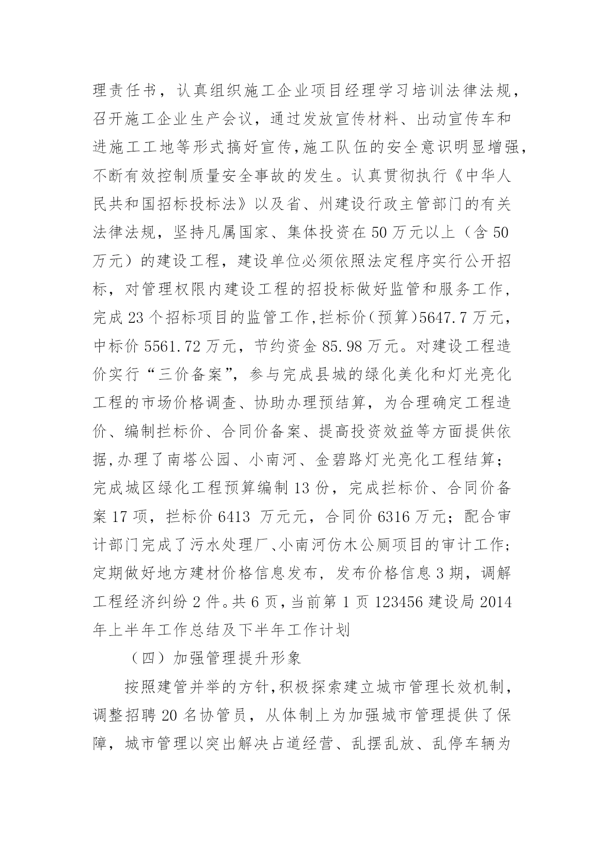 建设局上半年工作总结及下半年工作计划建设局2018年上半年工作总结及下半年工作计划建设局2014年上半年工作总结及下半年工作计划半年来,在县委、政府的高度重视和正确领导下,在上级建设主管部门的关心指导下,我局认真贯彻落实县委、政府的决策部署,以科学发展观统领建设工作,立足高水平规划、高质量建设、高标准管理、高速度推进,凝心聚力打造××城市建设新形象,按照县委、政府对城市建设工作的总体要求,加快基础设施建设,全局上下真抓实干,强势推动各项工作协调发展,现将上半年工作开展情况和下半年工作计划安排如下:一、上半年主要工作(一)完善规划编制体系一是规划编制体系逐步完善。组织完成1.17平方公里《××县东片区控制性详细规划》、1.34平方公里《××县东北片区控制性详细规划》并上报州规划局审查;完成《县城道路专业规划》和《县城给排水专业规划》编制,正按评审意见进行修改完善,6月底可完成最终成果;《昙华省级风景名胜区总体规划》完成基础资料收集工作,正组织旅游规划编制,《××县三潭境区总体规划》已组织了州级规划评审,现正在进行修改完善;完成《××宏诚建材城修建性详细规划》初审,目前进行规划实施审查前公示并报州规划局审查;委托楚雄开发区规划设计院初步编制完成《××县特色民居建筑方案》并进行了初评,草拟了《××县特色民居建设指导性意见》及《××县村庄规划编制实施方案》;督促相关建设单位抓紧对《××县“7?09”地震党政机关恢复建设项目修建性详细规划》、《百草岭峰业有限公司生产线技改项目修建性详细规划》、《欣杰食品有限公司修建性详细规划》、《宏城建材城修建性详细规划》的编制并按法定程序组织公示及报批。二是严格按照规划报批程序实行审查,规划的科学、民主决策机制进一步健全。按工程建设领域突出问题专项治理工作要求,适时深入施工现场开展规划执行情况核查,严防房地产开发项目擅自变更规划、调整容积率等违法违规问题的发生,做好金福苑、金碧郦园、顺达苑等房地产开发项目的规划管理及县城垃圾处理场、污水处理厂、百草岭大街、经四路、西河改造和廉租房建设等重点市政工程项目的定点放线技术服务工作。积极推行规划审批公示制度,增强规划透明度,打造“阳光”规划。三是规划建设管理机构得到加强,规划管理工作进一步规范。严格执行“一书两证”办理。核发县城规划区内《建设项目选址意见书》23份,《建设用地规划许可证》10份,《建设工程规划许可证》29份。加强对白塔文化广场、永胜新城一期商住小区住户侵占公共场地乱搭乱建、业主违规加层、改造外立面以及县城规划区住户违反规划进行新建改建住房的监管,立案查处并移交法院强制执行2件,发出停建通知5份。(二)加大基础设施建设不断加大城市基础设施建设,实施以白塔湖项目、小南河改造(包括灯光亮化、绿化工程)为主的水体景观项目;以垃圾处理场建设及污水处理厂为主的环境治理项目;西河河道改造,碧鸡坊及碧鸡广场项目,环城西路(即工业大道)混凝土道路及路灯、绿化、给排水配套建设项目,城区强弱电线入地建设项目,城北福达短途客运市场建设项目,核桃文化产业园建设项目,县城校场路建设工程项目,集会议、餐饮、娱乐为一体的咪依噜大酒店建设项目,城区供水管道改造建设项目,建材市场一条街建设项目(包括街道建设和专业建材市场建设),以经四路、百草岭大街、滨河北路和滨河南路、龙祥路、南塔路等为主的城市路网建设项目,经四路西河桥建设工程和百草岭大街西河桥建设工程为主的配套桥涵建设项目。(三)规范工程建设领域加大建筑市场的整顿力度,高度重视工程招投标及有形建筑市场建设,不断加强建设工程质量的监督管理,共参与监督工程项目103个(含转接),建筑面积32.74万平方米,总投资3.8亿元,监督过程中严格按照《建设工程质量管理条例》,《建筑法》,《监督工作导则》的要求开展工作,对各方责任主体的资质,资格进行严格要求的核查,对施工现场中出现的问题督促施工单位进行及时整改,对违反相关法律法规的行为发出整改通知共6份,并要求相关责任主体进行回复,参与处理用户质量投诉6起,都已落实解决。严格执行建设项目目标管理、建立健全并落实安全生产工作管理责任制,加强建筑施工企业安全质量监管,签订安全目标管理责任书,认真组织施工企业项目经理学习培训法律法规,召开施工企业生产会议,通过发放宣传材料、出动宣传车和进施工工地等形式搞好宣传,施工队伍的安全意识明显增强,不断有效控制质量安全事故的发生。认真贯彻执行《中华人民共和国招标投标法》以及省、州建设行政主管部门的有关法律法规,坚持凡属国家、集体投资在50万元以上(含50万元)的建设工程,建设单位必须依照法定程序实行公开招标,对管理权限内建设工程的招投标做好监管和服务工作,完成23个招标项目的监管工作,拦标价(预算)5647.7万元,中标价5561.72万元,节约资金8