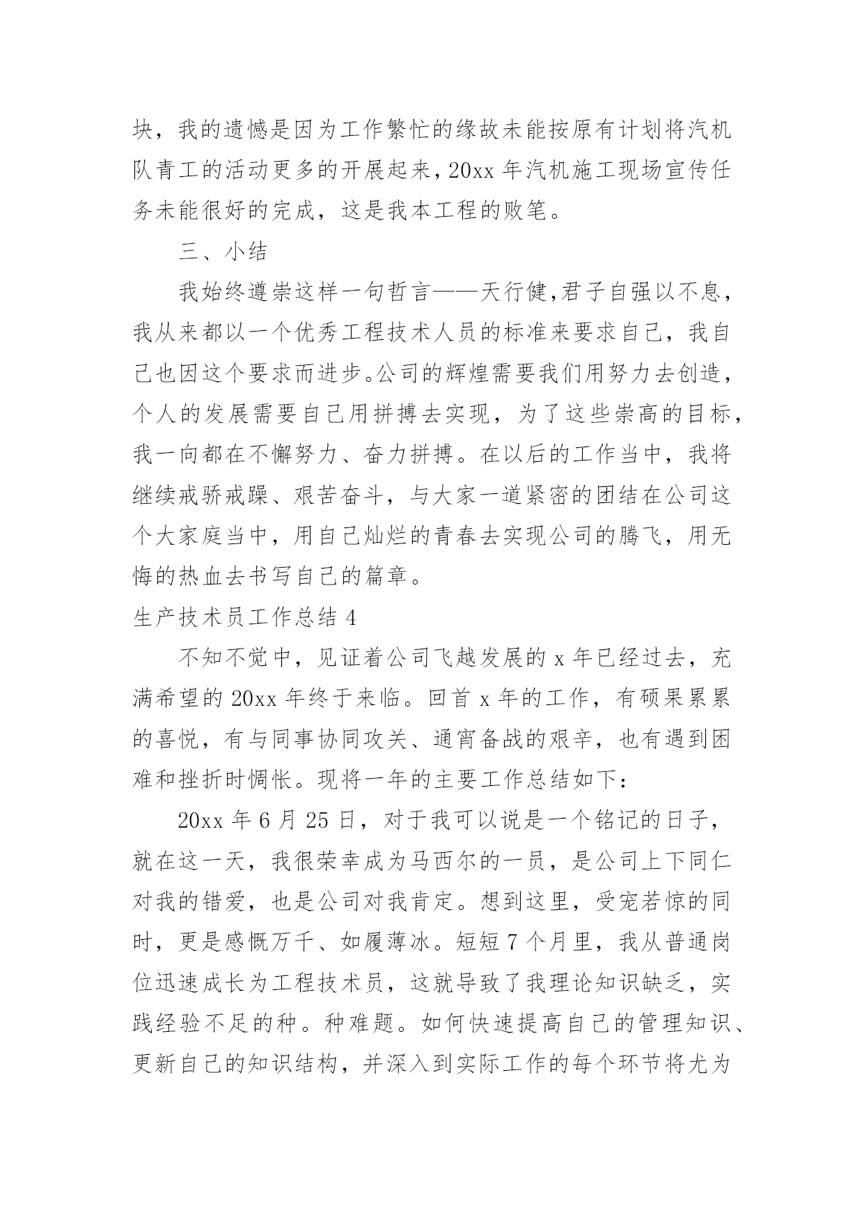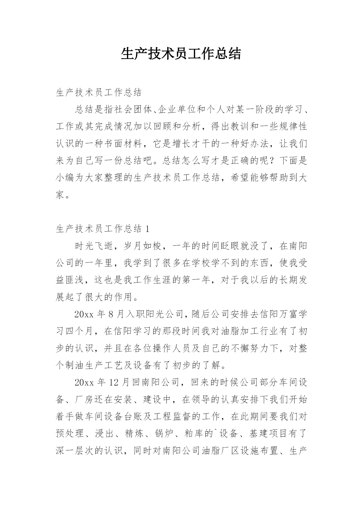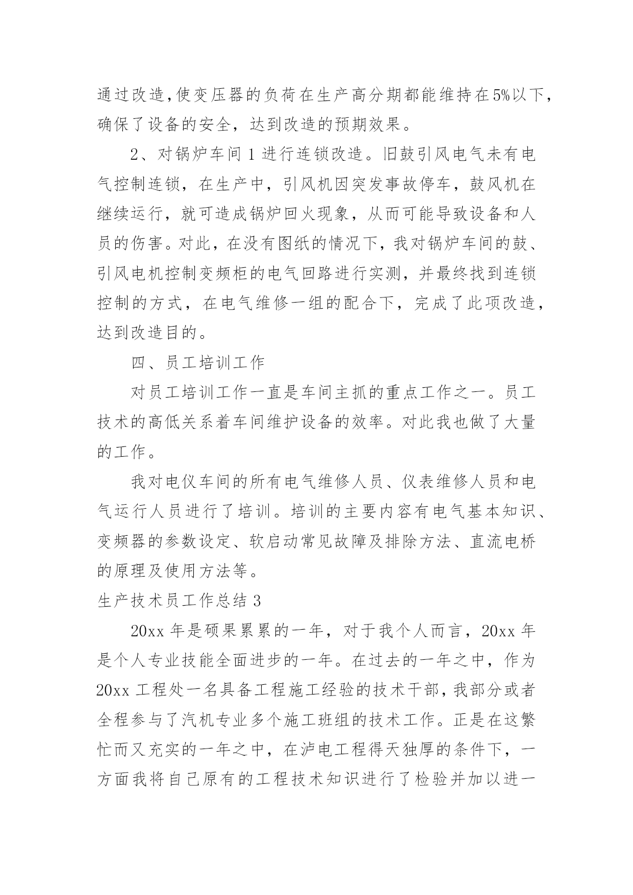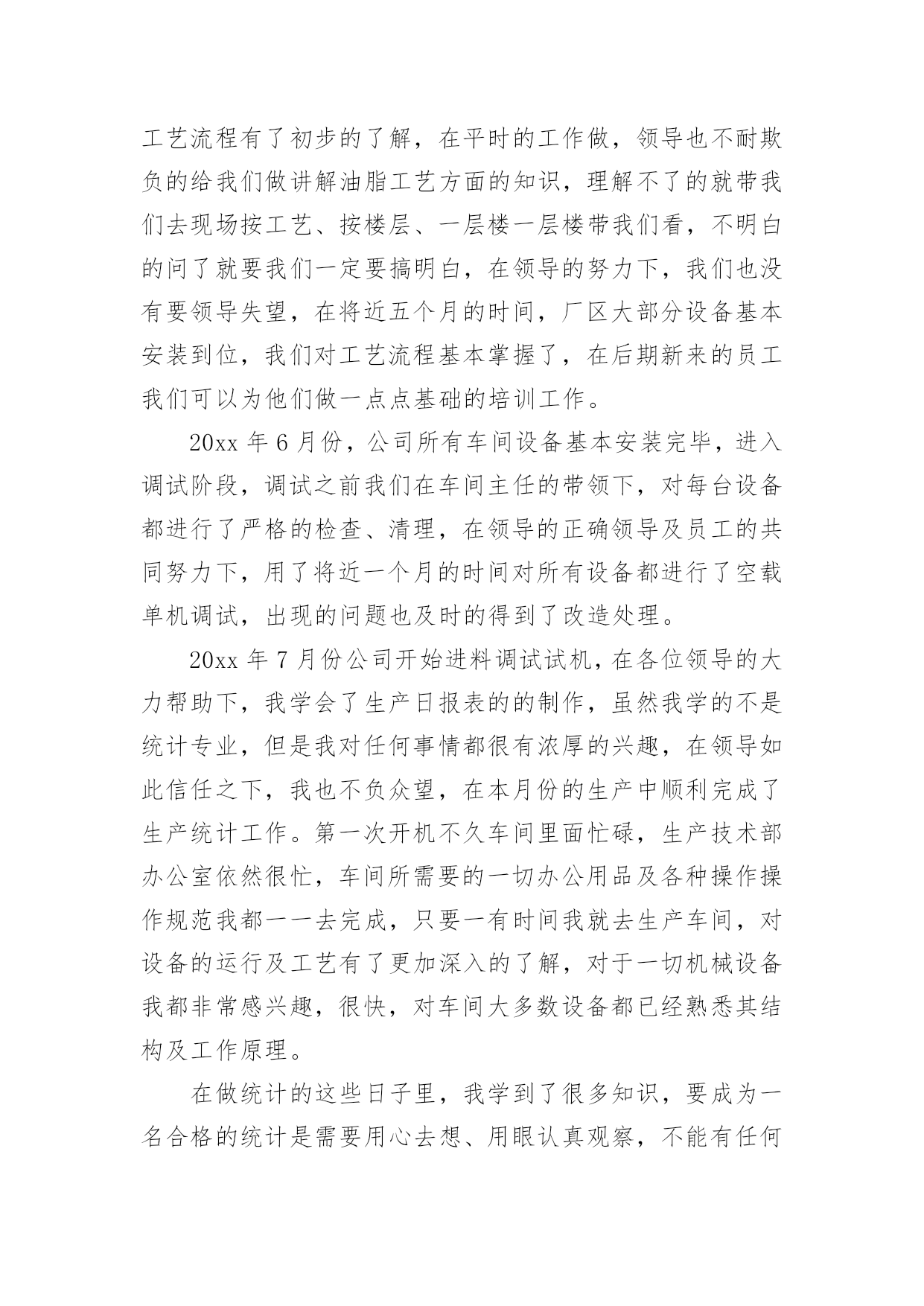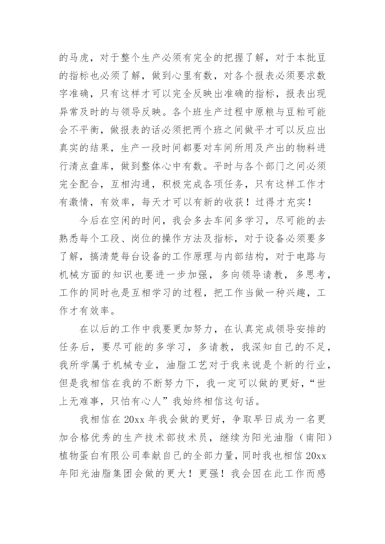 生产技术员工作总结生产技术员工作总结总结是指社会团体、企业单位和个人对某一阶段的学习、工作或其完成情况加以回顾和分析,得出教训和一些规律性认识的一种书面材料,它是增长才干的一种好办法,让我们来为自己写一份总结吧。总结怎么写才是正确的呢?下面是小编为大家整理的生产技术员工作总结,希望能够帮助到大家。生产技术员工作总结1时光飞逝,岁月如梭,一年的时间眨眼就没了,在南阳公司的一年里,我学到了很多在学校学不到的东西,使我受益匪浅,这也是我工作生涯的第一年,对于我以后的长期发展起了很大的作用。20xx年8月入职阳光公司,随后公司安排去信阳万富学习四个月,在信阳学习的那段时间我对油脂加工行业有了初步的认识,并且在各位操作人员及自己的不懈努力下,对整个制油生产工艺及设备有了初步的了解。20xx年12月回南阳公司,回来的时候公司部分车间设备、厂房还在安装、建设中,在领导的认真安排下我们开始着手做车间设备台账及工程监督的工作,在此期间要我们对预处理、浸出、精炼、锅炉、粕库的`设备、基建项目有了深一层次的认识,同时对南阳公司油脂厂区设施布置、生产工艺流程有了初步的了解,在平时的工作做,领导也不耐欺负的给我们做讲解油脂工艺方面的知识,理解不了的就带我们去现场按工艺、按楼层、一层楼一层楼带我们看,不明白的问了就要我们一定要搞明白,在领导的努力下,我们也没有要领导失望,在将近五个月的时间,厂区大部分设备基本安装到位,我们对工艺流程基本掌握了,在后期新来的员工我们可以为他们做一点点基础的培训工作。20xx年6月份,公司所有车间设备基本安装完毕,进入调试阶段,调试之前我们在车间主任的带领下,对每台设备都进行了严格的检查、清理,在领导的正确领导及员工的共同努力下,用了将近一个月的时间对所有设备都进行了空载单机调试,出现的问题也及时的得到了改造处理。20xx年7月份公司开始进料调试试机,在各位领导的大力帮助下,我学会了生产日报表的的制作,虽然我学的不是统计专业,但是我对任何事情都很有浓厚的兴趣,在领导如此信任之下,我也不负众望,在本月份的生产中顺利完成了生产统计工作。第一次开机不久车间里面忙碌,生产技术部办公室依然很忙,车间所需要的一切办公用品及各种操作操作规范我都一一去完成,只要一有时间我就去生产车间,对设备的运行及工艺有了更加深入的了解,对于一切机械设备我都非常感兴趣,很快,对车间大多数设备都已经熟悉其结构及工作原理。在做统计的这些日子里,我学到了很多知识,要成为一名合格的统计是需要用心去想、用眼认真观察,不能有任何的马虎,对于整个生产必须有完全的把握了解,对于本批豆的指标也必须了解,做到心里有数,对各个报表必须要求数字准确,只有这样才可以完全反映出准确的指标,报表出现异常及时的与领导反映。各个班生产过程中原粮与豆粕可能会不平衡,做报表的话必须把两个班之间做平才可以反应出真实的结果,生产一段时间都要对车间所用及产出的物料进行清点盘库,做到整体心中有数。平时与各个部门之间必须完全配合,互相沟通,积极完成各项任务,只有这样工作才有激情,有效率,每天才可以有新的收获!过得才充实!今后在空闲的时间,我会多去车间多学习,尽可能的去熟悉每个工段、岗位的操作方法及指标,对于设备必须要多了解,搞清楚每台设备的工作原理与内部结构,对于电路与机械方面的知识也要进一步加强,多向领导请教,多思考,工作的同时也是互相学习的过程,把工作当做一种兴趣,工作才有效率。在以后的工作中我要更加努力,在认真完成领导安排的任务后,要尽可能的多学习,多请教,我深知自己的不足,我所学属于机械专业,油脂工艺对于我来说是个新的行业,但是我相信在我的不断努力下,我一定可以做的更好,“世上无难事,只怕有心人”我始终相信这句话。我相信在20xx年我会做的更好,争取早日成为一名更加合格优秀的生产技术部技术员,继续为阳光油脂(南阳)植物蛋白有限公司奉献自己的全部力量,同时我也相信20xx年阳光油脂集团会做的更大!更强!我会因在此工作而感到骄傲、自豪!生产技术员工作总结2自20xx年我来到xx园区工作现今,已有一年多的时间了。这期间,我除负责对南北厂区所属的车间进行电气施工监理的工作之外,还承担电仪车间技术员应尽的职责。加强了我对公司电气系统的认知和掌握,并提高了我对一些系统发生各类事故时独立分析和处理问题的能力,为我进一步从事电气技术工作打下良好的基础。下面我对20xx年承担车间技术员作以下总结。一、我对电仪技术员工作的认识及态度我被任命为电仪车间技术员之后,开始逐渐进入这一角色。虽然以前我在公司承担电气设备员一职,对高低压电气技术及设备有着深入的了解和掌握。但自从来了xx以后,在从事电气监理工作的过程中,感到要想当好一个合格电仪技术员的压力在增大。公司的电气设备数量庞大;电气设备种类繁多,涉及高低压输电、配