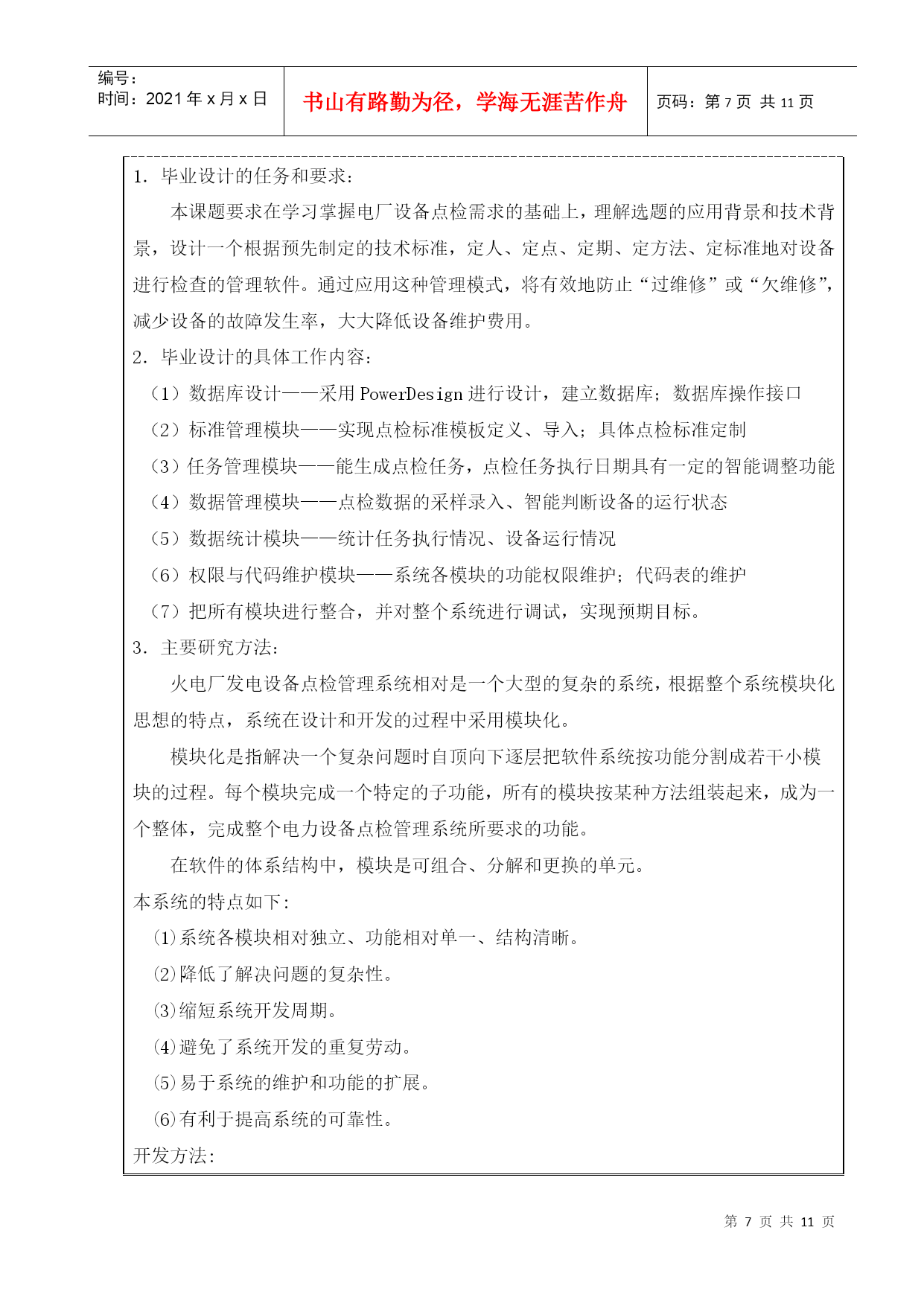 编号:时间:2021年x月x日书山有路勤为径,学海无涯苦作舟页码:第PAGE10页共NUMPAGES11页第PAGE\*MERGEFORMAT10页共NUMPAGES\*MERGEFORMAT11页HYPERLINK""更多企业学院:《中小企业管理全能版》183套讲座+89700份资料《总经理、高层管理》49套讲座+16388份资料《中层管理学院》46套讲座+6020份资料《国学智慧、易经》46套讲座《人力资源学院》56套讲座+27123份资料《各阶段员工培训学院》77套讲座+324份资料《员工管理企业学院》67套讲座+8720份资料《工厂生产管理学院》52套讲座+13920份资料《财务管理学院》53套讲座+17945份资料《销售经理学院》56套讲座+14350份资料《销售人员培训学院》72套讲座+4879份资料中北大学毕业设计开题报告学生姓名:张金玉学号:0705044231学院、系:信息与通信工程学院专业:电气工程及其自动化论文题目:电力设备点检系统设计与实现指导教师:幸振东2011年3月20日毕业设计开题报告1.结合毕业论文情况,根据所查阅的文献资料,撰写2000字左右的文献综述:1.1电力设备点检系统的重要意义:电力设备由于长期暴露在大自然之中,不仅承受正常机械载荷和电力负荷的作用,而且还经受污秽、雷击、强风、洪水、滑坡、沉陷、地震和鸟害等外力侵害[01]。多种因素将会促使线路上各元件老化、疲劳、氧化和腐蚀[02],如不及时发现和消除,就可能会发展成为各种故障,对电力系统的安全和稳定构成威胁。设备点检管理是有效保证输电、变电、配电线路及其设备安全的一项基础工作[03]。通过巡视检查来掌握线路运行状况及周围环境的变化,发现设备缺陷和危及线路安全的隐患,提出具体的检修内容,以便及时消除缺陷,预防事故发生,或将故障限制在最小范围,保证线路的安全和电力系统稳定,达到电力系统“安全、经济、多供、少损”的运行目标[04]。传统设备点检普遍采用的是人工巡视、手工纸介质记录的工作方式。该方式存在着人为因素多、管理成本高、无法监督点检人员工作状态等明显缺陷。为了保证点检工作顺利进行,减少不必要的经济损失,改革传统落后巡检方式的呼声越来越高[05]。为此,利用信息钮、信息螺栓和条形码等较为先进的自动识别技术进行计算机管理。尽可能杜绝人为因素的影响,使即时、定性、定量、客观地考核巡检人员的工作成为可能[06]。然而,上述产品安装复杂,而且长期暴露在野外,容易遭到损坏,不便于有效的管理。另外,填写缺陷票仍旧由巡检人员现场手工完成,费时、费力且缺陷票填写内容不规范,使得设备缺陷汇总分析的工作量没有实质性的减少,从而影响了点检管理效率的进一步提高[07]。另外,随着社会的进步,电力行业也在飞速地发展,目前我国基本上进入大电网、大电厂、大机组、高电压输电、高度自动控制的新时代[08]。大电网意味着输变电配电线路的增加,使得对线路的管理和维护工作变得日益重要,任何对故障的发现的延误都将带来巨大的损失。而当前的线路设备巡视管理手段落后的矛盾就显得更加突出[09]。所以很有必要引进新的手段来提高输电、变电、配电巡视工作的水平[10]。因此,数字点检管理系统的建立和应用,有利于提高运行的安全性、可靠性和稳定性,有利于提高电力企业的管理水平和企业形象,最终实现电力系统“安全、经济、多供、少损”的运行目标。实现从缺陷发现到缺陷处理及注销的全过程监管,最大限度地减少漏检、错检,达到数字巡检的目的[11]。1.2国内外点检应用系统发展的概况:设备点检技术上的变化导致了设备点检在需求上的变化.由单一的以故障诊断为目的转变成监测,维修和管理相结合[12]。目前形势下对点检管理系统的基本要求:(1)能够支持各种设备状态参数所动、温度、压力、流量等)的数据采集和录入。(2)采用大型数据库来存储数据,保证数据查询的效率、系统运行的效率以及并发访问能力[13]。(3)能够进行设各的状态监侧,达到预知维修的目的。(4)提供分析算法和模型,可对数据进行详尽分析。(5)状态数据可以为企业其它管理信息系统利用。1.3目前点检管理系统的不足:市场上现行的点检应用系统,在对点检的支持方面还不够完善,主要体现在以下几个方面:(1)传感器要求固定安装。系统要求传感器固定安装,这就只可能是有限多个点被纳入点检管理当中,点检管理制的覆盖面减小,无法做到点检管理的全面性[14]。(2)点检仪造价较高。要想覆盖整个企业,成本高,大面积应用投资大。(3)信息收集不完整,统一集中不及时,利用不充分。1.4设备点检管理系统在我国电力行业的应用:国内电力行业设备管理正由定期检修