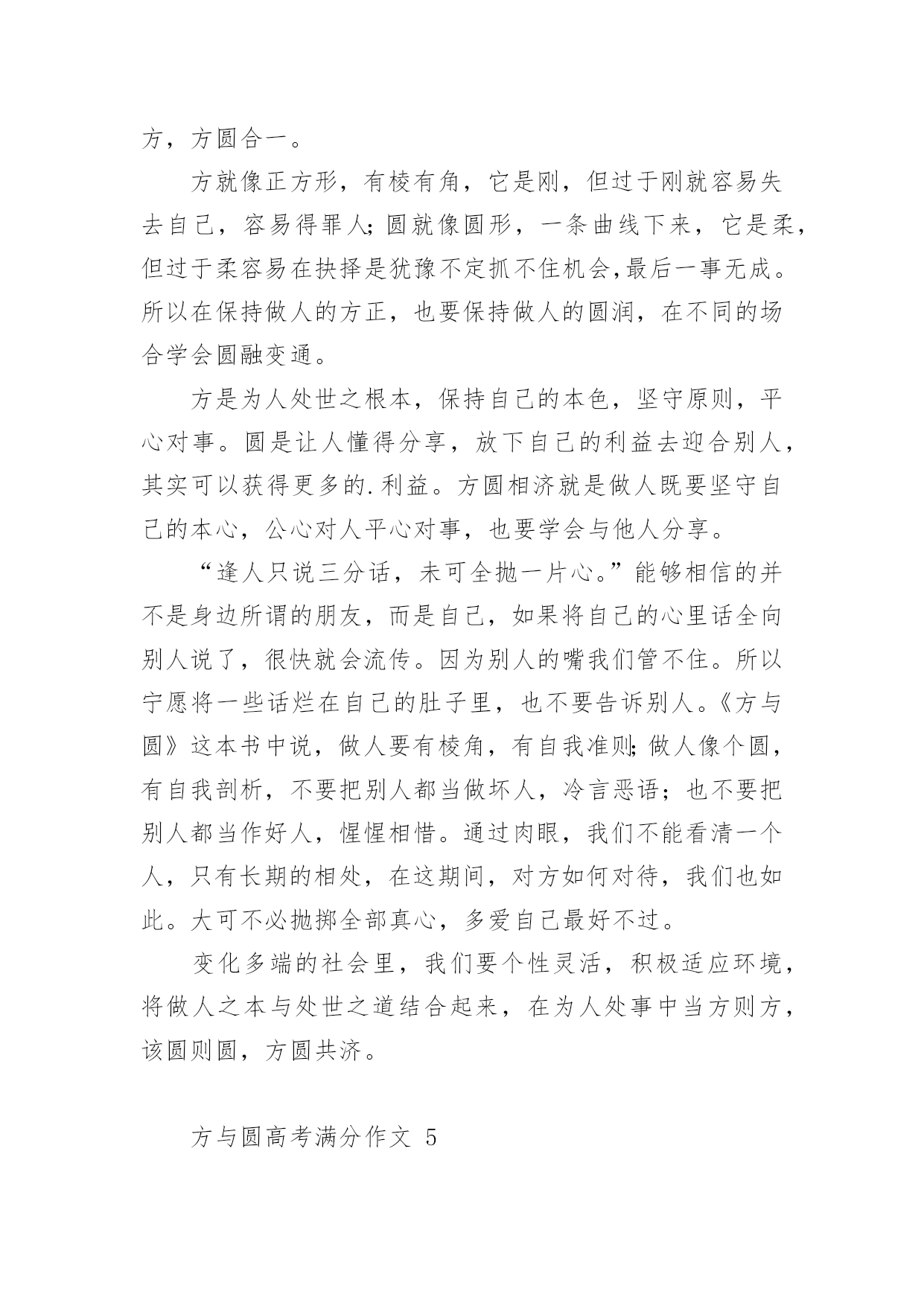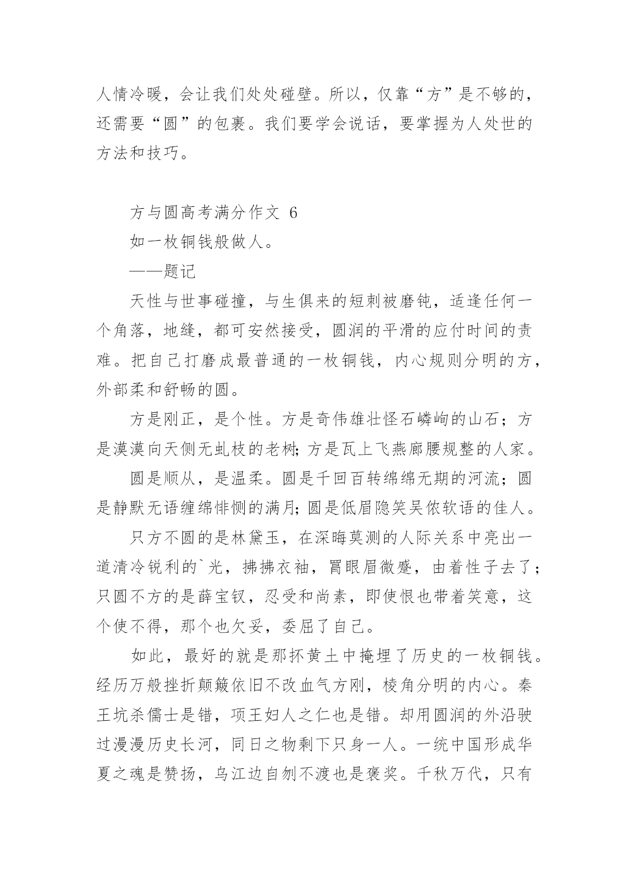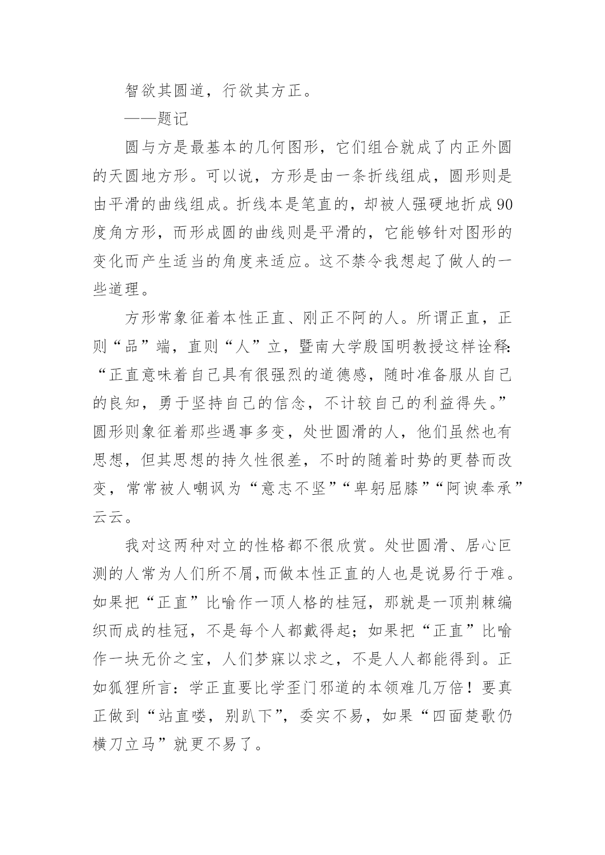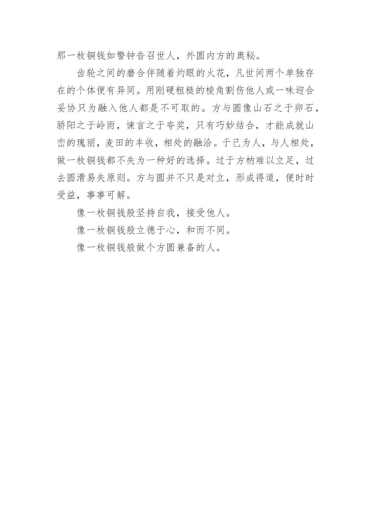 方与圆高考满分作文方与圆高考满分作文(精选6篇)在平时的学习、工作或生活中,大家都不可避免地会接触到作文吧,作文是人们以书面形式表情达意的言语活动。那么你有了解过作文吗?下面是小编为大家收集的方与圆高考满分作文,希望对大家有所帮助。方与圆高考满分作文1“方形”与“圆形”是两种格格不入的图形,正所谓“方枘圆凿”,意思是说,方榫头和圆卯眼,两者合不起来。由此引申出的“方正”与“圆滑”,也表达了相反的意思。谈到“方”,很容易让人联想到“正”:正色直言、正身明法、正身清心、正气凛然、正言不讳、正己守道……这些词,形容的都是“方正”之士。所谓“方正之士”,指的是品行正直、不阿谀奉承的.人。司马迁便是这样一个典型人物,他出生于史官之家,继承父业,专门负责整理编纂前朝史料史书和搜集记录本朝史实。对,是“史实”!他要记录的就是史实。面对汉武帝的威逼,面临正义与尊严的艰难抉择,他,并没有屈服,默默忍受着宫刑的屈辱,他,含泪写下了《史记》这部不朽的传世巨作。倘若他不是一个正身明法之人,又怎会作出这样的选择?倘若他不是一个方正之士,又怎会有《史记》这样震惊后世的著作的诞生?每每想到他们这样一群正义凛然之士,内心总会涌起一股热流。与方相对的是“圆”,“圆滑”一词在字典里的释义为“形容人善于敷衍讨好,不负责任”。但“圆滑”一词并不一定就是贬义词,“八面圆通”一词即指为人处世圆滑,处处应付周全或办事圆通周到。圆滑之人有时能把事情做得更好,圆滑之人有时能结识更多朋友。其实,“圆滑”可以解释为说话委婉、处事谨慎,在某些特定时间、特殊场合,圆滑一些未尝不可。正如古诗所云:“方圆虽异器,功用信具呈。”人生亦是如此,所谓“上善若水任方圆”,意思是说,做人要像水一样,该“方”时“方”,该“圆”时“圆”,能屈能伸,不可一成不变,固执己见。身为父母官,就当秉公执法,正理平治,该“方”;作为主持人,就当善于随机应变,面对不同情况,说不同的话,真正要八面圆通,十二分周到,方能当得此任。在日常生活中,在不同场合,我们要担任不同的角色,说话处事的语气和态度也有不同。器物的方圆之用,各得其妙,人生的方圆亦是如此,一个懂得生活、善于交际的人必定要懂得人生的方圆,认识人生的方圆,做一个“上善若水任方圆”之人!方与圆高考满分作文2方,做人之本;圆,处世之道。——题记方古人云:“方乃做人之道也”,这就要求我们要严于律己,堂堂正正的做人。古人又云:“君子坦荡荡,小人常戚戚”,这也要求我们做人要象君子一样,光明磊落,走堂堂正正坦坦荡荡的正道,而不是象小人一样偷偷摸摸,暗地里干一些见不得人的勾当。我国古代有位大官,有人想求他办一件利己的事情,于是深夜送来一件稀世珍宝,而这位大官死活不肯收下此宝物。送宝物的人便说,此事只有你知、我知、天知、地知,你还怕什么呢?那位大官说,我做官不是为了财宝,而是要做一个清官,为民办事,为朝廷出力。此宝物我不能收。如果收了就愧对朝廷,愧对民众。虽然此事只有你知、我知、天知、地知,但是不贪污受贿是我为人处世的原则。这就是后世传颂的“四知”的故事。此大官能够如此,恐怕中外历史上都很少见吧!能如此做堂堂正正、坦坦荡荡的人,我们何不向他学习呢?圆大千世界,芸芸众生,我们每个人都是社会的成员,我们生活在这个世界中,就要学会为人处世。面对同一件事情,我们个人有个人的处理方法,不同的方法会产生不同的效果。试问:我们该怎样处世呢?在第二次世界大战中,面对德意法西斯的'疯狂侵略,艾森豪威尔制定意大利战役计划,不顾参谋成员的意见,认为必须让横在西西里和北非之间的班秦雷利亚岛上的驻军投降,6月上旬,约有300顿炸药落在这个面积为50平方公里的岛屿上,揭开西西里岛登陆战的序幕,登陆战准备就绪后,但天气突变,风大浪急,对海军作战极为不利,登陆计划遭英美联军的许多将军反对,其中就有装甲集团军总司令巴顿将军,他坚决反对登陆,埃森豪威尔的幽默的话语对巴顿说:“将军,你难道不热爱你的祖国吗?你的祖国人民和你的装甲兵一样,都受到火药的威胁,你是去灭火药呢还是让火药炸掉你的部队和祖国人民。”巴顿将军听完以后,思量再三。于是决定出兵。其他将领也在埃森豪威尔轻松幽默的谈笑中国同意出兵,最终打败德军,德军退意大利本土。正是他磨于德幽默德语言化解难以处理的矛盾使这两支不同国度的队伍联合起来,共同抗击人类共同的敌人。圆,处世知道,我们何不向他学习呢?方与圆方,做人之本;圆,处世之道。我们只有将二者结合起来,方能堂堂正正做人,顺顺利利处世,活的潇潇洒洒,坦坦荡荡。方与圆高考满分作文3“宁可湿衣,不可失步”,这是墨守成规者的惯常思维。在他们看来,世界是方的,充斥着条条框框的准则,每一步都必须踩着规矩,这样的世界才叫做“井然有序”。正如契科夫笔下的装在套子里的人—别里科夫,他们过度的曲解了规矩的意义,将成规当成束